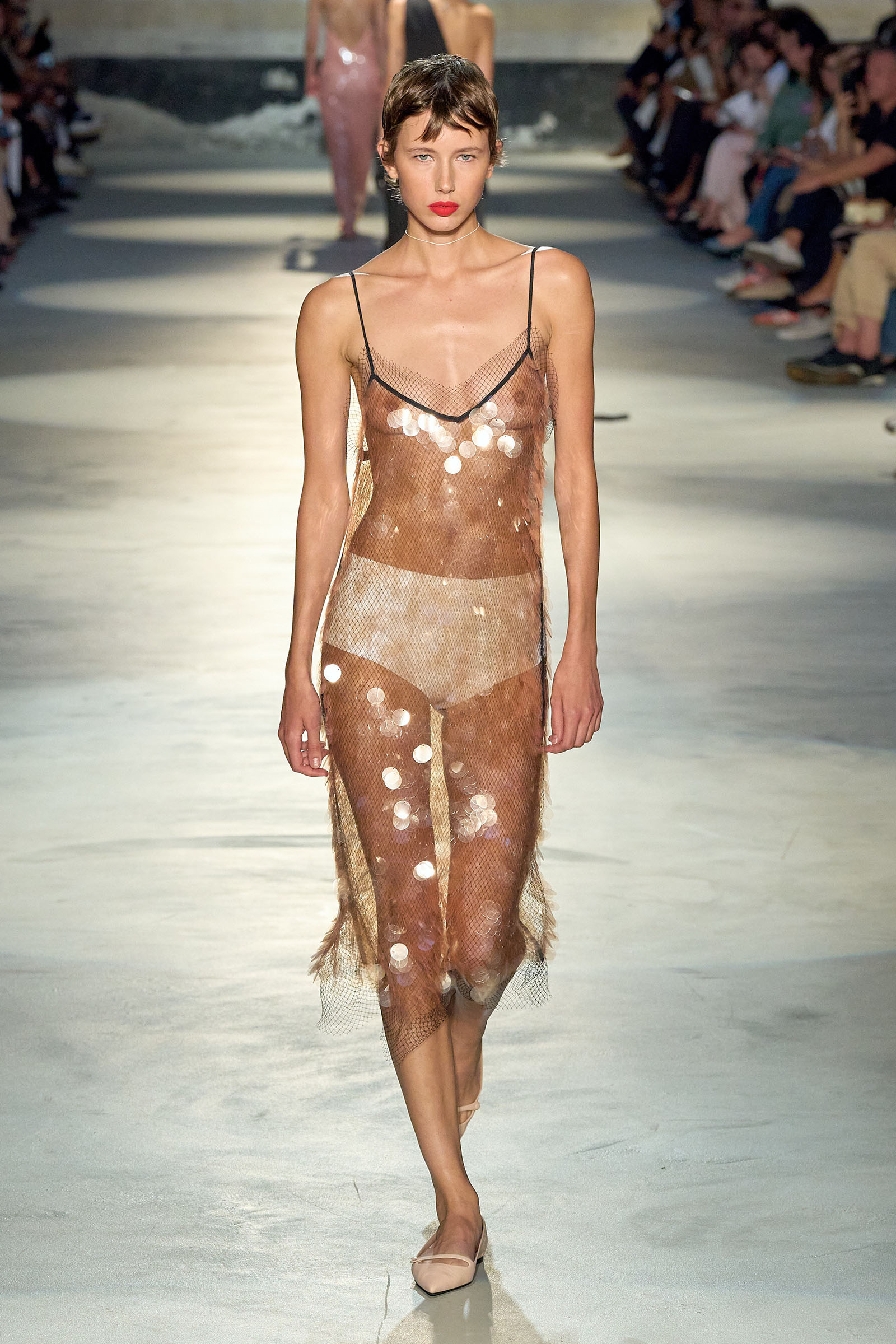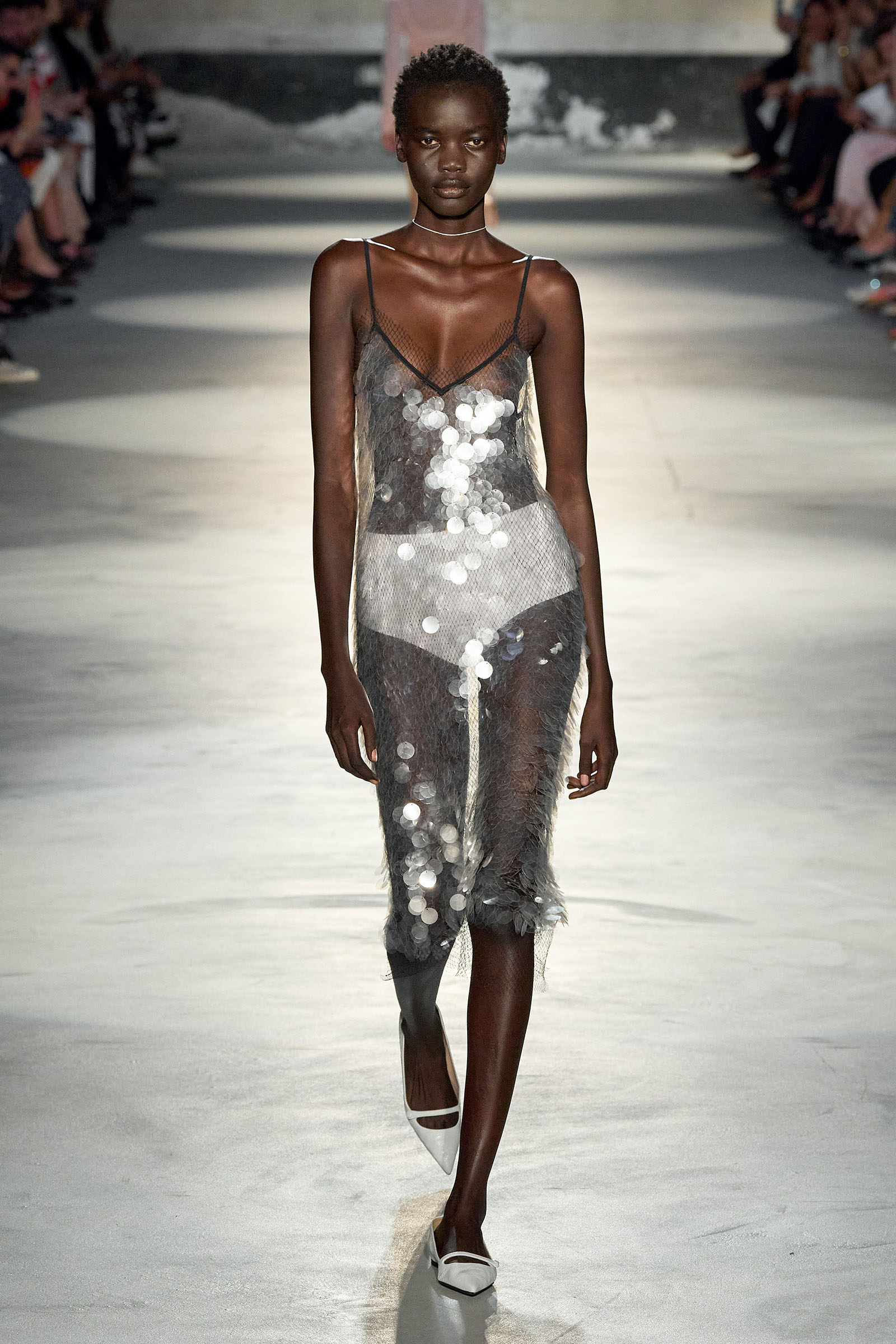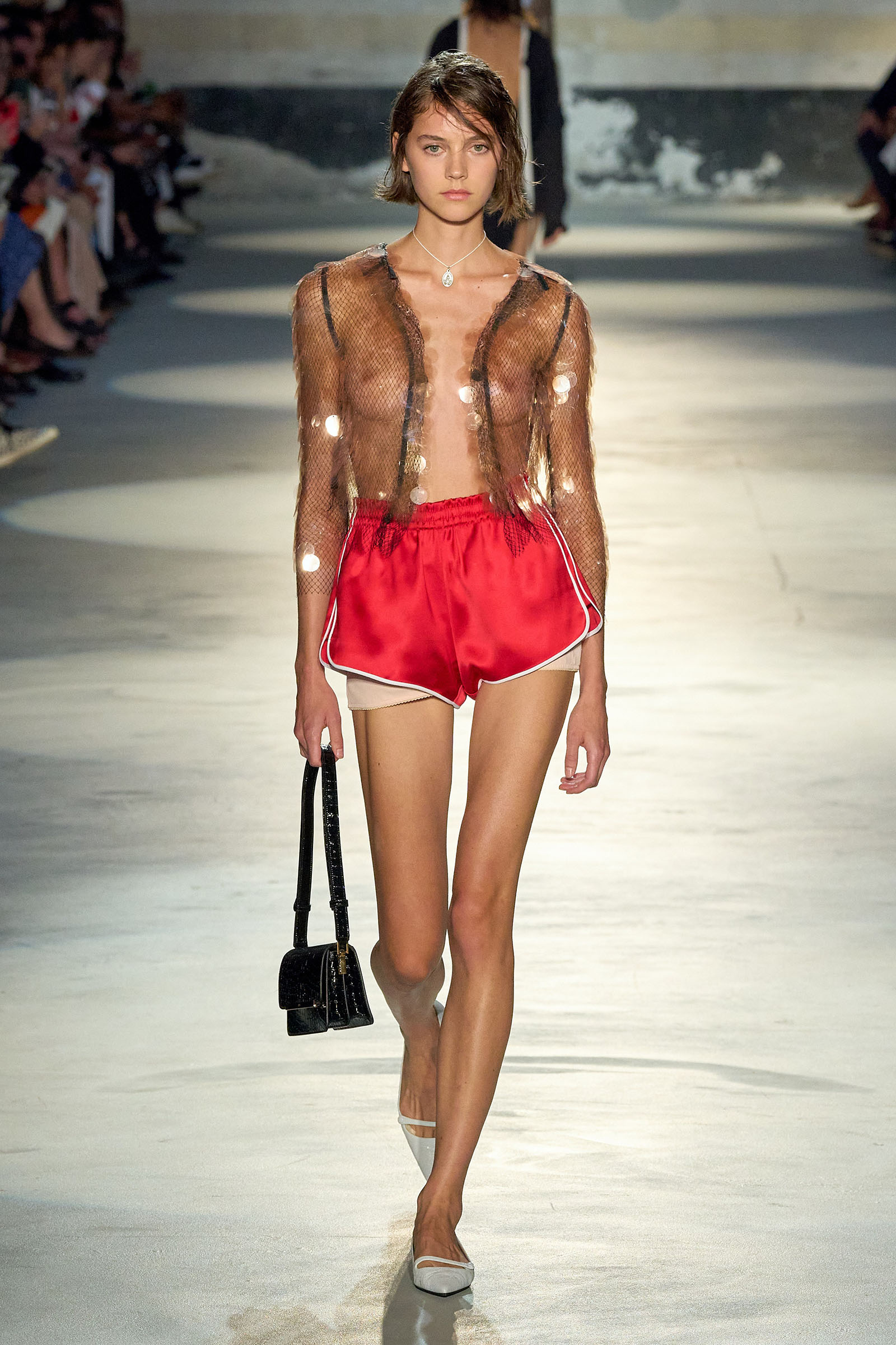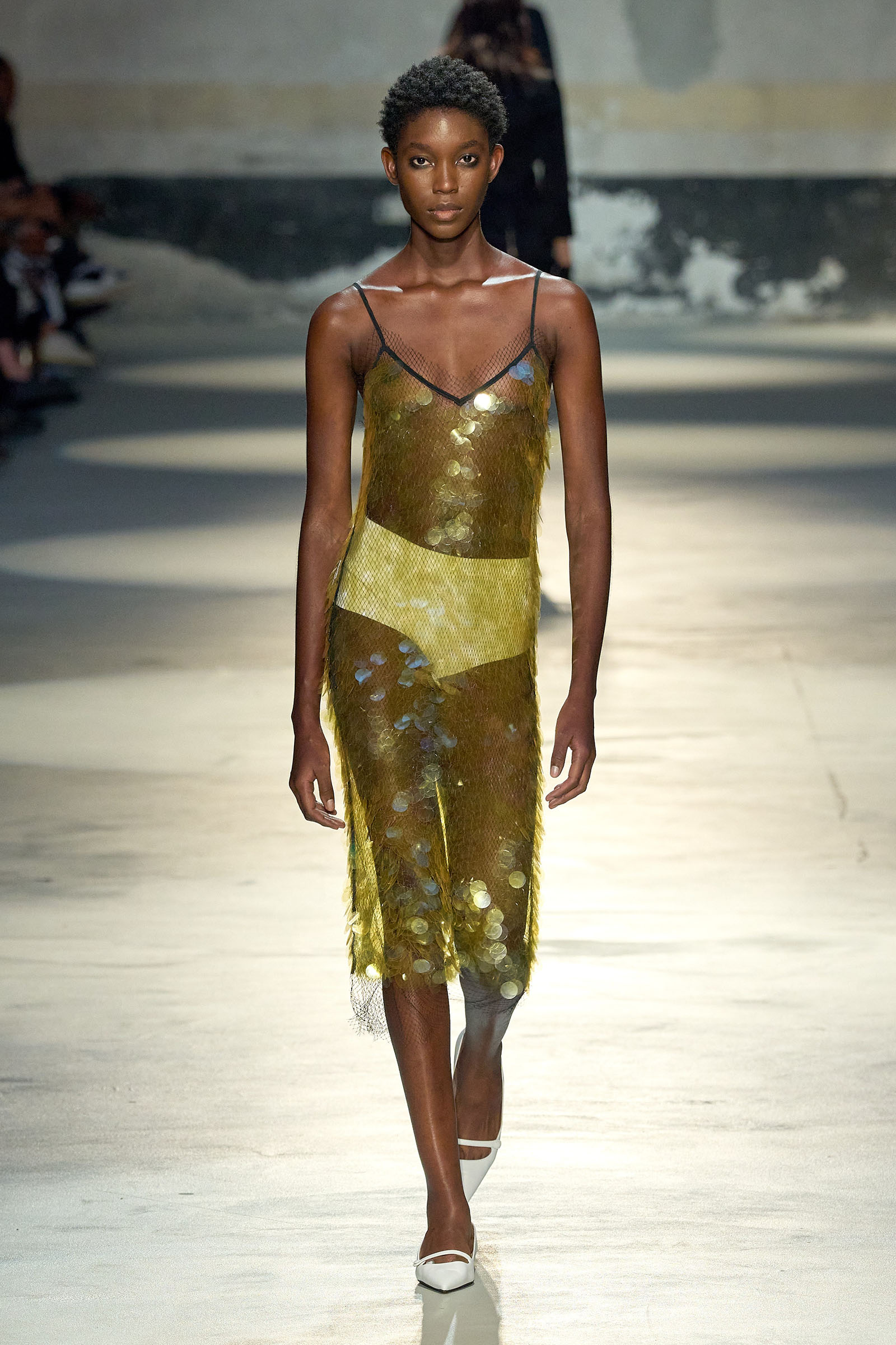 Black and white featured prominently in the collection, which had a light, svelte and upbeat feel to it. Little bra tops and neat ingénue minidresses in white organza or lacquered white lace played against black satin slender pencil-skirt suits, short A-line dusters and provocative negligees in see-through chiffon. Slipdresses in tulle mesh dripping with supersized round silver and gold sequins hinted at the seductive, carnal, brash attitude Neapolitans of all sexes and from all walks of life are known for. Sensuous persuasion is a local sport, a sort of second nature; lust for life is worshipped as a religion. Dell’Acqua poured all these suggestions, memories and feelings into his playful collection. He concluded: “You can hate Naples, or love it to bits. Indifference is never an option. As the famous Italian saying goes: ‘See Naples, and then die.’”
