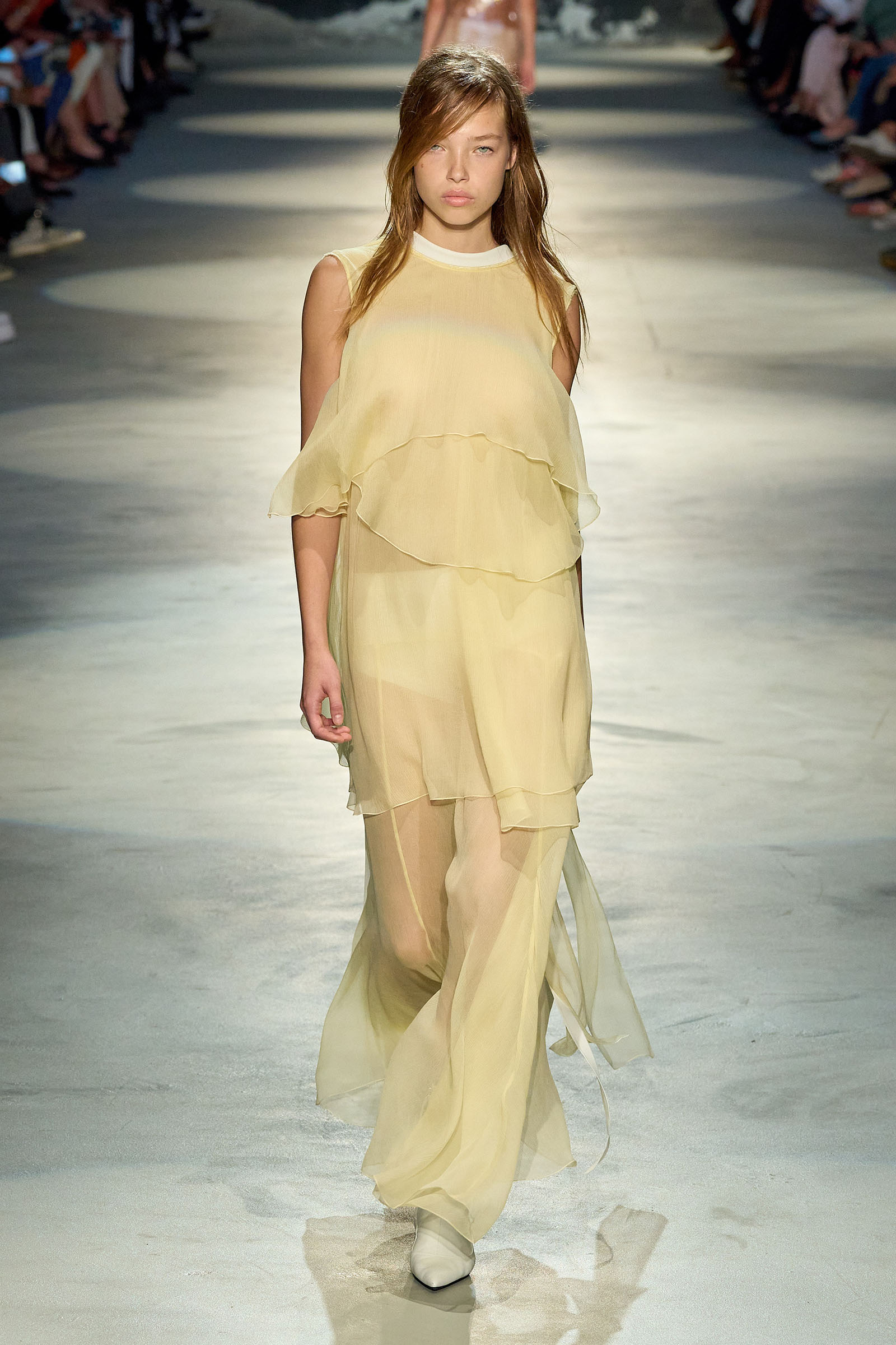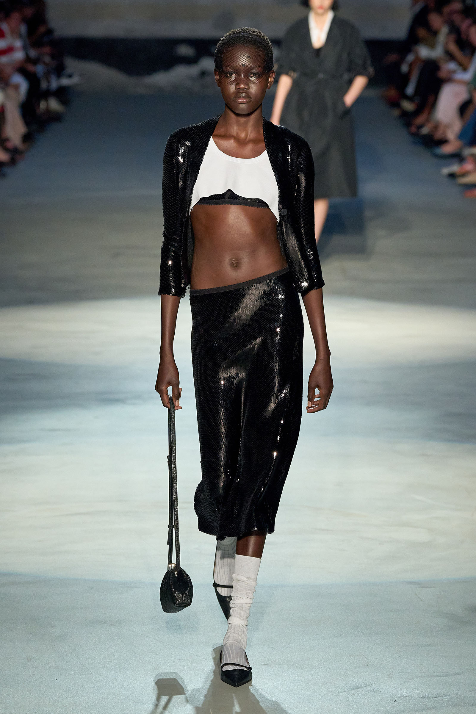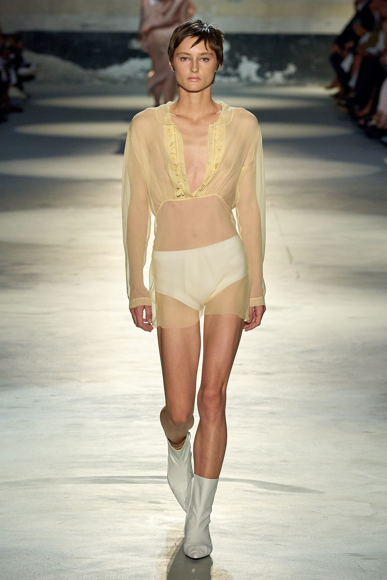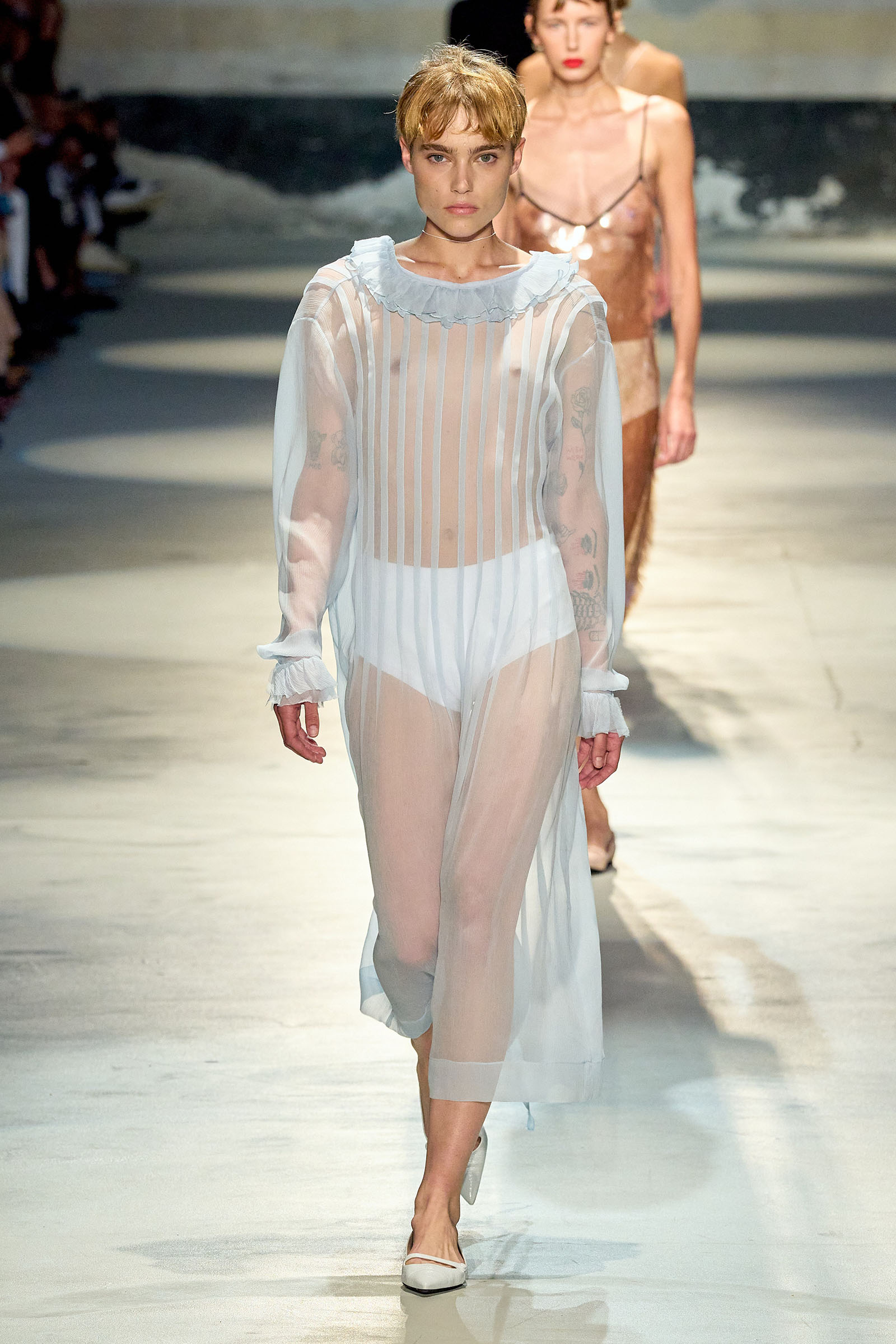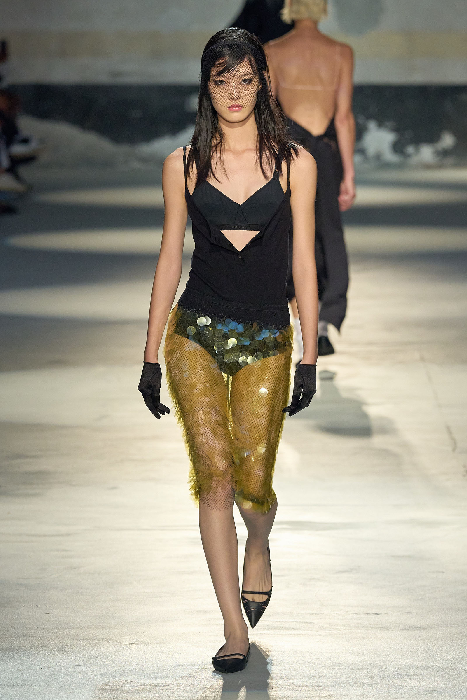 Black and white featured prominently in the collection, which had a light, svelte and upbeat feel to it. Little bra tops and neat ingénue minidresses in white organza or lacquered white lace played against black satin slender pencil-skirt suits, short A-line dusters and provocative negligees in see-through chiffon. Slipdresses in tulle mesh dripping with supersized round silver and gold sequins hinted at the seductive, carnal, brash attitude Neapolitans of all sexes and from all walks of life are known for. Sensuous persuasion is a local sport, a sort of second nature; lust for life is worshipped as a religion. Dell’Acqua poured all these suggestions, memories and feelings into his playful collection. He concluded: “You can hate Naples, or love it to bits. Indifference is never an option. As the famous Italian saying goes: ‘See Naples, and then die.’”