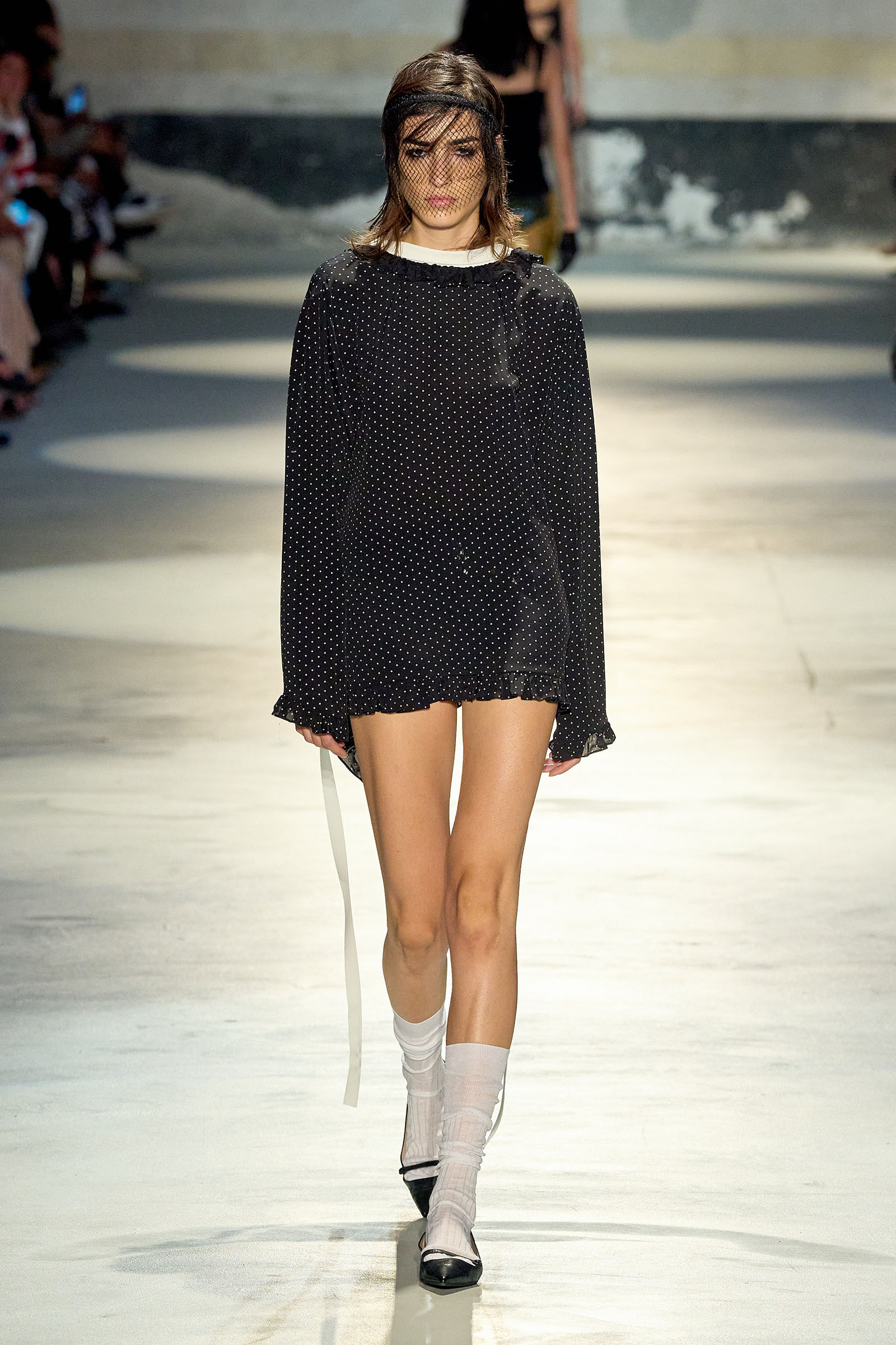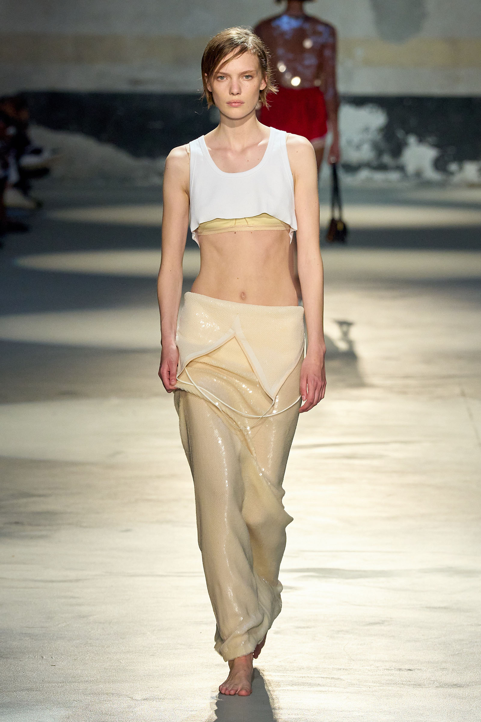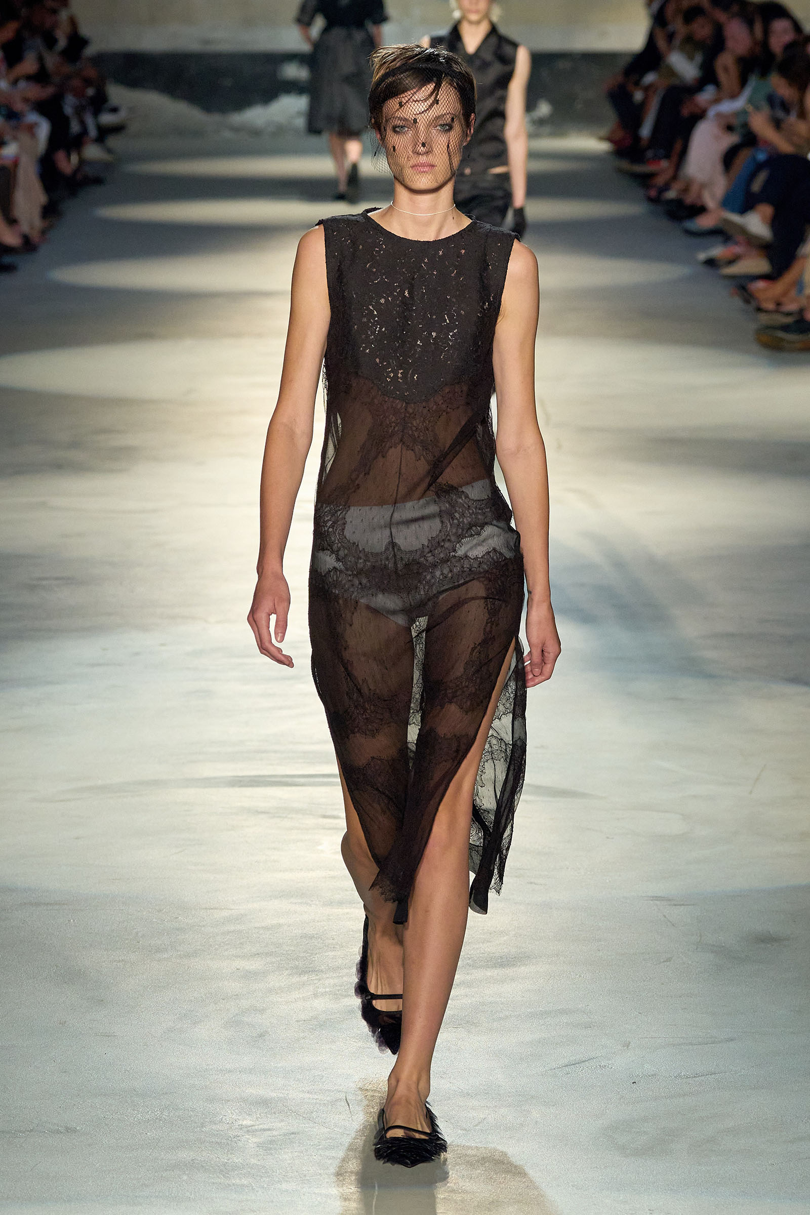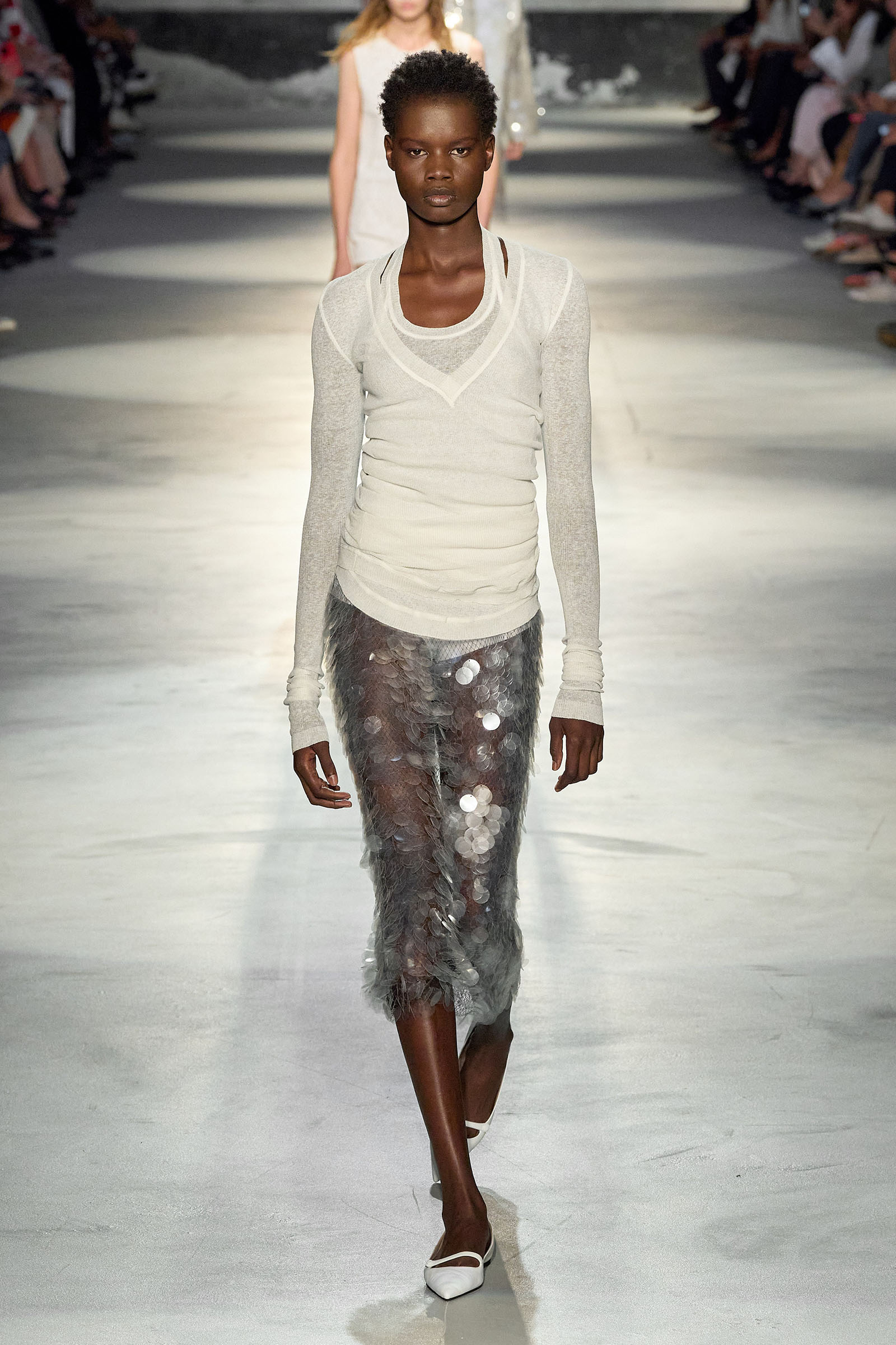 Black and white featured prominently in the collection, which had a light, svelte and upbeat feel to it. Little bra tops and neat ingénue minidresses in white organza or lacquered white lace played against black satin slender pencil-skirt suits, short A-line dusters and provocative negligees in see-through chiffon. Slipdresses in tulle mesh dripping with supersized round silver and gold sequins hinted at the seductive, carnal, brash attitude Neapolitans of all sexes and from all walks of life are known for. Sensuous persuasion is a local sport, a sort of second nature; lust for life is worshipped as a religion. Dell’Acqua poured all these suggestions, memories and feelings into his playful collection. He concluded: “You can hate Naples, or love it to bits. Indifference is never an option. As the famous Italian saying goes: ‘See Naples, and then die.’”