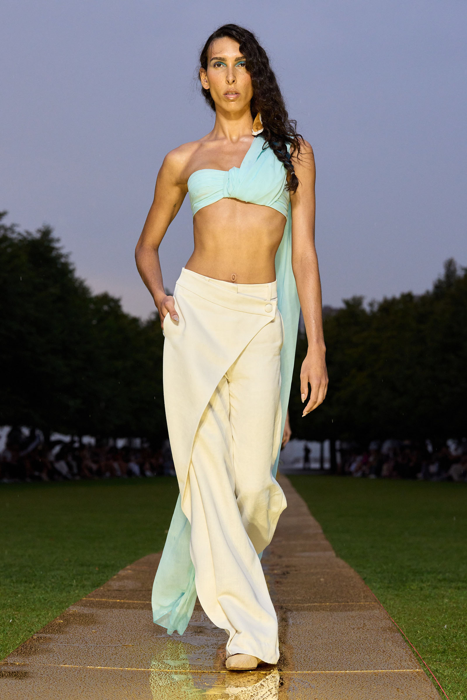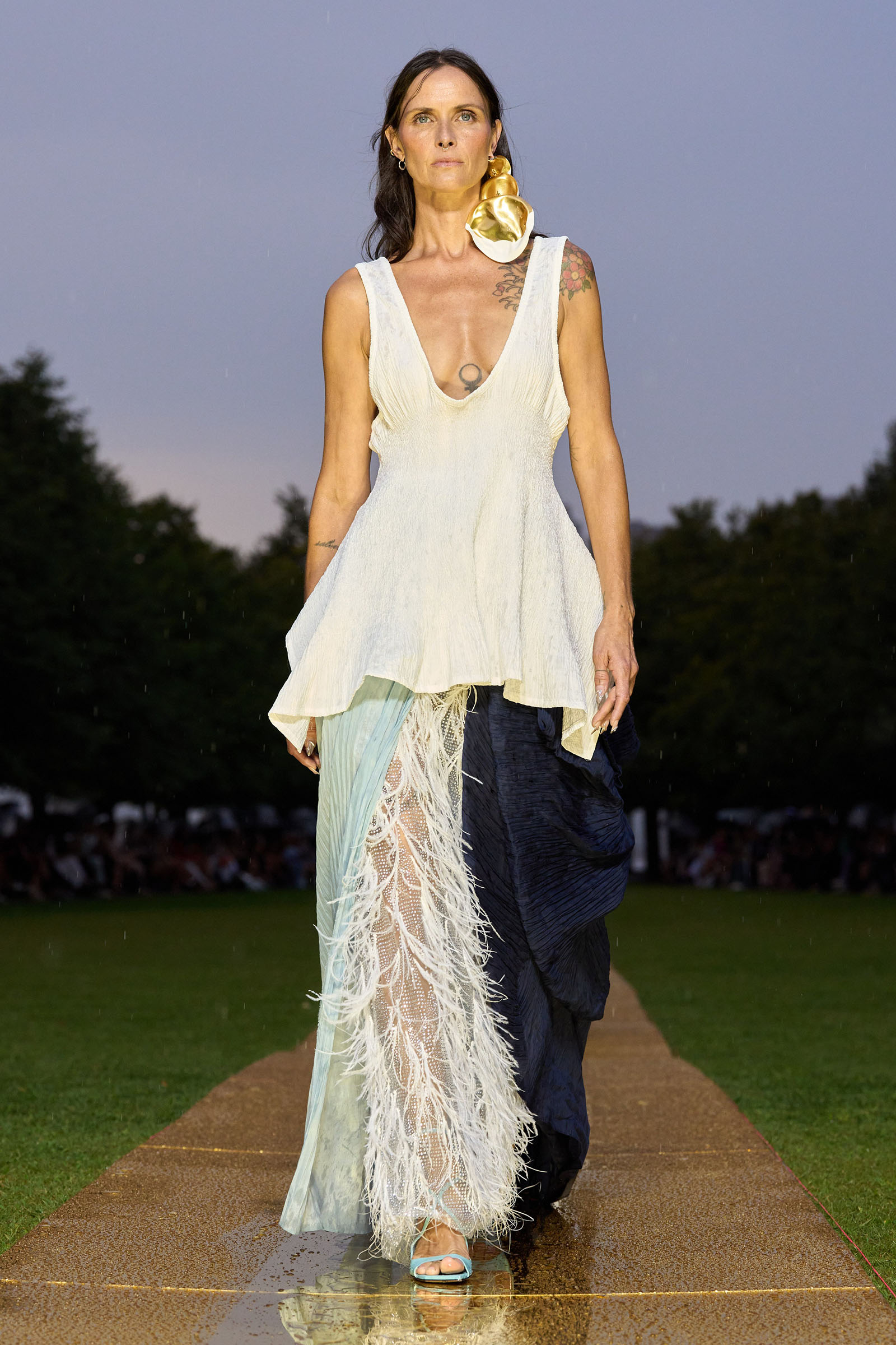 Fashion lovers are more likely to fixate on his power shoulders (not to mention gathered waists and tapered silhouettes). “It’s ’80s Escada and ’80s Bollywood—and also Bill Blass,” he said. “My time there and all those archival jackets are still a big part of my memory.” Ditto the jewelry “my aunts wore with their saris when they came to America with their broad shouldered jackets,” he said. This personal memory was translated into amber drops that dripped from an airy sheer tank, and also the oversized earrings made for the show. Fashion family memories came alive in the casting: Anne Vyalitsyna opened in a warrior woman white look to the strains of Björk’s “Hunter,” and Tasha Tilberg wore the penultimate ensemble; a sort of tank with a peplum borrowed, Gurung explained, “from the angrakha blouse that at lot of Rajasthani male dancers wear.” Feathers that bopped on a knit number got close to Bottega Veneta territory, but in almost every other way, this line-up showed a side of Gurung not often seen. Indeed, the contrast between past seasons’ collections and this one was striking. There was a lot more ease here, more separates (see look six with the gorgeous draped pants and a corset layered over an apron-like chiffon panel that trained out in back). There were a number of beautifully pleated pieces, including a metallic blue one-shoulder dress and a longer yellow number constructed of rectangles of starched linen, which probably one-ups Mary McFadden’s synthetics in the sustainability stakes. In any case, working with “humble” fabrics like denim and linen allowed for new shapes and textures and brought things a bit down to earth, if not back to basics; Gurung makes dress-up clothes and these fit the bill, but in a way that felt modern.