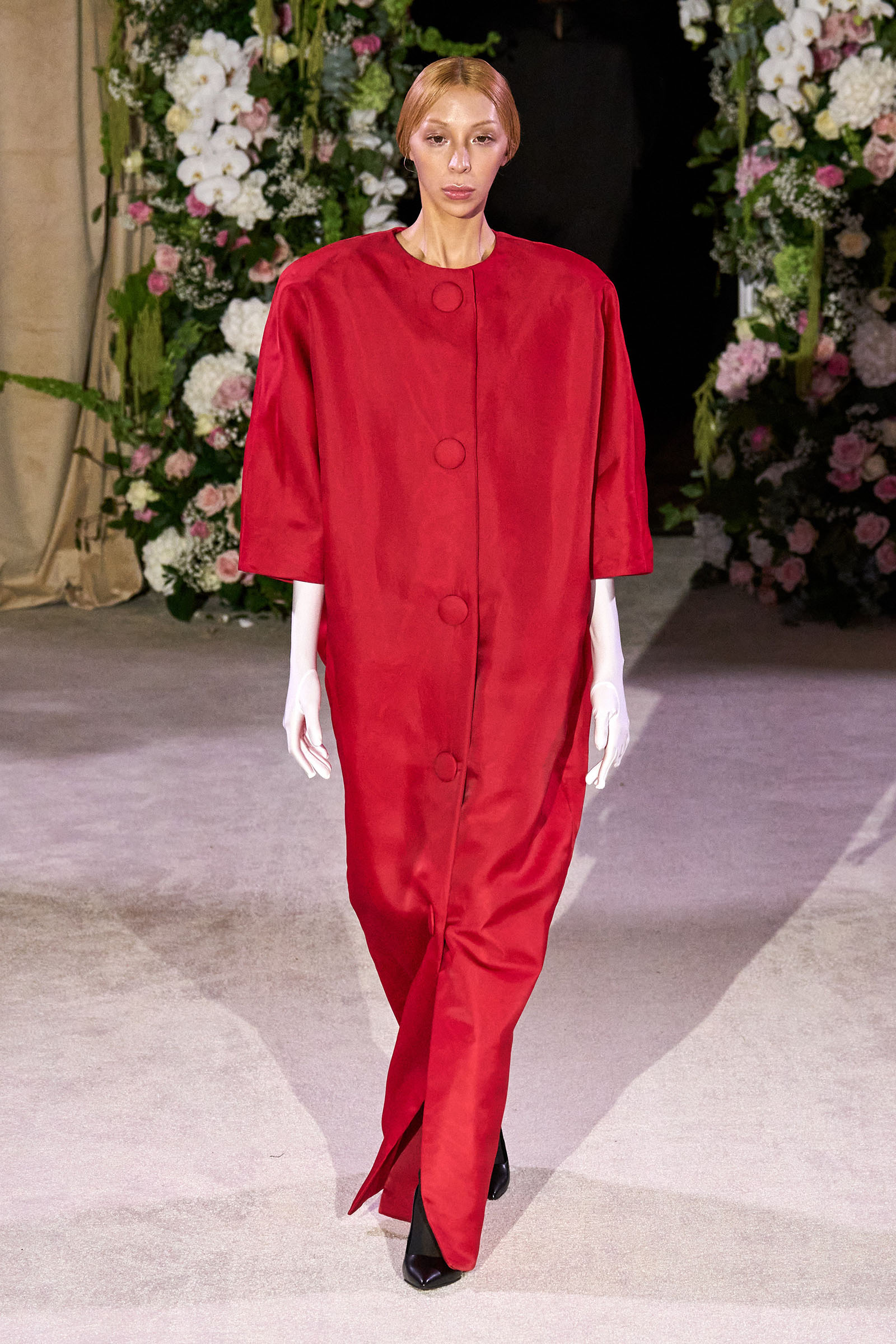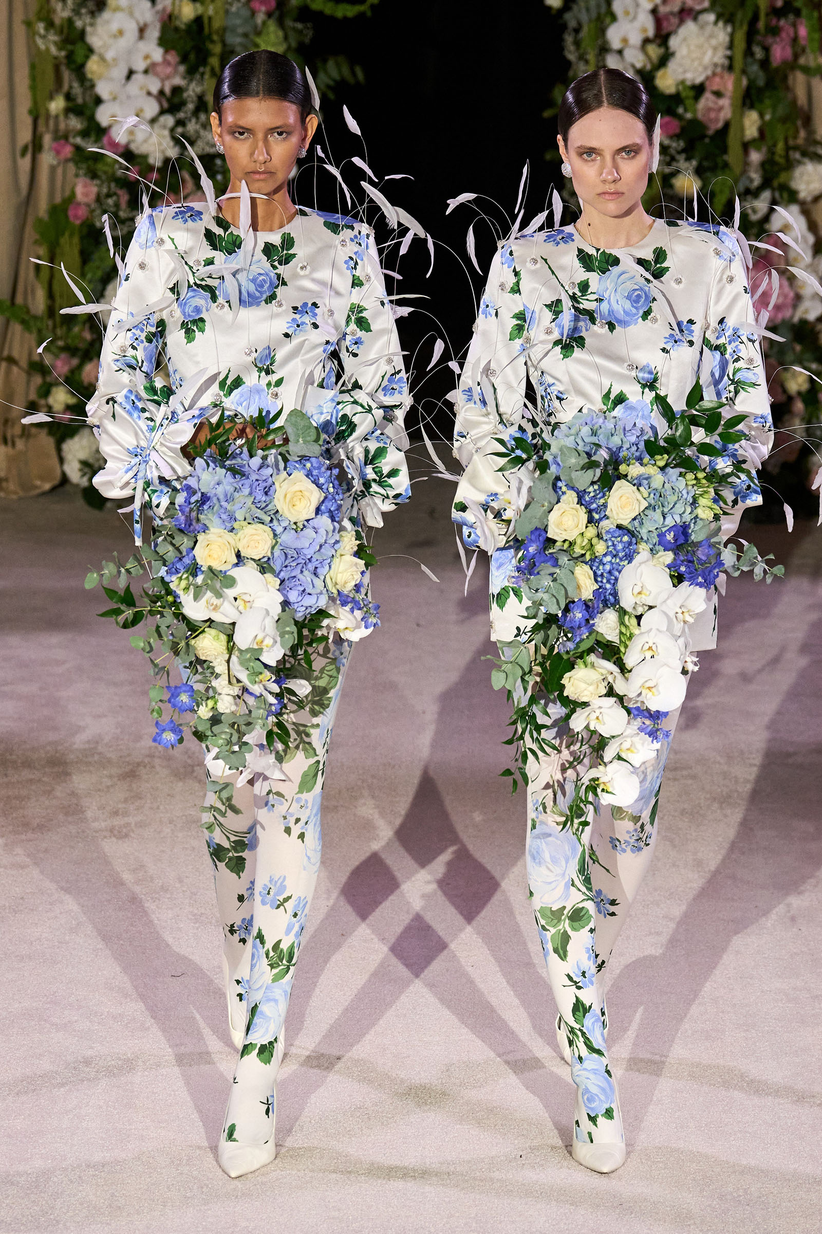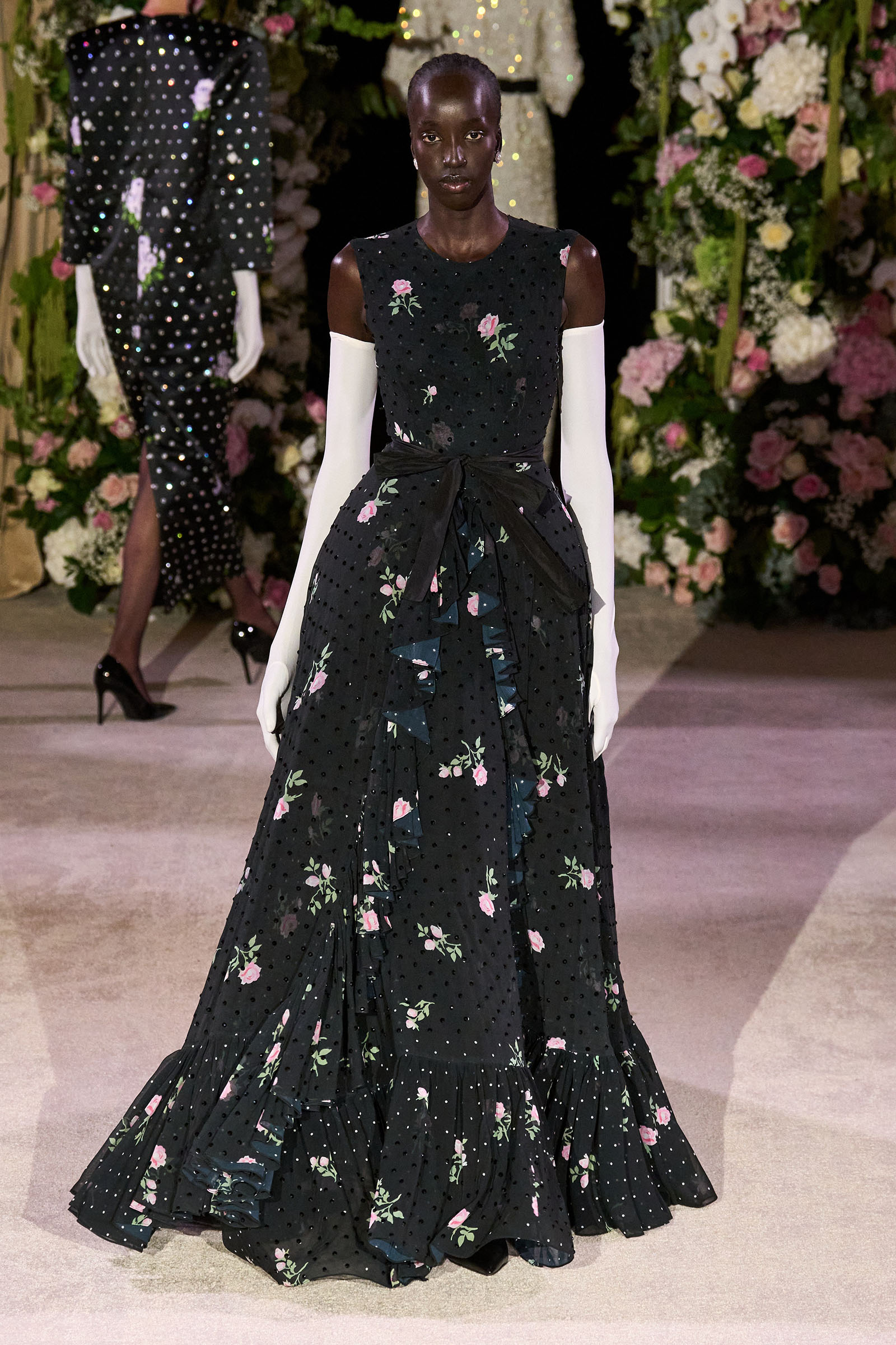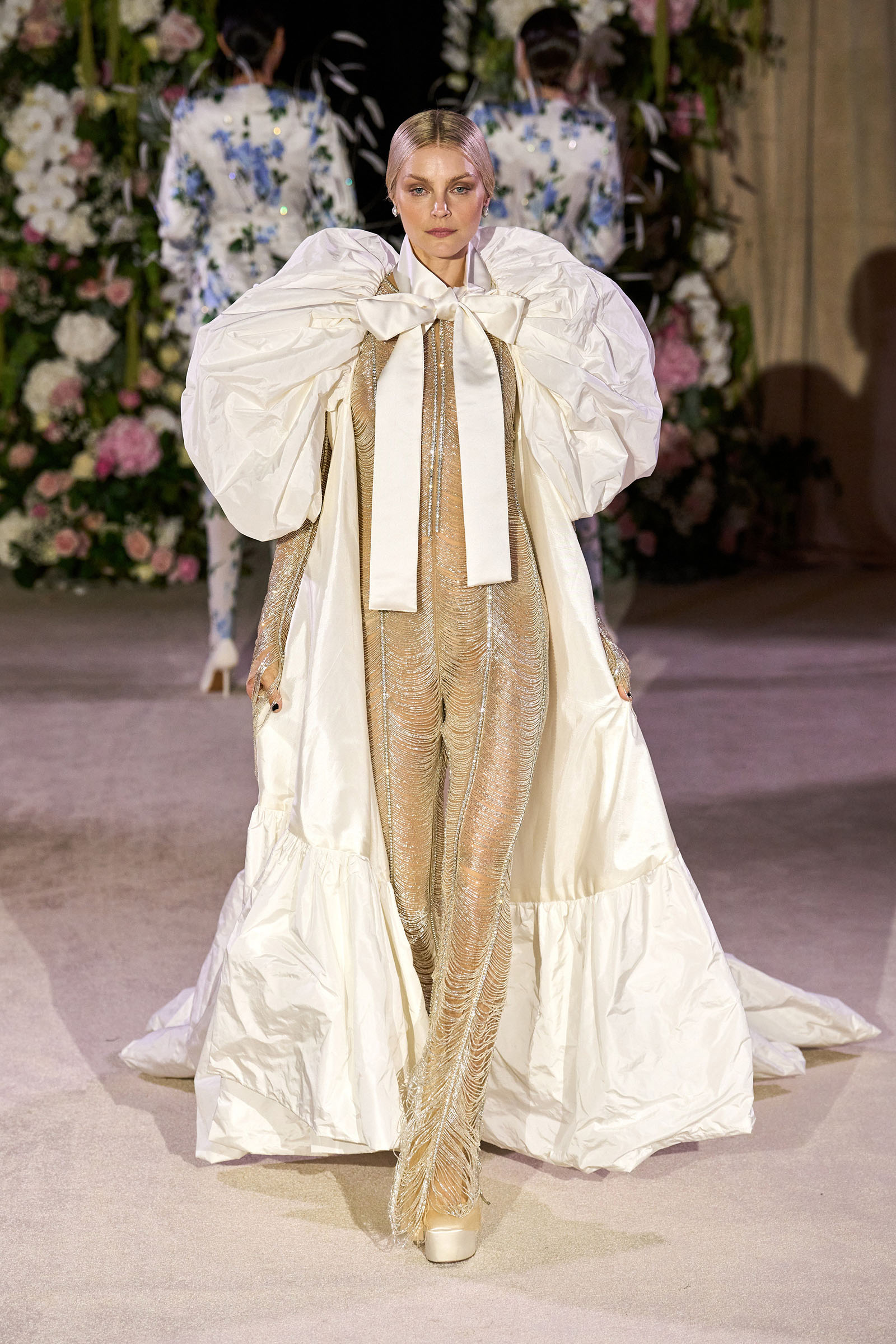 Amid banks of fresh flowers and live music from a men’s choir, Richard Quinn sent out an exquisitely made collection that was a soaring tribute to his late father, Patrick, who passed away in June. “I wanted it to be angelic and ethereal. Something where everyone could feel and know who my father was. His work was next door to mine, and my team knew him really, really well because he was always in, always involved with building the sets for the shows.”