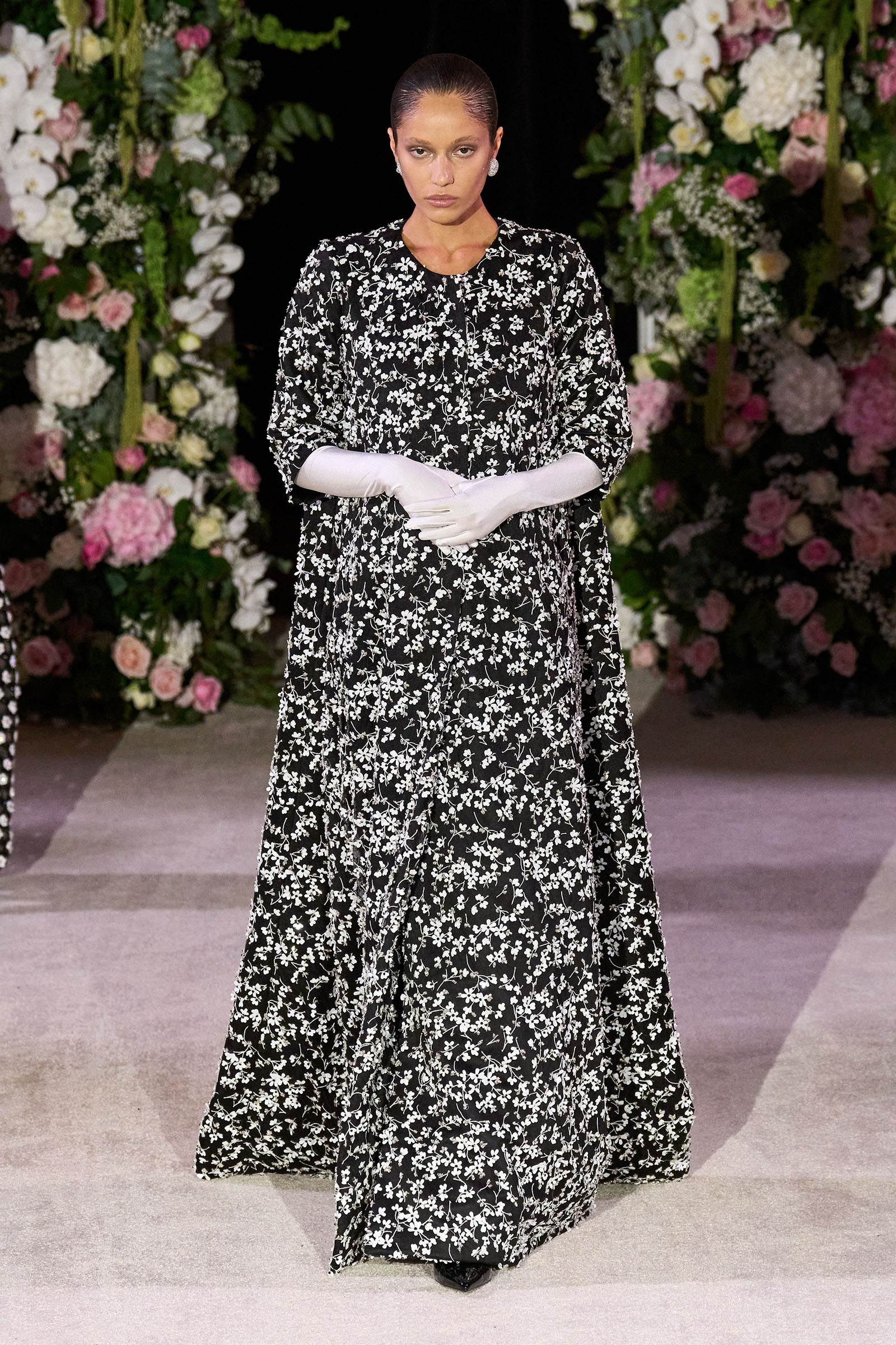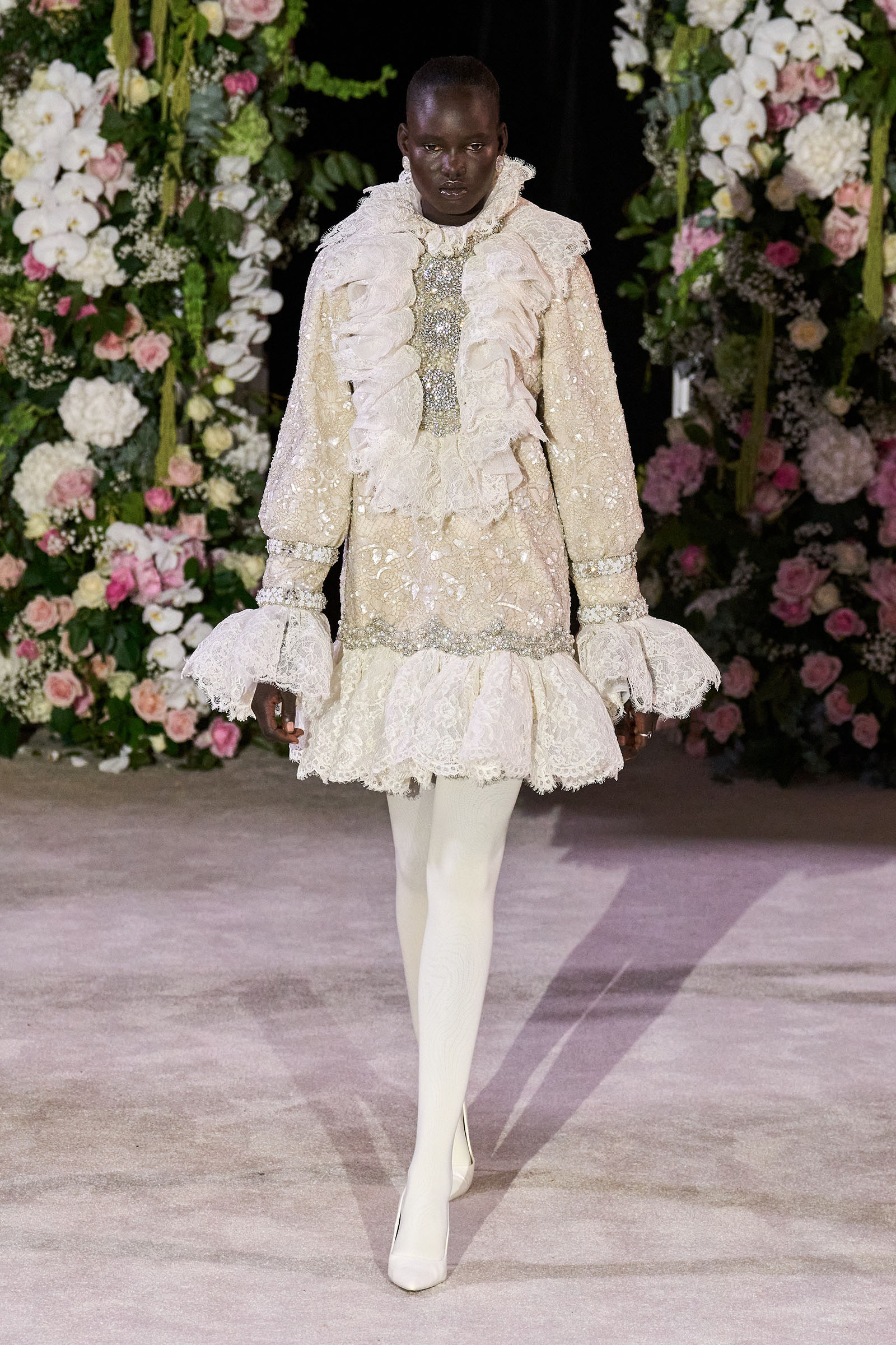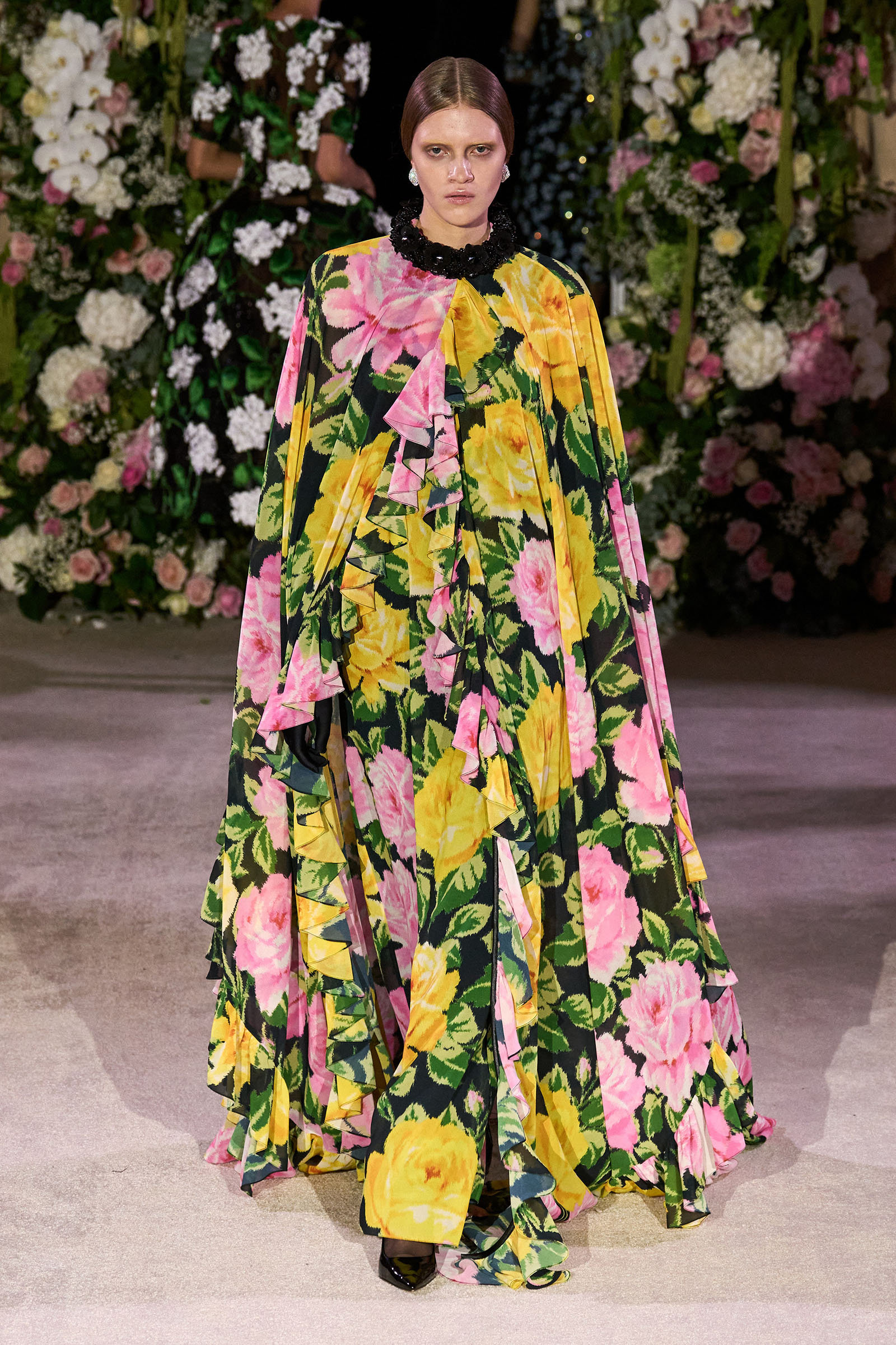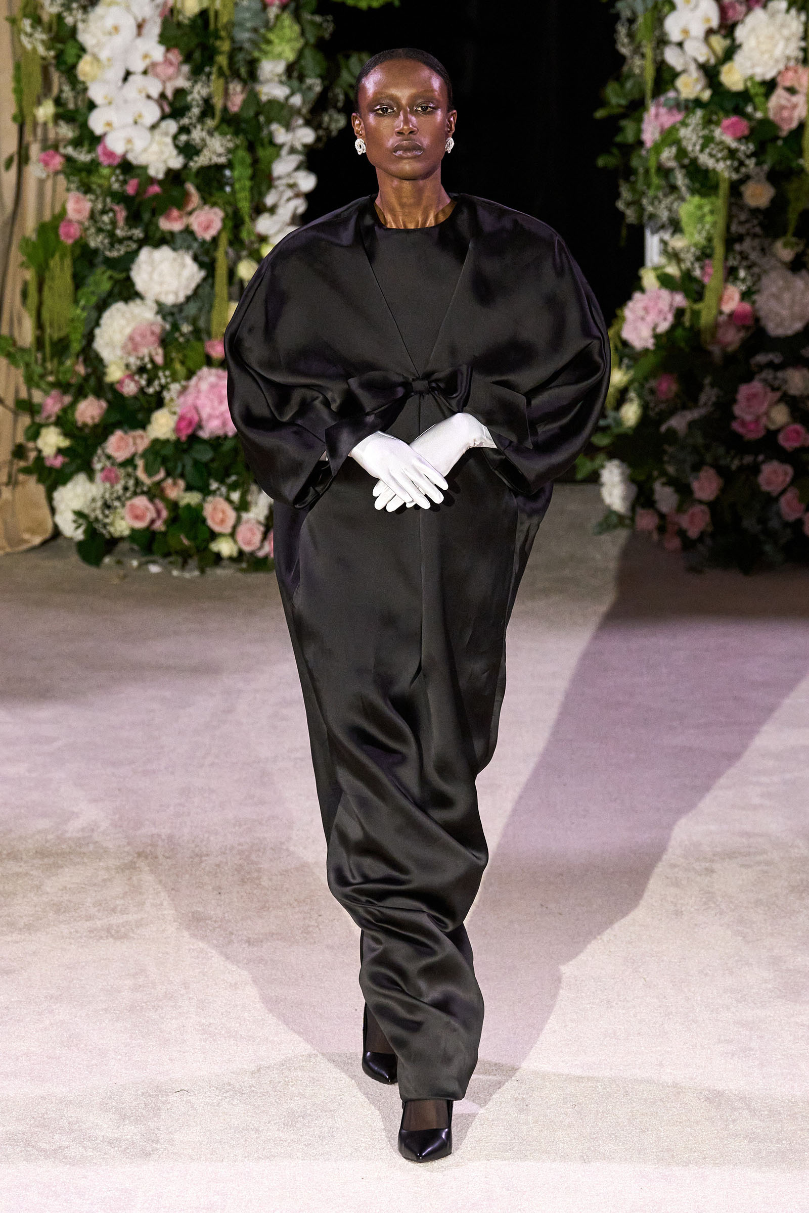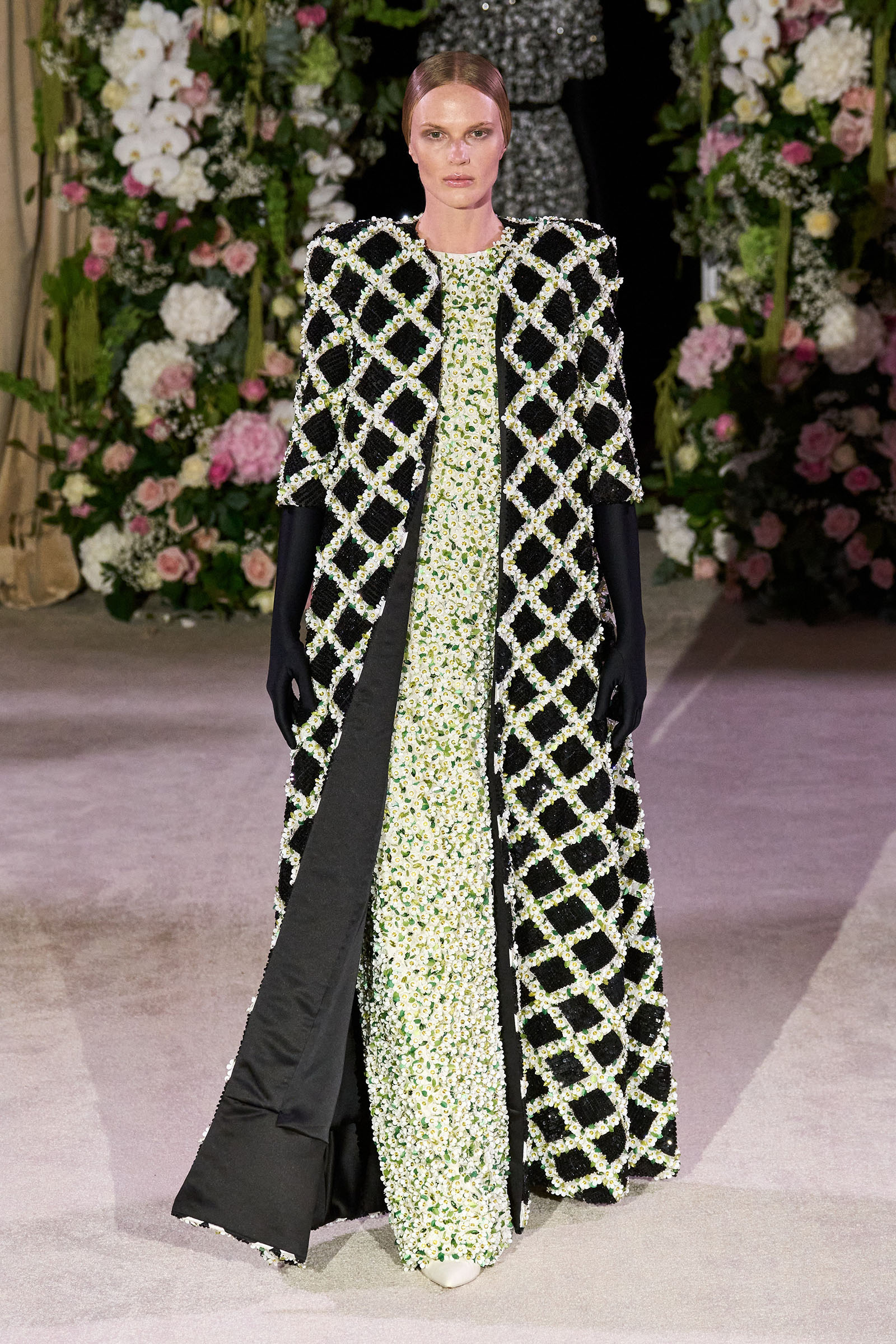 Amid banks of fresh flowers and live music from a men’s choir, Richard Quinn sent out an exquisitely made collection that was a soaring tribute to his late father, Patrick, who passed away in June. “I wanted it to be angelic and ethereal. Something where everyone could feel and know who my father was. His work was next door to mine, and my team knew him really, really well because he was always in, always involved with building the sets for the shows.”
