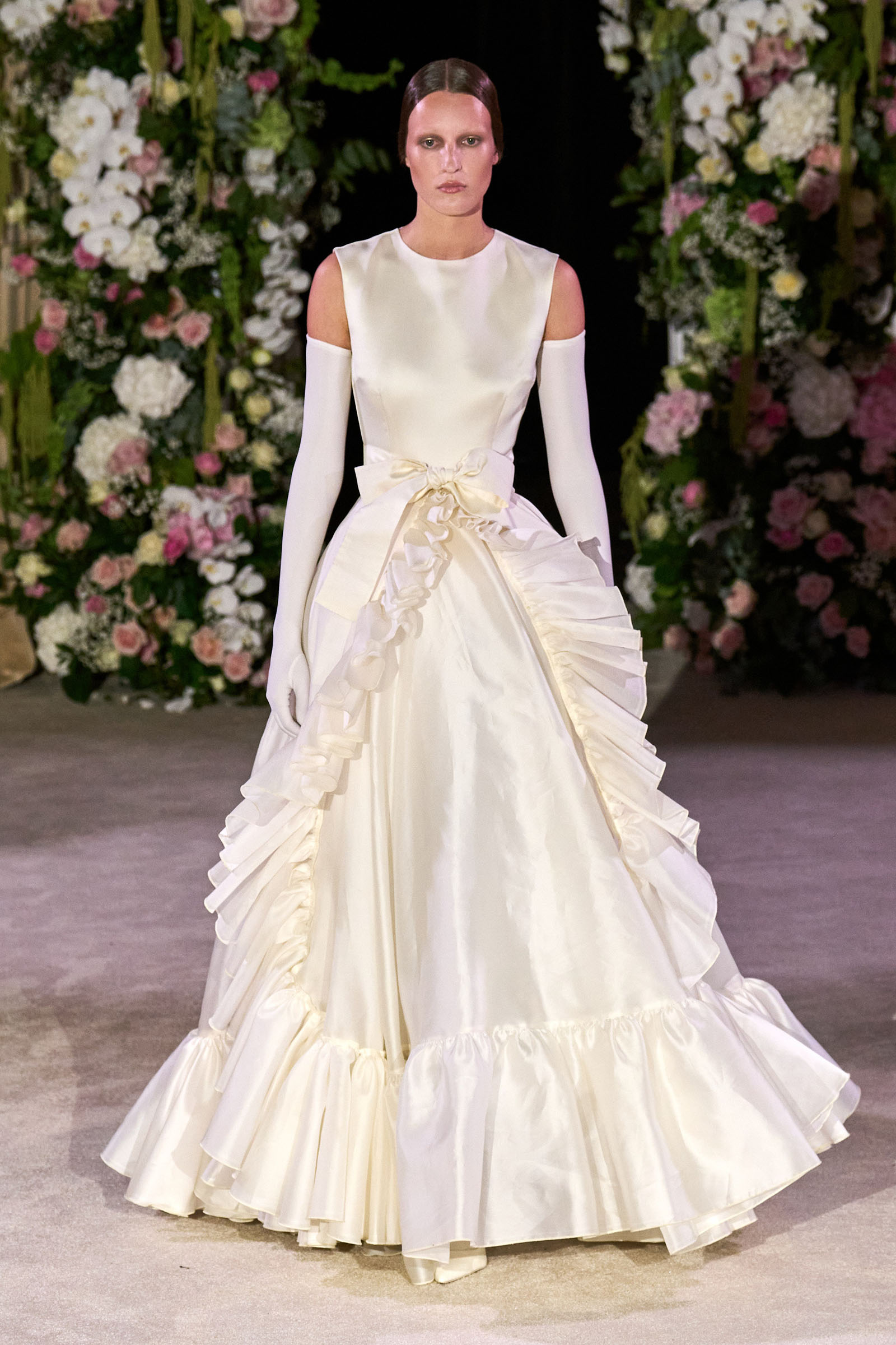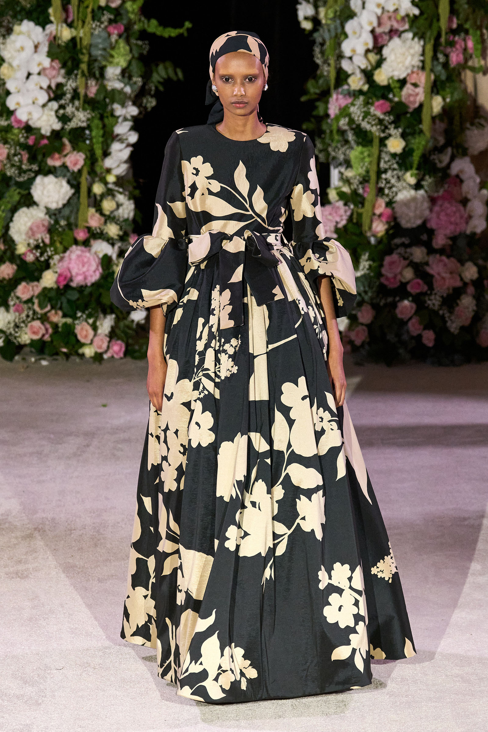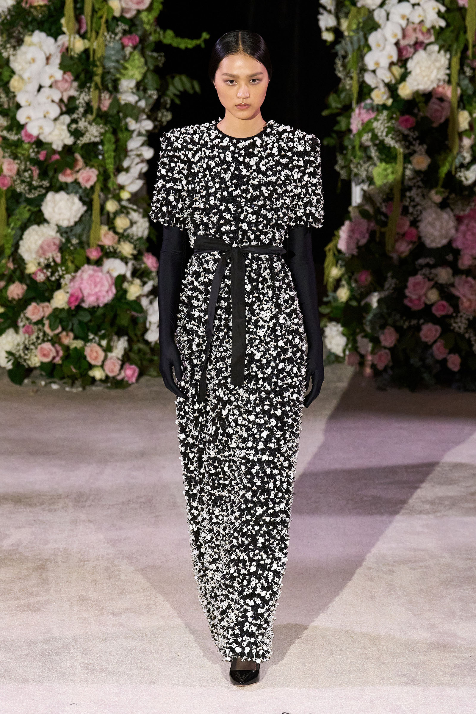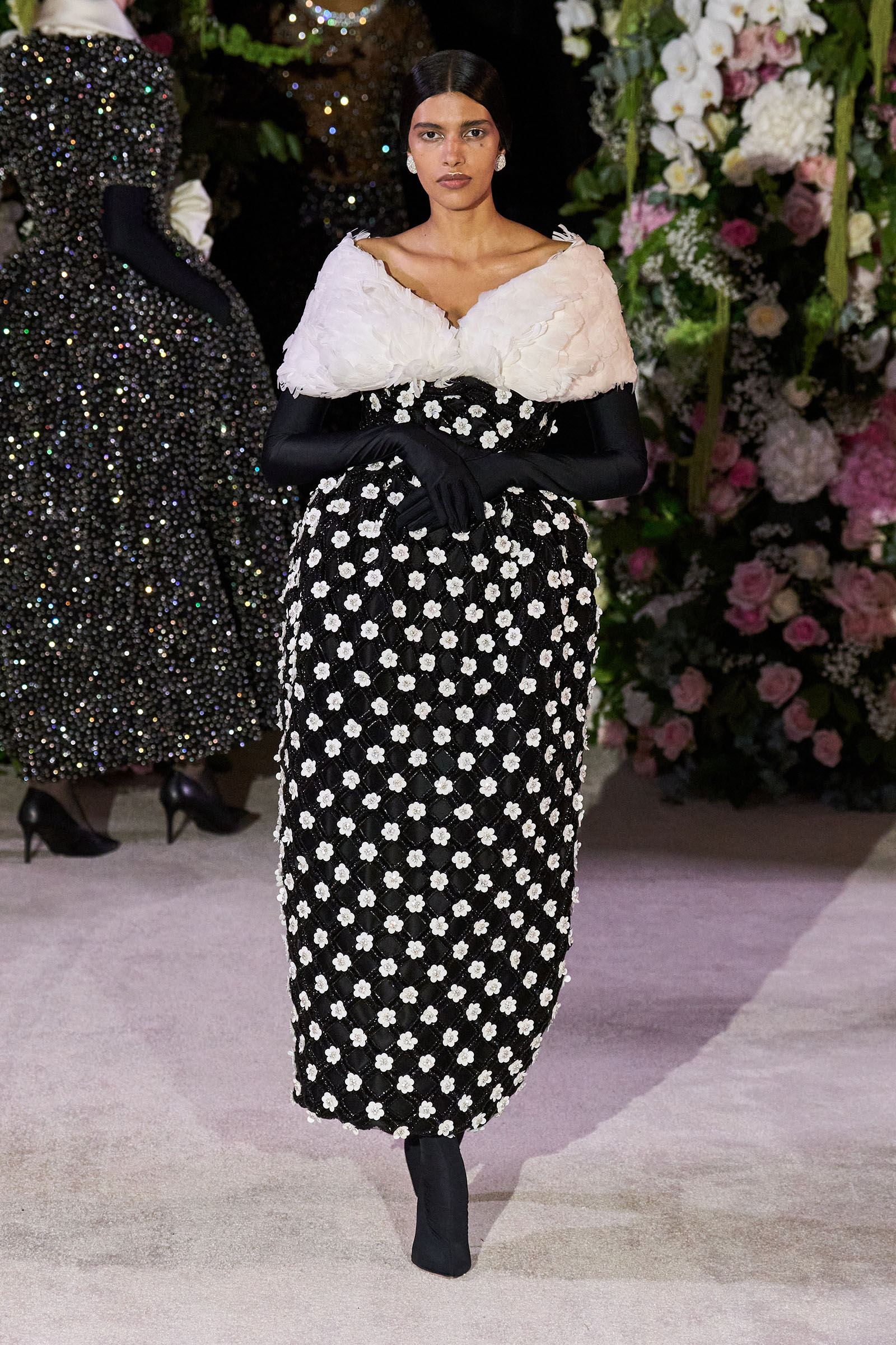 Amid banks of fresh flowers and live music from a men’s choir, Richard Quinn sent out an exquisitely made collection that was a soaring tribute to his late father, Patrick, who passed away in June. “I wanted it to be angelic and ethereal. Something where everyone could feel and know who my father was. His work was next door to mine, and my team knew him really, really well because he was always in, always involved with building the sets for the shows.”