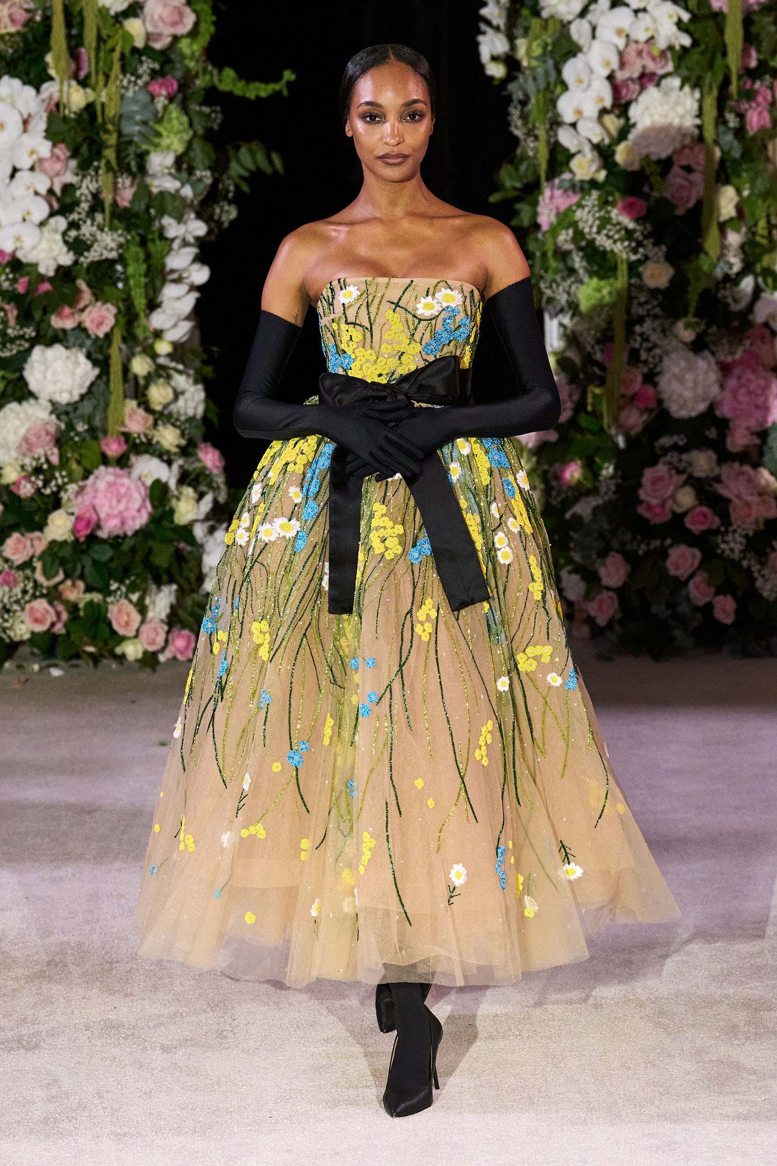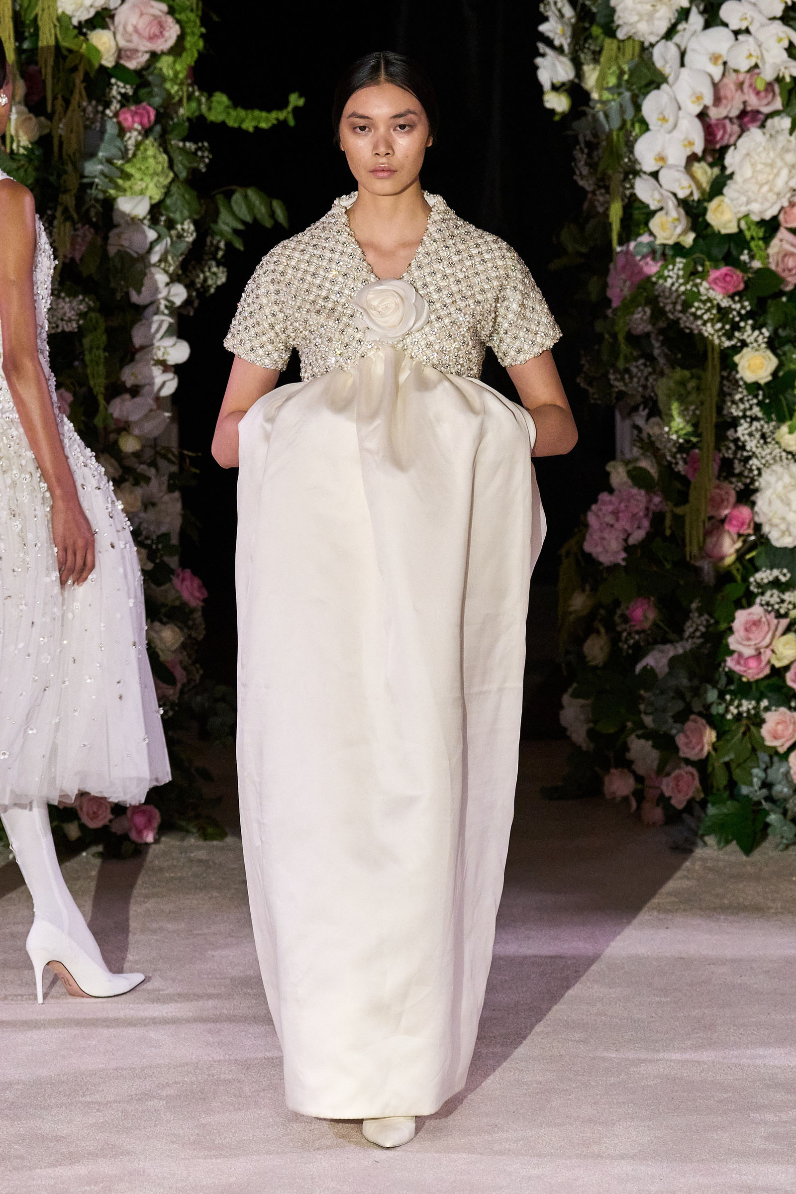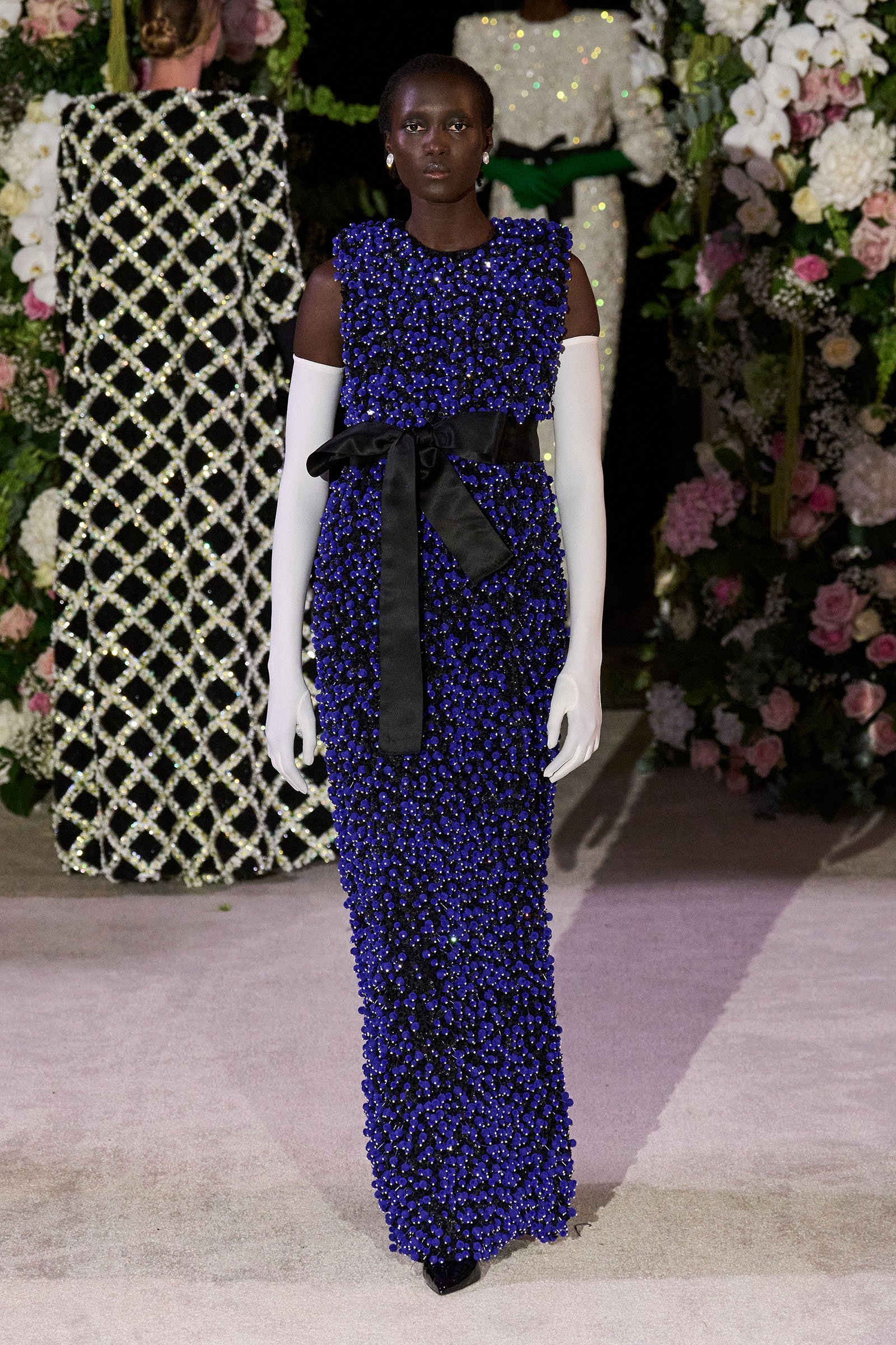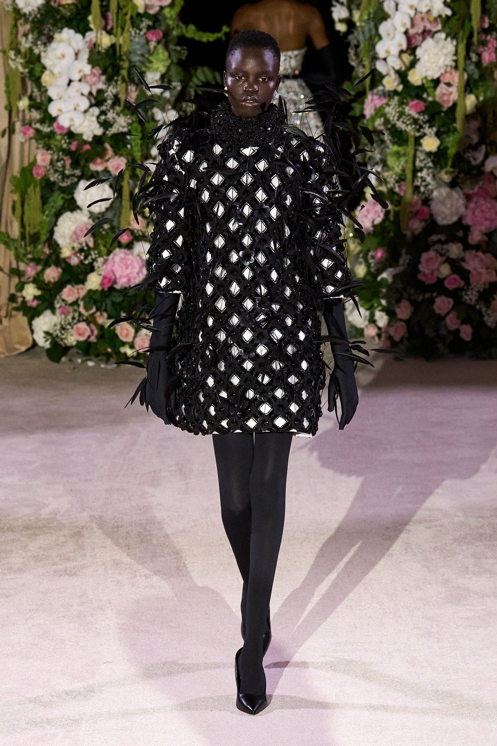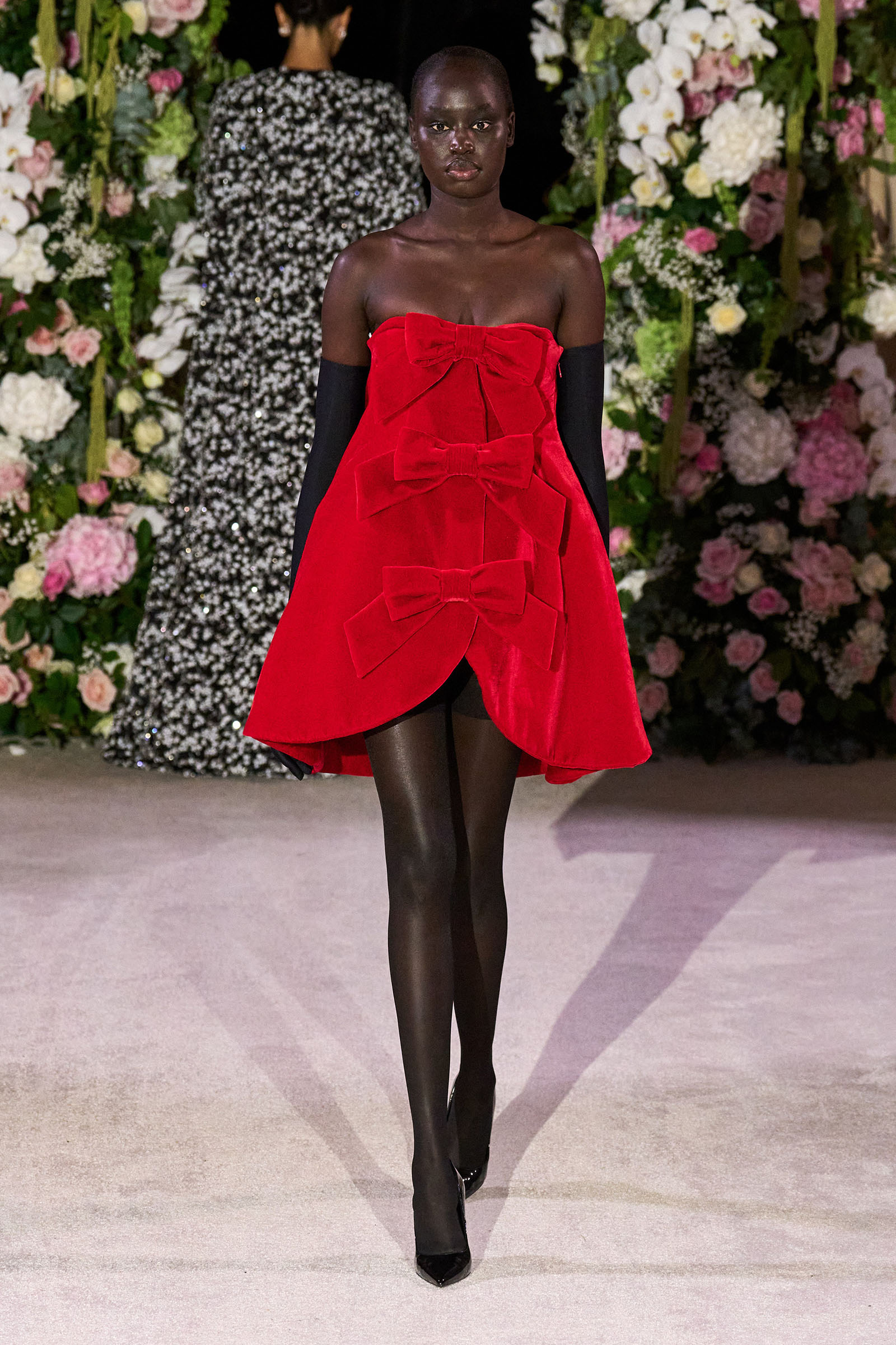 Amid banks of fresh flowers and live music from a men’s choir, Richard Quinn sent out an exquisitely made collection that was a soaring tribute to his late father, Patrick, who passed away in June. “I wanted it to be angelic and ethereal. Something where everyone could feel and know who my father was. His work was next door to mine, and my team knew him really, really well because he was always in, always involved with building the sets for the shows.”