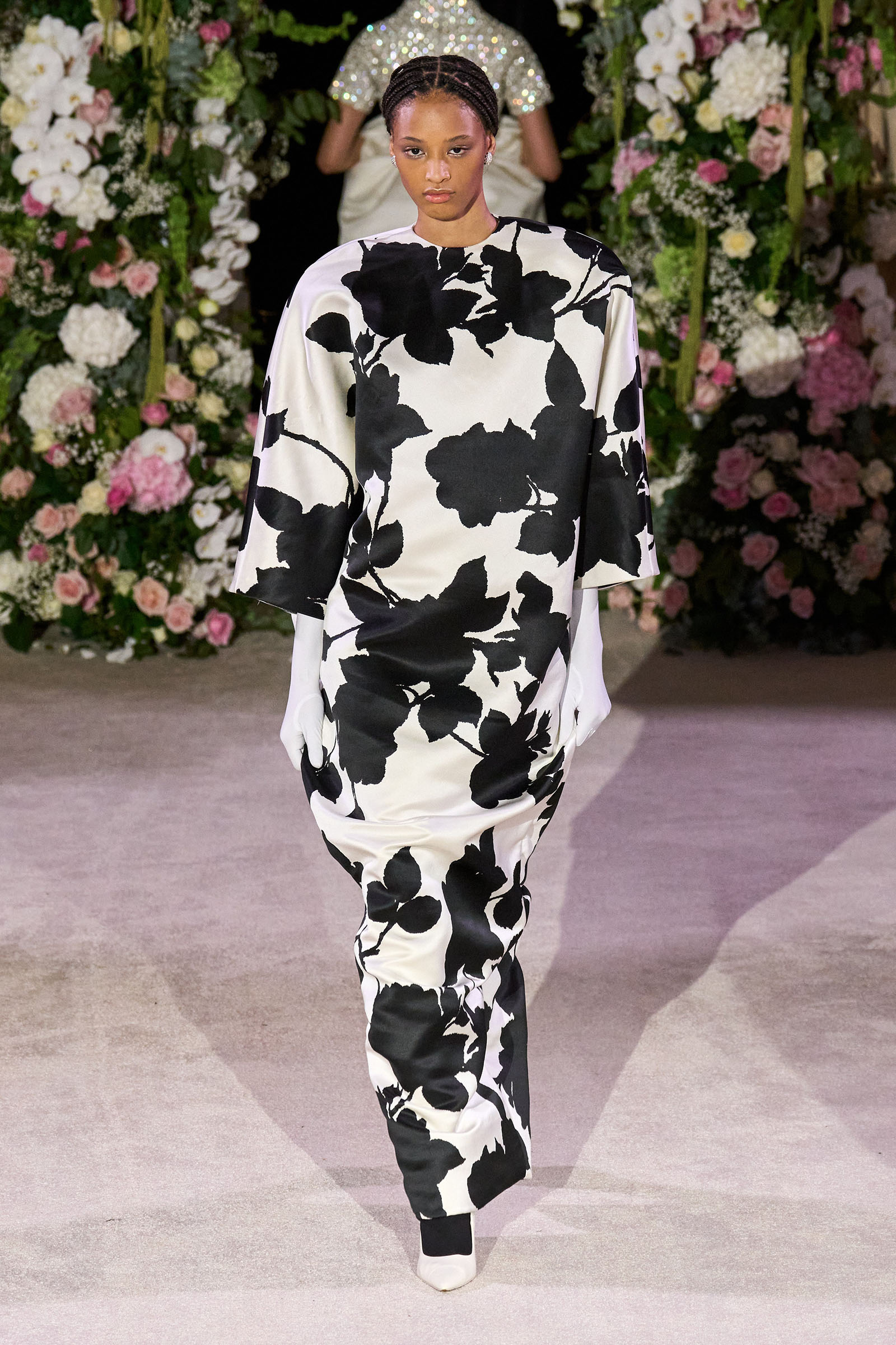 Sometimes in the ebullient drama of Quinn’s shows—his penchant for theatrical silhouettes and gimp masks amid his insanely maximalist English flower-printed scenarios—his growing ability to concentrate on detail and fit didn’t register. This time, with the latex and masks replaced with soigné hair by Sam McKnight and the models walking deliberately close to the audience, the beauty and lightness of his dresses were palpable.