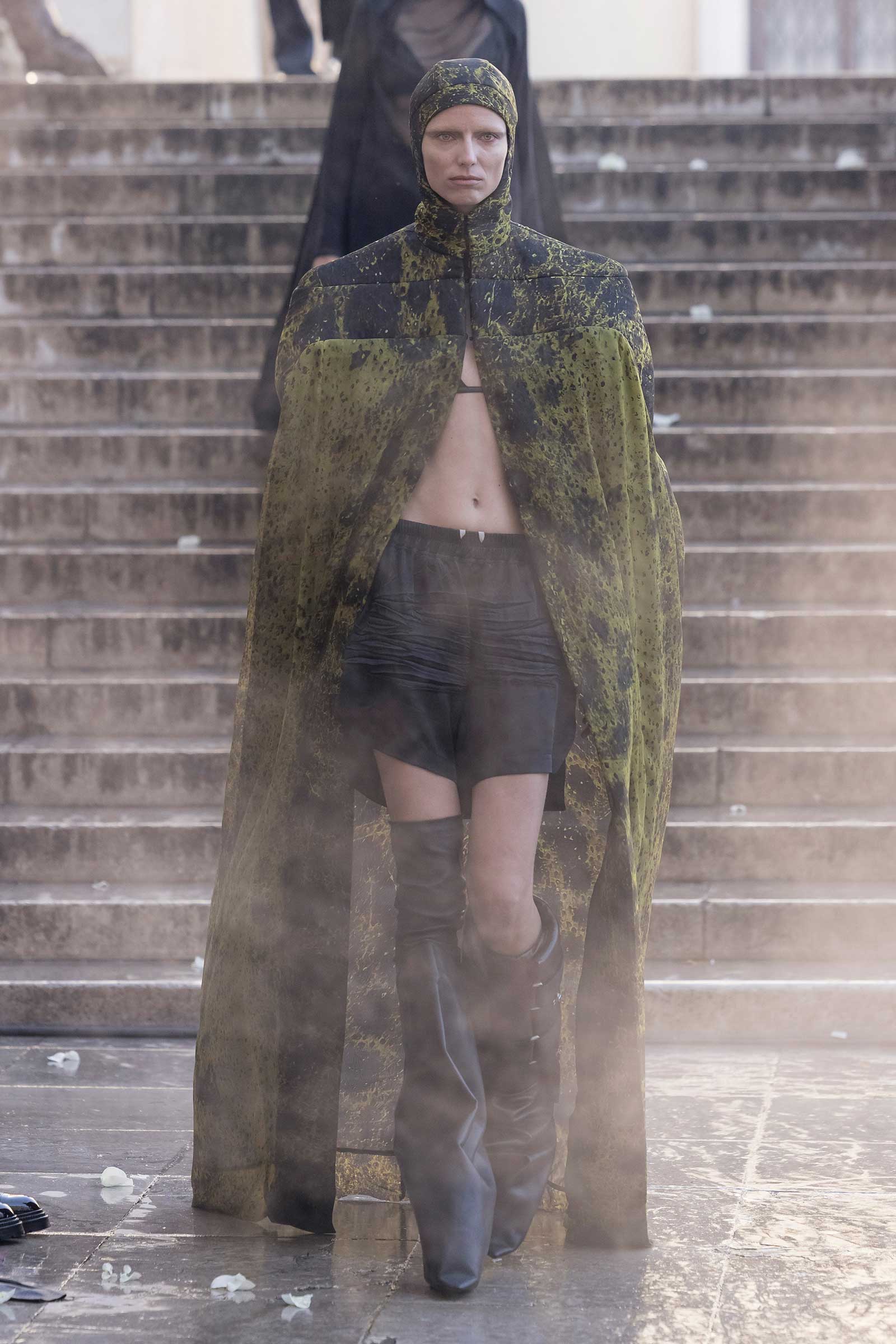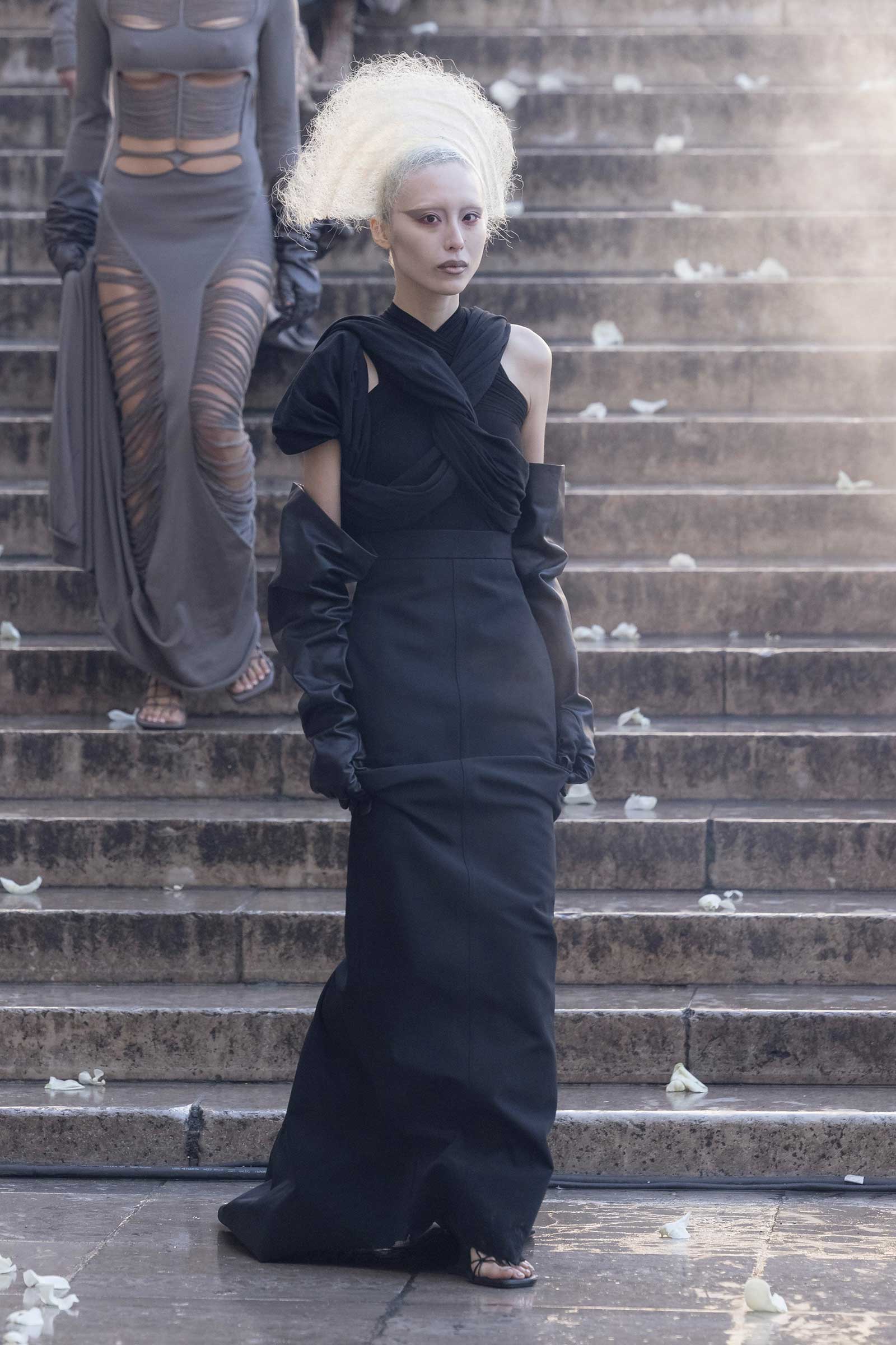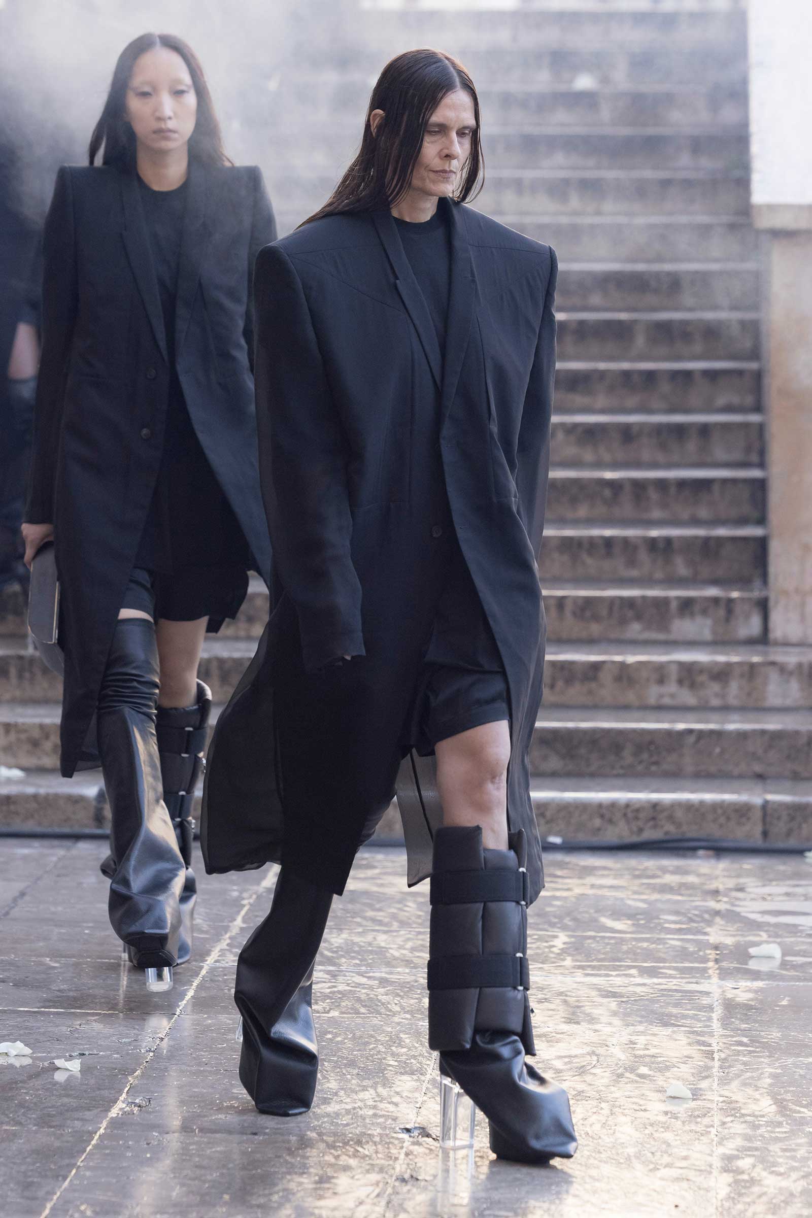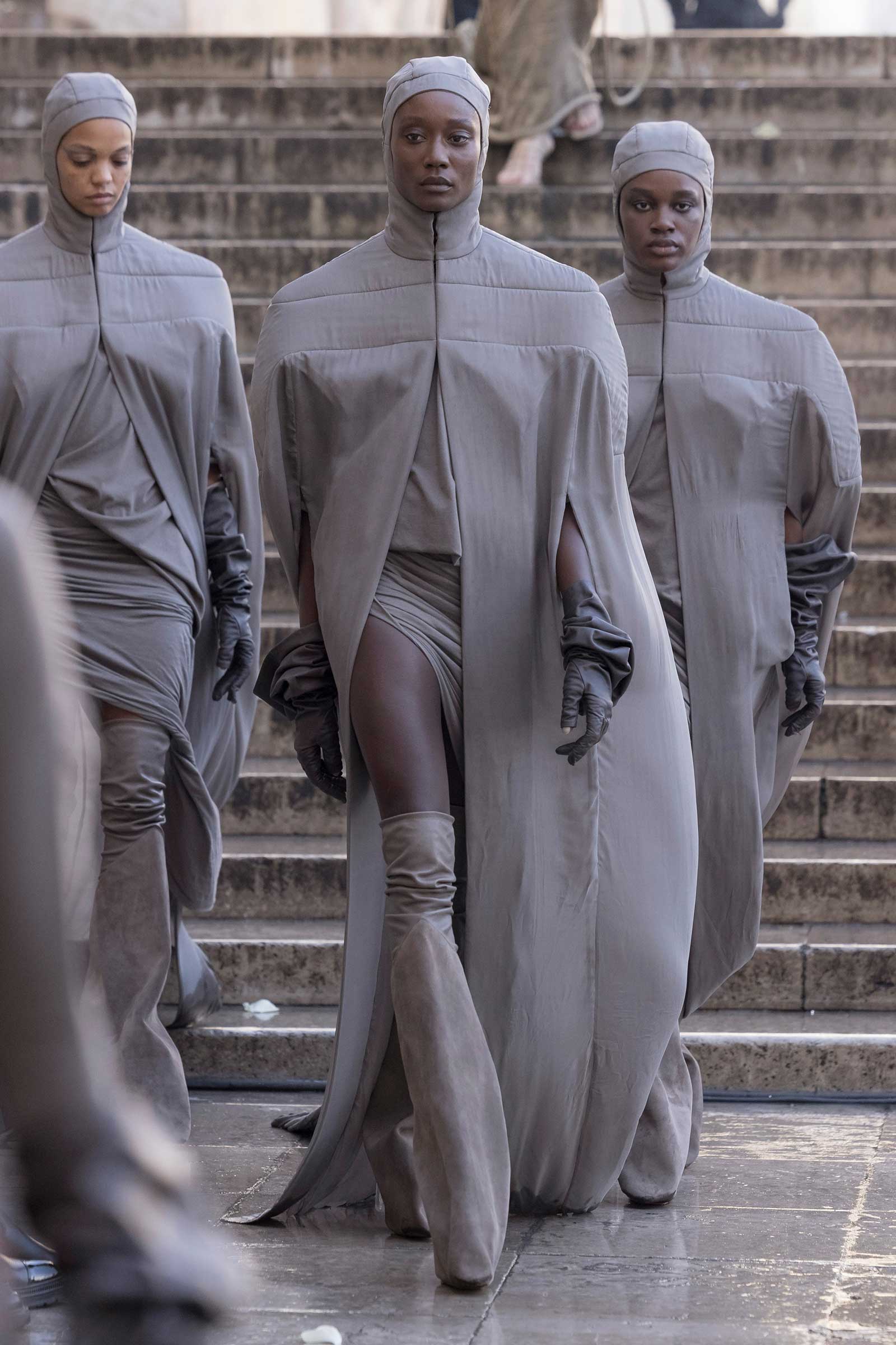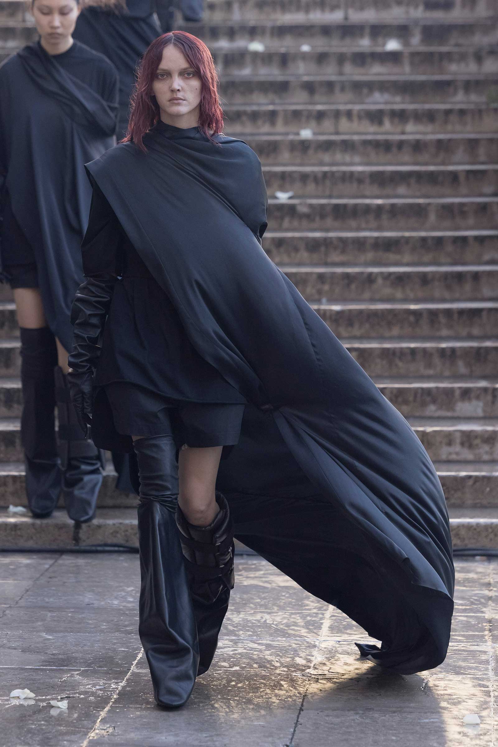 There were texts flying back and forth all over town. Is Rick really outside? It’s been a gloomy Paris Fashion Week, and it didn’t look like the rain would let up as showtime approached. In September, Rick Owens’s shows are usually held outside, staged on the monumental and highly cinematic terrace of the Palais de Tokyo. But then, by some stroke of luck, or maybe it was the tiny Ganesh figurine placed under the bench in Row B to ward off the clouds, the sun finally broke through. It was as if Cecil B. DeMille or Ken Russell, two of the movie directors Owens often quotes, were calling the shots from somewhere off-set.