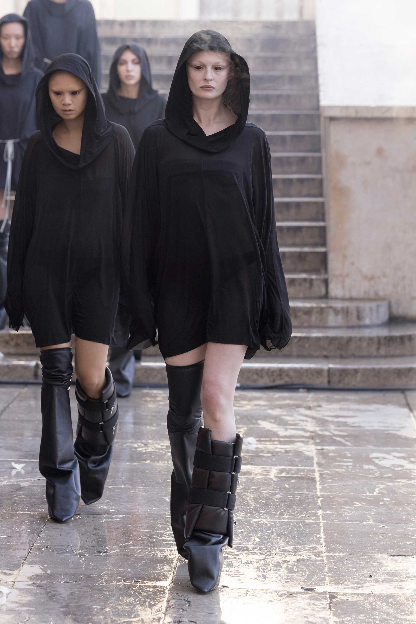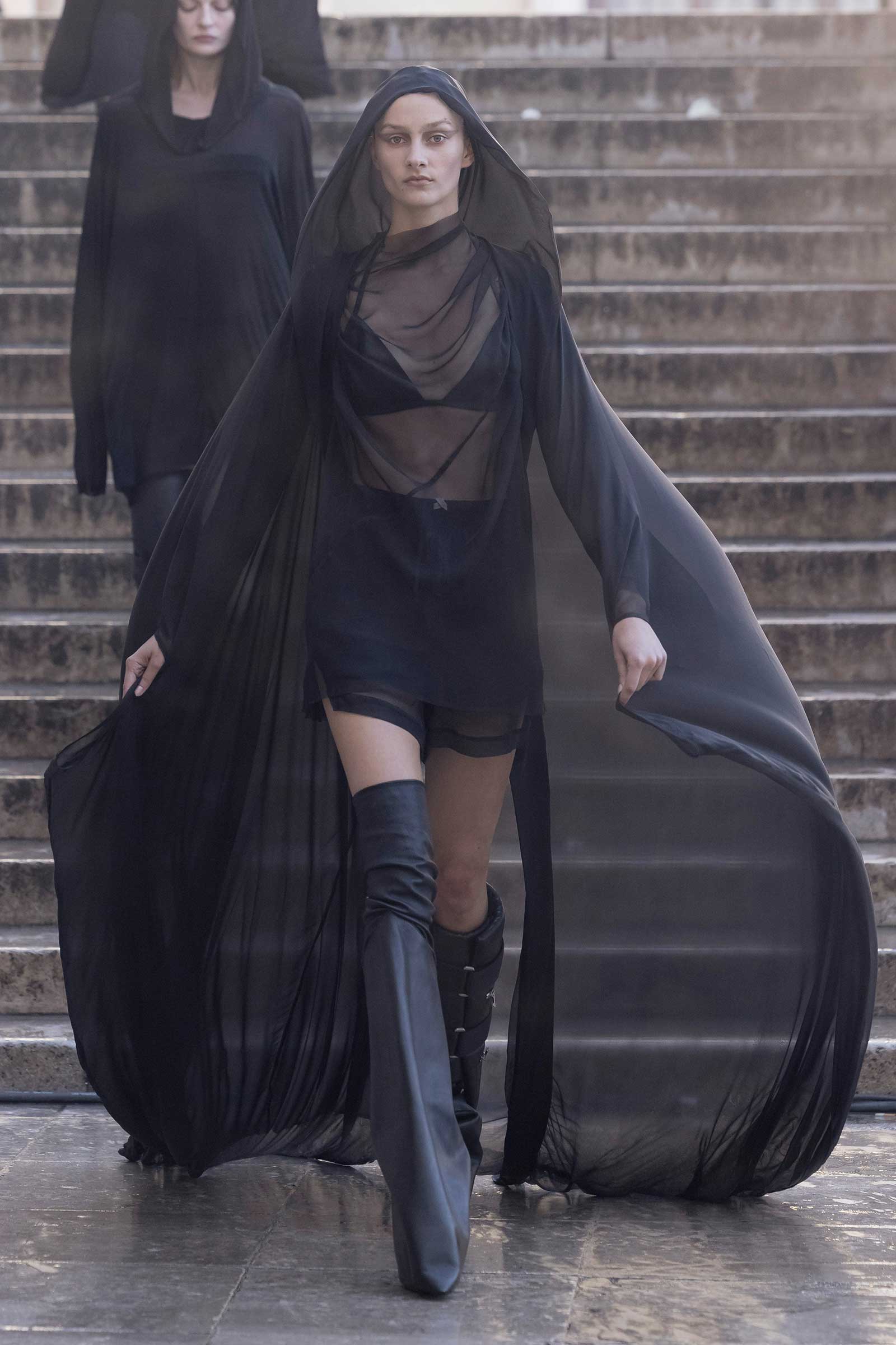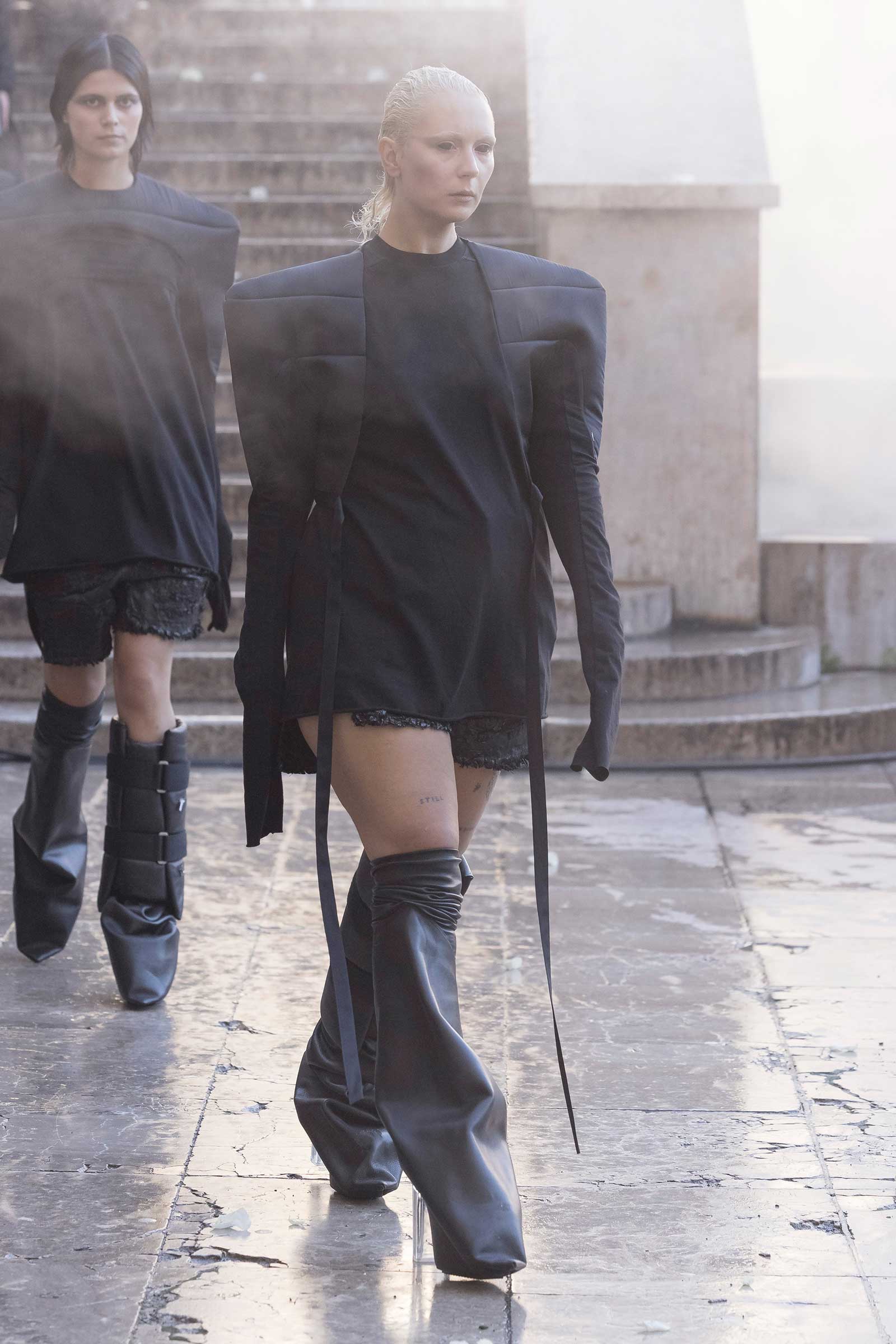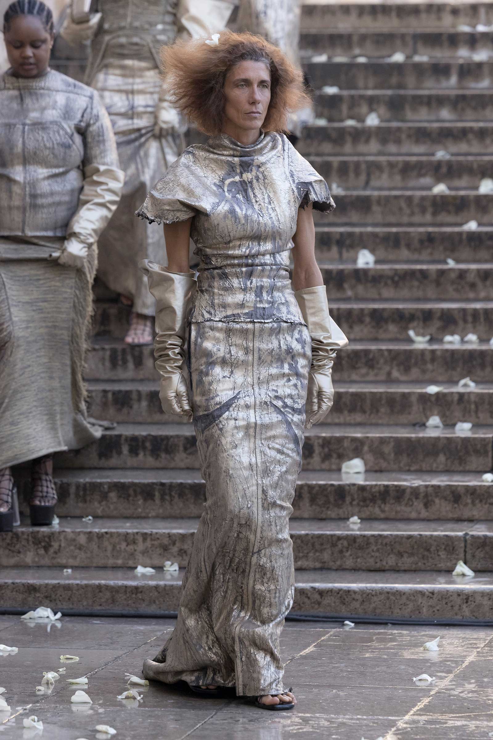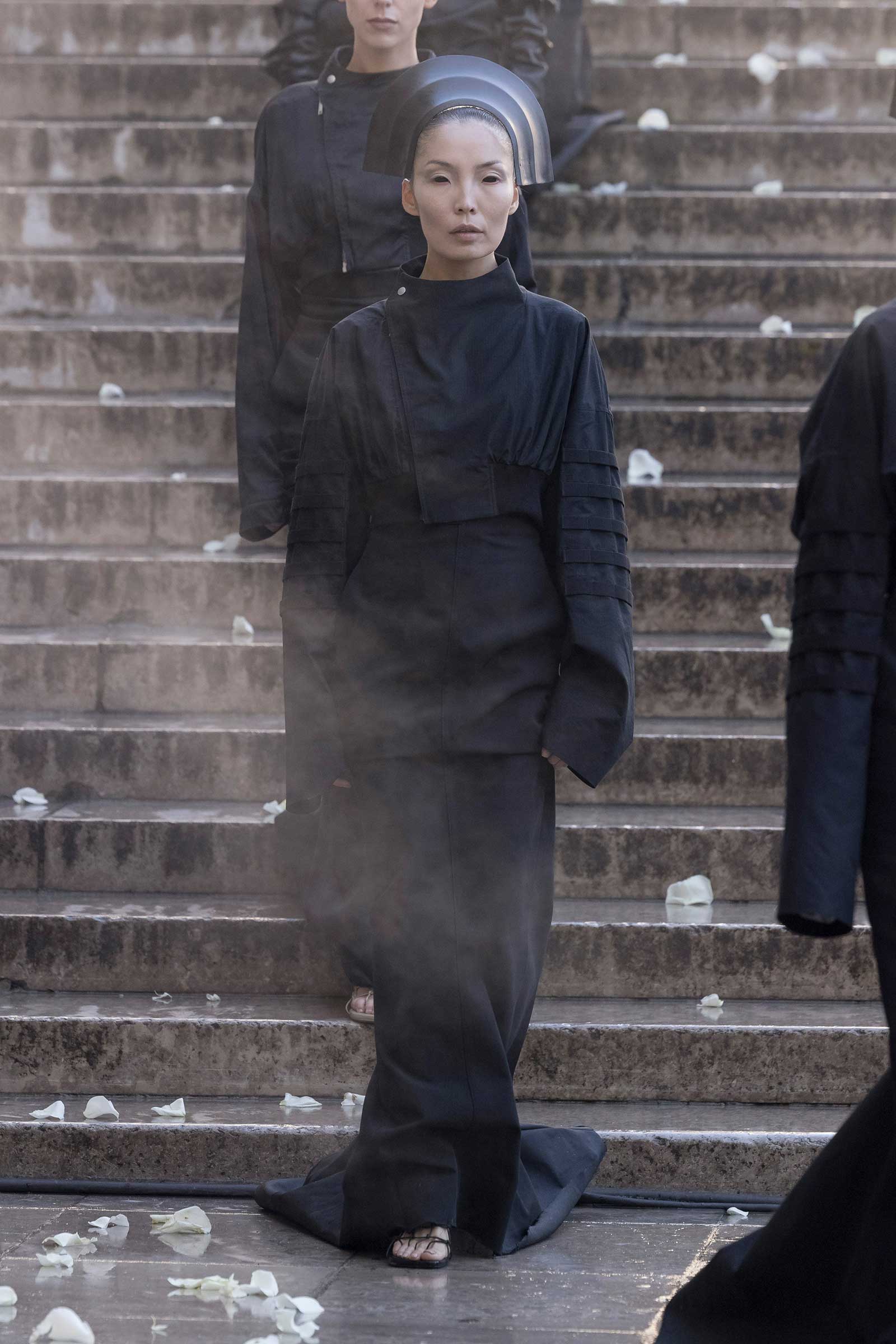 There were texts flying back and forth all over town. Is Rick really outside? It’s been a gloomy Paris Fashion Week, and it didn’t look like the rain would let up as showtime approached. In September, Rick Owens’s shows are usually held outside, staged on the monumental and highly cinematic terrace of the Palais de Tokyo. But then, by some stroke of luck, or maybe it was the tiny Ganesh figurine placed under the bench in Row B to ward off the clouds, the sun finally broke through. It was as if Cecil B. DeMille or Ken Russell, two of the movie directors Owens often quotes, were calling the shots from somewhere off-set.