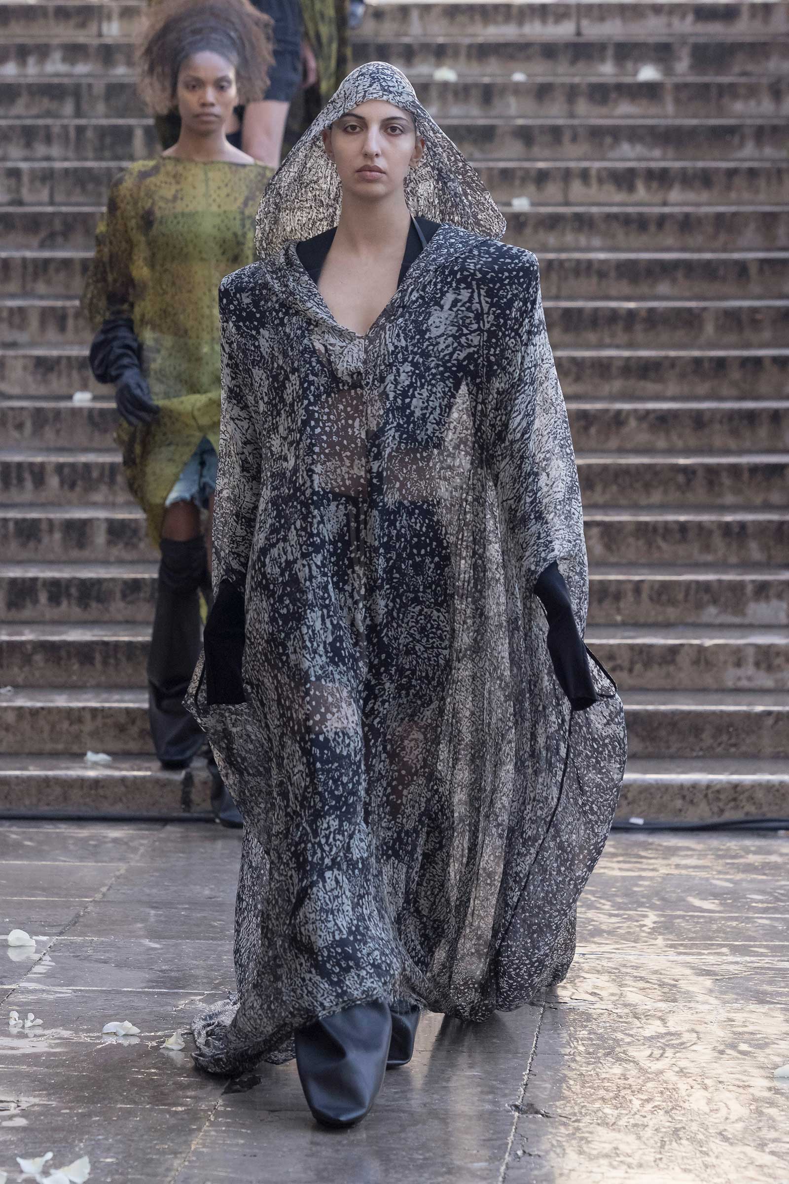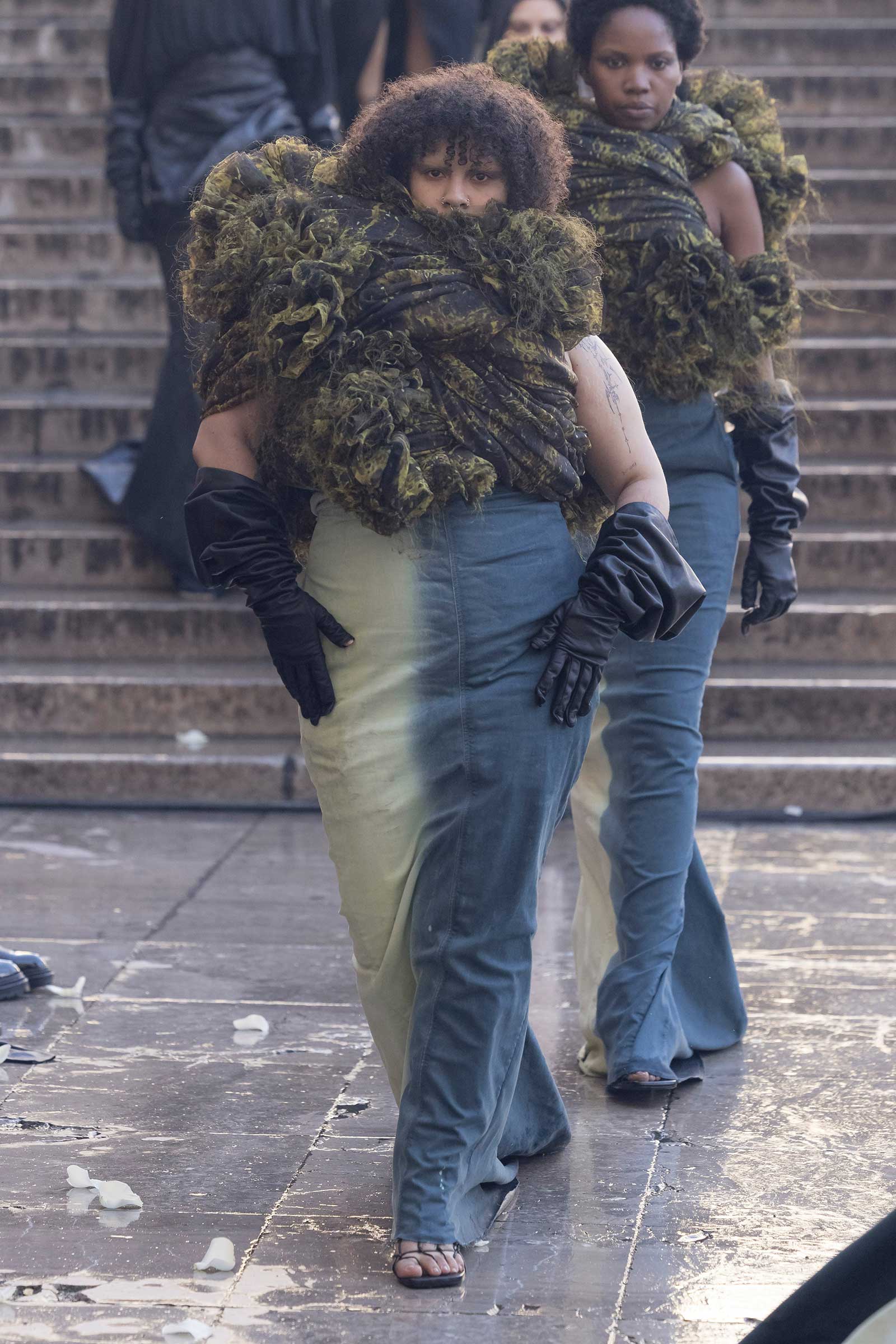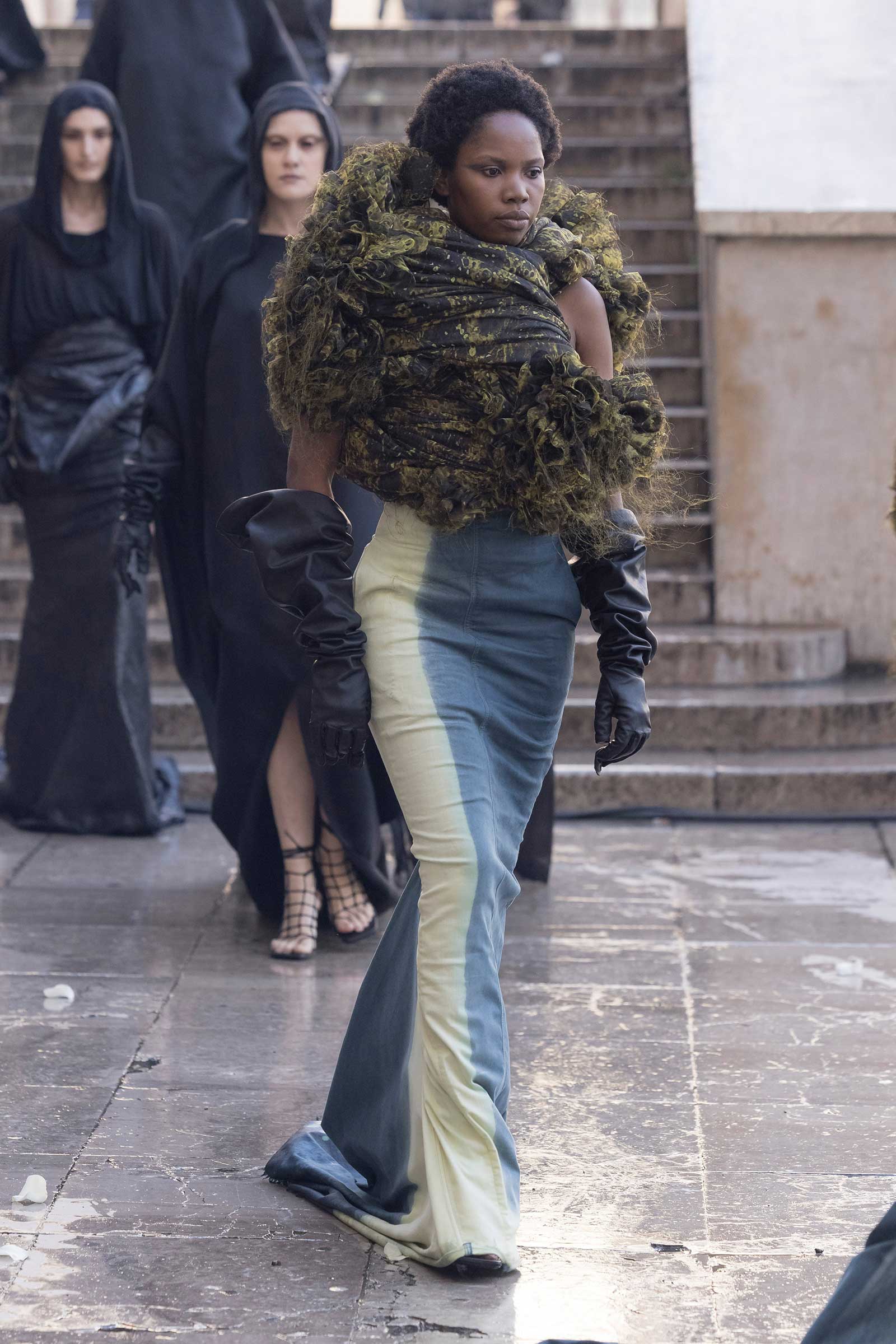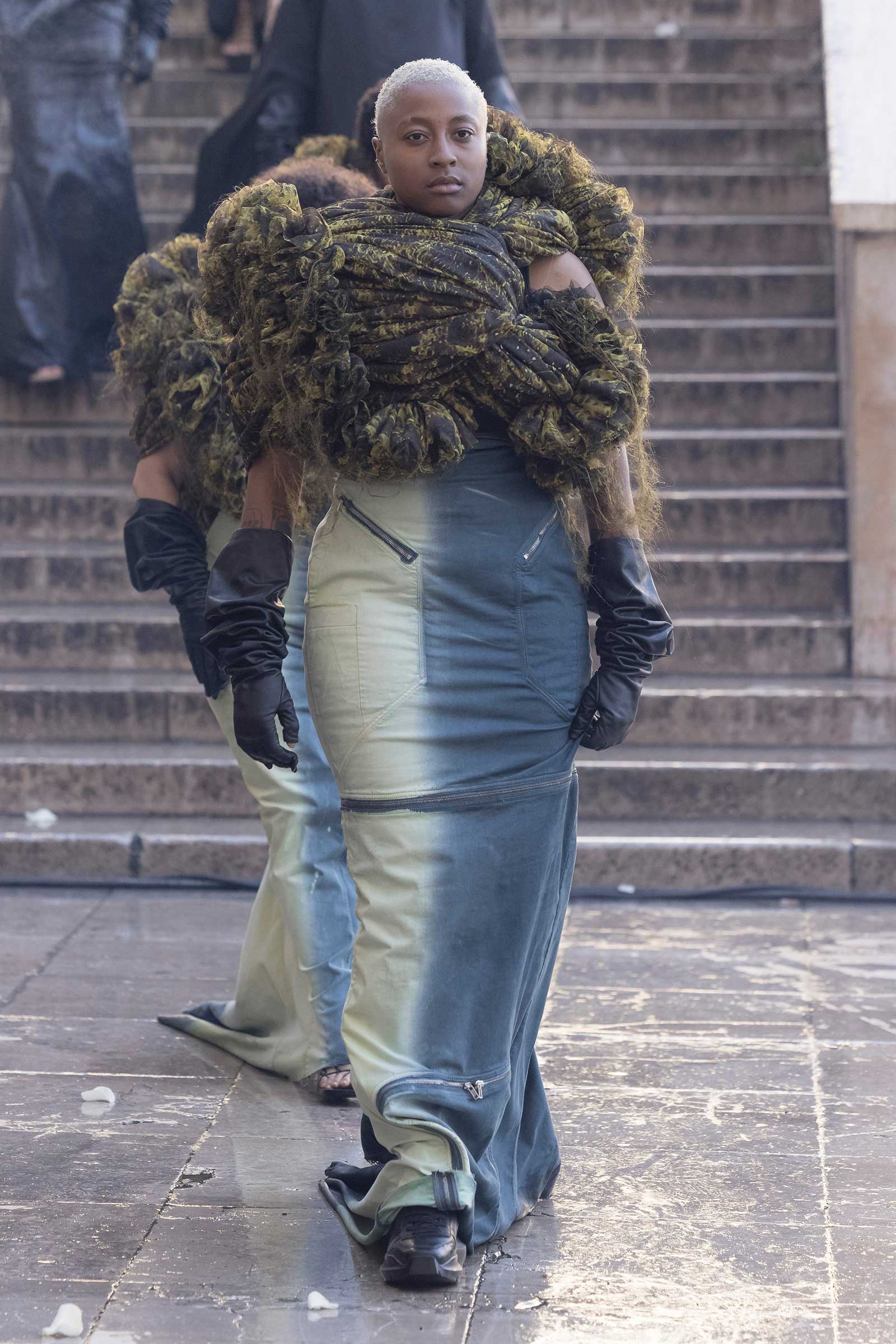 But many other looks conveyed the freedom and the let-your-freak-flag-fly vibes Owens is so brilliant at producing. Looks that combined denim cutoffs that seemed dipped in tar, prodigious tulle stoles, and deflated inflatable boots by his frequent collaborator Straytukay. Or outfits that paired airy printed chiffon caftans and capes with miles-long trains with those same towering boots. Unraveling knit gowns made in collaboration with the Slovenian artisan Tanja Vidic blended ease and grandeur quite compellingly.