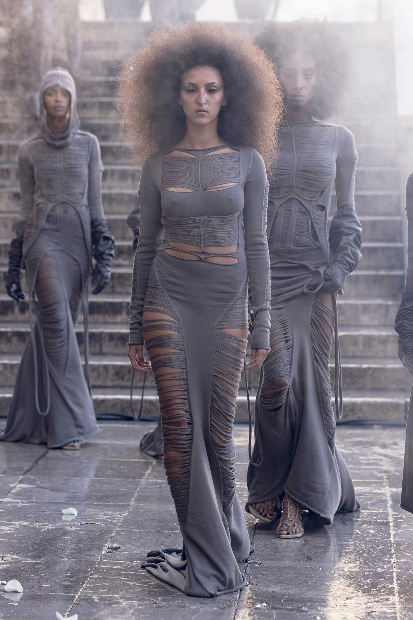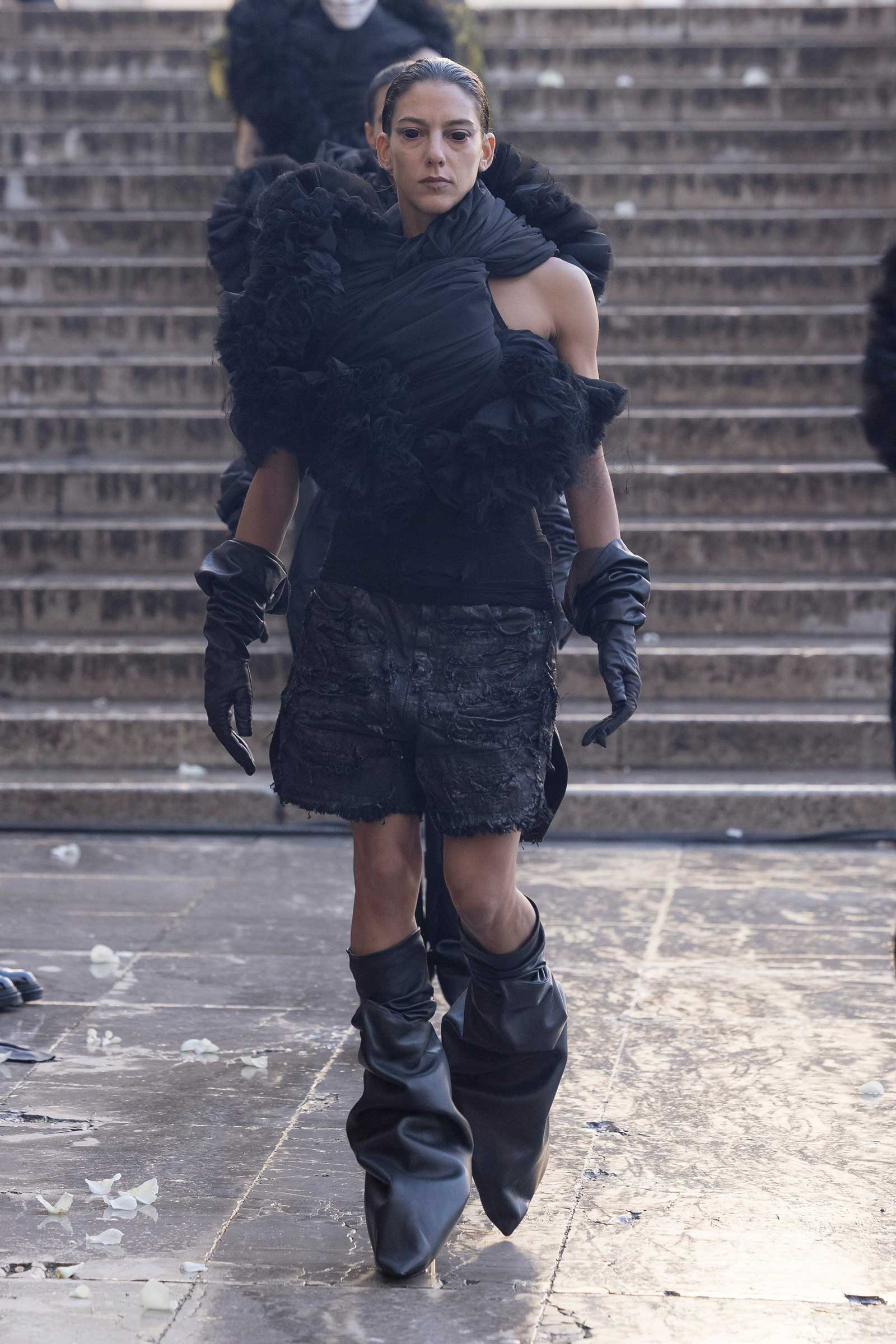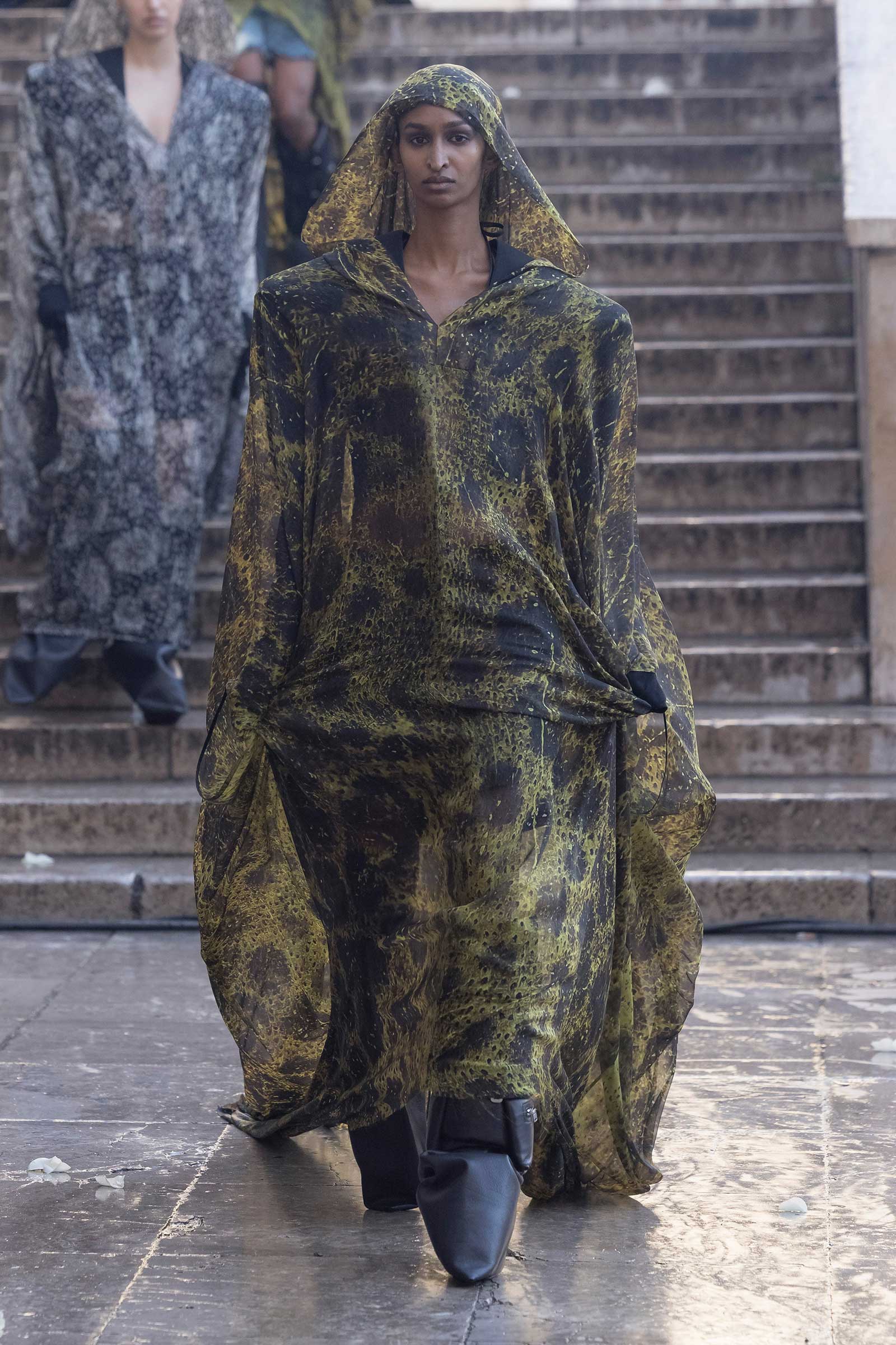 But many other looks conveyed the freedom and the let-your-freak-flag-fly vibes Owens is so brilliant at producing. Looks that combined denim cutoffs that seemed dipped in tar, prodigious tulle stoles, and deflated inflatable boots by his frequent collaborator Straytukay. Or outfits that paired airy printed chiffon caftans and capes with miles-long trains with those same towering boots. Unraveling knit gowns made in collaboration with the Slovenian artisan Tanja Vidic blended ease and grandeur quite compellingly.