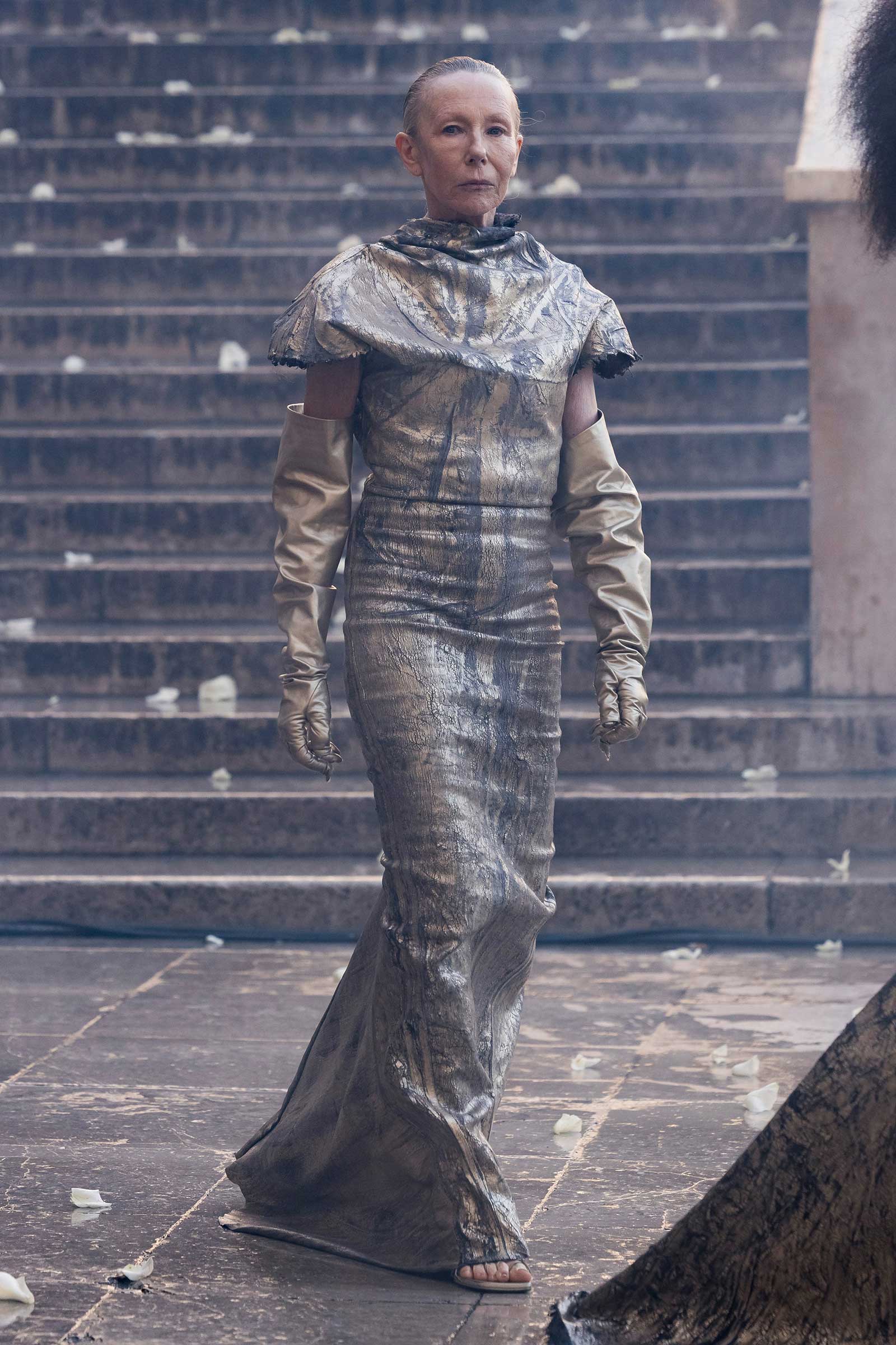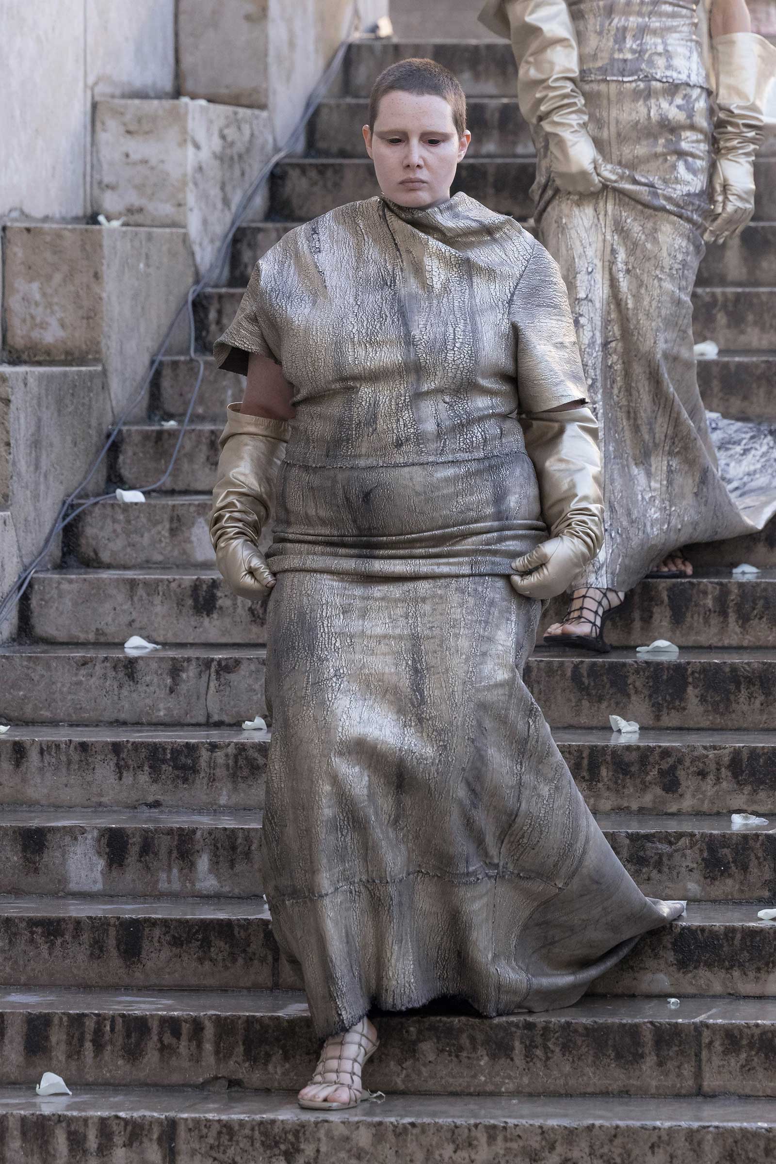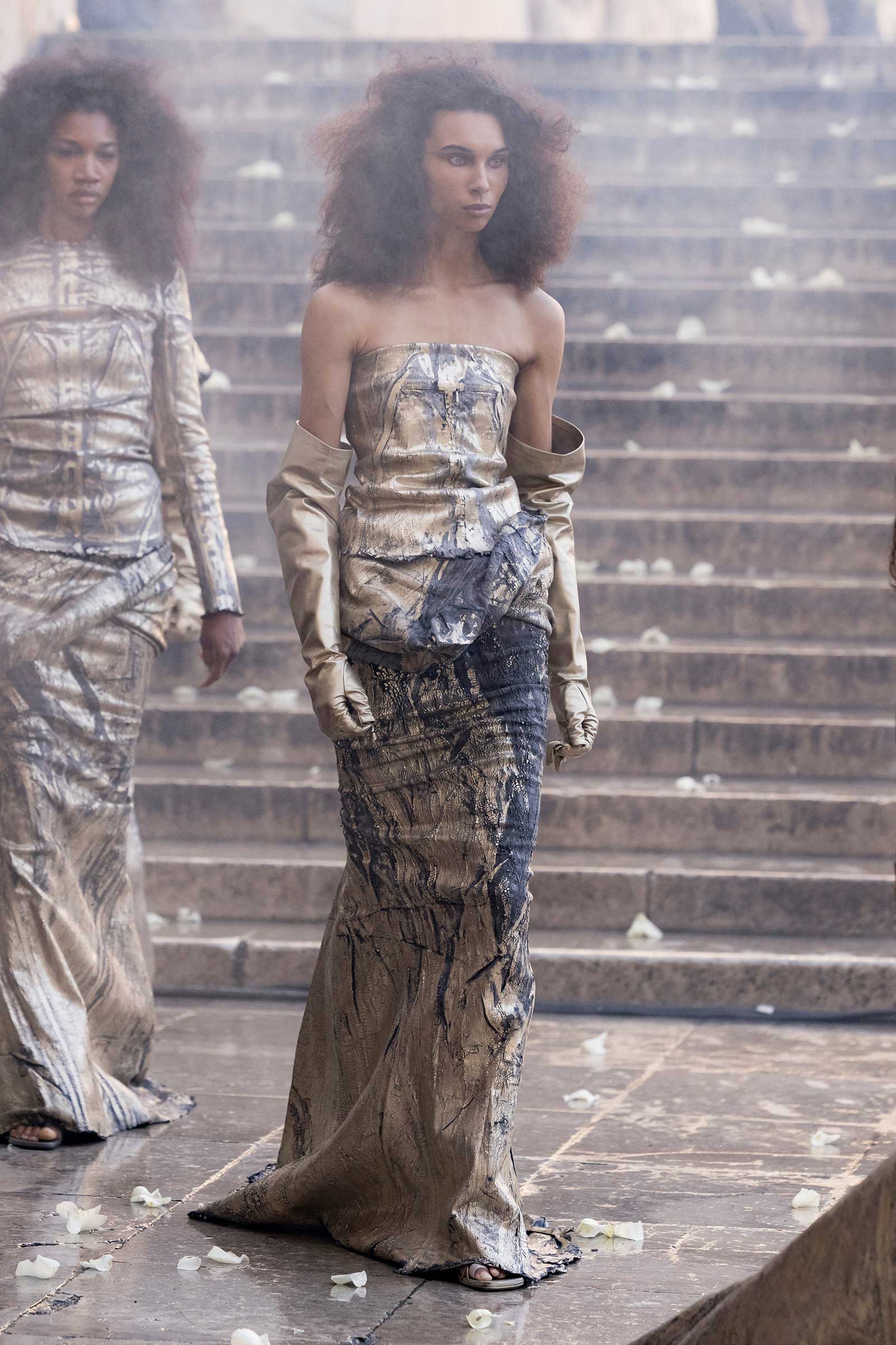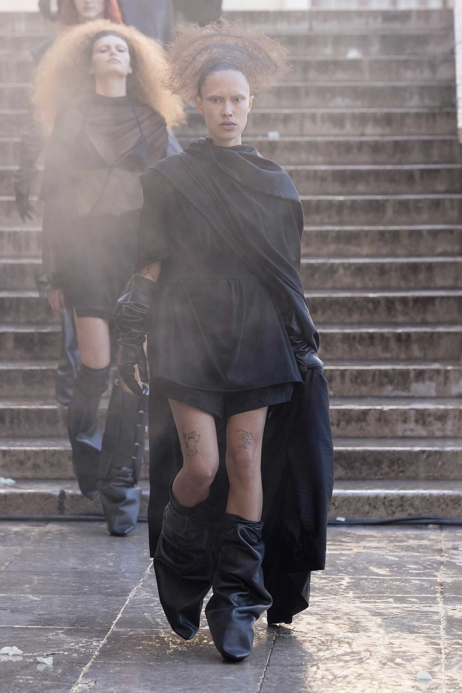 But many other looks conveyed the freedom and the let-your-freak-flag-fly vibes Owens is so brilliant at producing. Looks that combined denim cutoffs that seemed dipped in tar, prodigious tulle stoles, and deflated inflatable boots by his frequent collaborator Straytukay. Or outfits that paired airy printed chiffon caftans and capes with miles-long trains with those same towering boots. Unraveling knit gowns made in collaboration with the Slovenian artisan Tanja Vidic blended ease and grandeur quite compellingly.