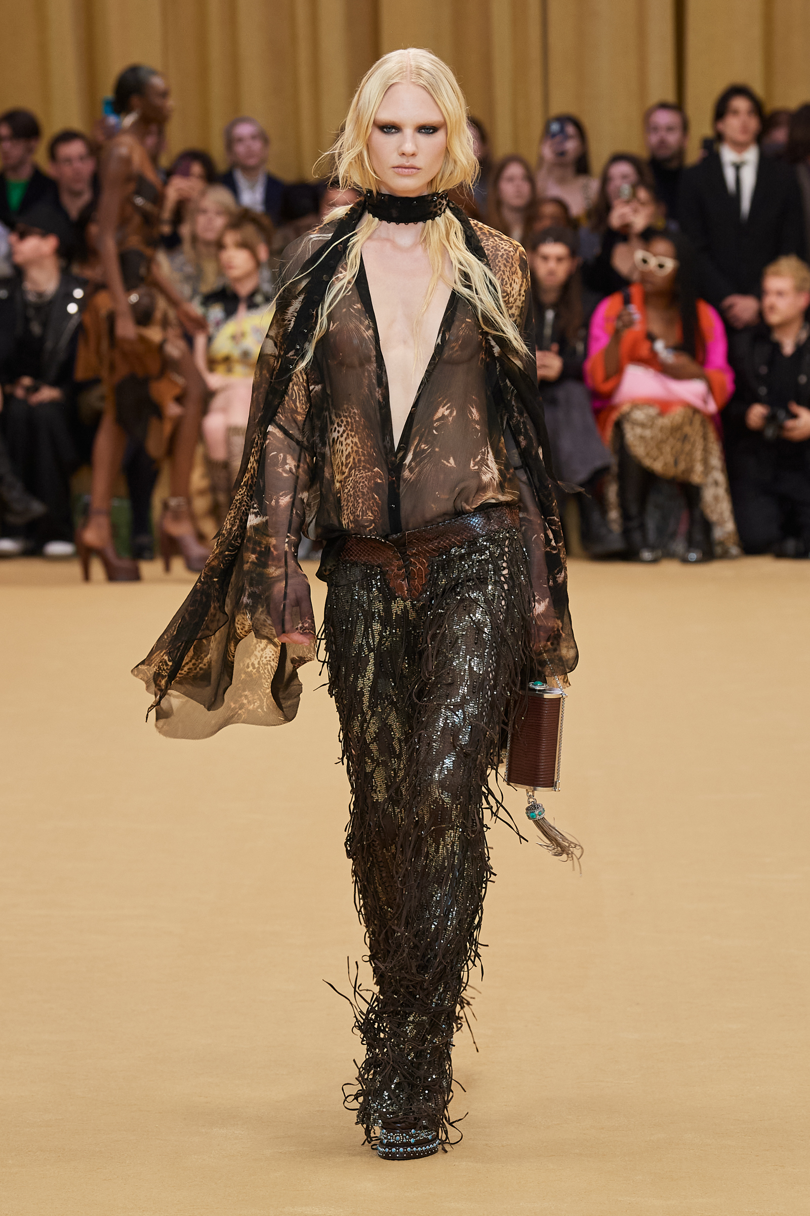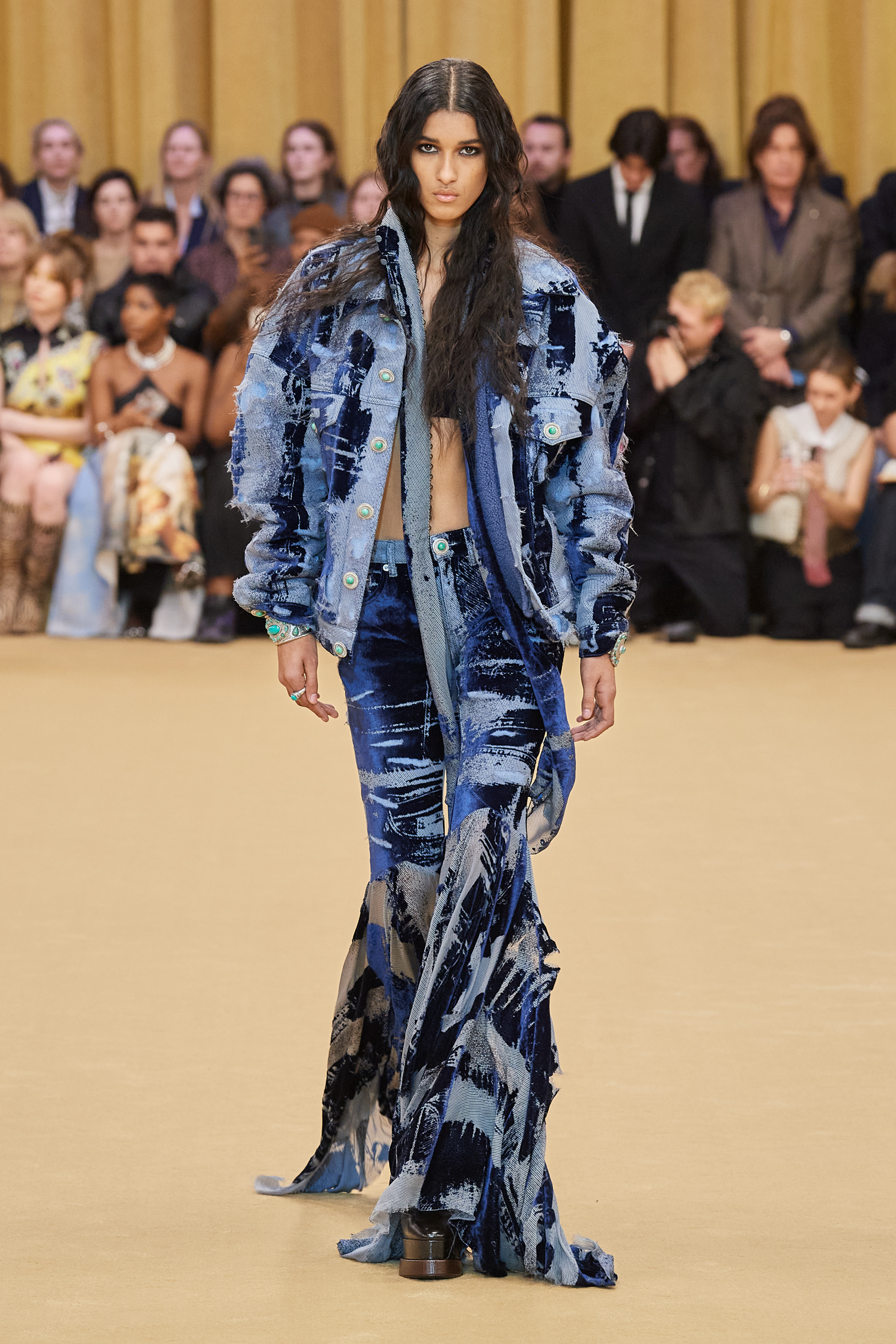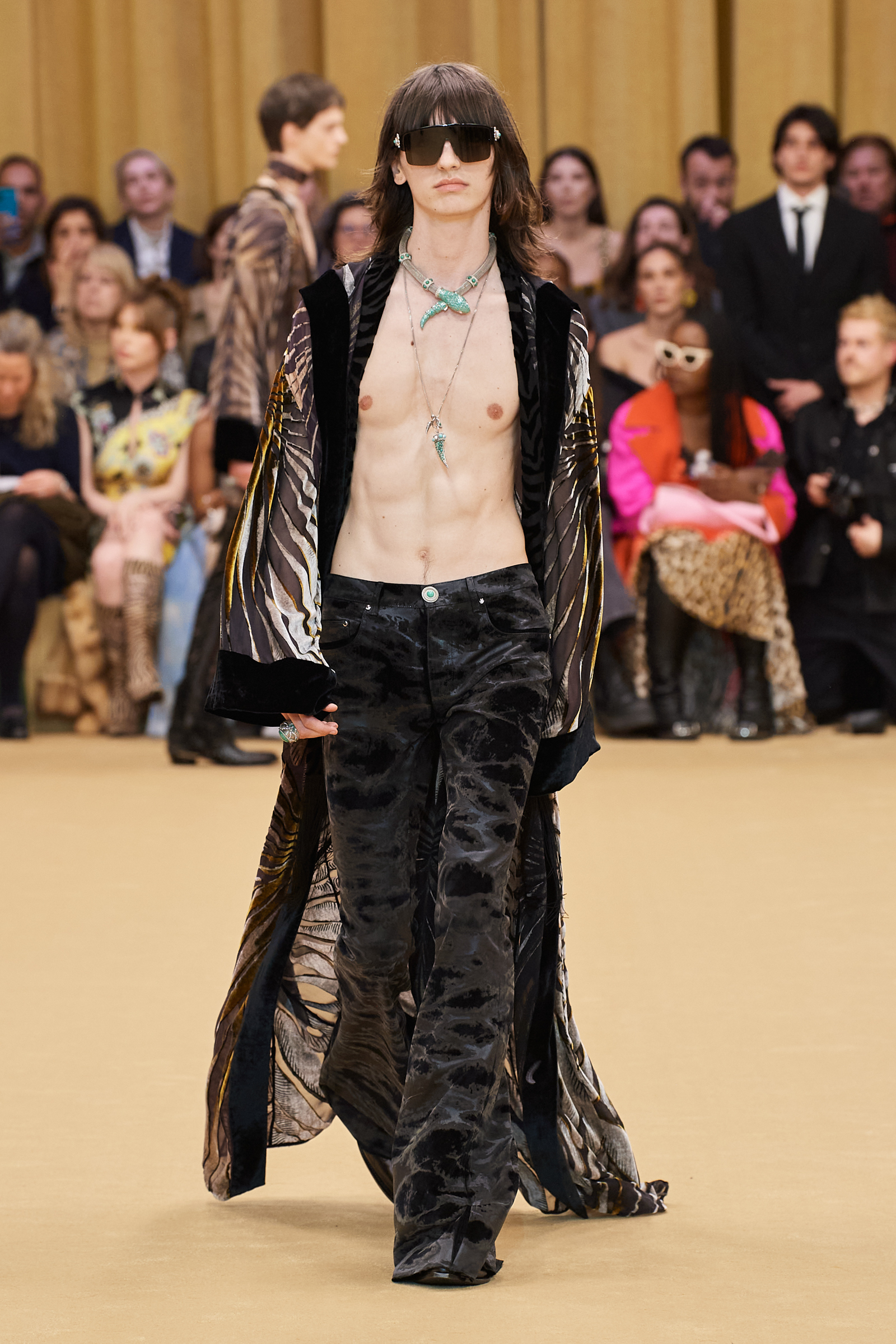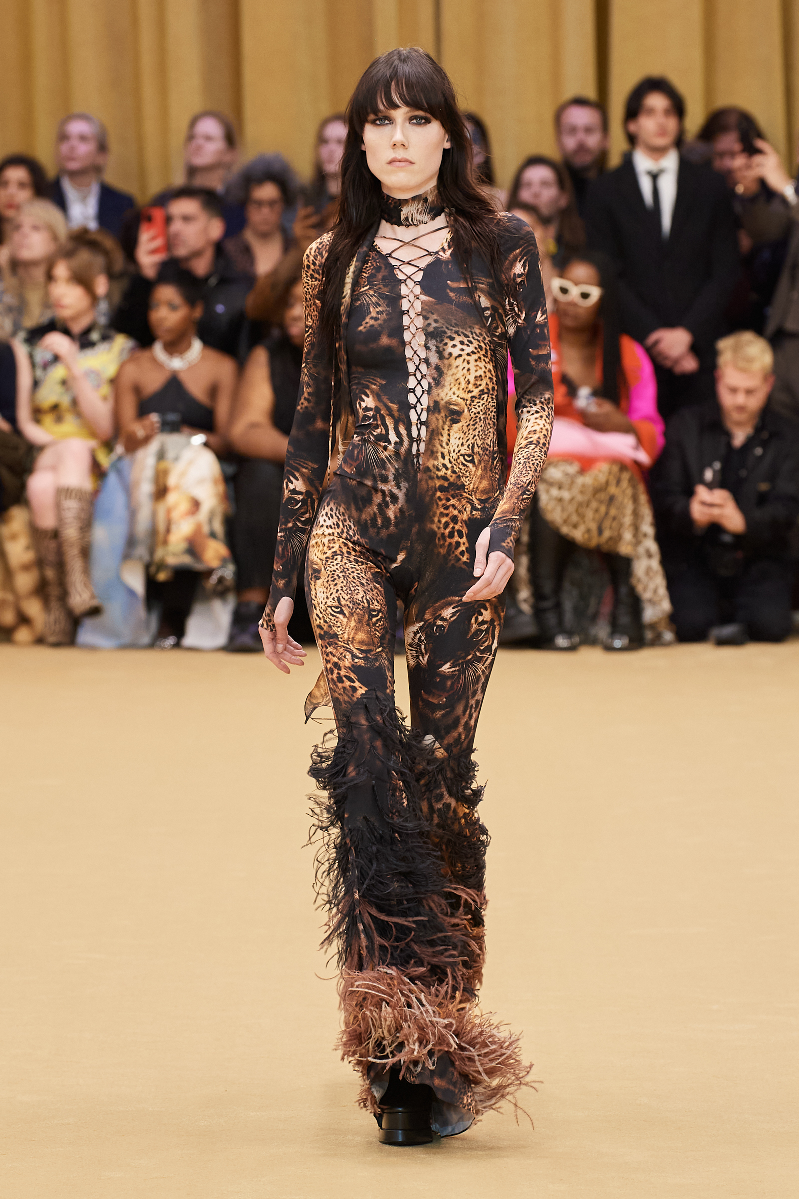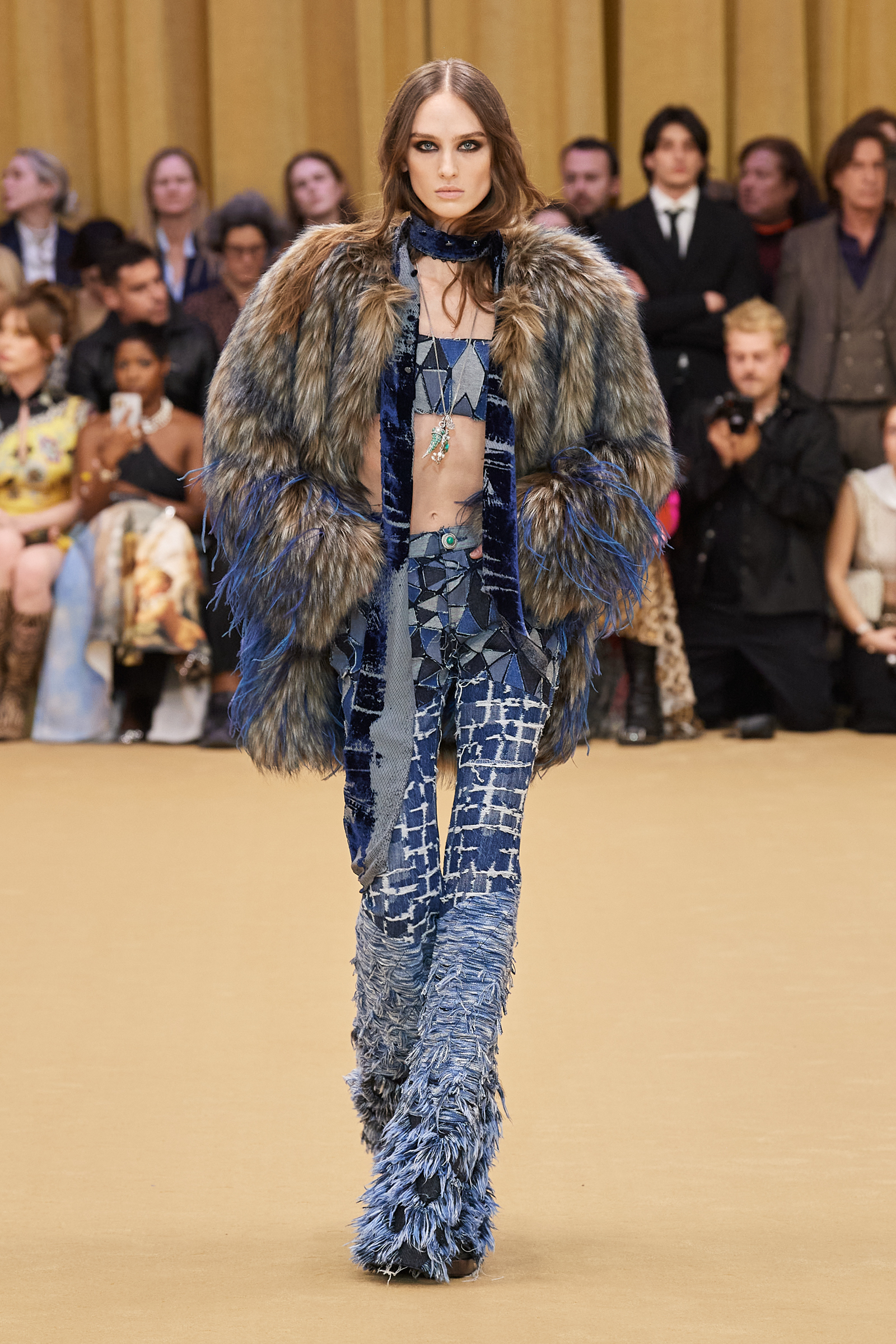 Denim was another focal point. Jeans are how Cavalli got his start; backstage Puglisi talked about the house founder’s #vanlife early days, when he tooled around Italy scrounging for denim scraps that he collaged into hippie treasures. They were the inspiration for some of the most hands-on, highly embellished pieces Puglisi has made yet at the label. A pair of bell-bottoms were so shredded and shaggy they almost looked like fur too.