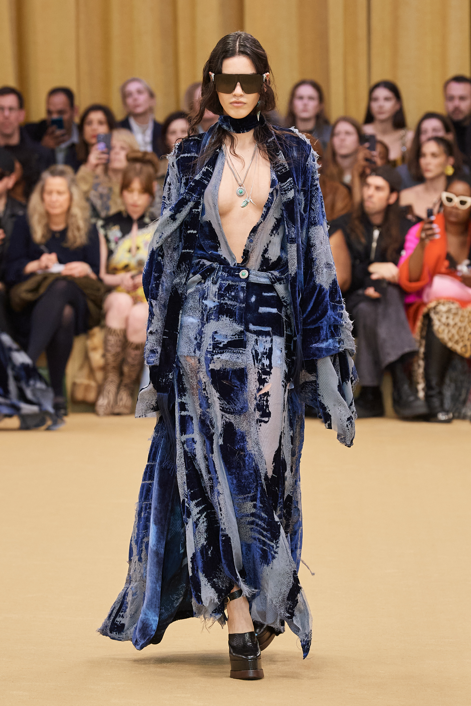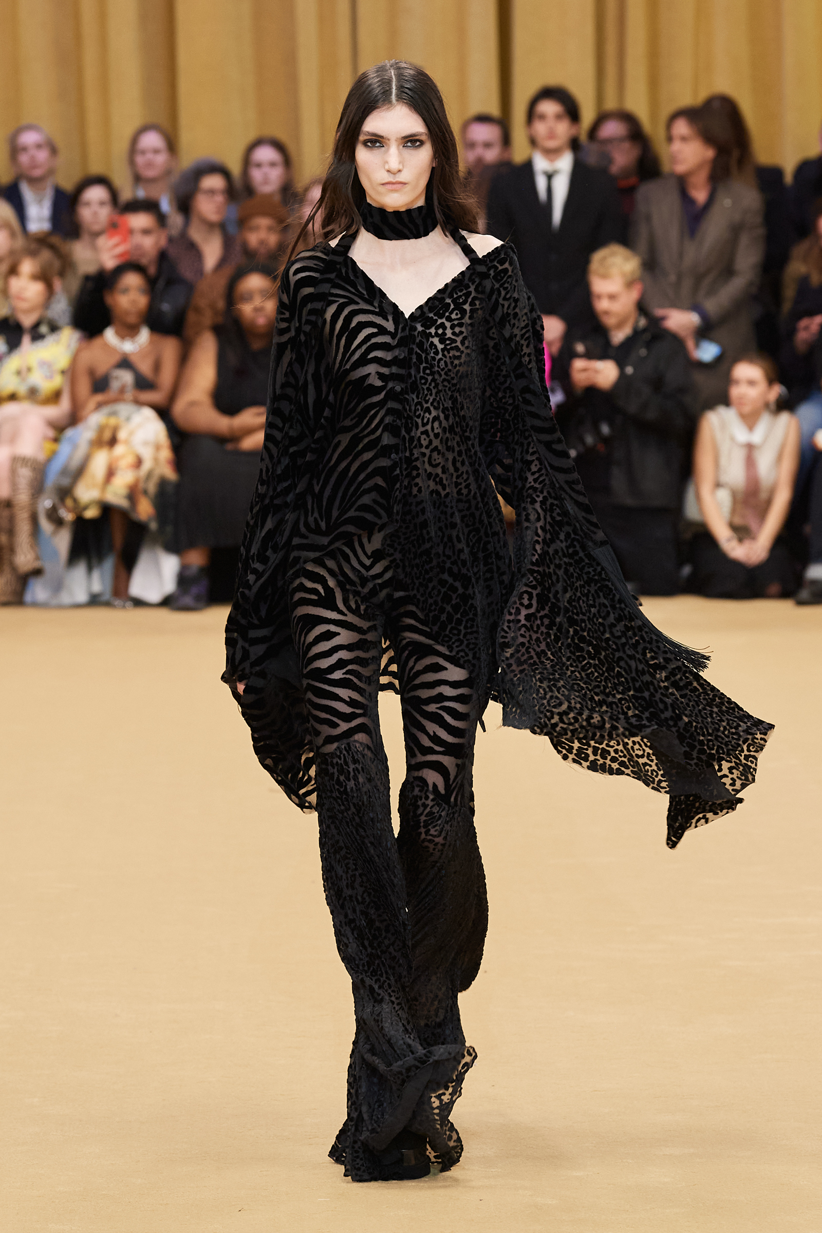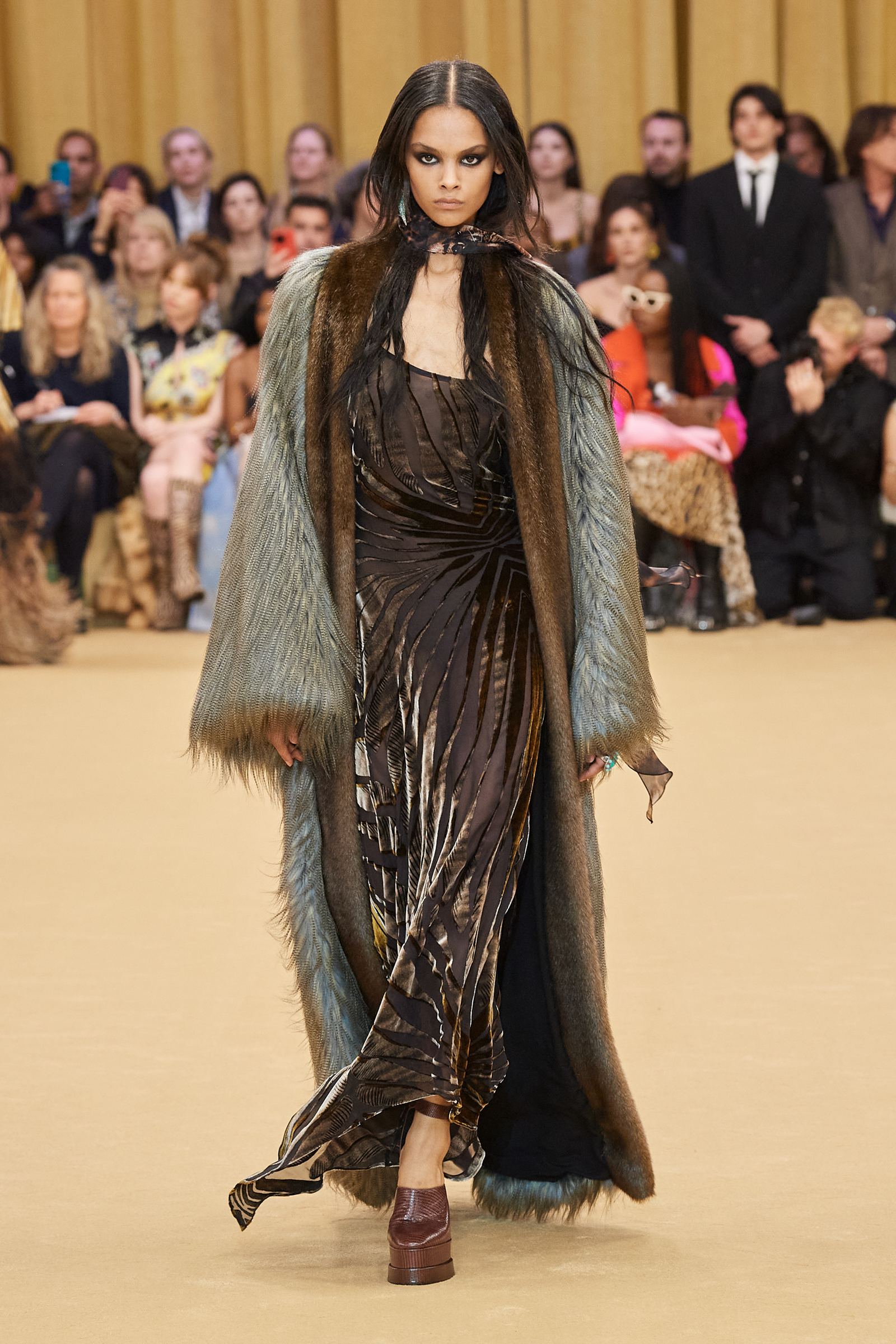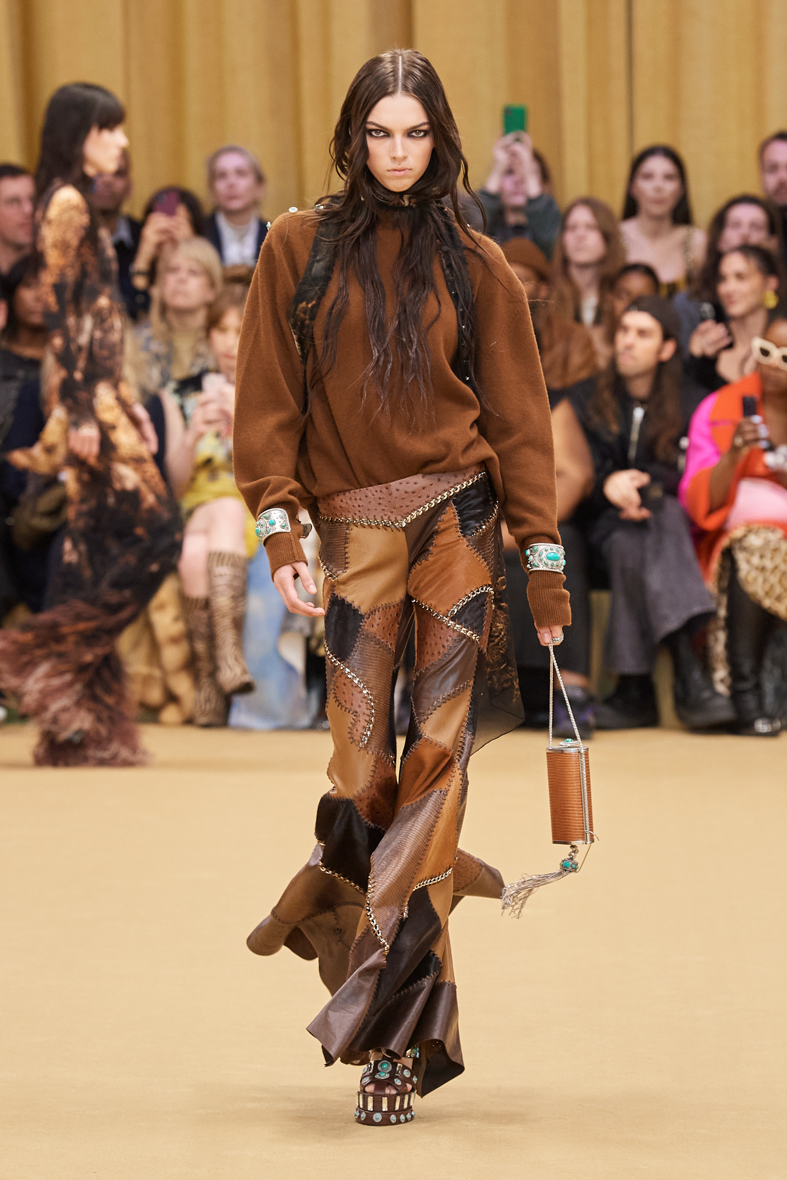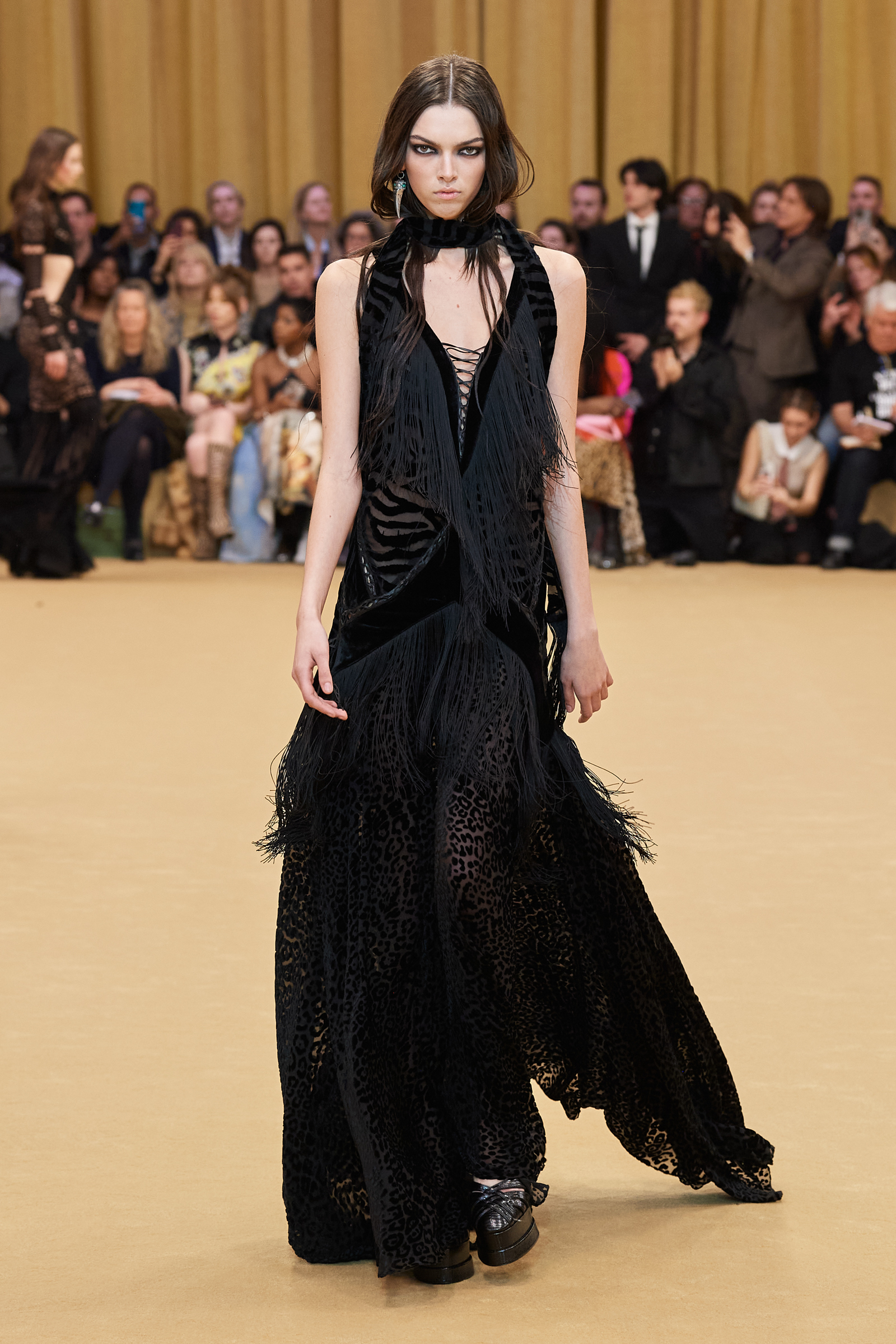 Denim was another focal point. Jeans are how Cavalli got his start; backstage Puglisi talked about the house founder’s #vanlife early days, when he tooled around Italy scrounging for denim scraps that he collaged into hippie treasures. They were the inspiration for some of the most hands-on, highly embellished pieces Puglisi has made yet at the label. A pair of bell-bottoms were so shredded and shaggy they almost looked like fur too.