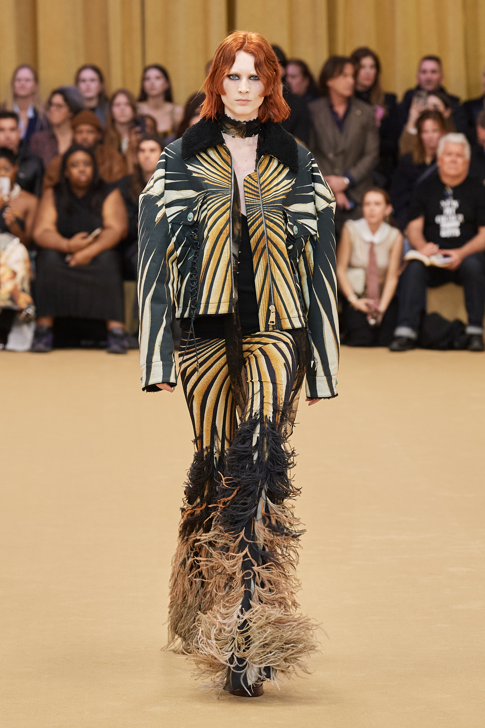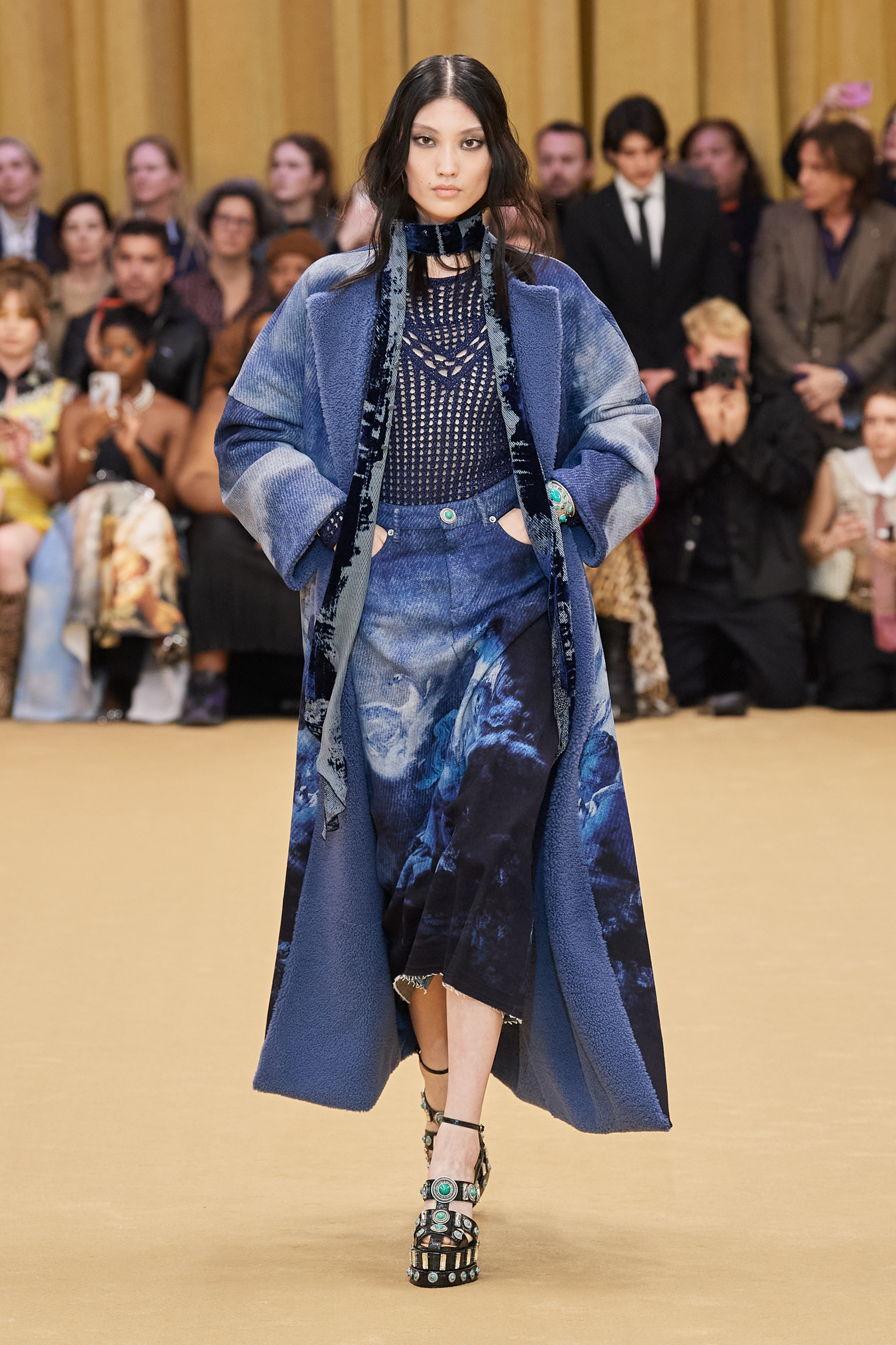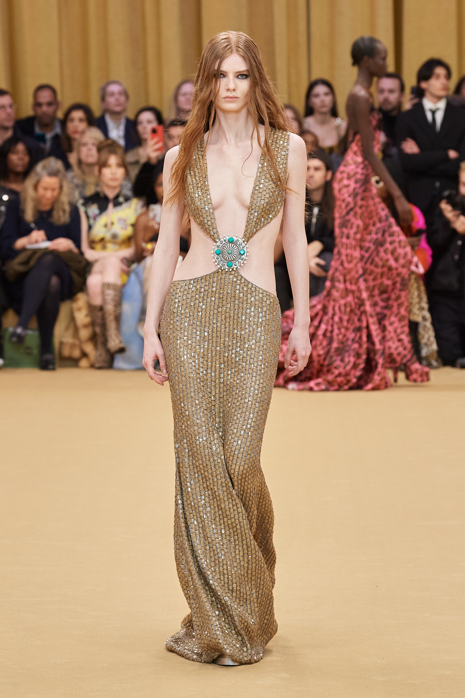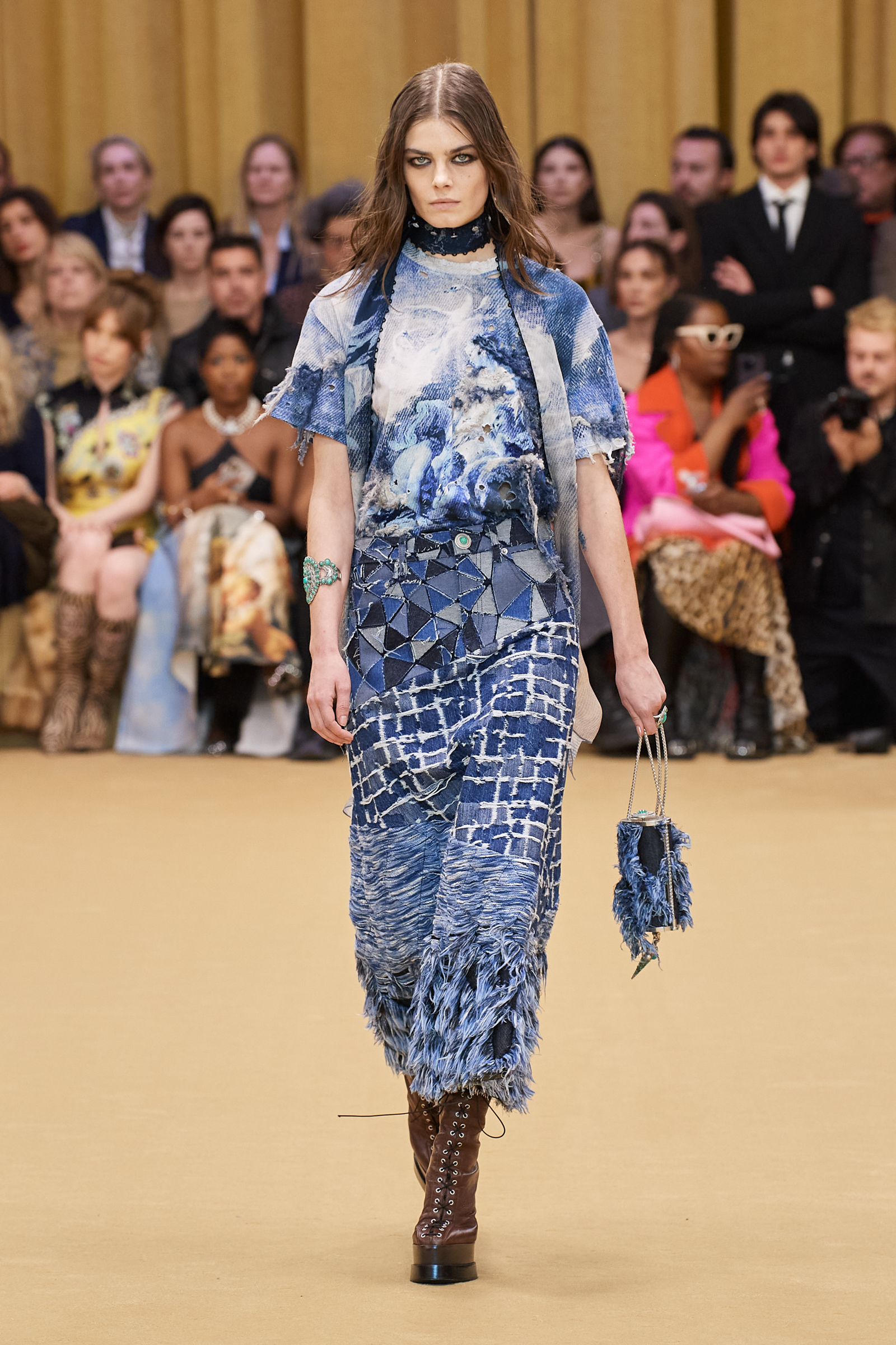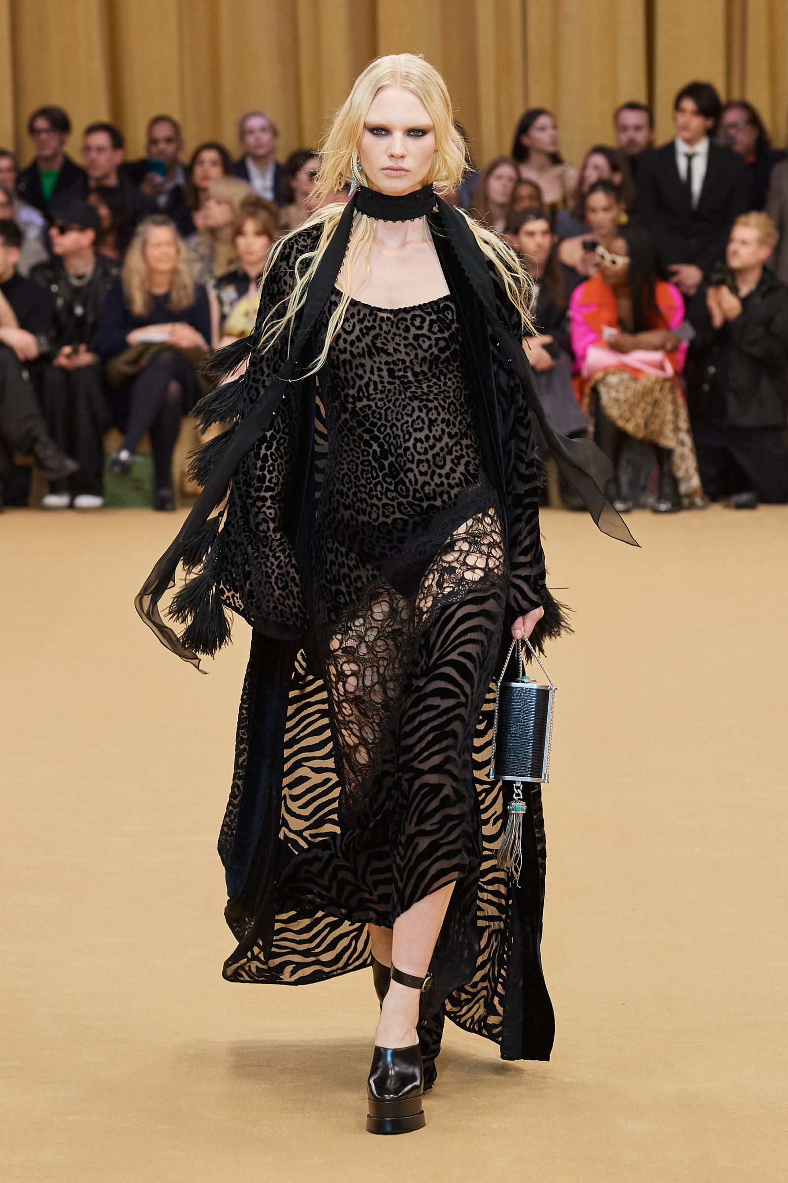 Denim was another focal point. Jeans are how Cavalli got his start; backstage Puglisi talked about the house founder’s #vanlife early days, when he tooled around Italy scrounging for denim scraps that he collaged into hippie treasures. They were the inspiration for some of the most hands-on, highly embellished pieces Puglisi has made yet at the label. A pair of bell-bottoms were so shredded and shaggy they almost looked like fur too.
