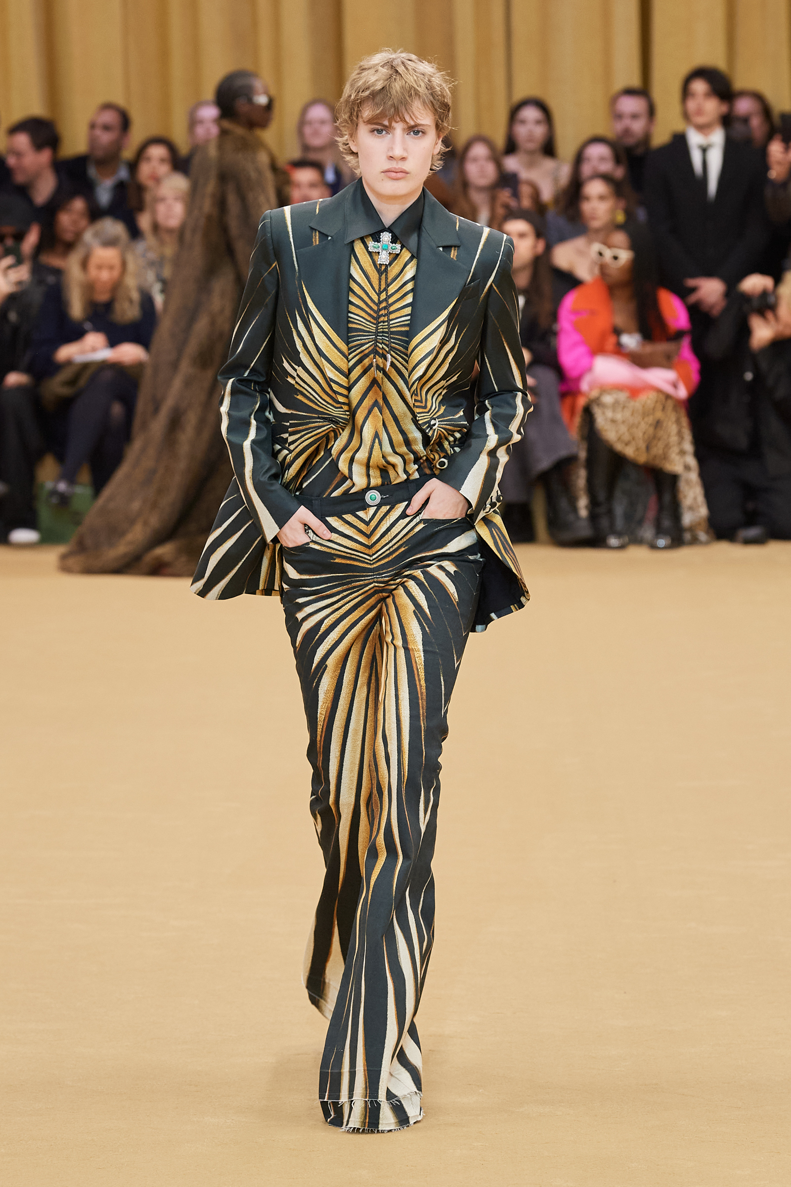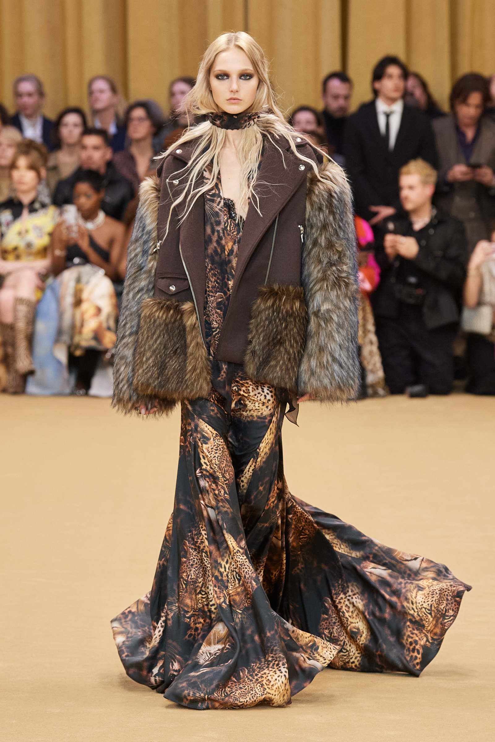 Fausto Puglisi took a hard right turn toward Old Hollywood razzle-dazzle last season with results that looked like the love children of Edith Head and Tony Duquette. For fall he was back in glamazon mode, channeling Roberto Cavalli at his most Cavalli-esque. We may have been in Milan’s Stock Exchange, but the vibes were hedonistic, with patchwork leather trimmed in crystals, animalia motifs of many kinds, and piles and piles of fur—faux fur, he was quick to clarify, which he made in collaboration with a factory in Japan where they’ve perfected authentic-looking fakes.