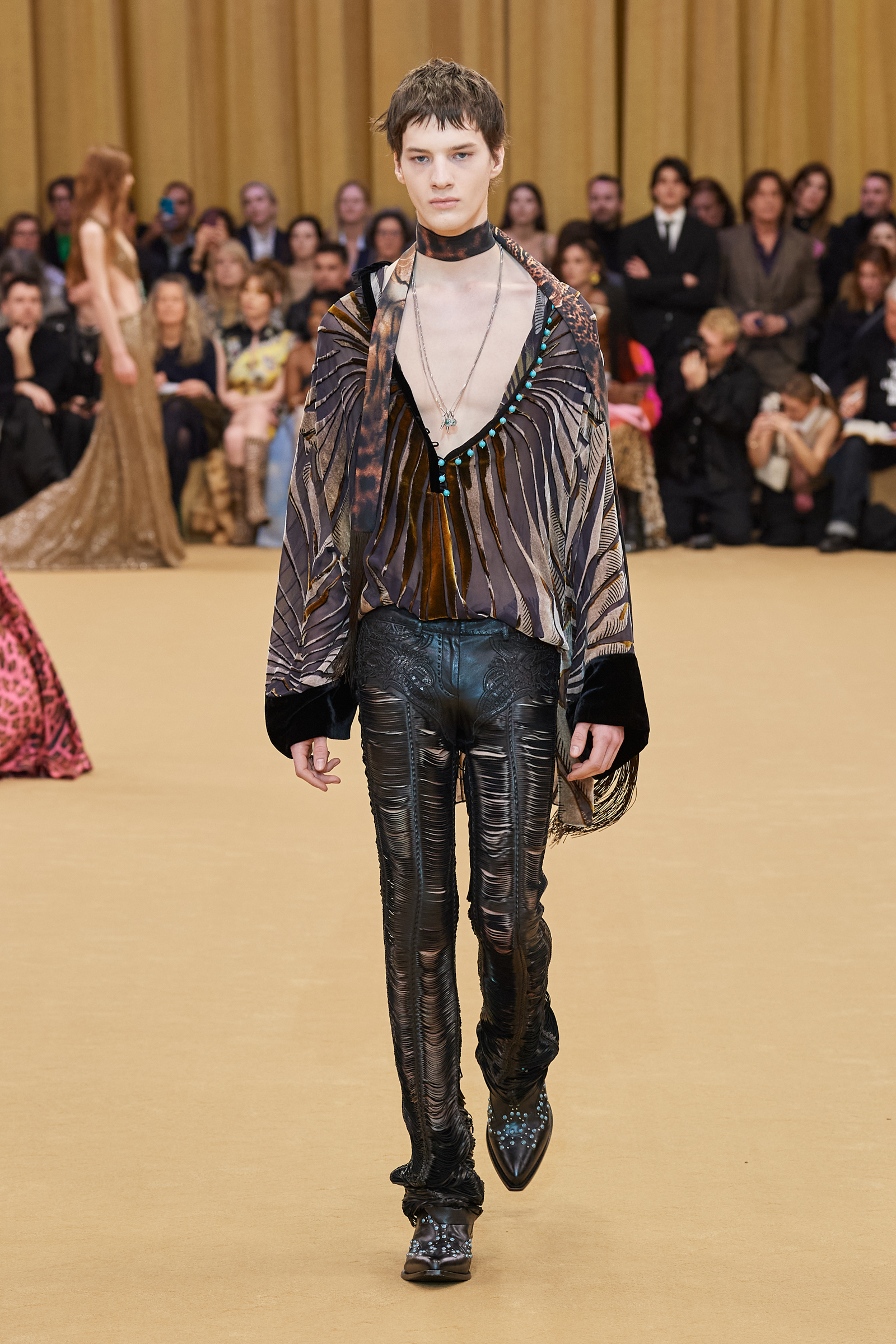 Beyond the archival references, the mood board was loaded up with early-aughts photos of Kate Moss in black lace and pictures of Georgia O’Keeffe and Millicent Rogers in their high-desert muftis. A 2022 trip through the American Southwest is still reverberating with Puglisi, and he conjured the aesthetic with tooled leather, silver studding, and turquoise beads.