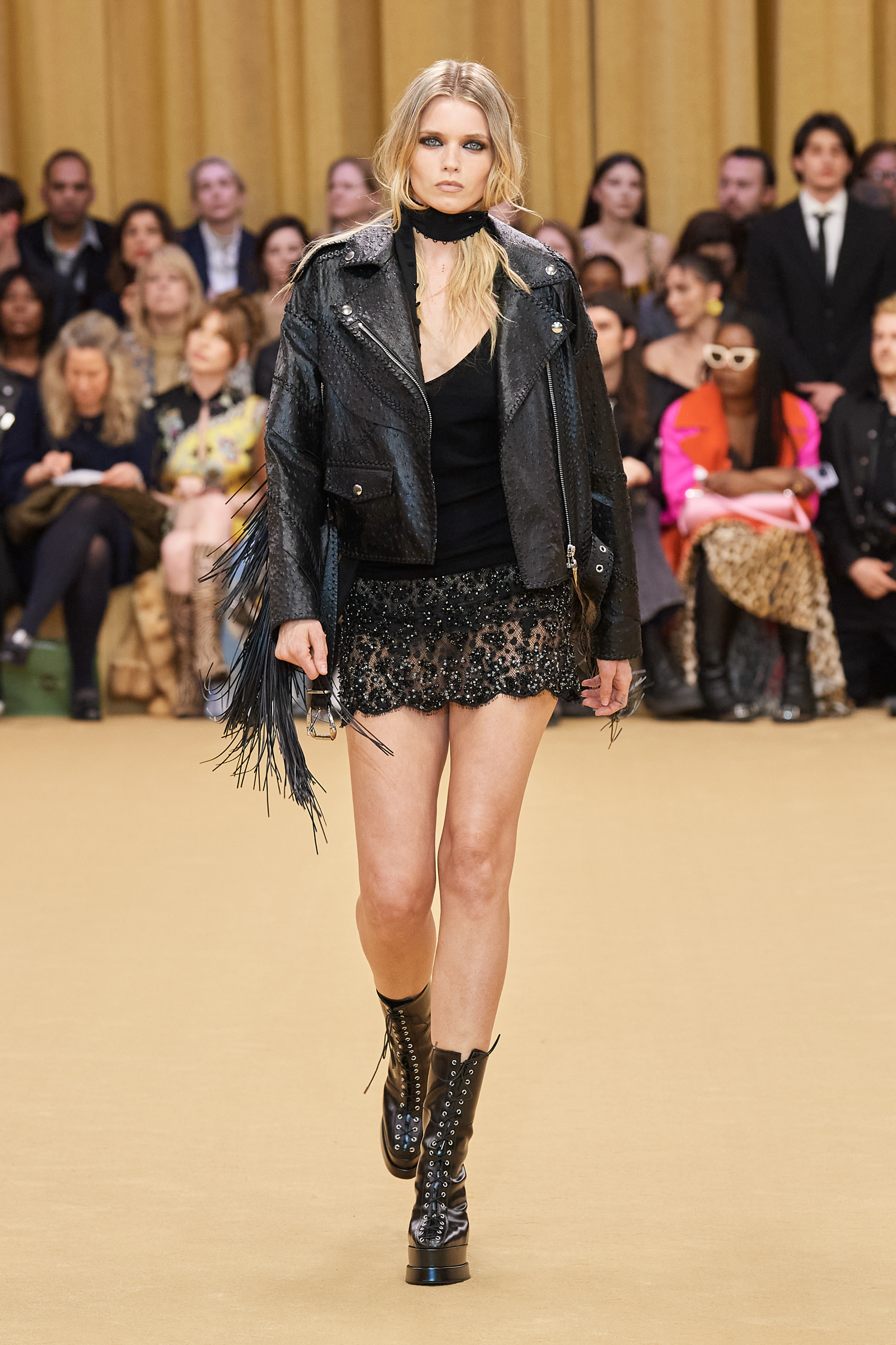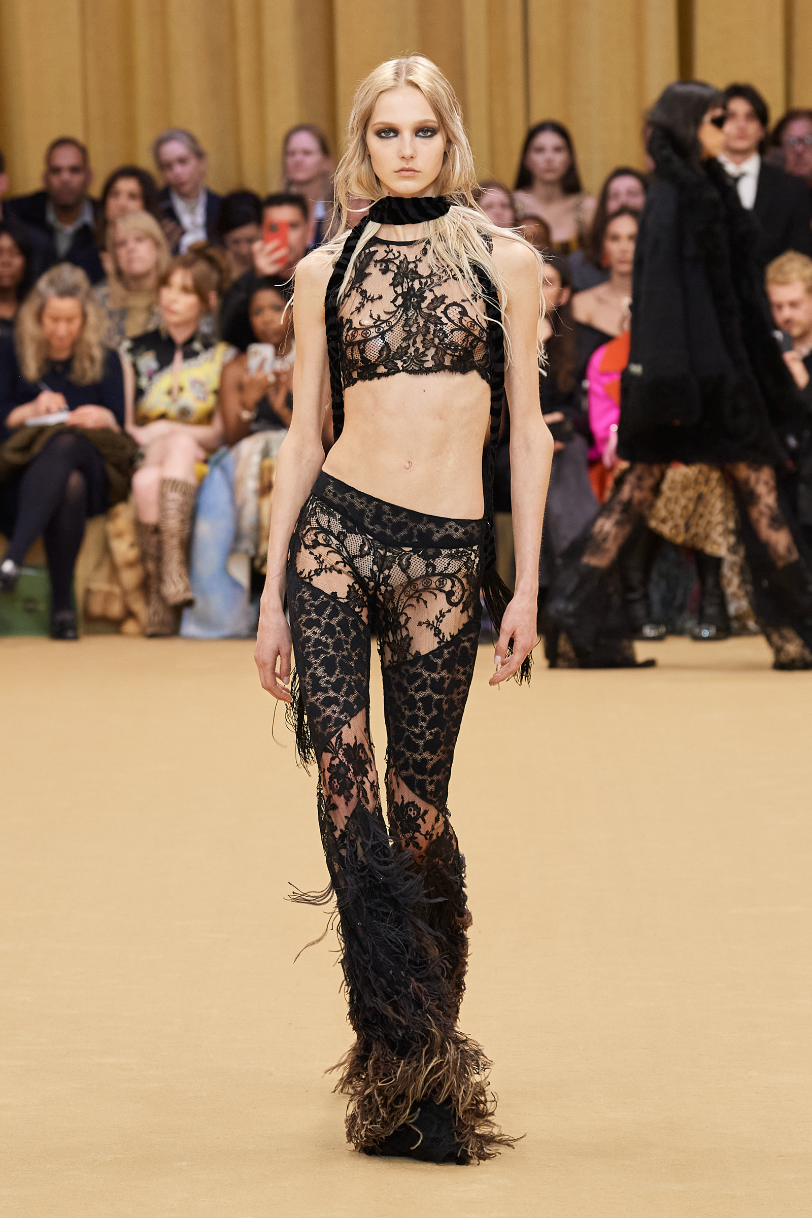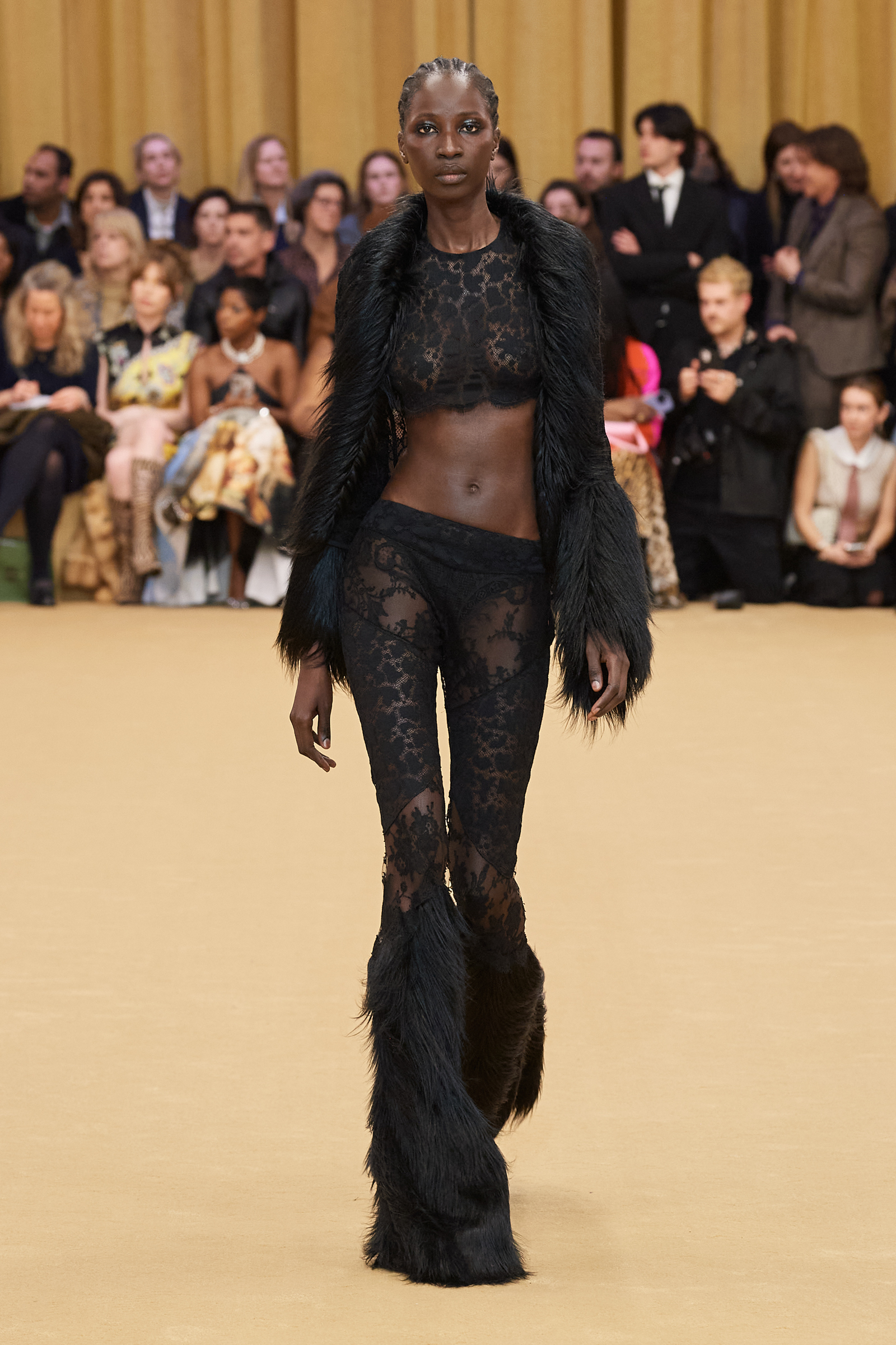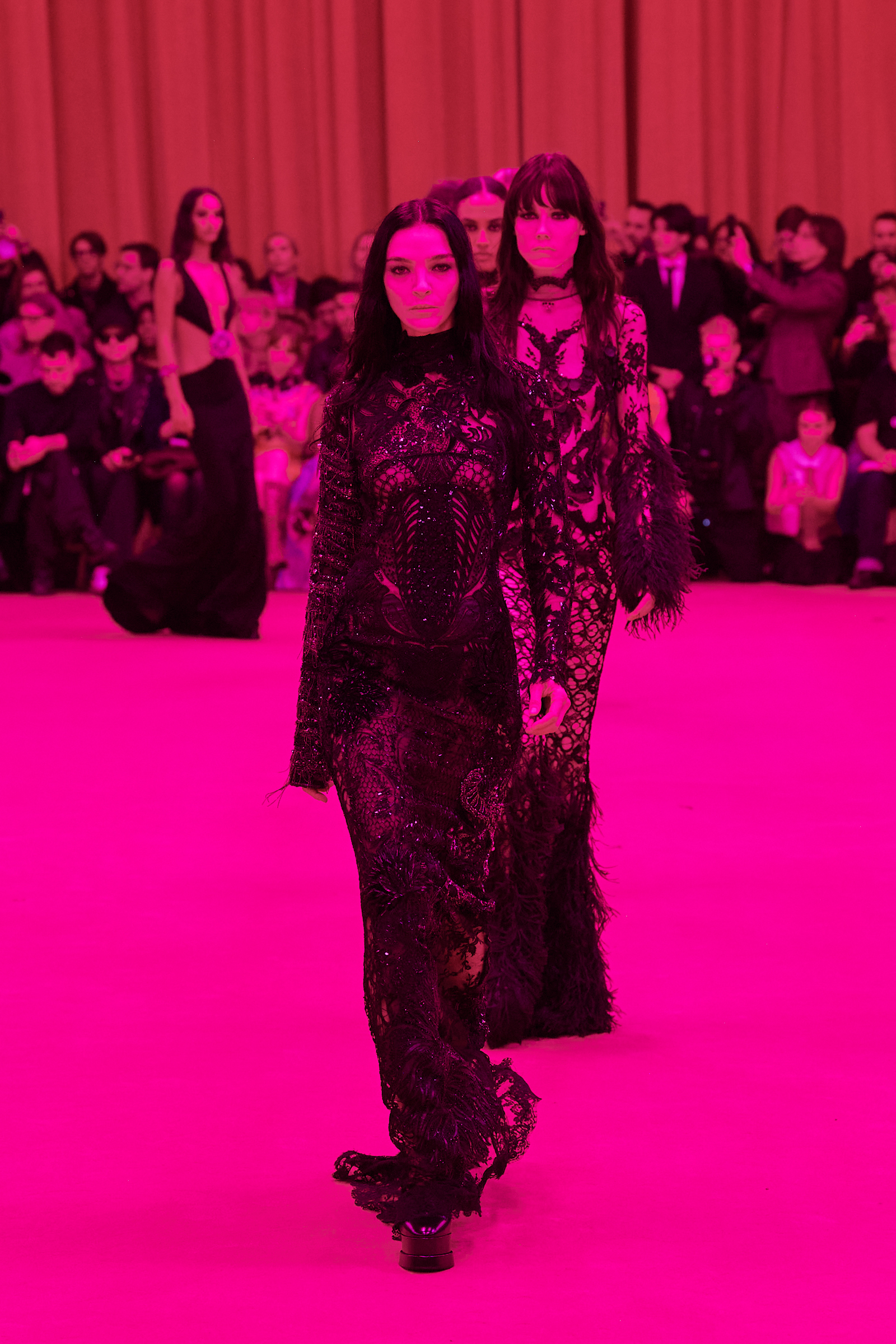 Moss’s black lace was reinvented in countless different ways—as a devoré robe with Elvira, Mistress of the Dark, sleeves; as a sheer catsuit with feather-trimmed flared legs and another in openwork crochet; and as a sequined lace miniskirt on Abbey Lee, not seen in these parts since before Max Max: Fury Road. This collection lived up to Roberto Cavalli’s reputation for excess and then some. All together on the runway, it could feel like information overload, but backstage Puglisi shrugged it off. “It’s just a bunch of separates,” he said, and he made the point when he showed a studded and beaded leather motorcycle jacket on both a man and a woman.