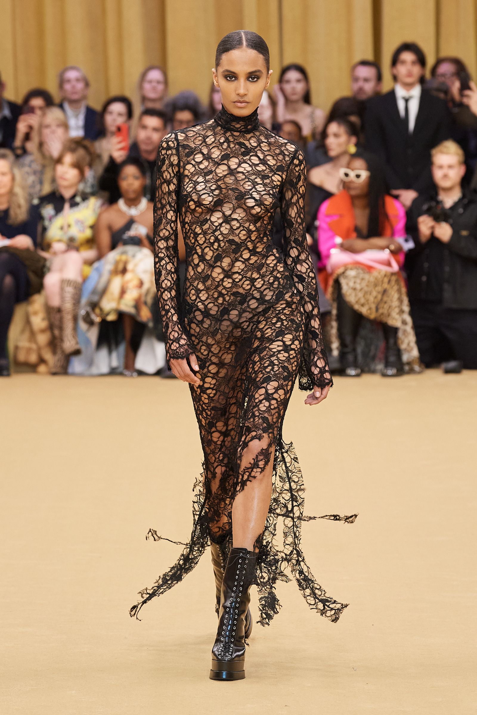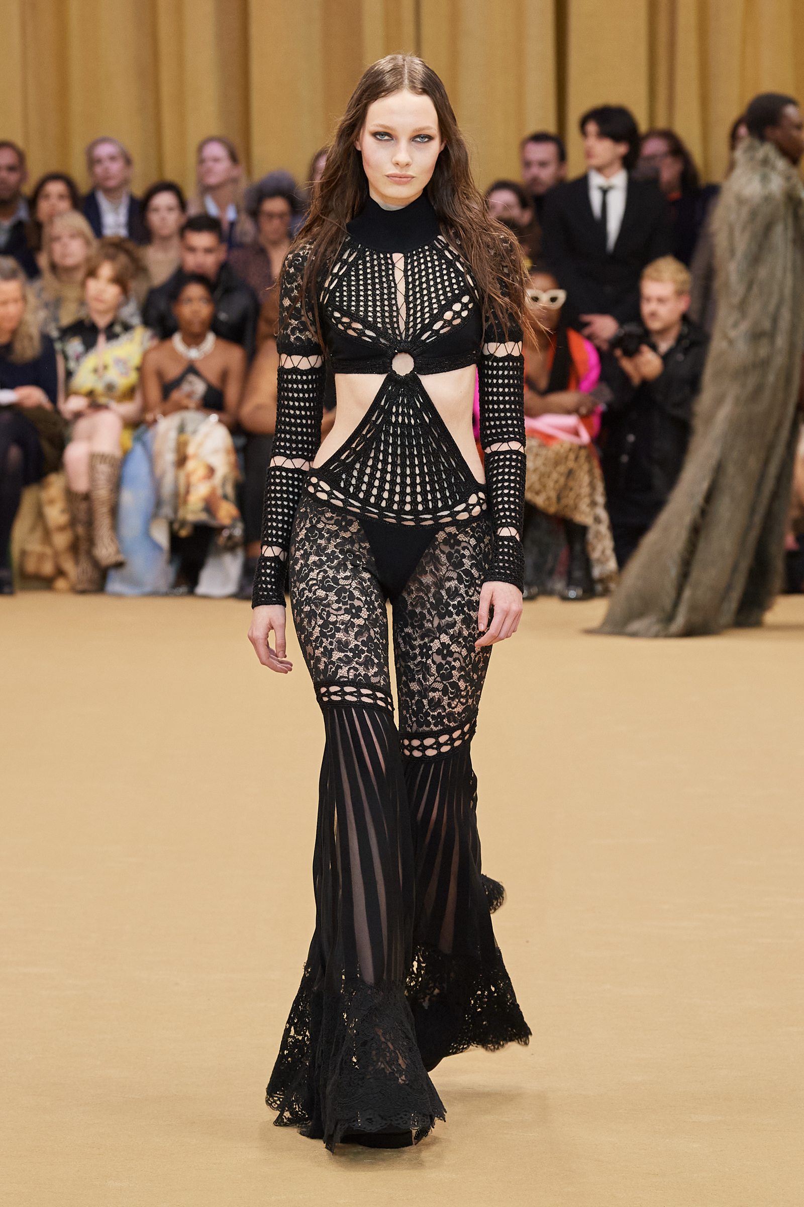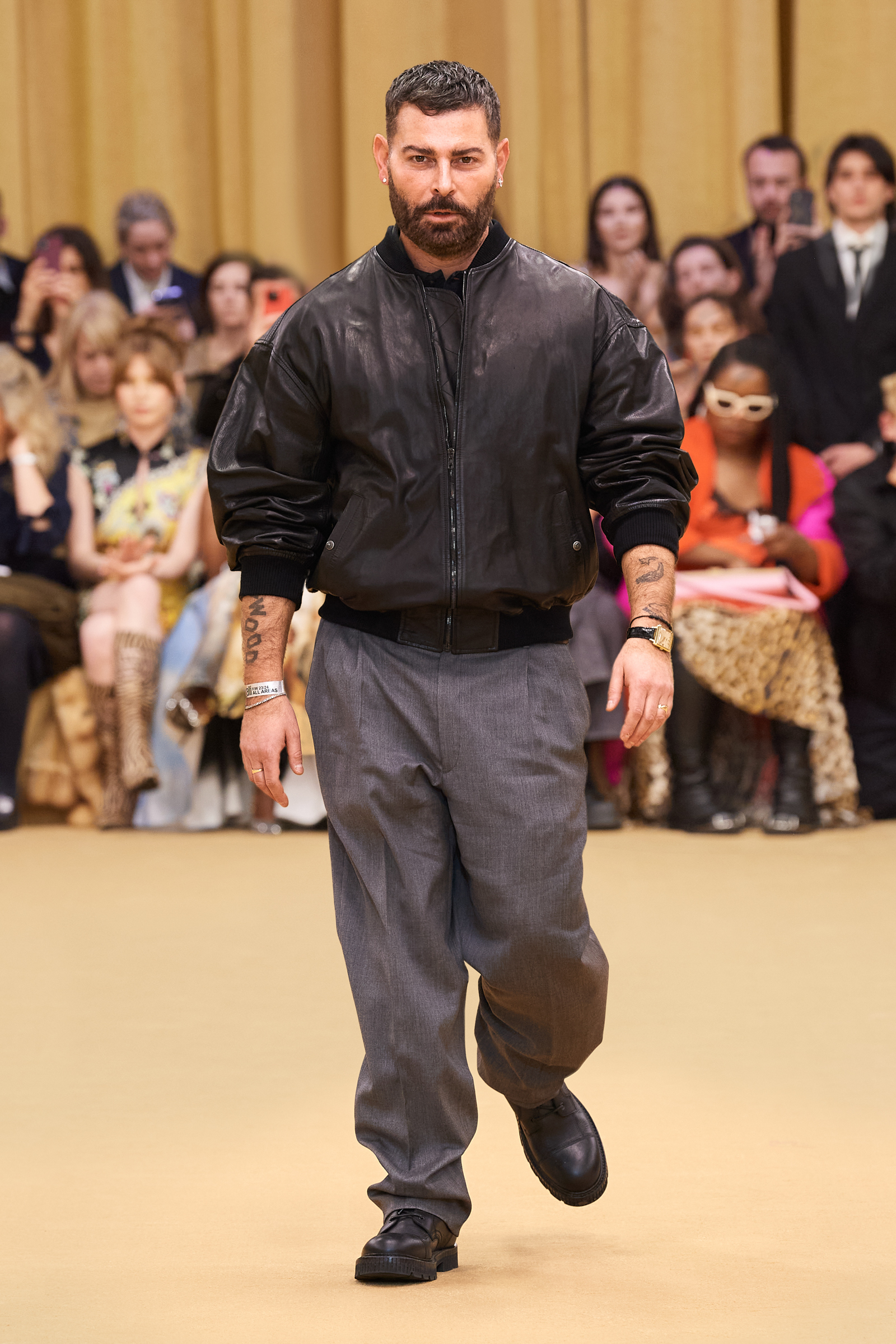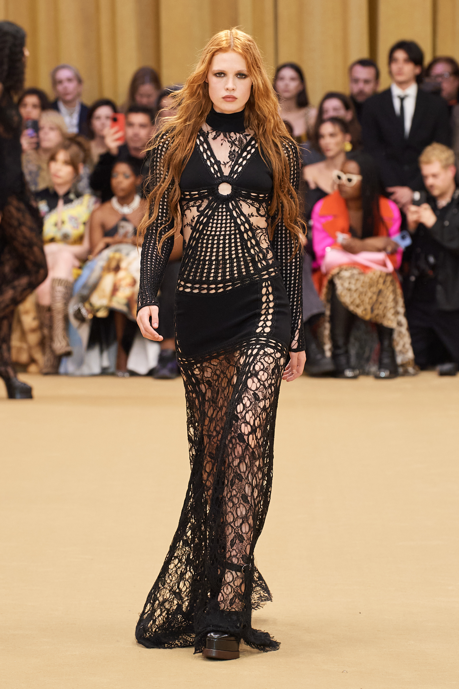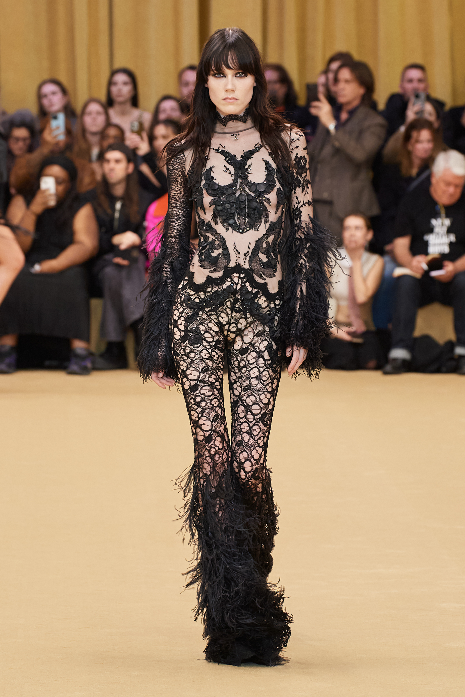 Moss’s black lace was reinvented in countless different ways—as a devoré robe with Elvira, Mistress of the Dark, sleeves; as a sheer catsuit with feather-trimmed flared legs and another in openwork crochet; and as a sequined lace miniskirt on Abbey Lee, not seen in these parts since before Max Max: Fury Road. This collection lived up to Roberto Cavalli’s reputation for excess and then some. All together on the runway, it could feel like information overload, but backstage Puglisi shrugged it off. “It’s just a bunch of separates,” he said, and he made the point when he showed a studded and beaded leather motorcycle jacket on both a man and a woman.