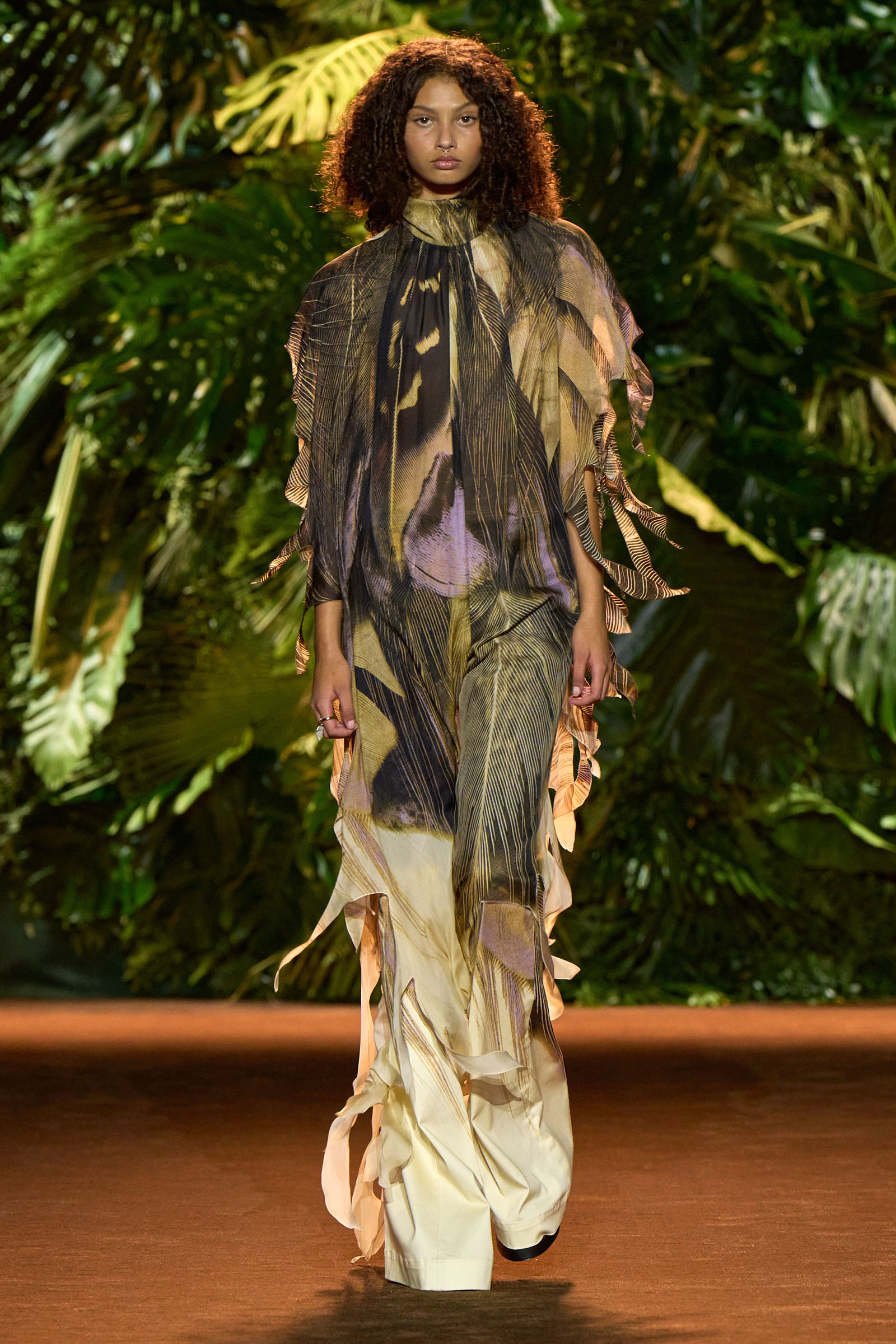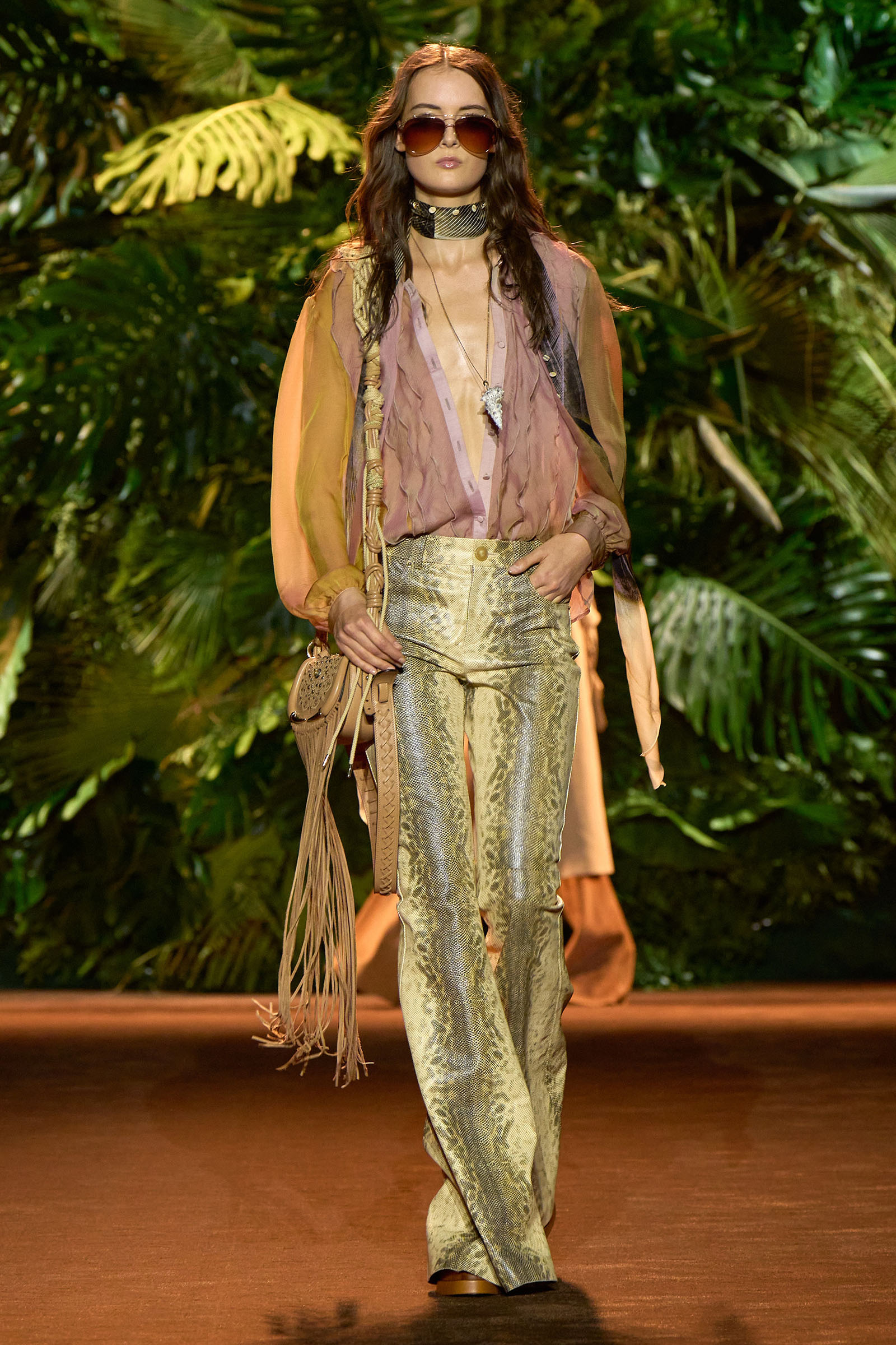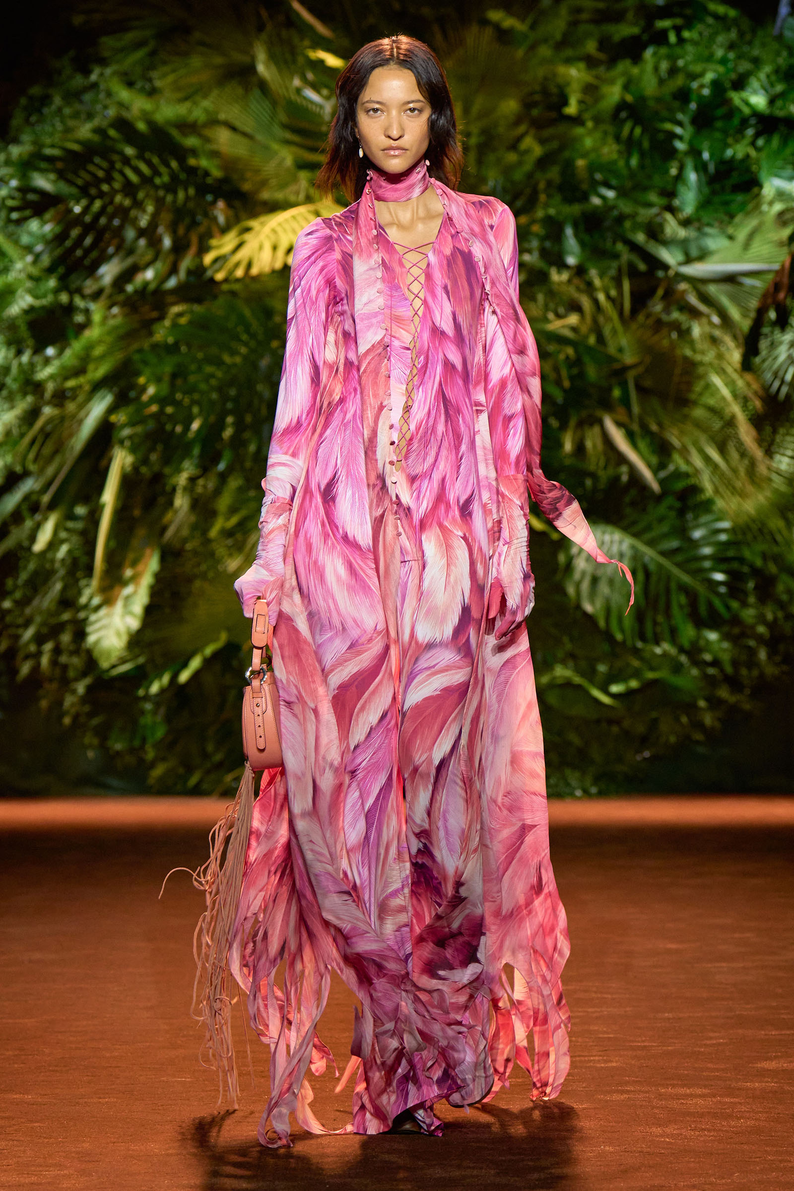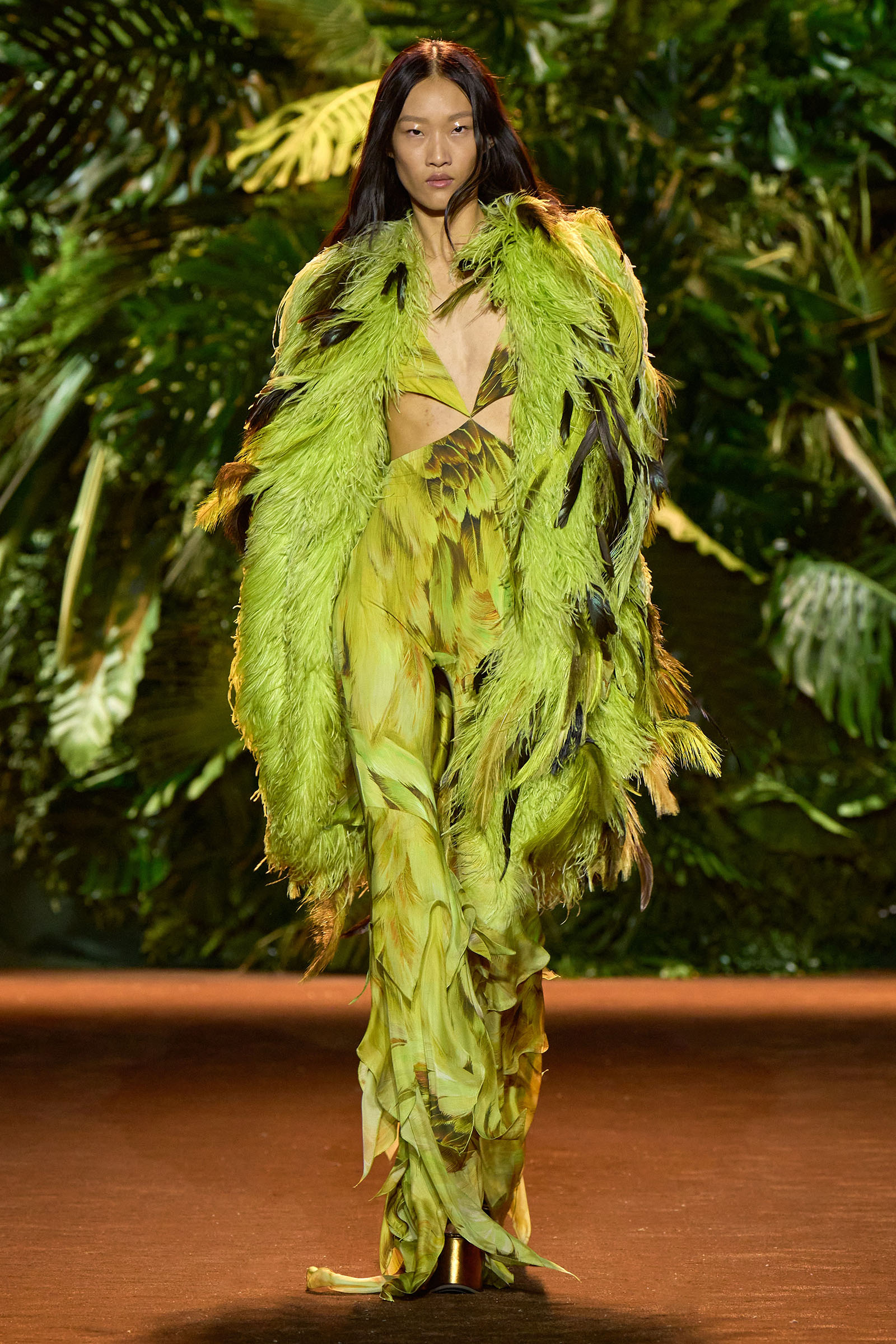 The collection that charged through all those palm fronds was just as exuberant. In a follow-on from last season, which was the first time Puglisi committed to Cavalli-esque levels of excess since signing on at the brand in 2020, these clothes were fully loaded—with feather prints, with feather embellishments, with denim embellishments in the shapes of feathers, and no small amount of exposed décolleté or bared midriff.