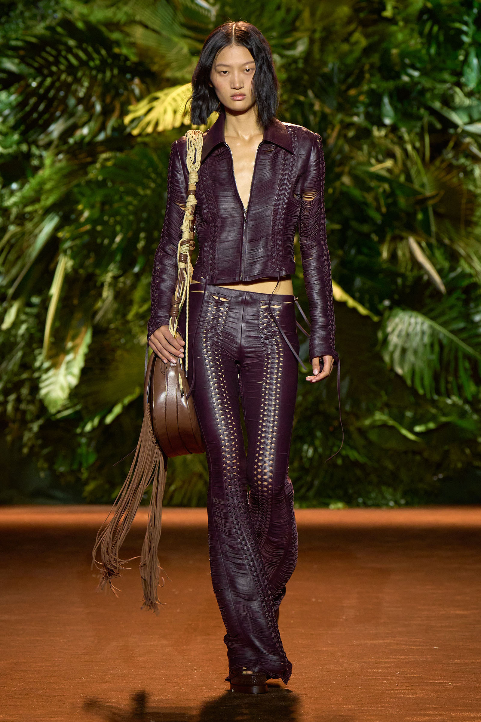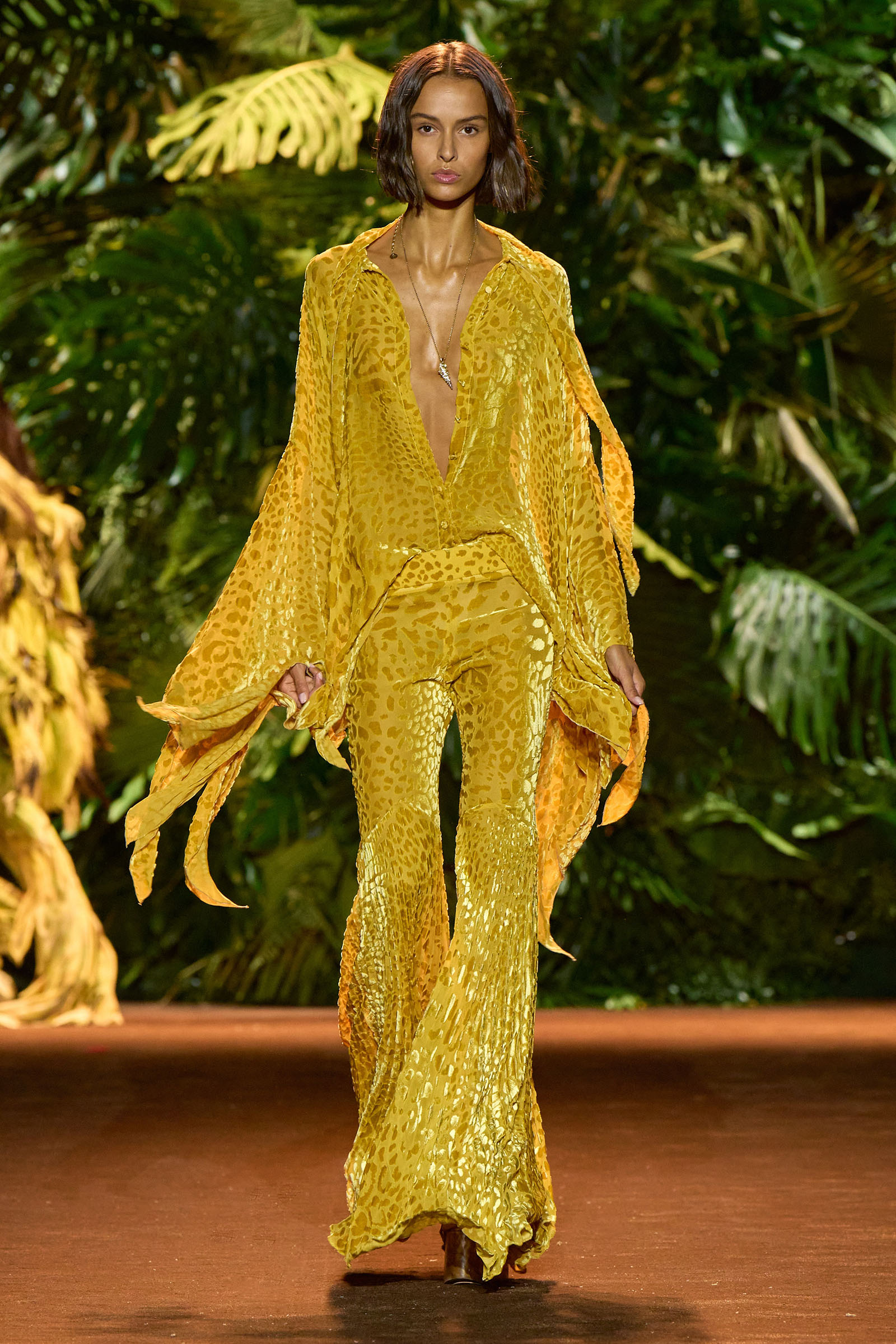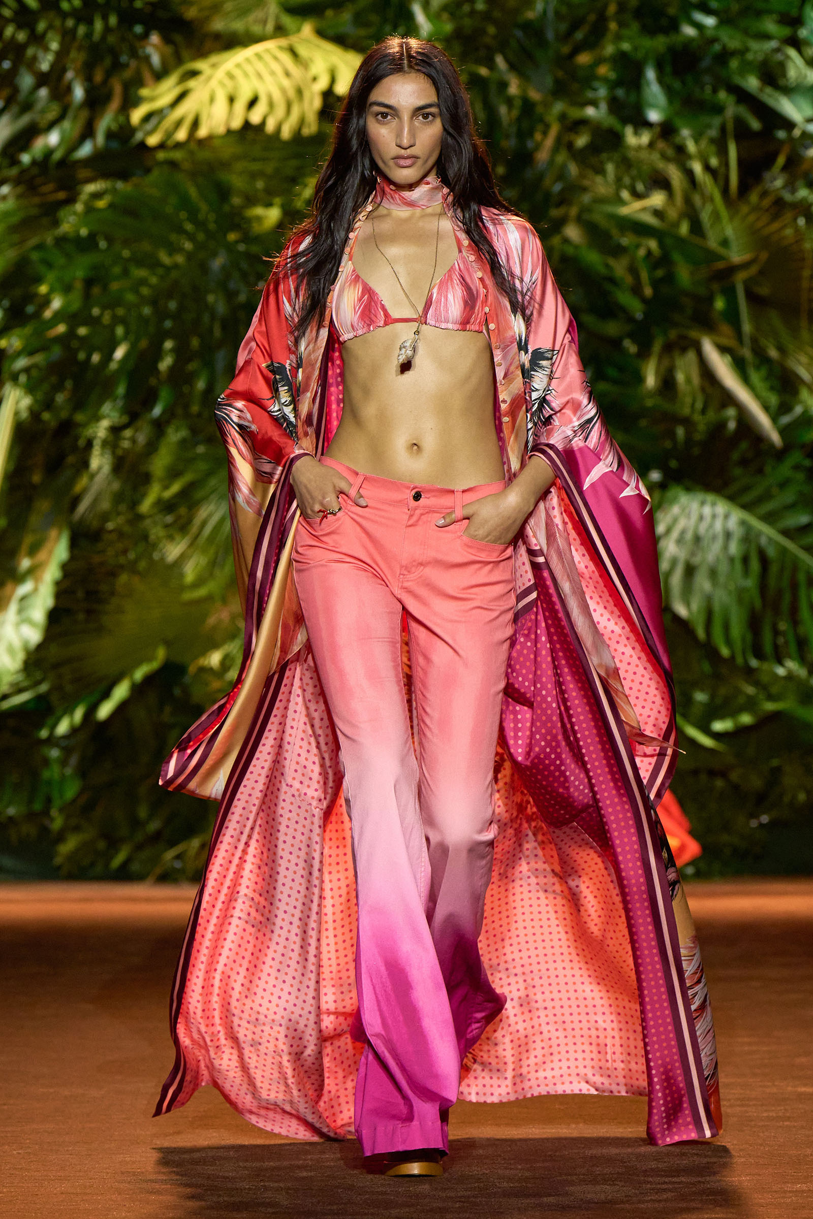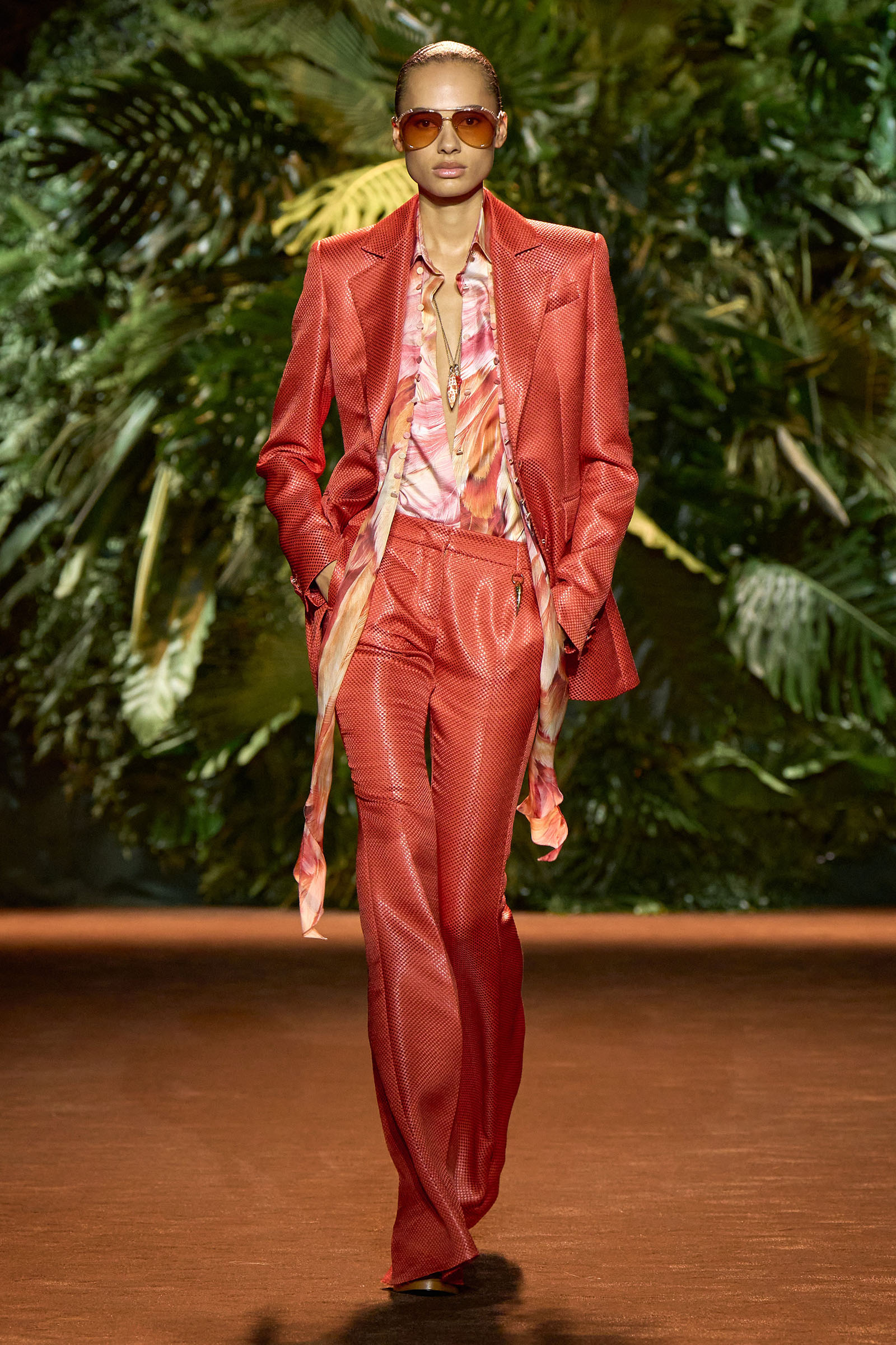 The collection that charged through all those palm fronds was just as exuberant. In a follow-on from last season, which was the first time Puglisi committed to Cavalli-esque levels of excess since signing on at the brand in 2020, these clothes were fully loaded—with feather prints, with feather embellishments, with denim embellishments in the shapes of feathers, and no small amount of exposed décolleté or bared midriff.
