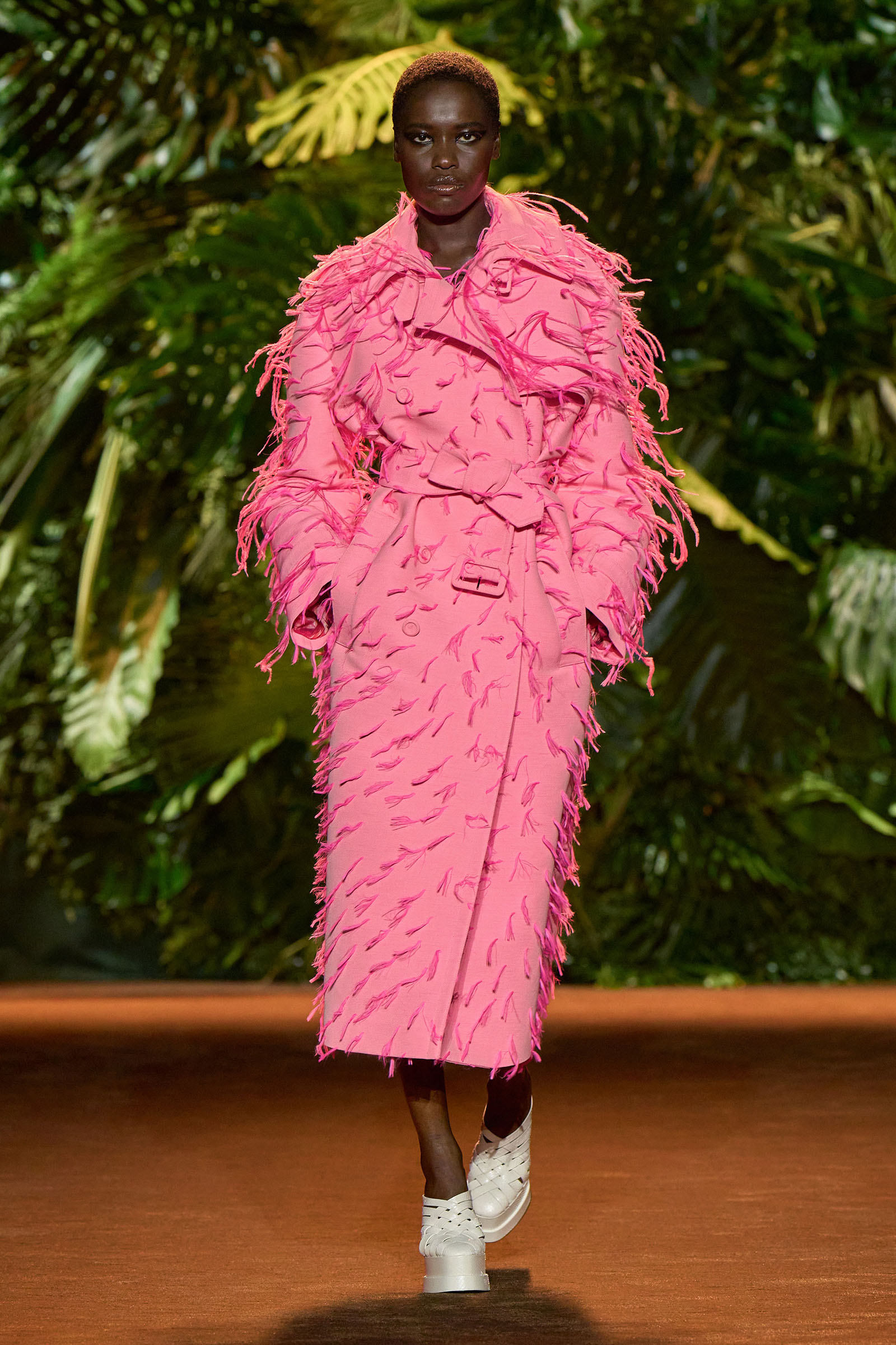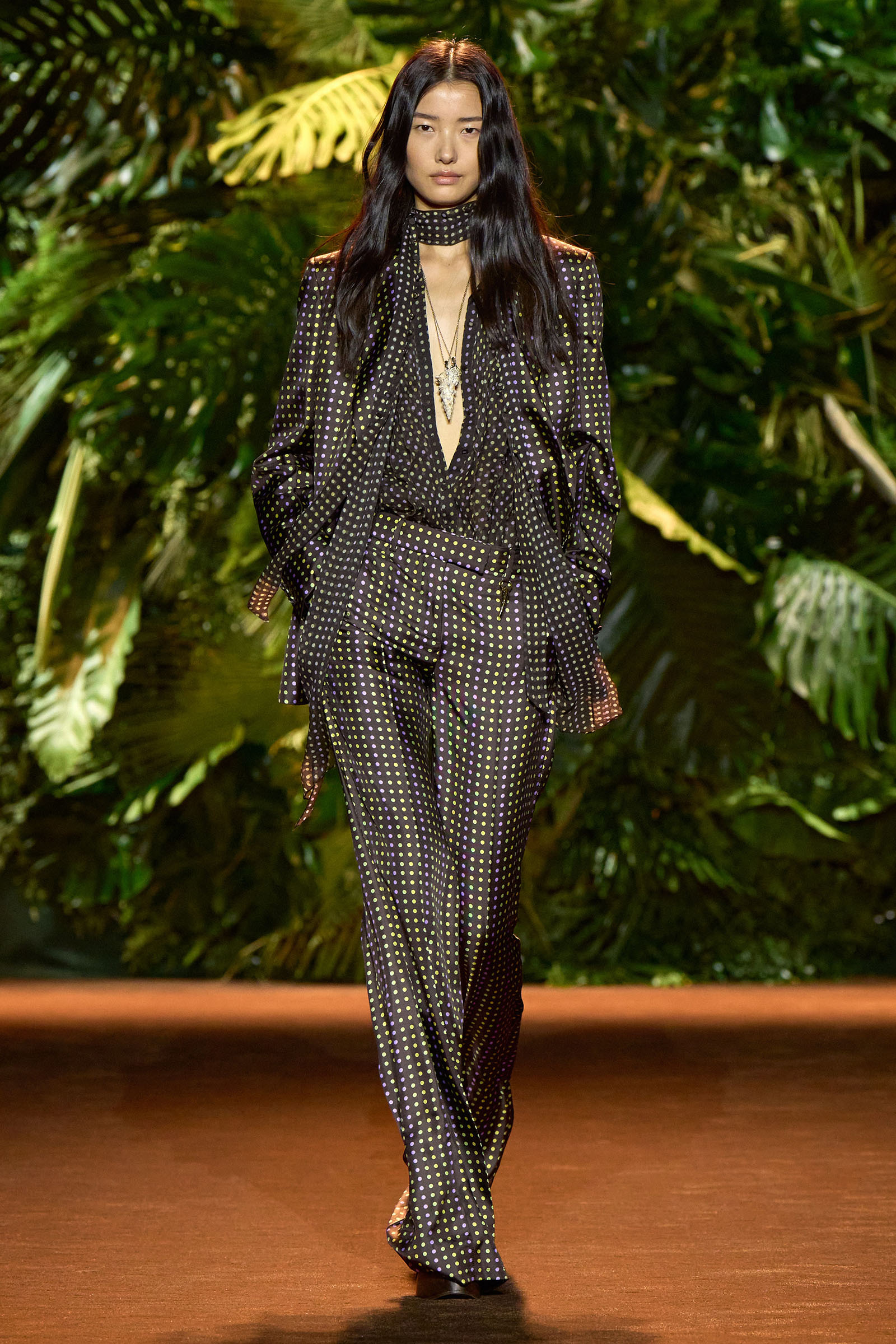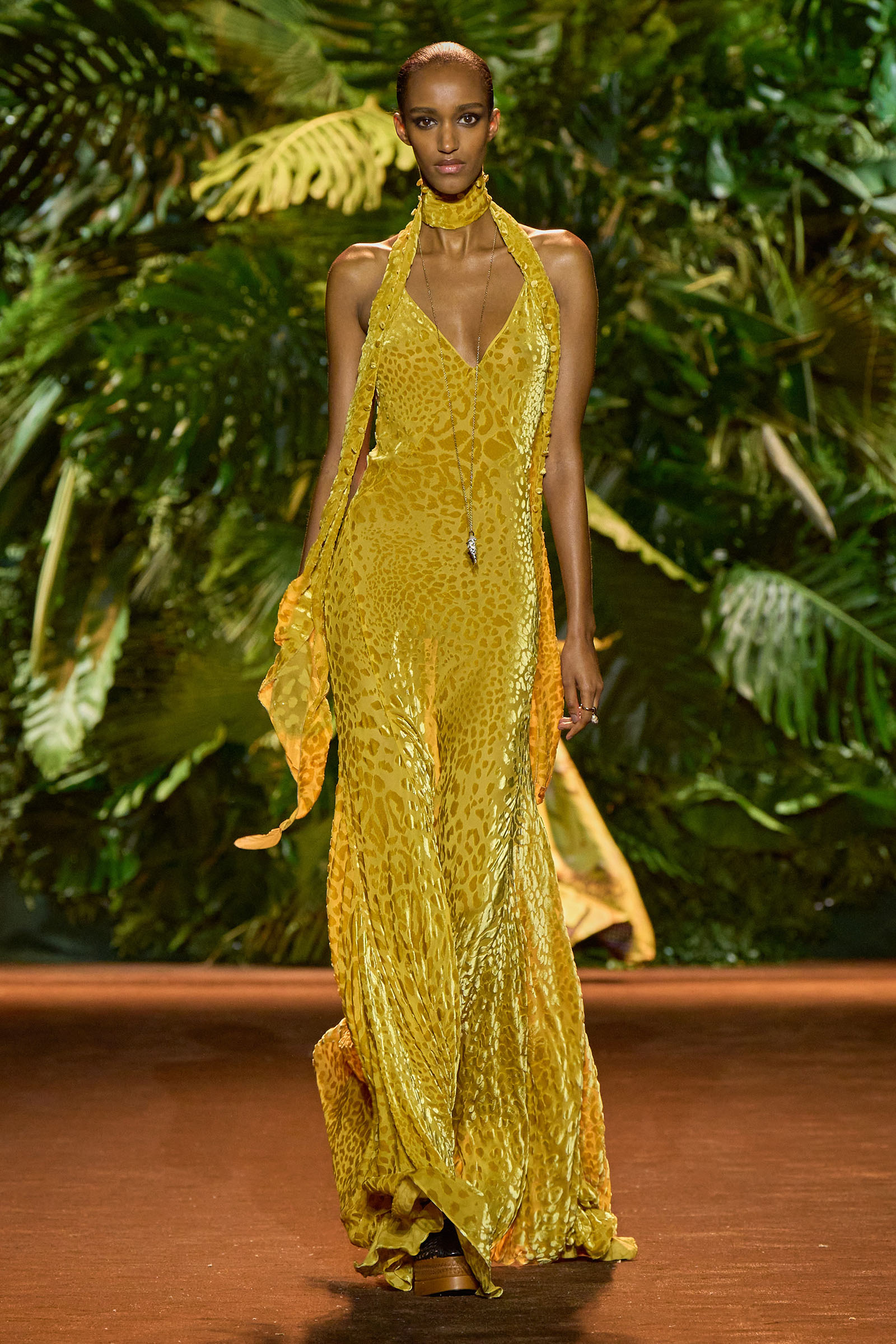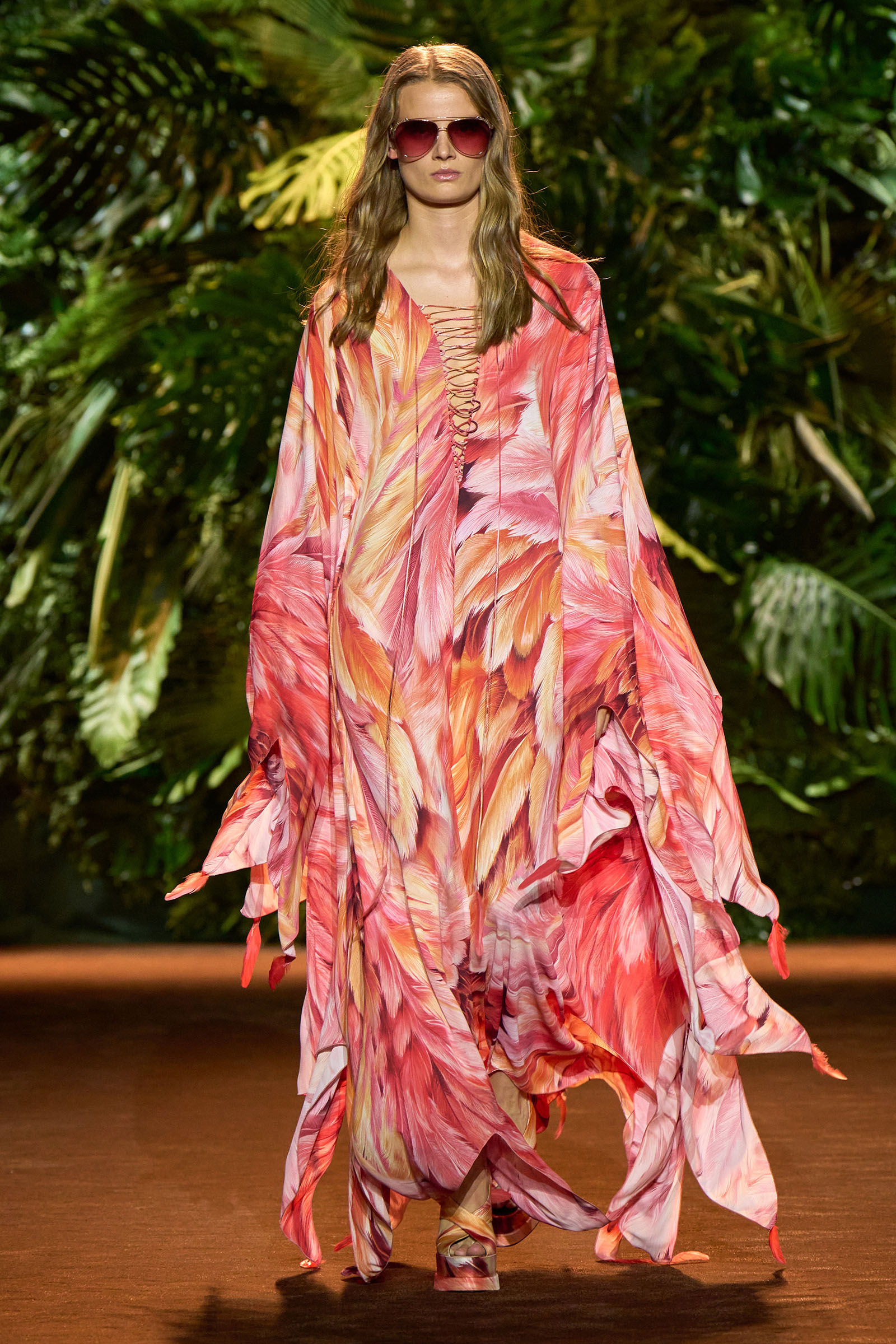 The collection that charged through all those palm fronds was just as exuberant. In a follow-on from last season, which was the first time Puglisi committed to Cavalli-esque levels of excess since signing on at the brand in 2020, these clothes were fully loaded—with feather prints, with feather embellishments, with denim embellishments in the shapes of feathers, and no small amount of exposed décolleté or bared midriff.