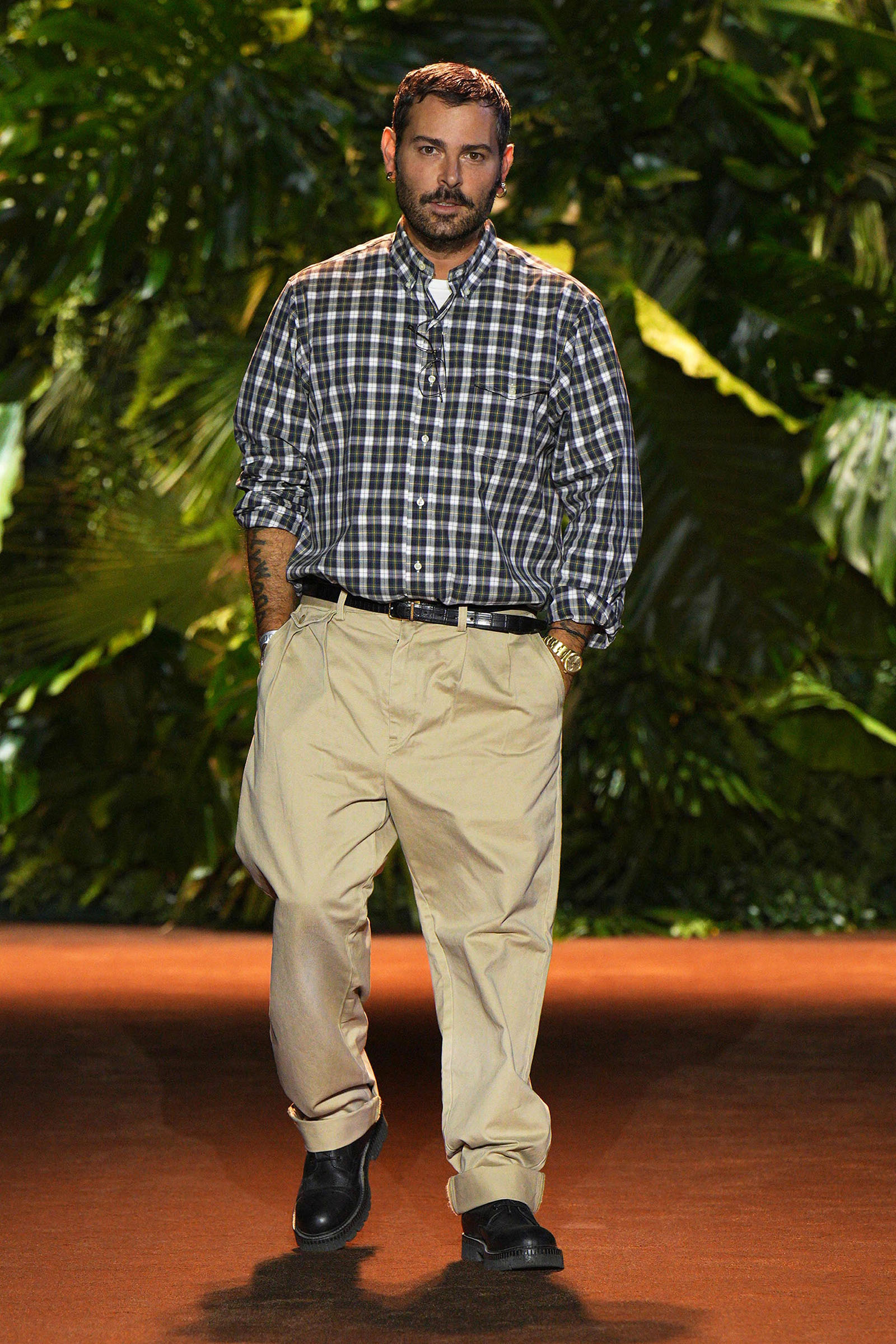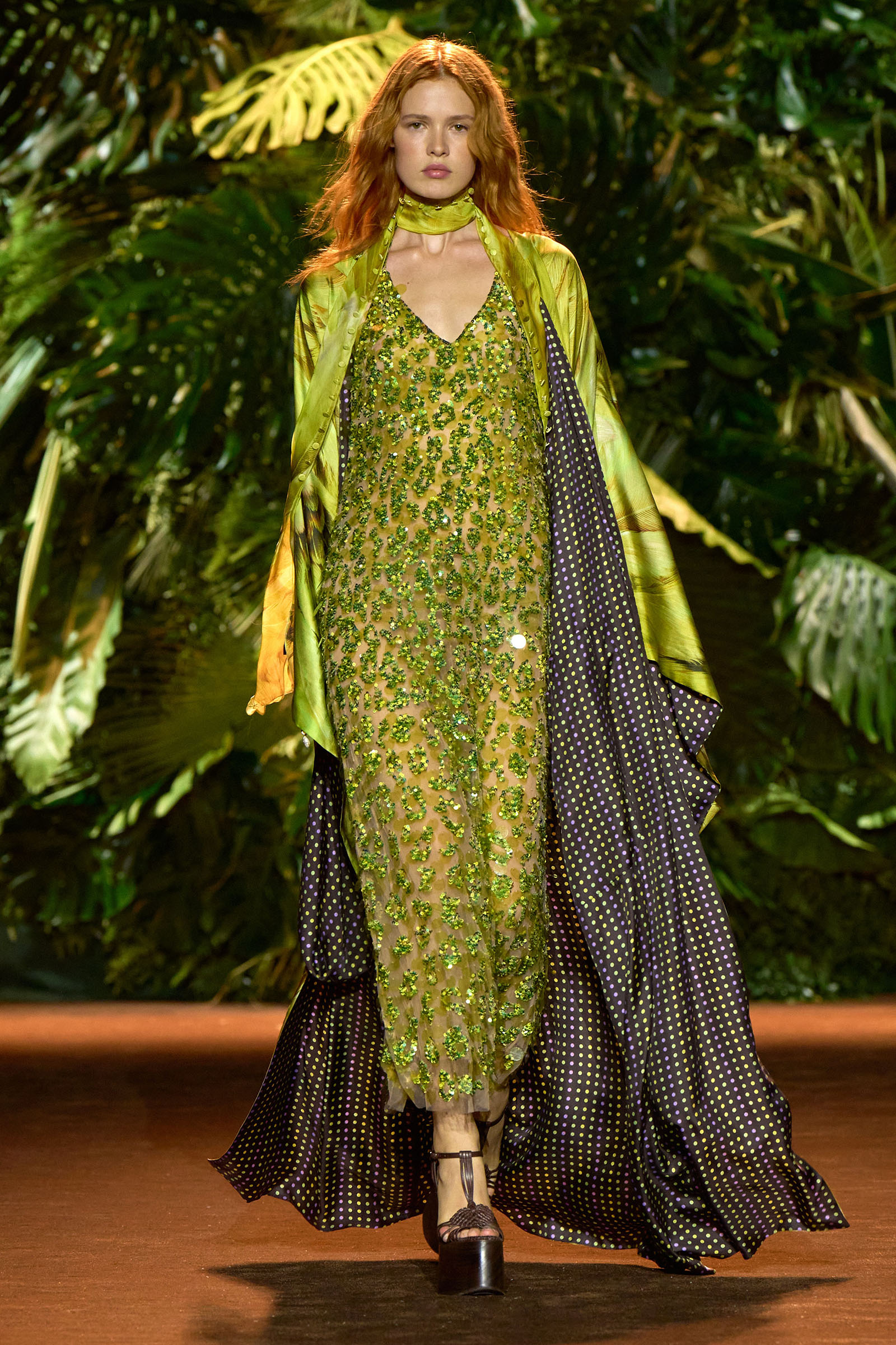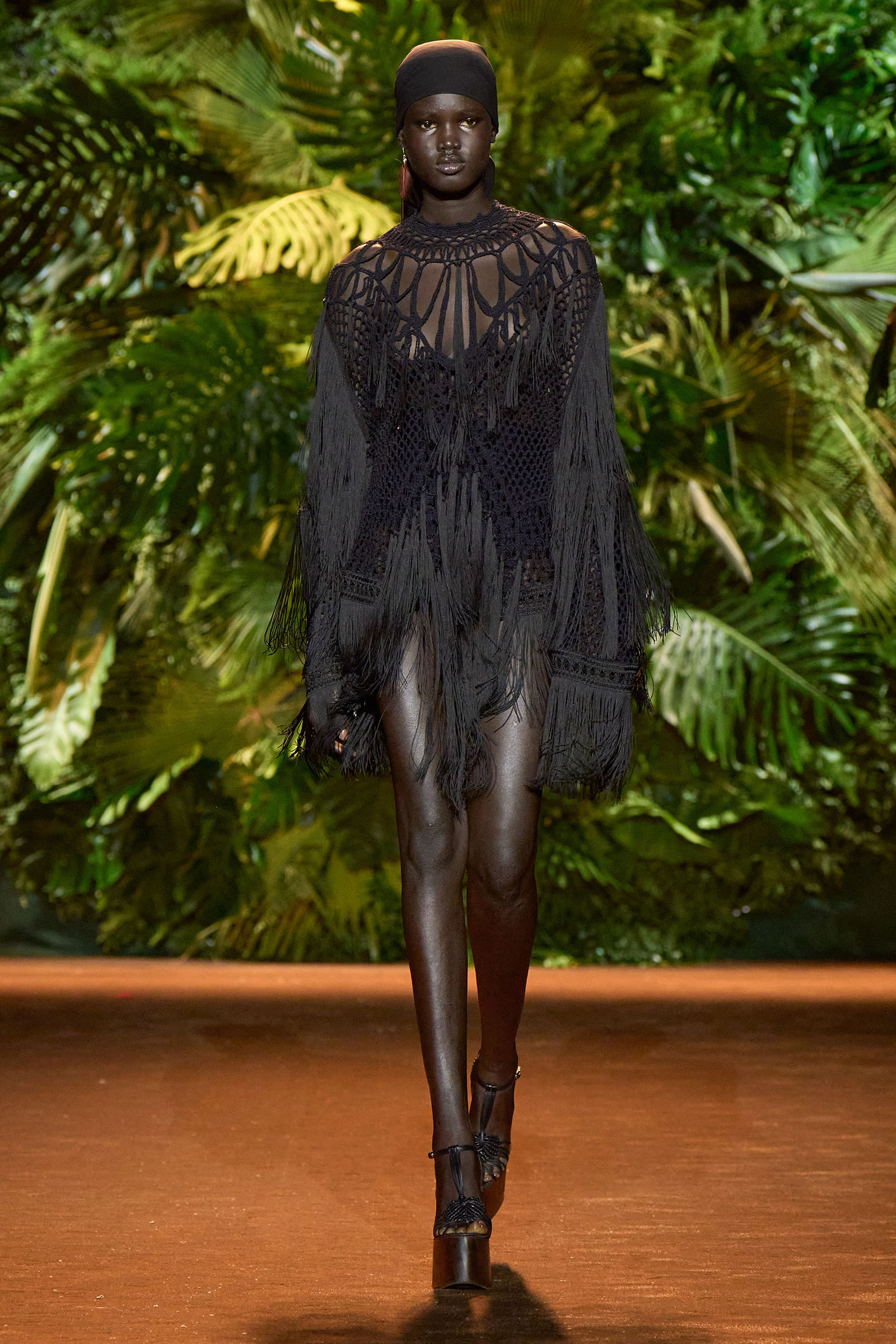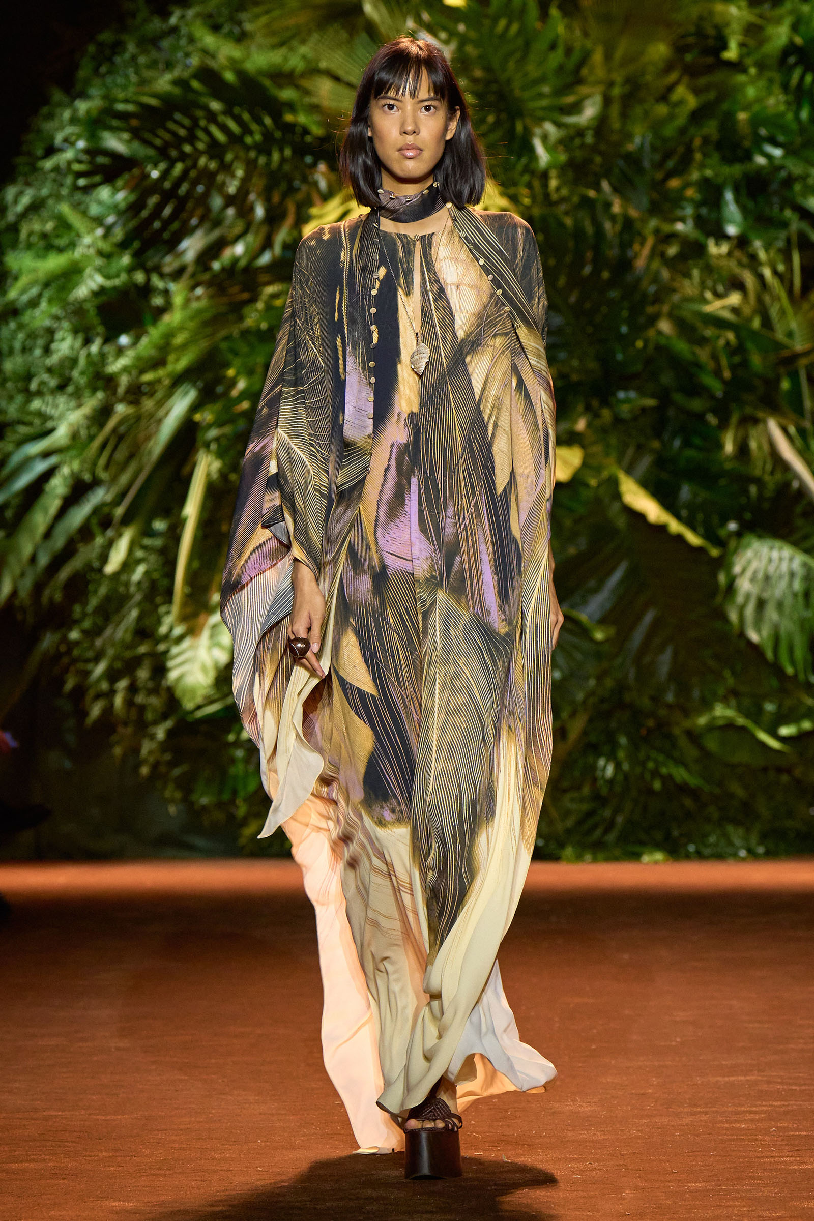 The collection that charged through all those palm fronds was just as exuberant. In a follow-on from last season, which was the first time Puglisi committed to Cavalli-esque levels of excess since signing on at the brand in 2020, these clothes were fully loaded—with feather prints, with feather embellishments, with denim embellishments in the shapes of feathers, and no small amount of exposed décolleté or bared midriff.
