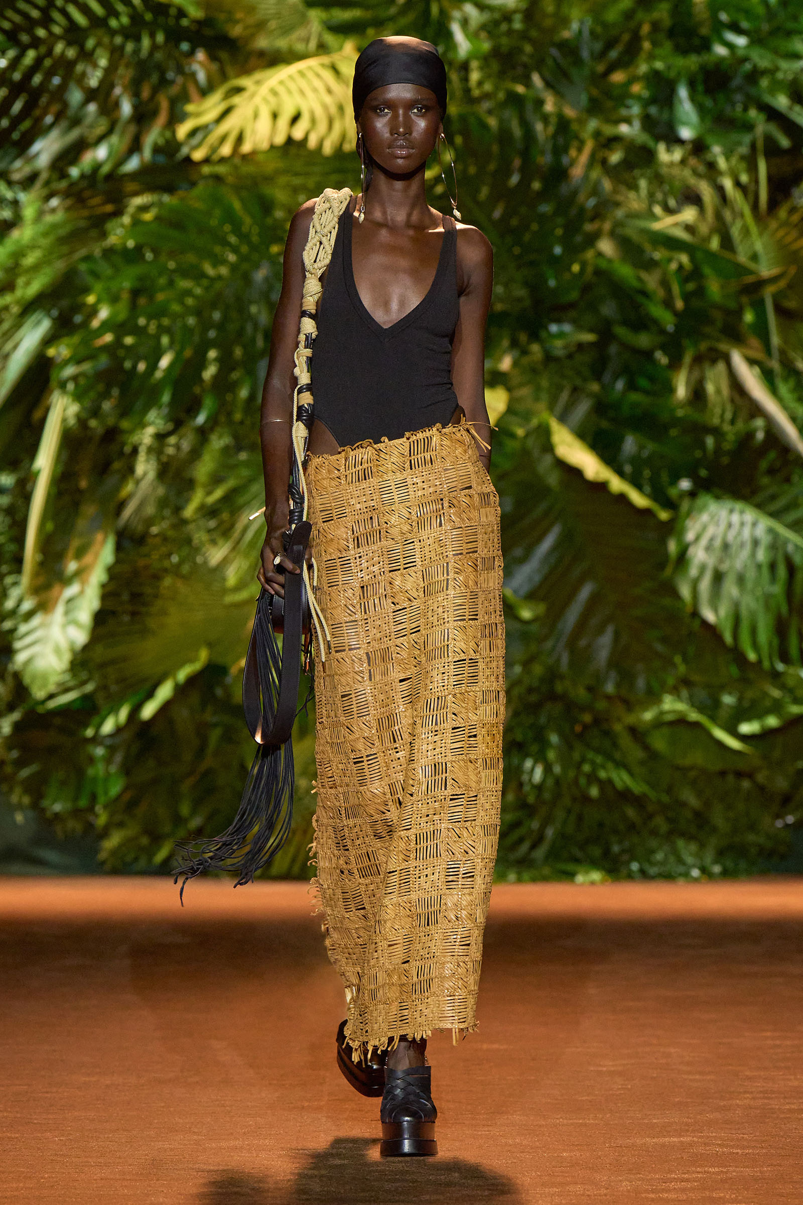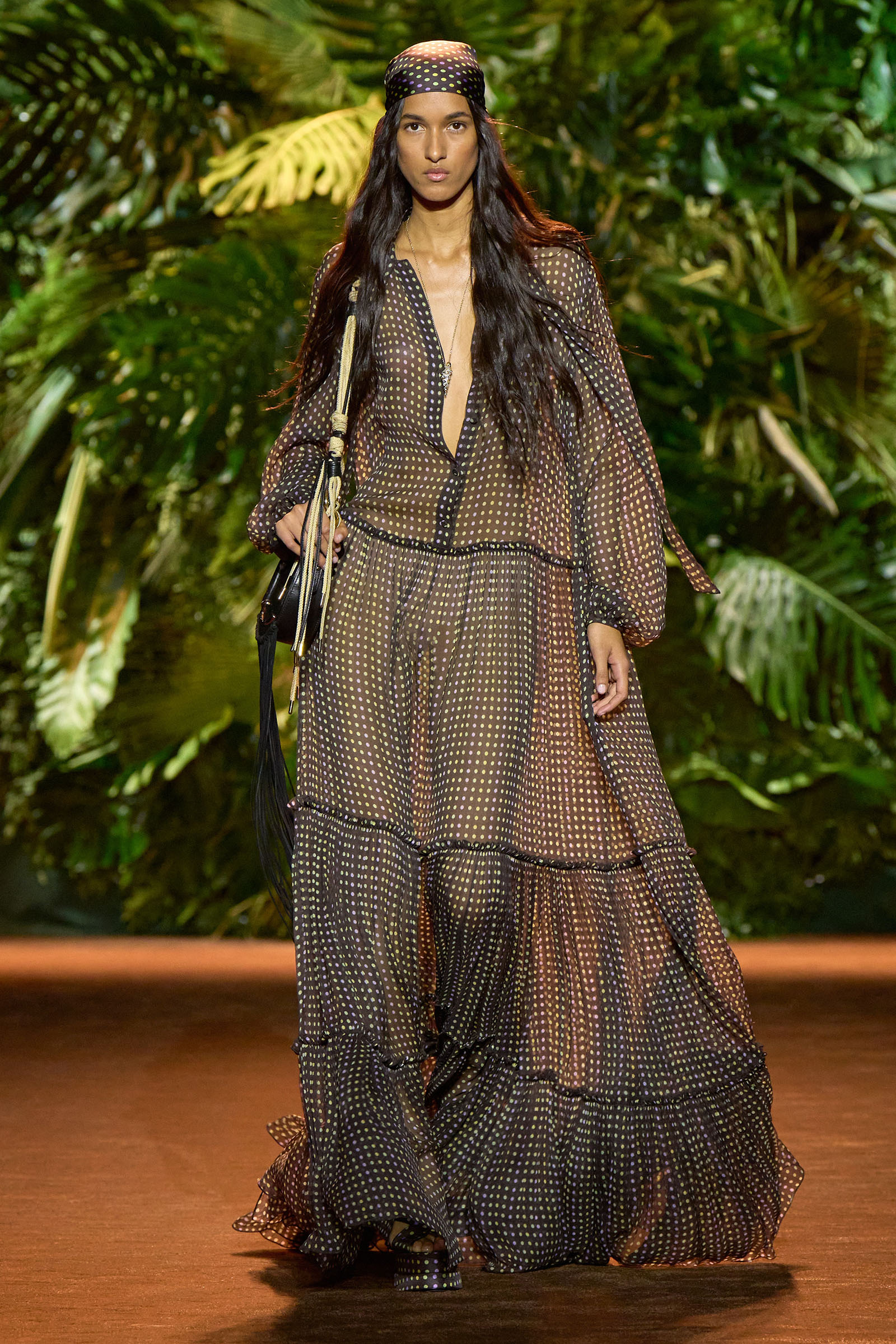 In silhouette and vibe, it was true to Cavalli’s hippie origins. Cher, Bianca Jagger, and the Italian actress Valentina Cortese were all on Puglisi’s moodboard backstage, looking confident and free. He reproduced Cher’s silvery white criss-cross bandeau top and bell bottoms in black, and Cortese’s signature head scarves, wrapped around the head and worn low over the eyebrows, accessorized some of the other looks. There was no white horse—Jagger famously hopped on one of those at Studio 54 in 1977 wearing a red off-the-shoulder number (Halston, probably)—but you got the feeling that if Puglisi could’ve made it happen, he would have.