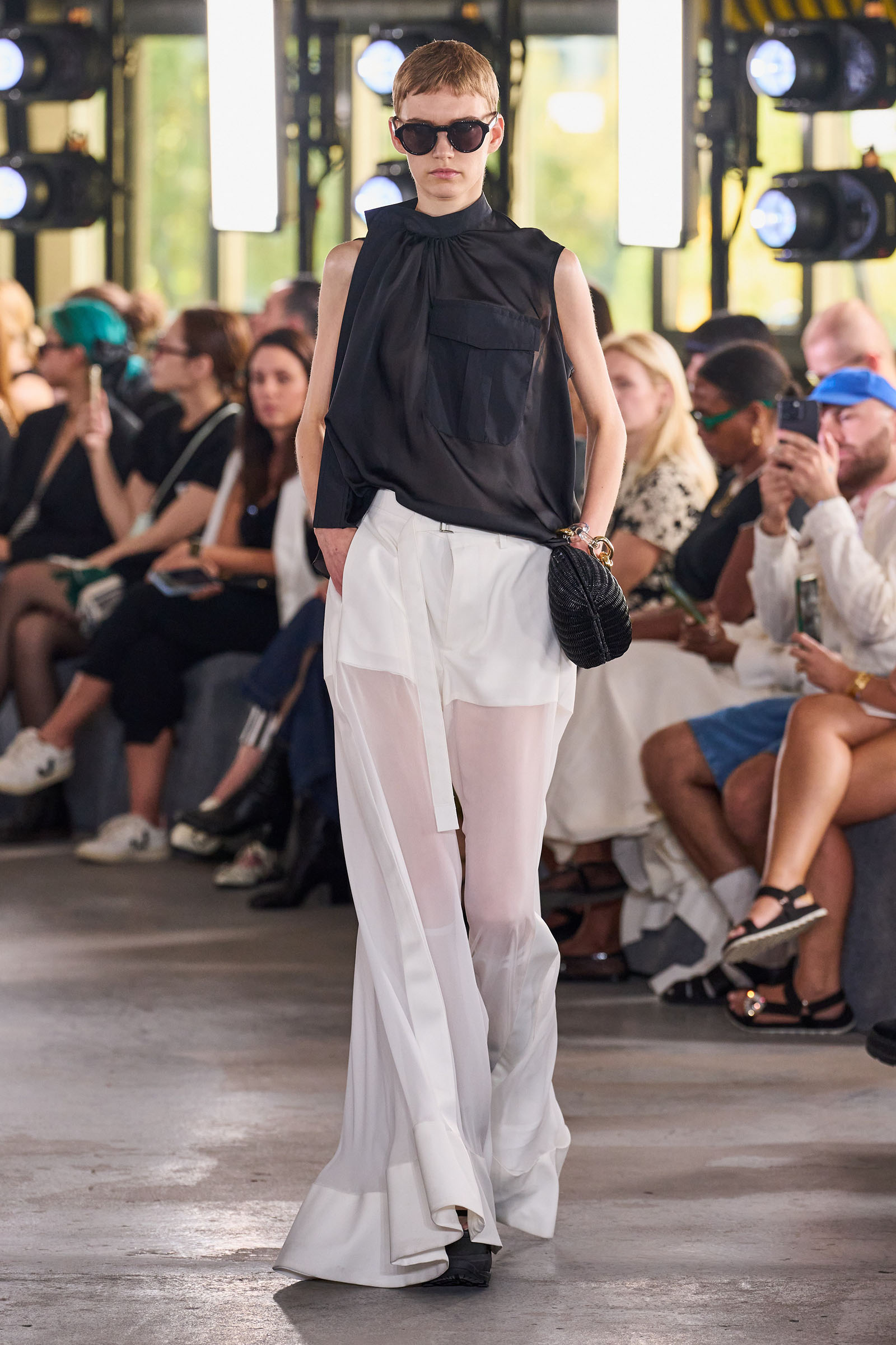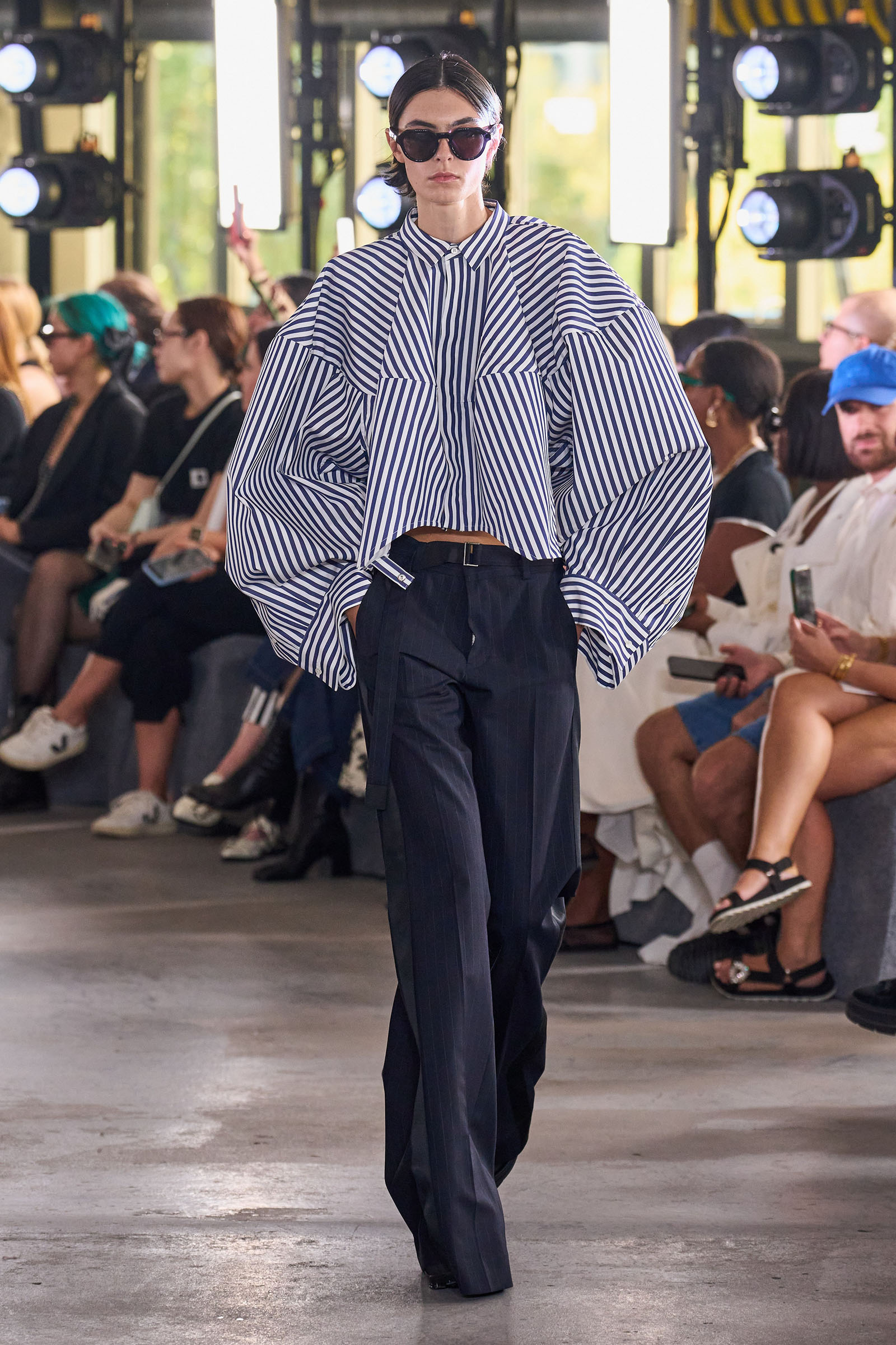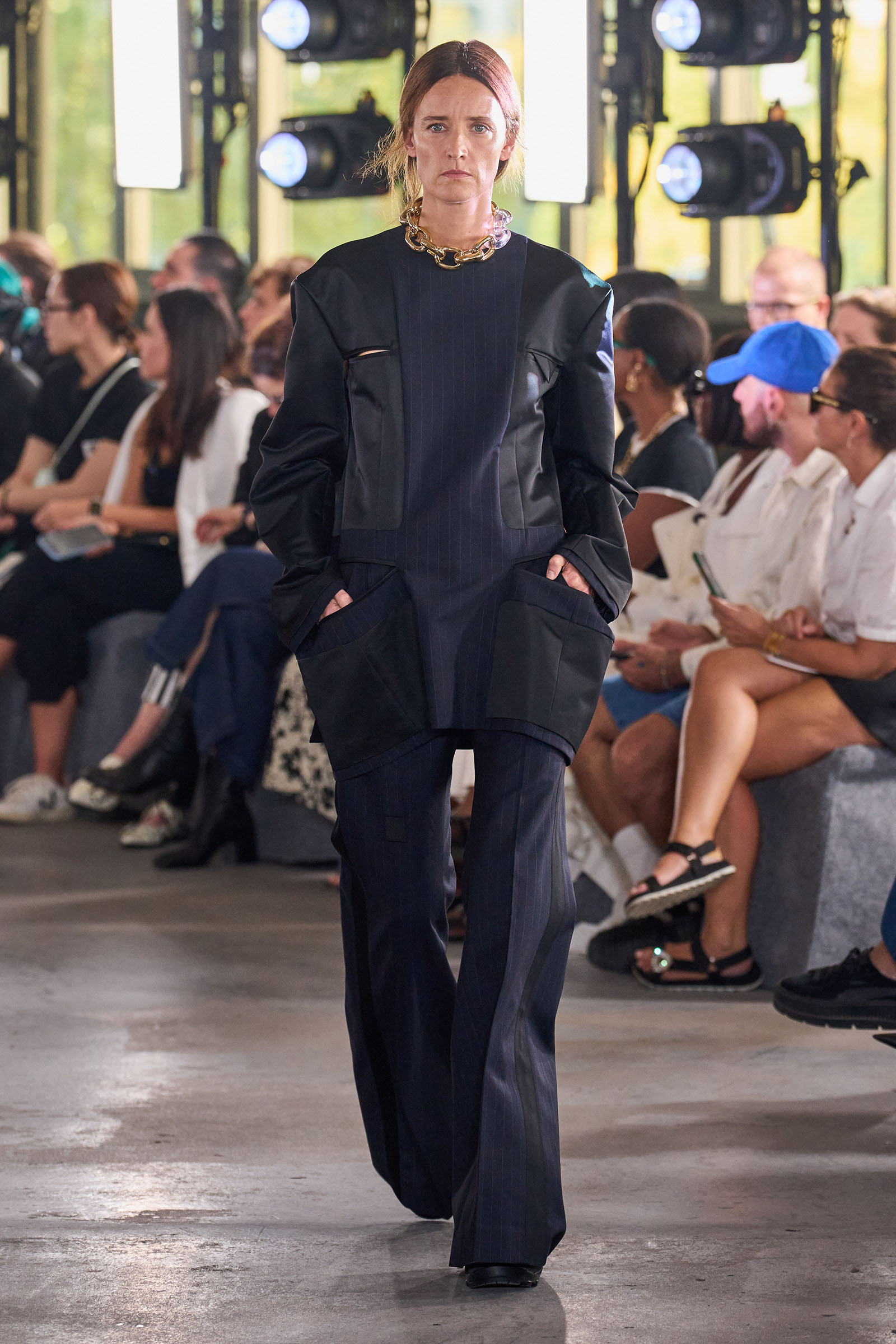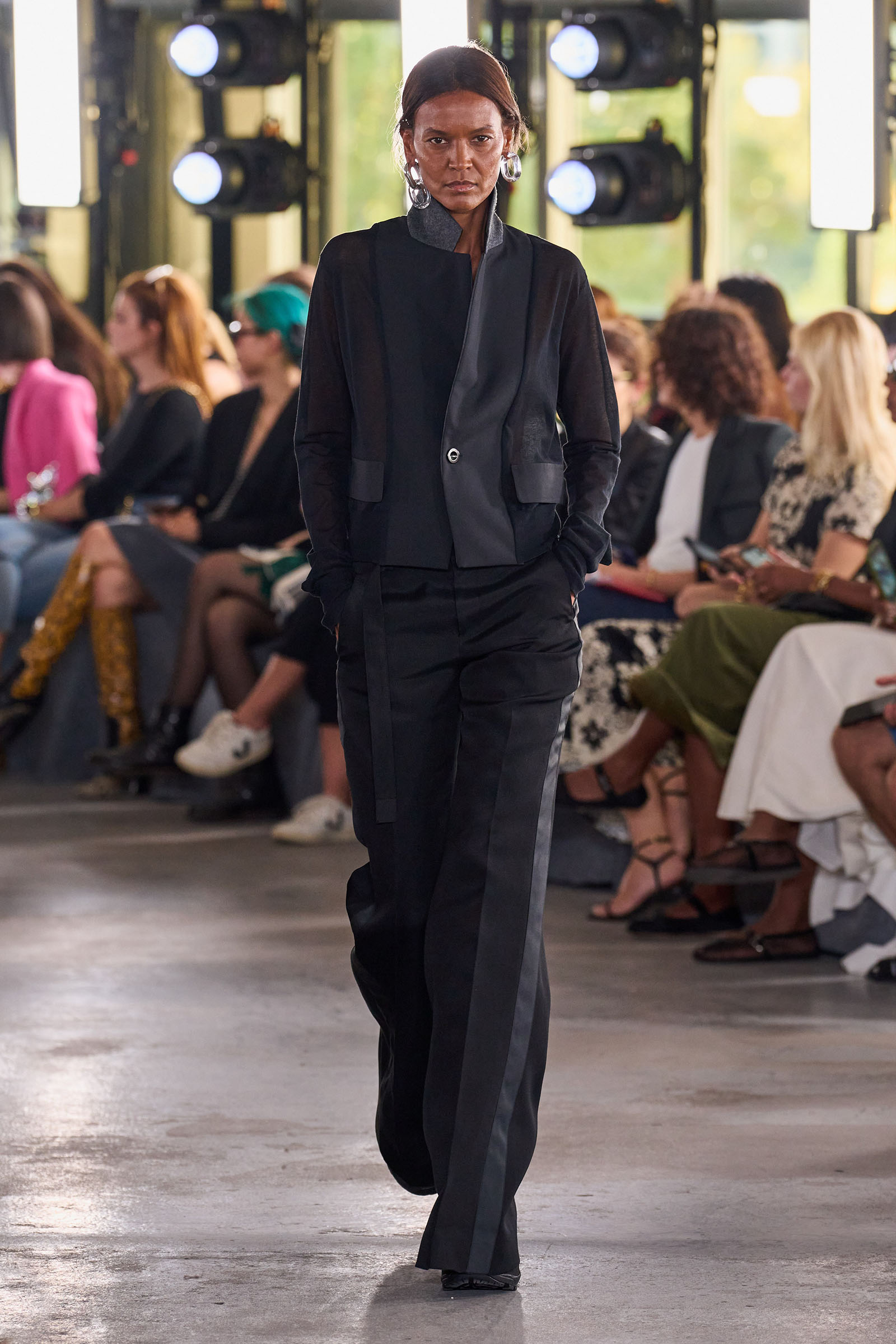 Though Abe was working with a lot of material, the vibe wasn’t prim. The slashes that stood in for pockets in an early jacket became a running motif. On the final look—a long narrow dress in menswear pinstripes and black silk—she added extra slashes below the hips, giving it Belle Epoque proportions that Rodin might’ve recognized. Not so simple, in the end, but the absence of complication did reveal something new about Abe: She cuts a terrific pair of leg elongating pants.