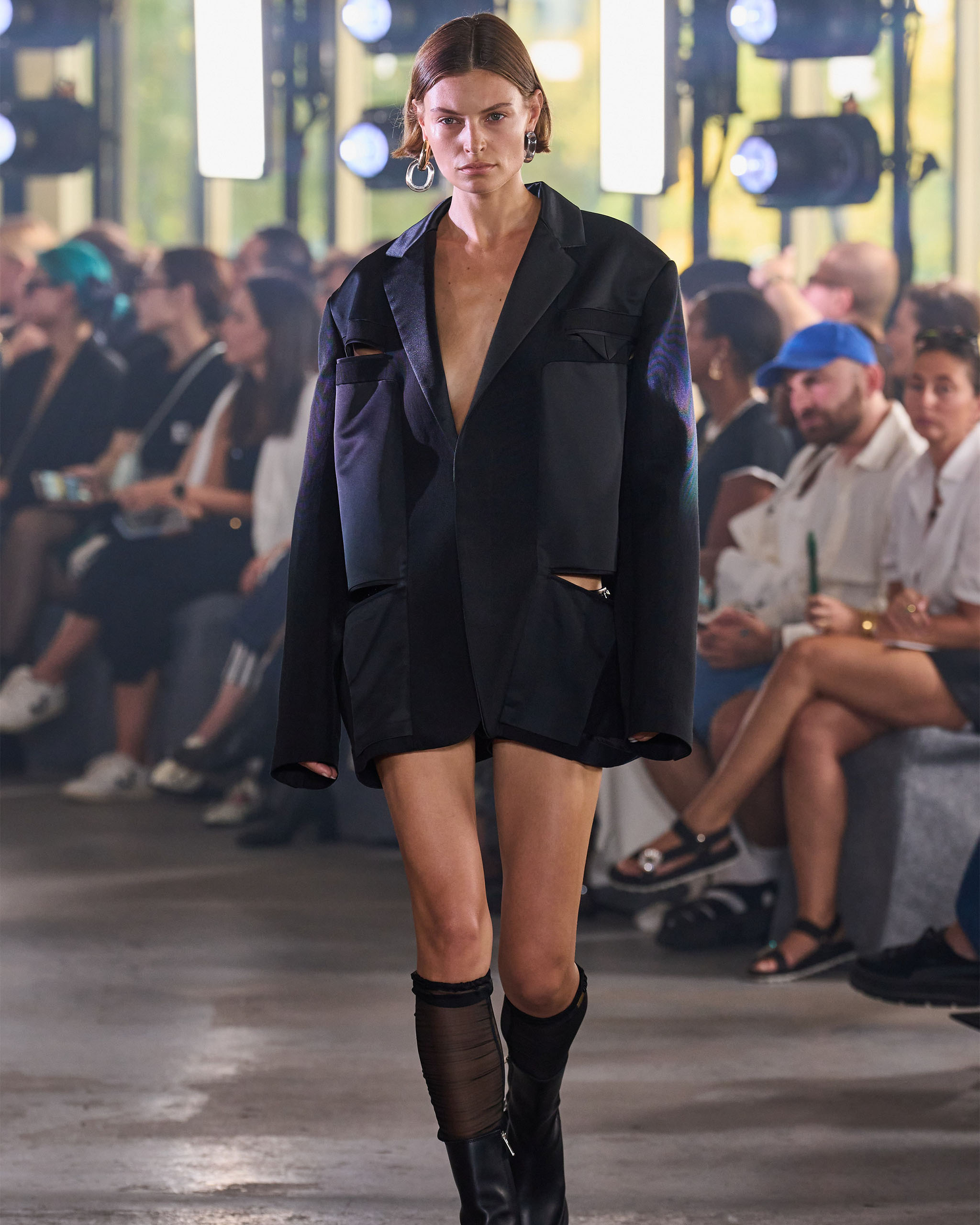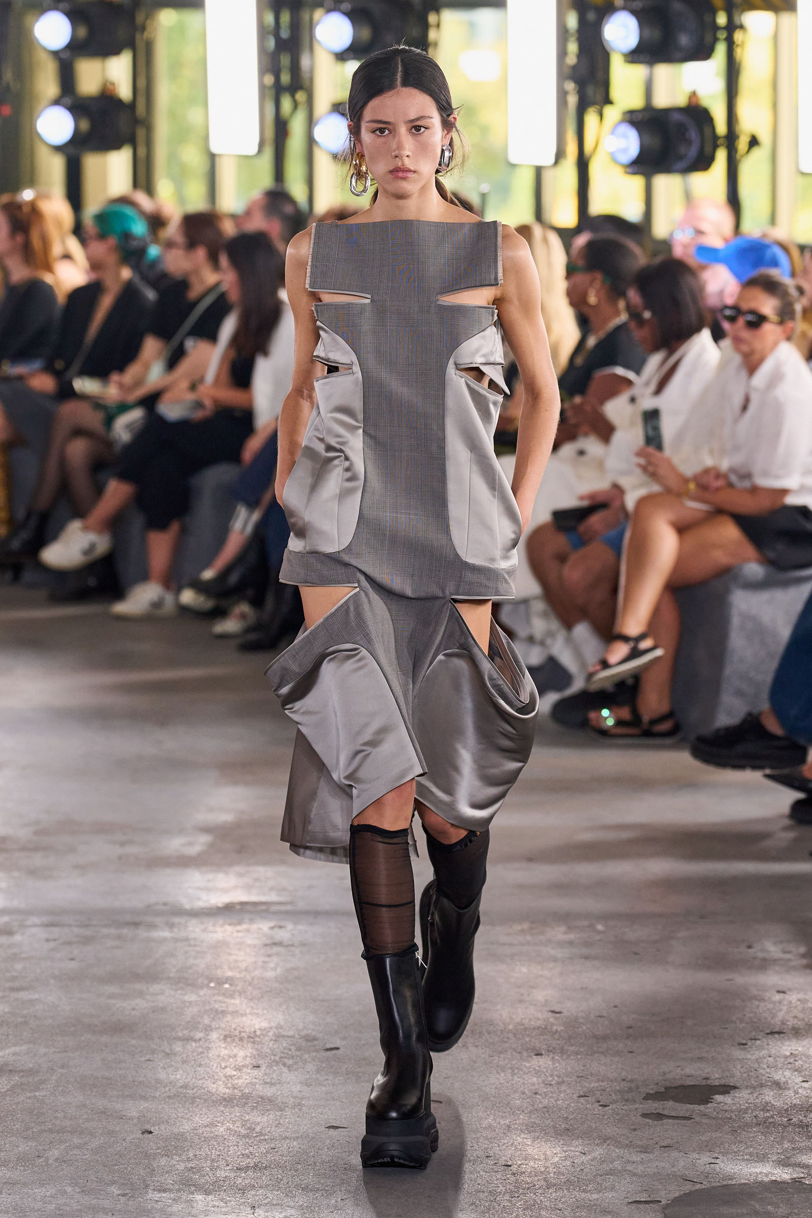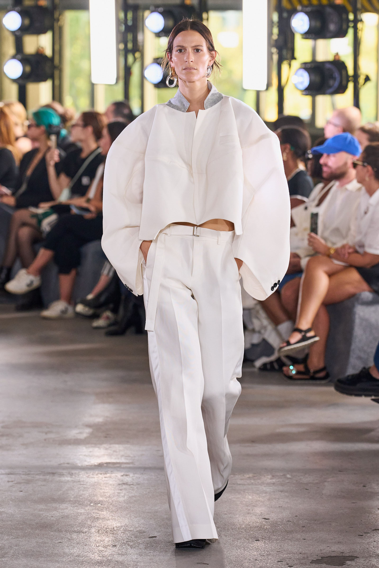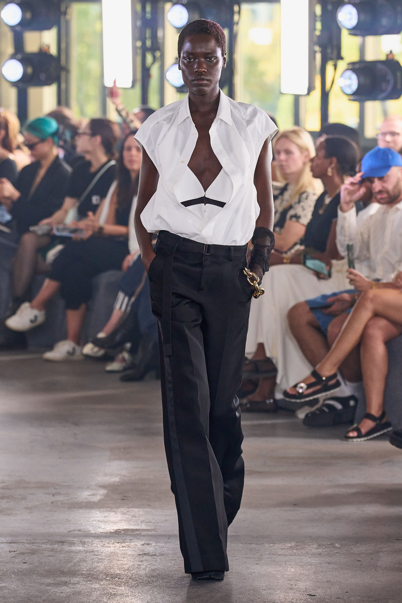 Though Abe was working with a lot of material, the vibe wasn’t prim. The slashes that stood in for pockets in an early jacket became a running motif. On the final look—a long narrow dress in menswear pinstripes and black silk—she added extra slashes below the hips, giving it Belle Epoque proportions that Rodin might’ve recognized. Not so simple, in the end, but the absence of complication did reveal something new about Abe: She cuts a terrific pair of leg elongating pants.