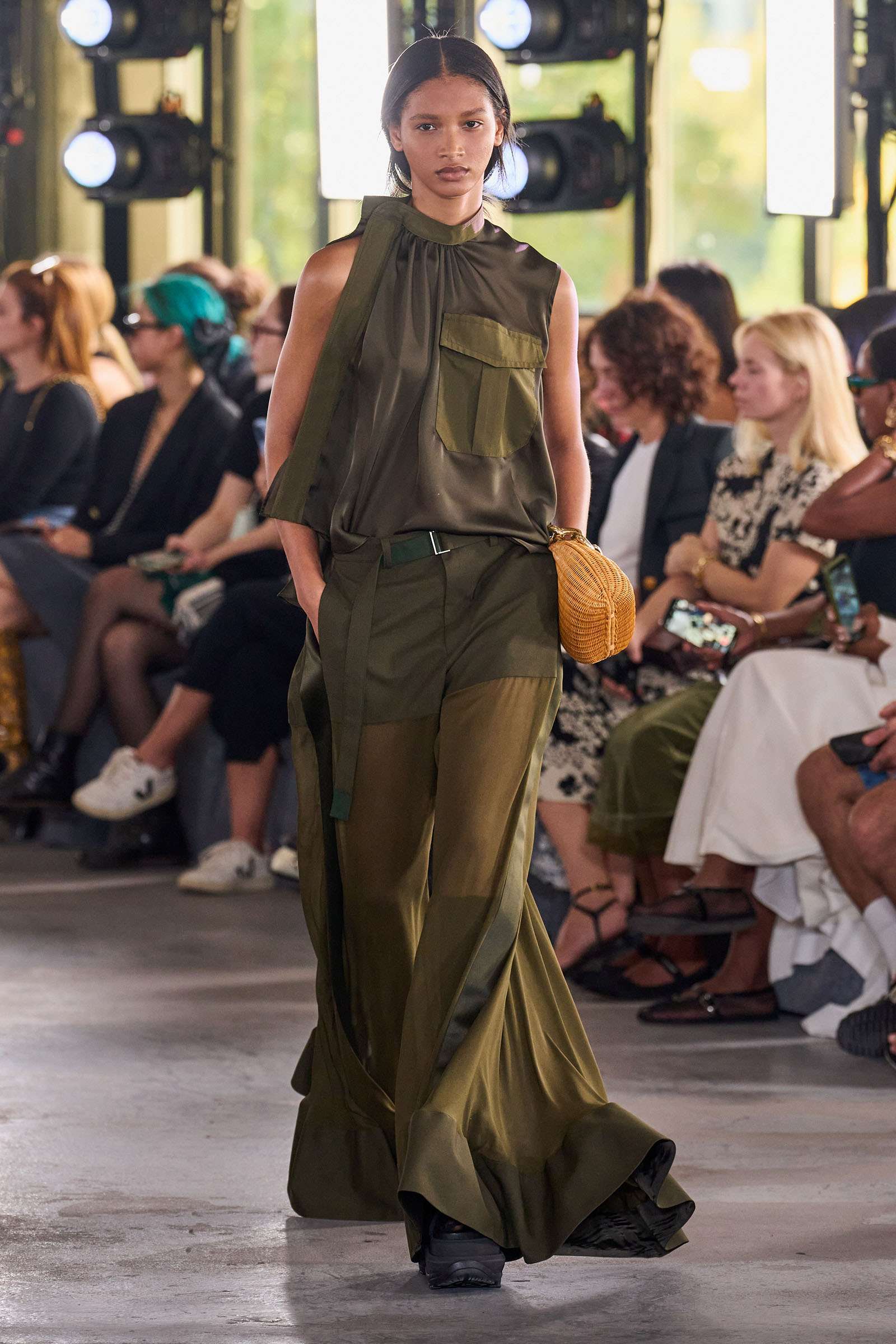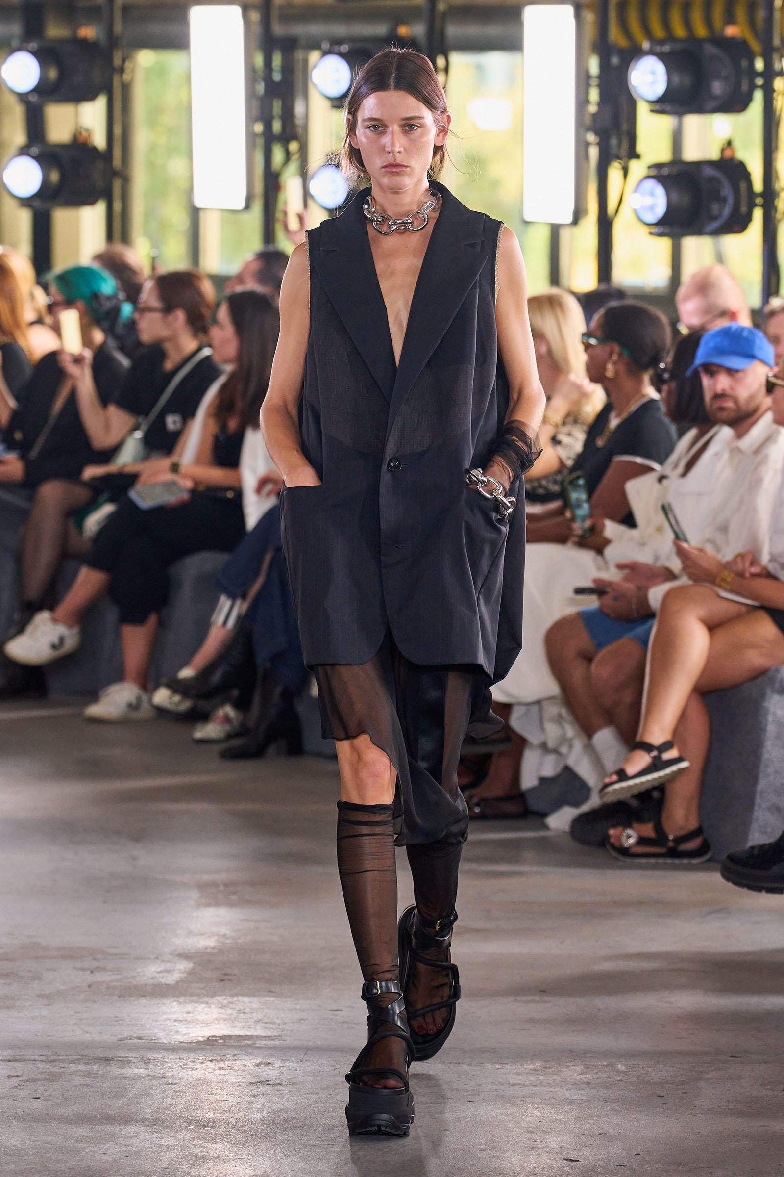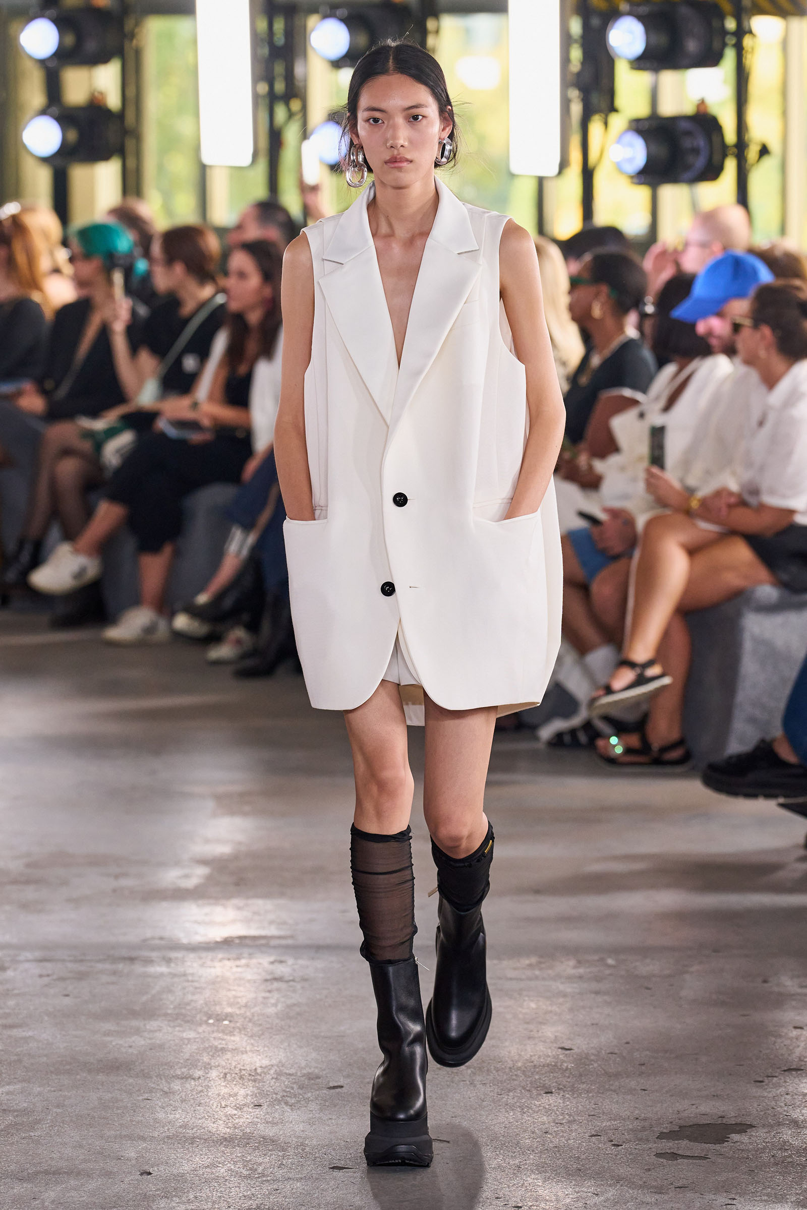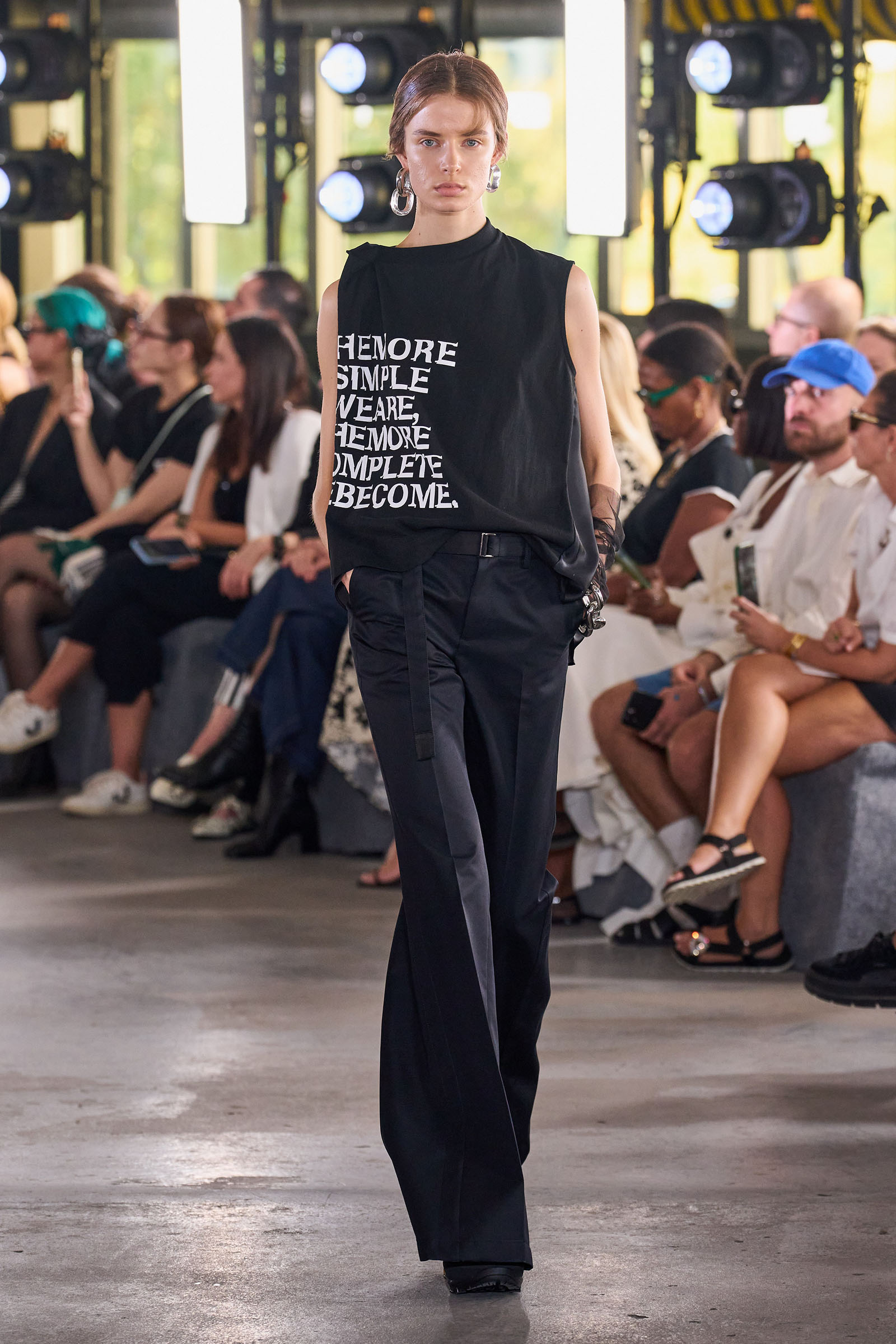 Though Abe was working with a lot of material, the vibe wasn’t prim. The slashes that stood in for pockets in an early jacket became a running motif. On the final look—a long narrow dress in menswear pinstripes and black silk—she added extra slashes below the hips, giving it Belle Epoque proportions that Rodin might’ve recognized. Not so simple, in the end, but the absence of complication did reveal something new about Abe: She cuts a terrific pair of leg elongating pants.