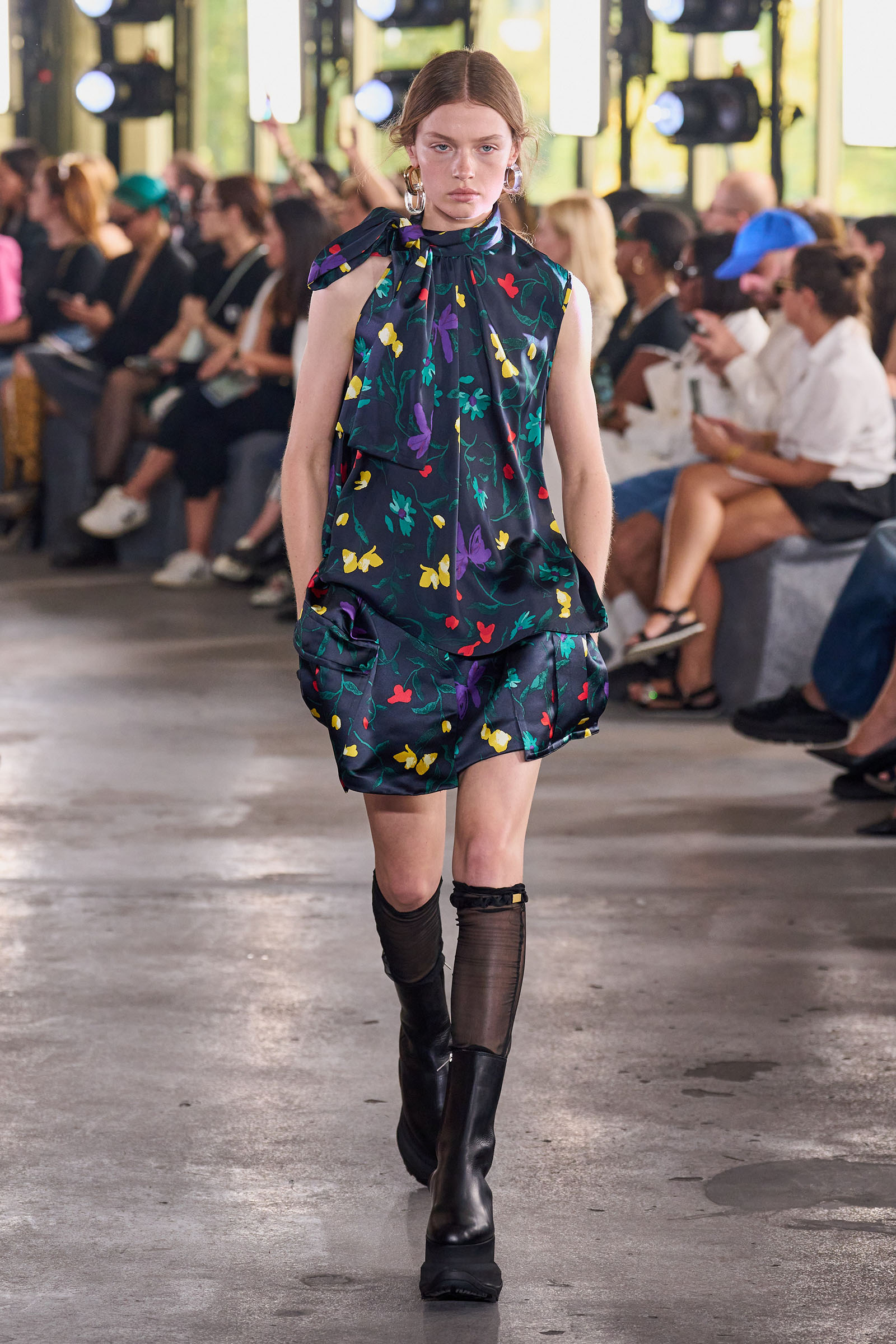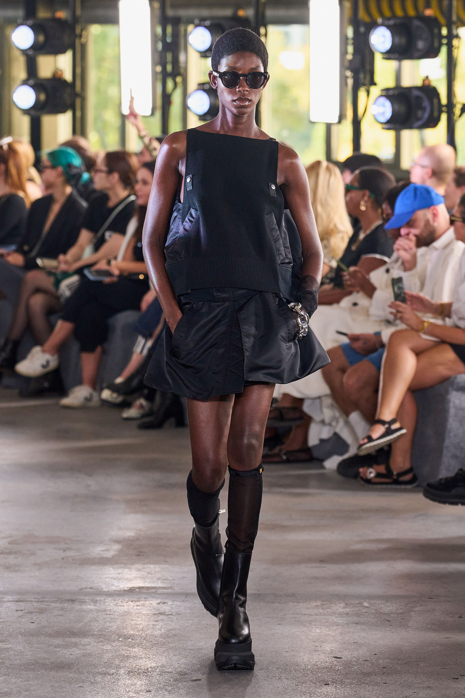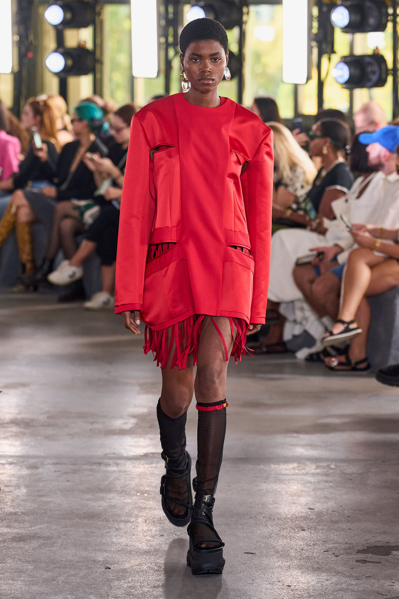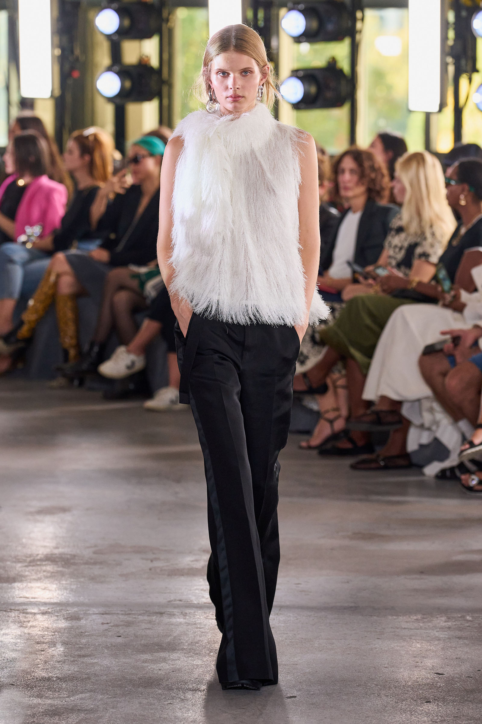 Though Abe was working with a lot of material, the vibe wasn’t prim. The slashes that stood in for pockets in an early jacket became a running motif. On the final look—a long narrow dress in menswear pinstripes and black silk—she added extra slashes below the hips, giving it Belle Epoque proportions that Rodin might’ve recognized. Not so simple, in the end, but the absence of complication did reveal something new about Abe: She cuts a terrific pair of leg elongating pants.