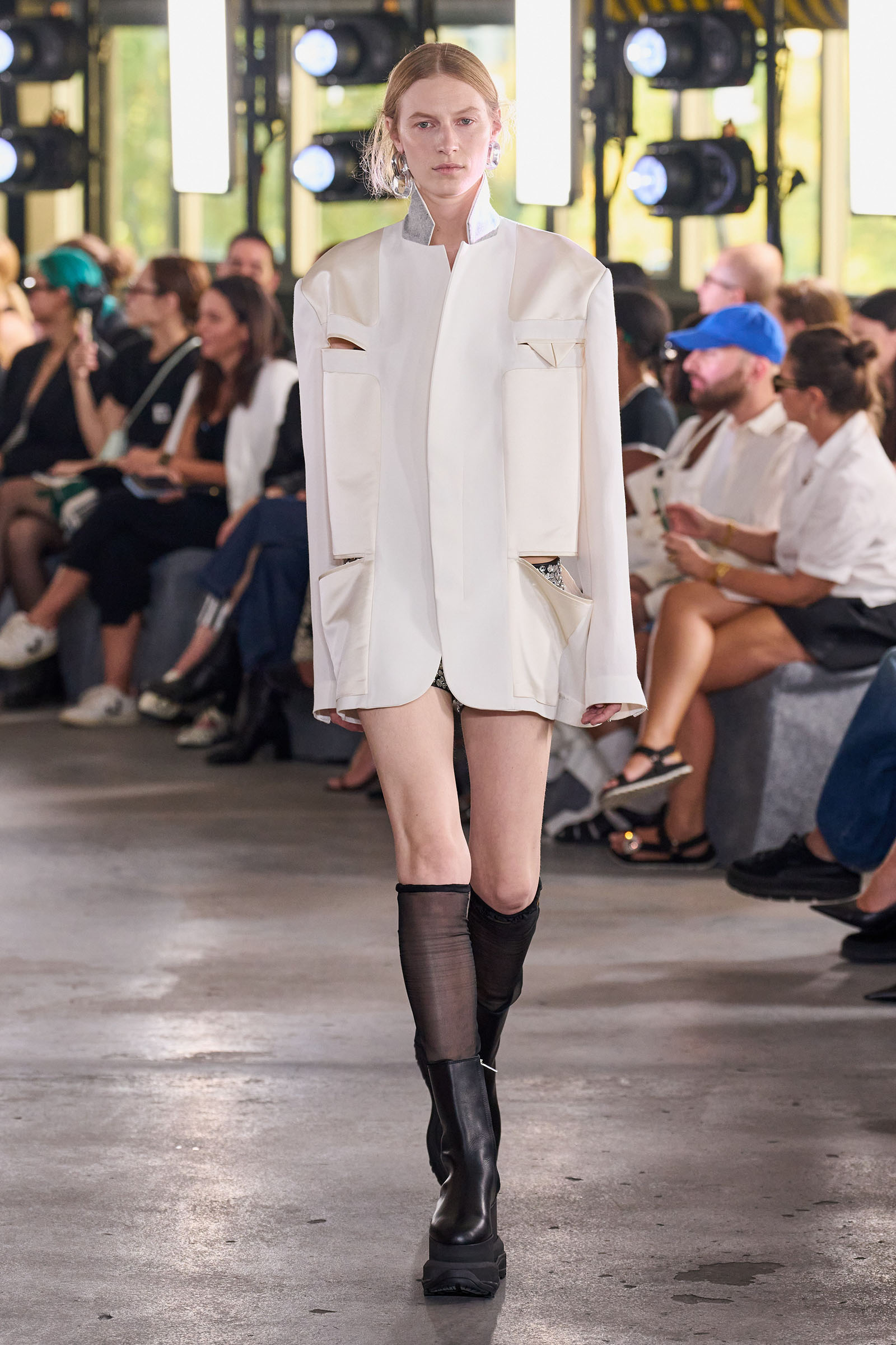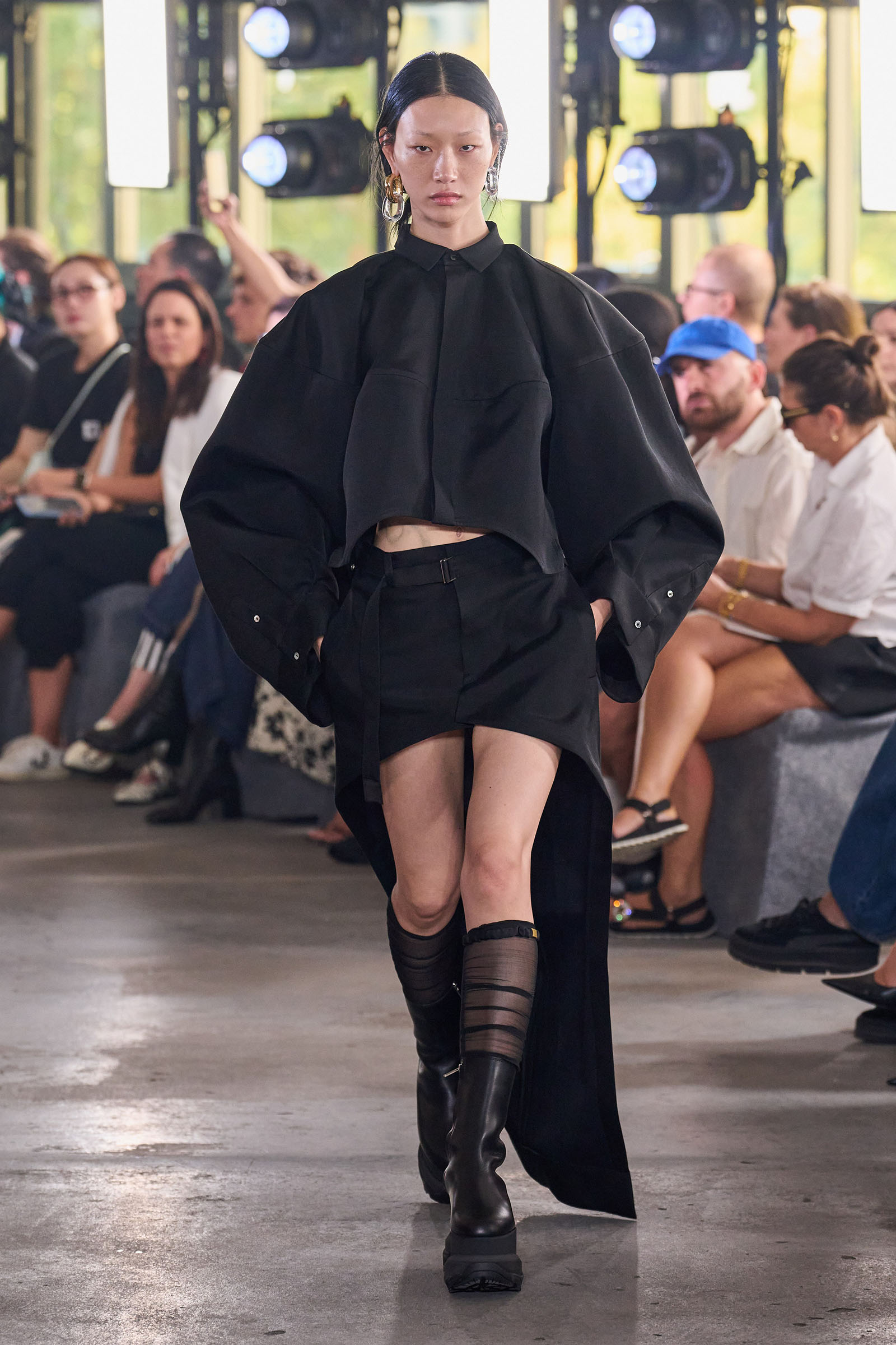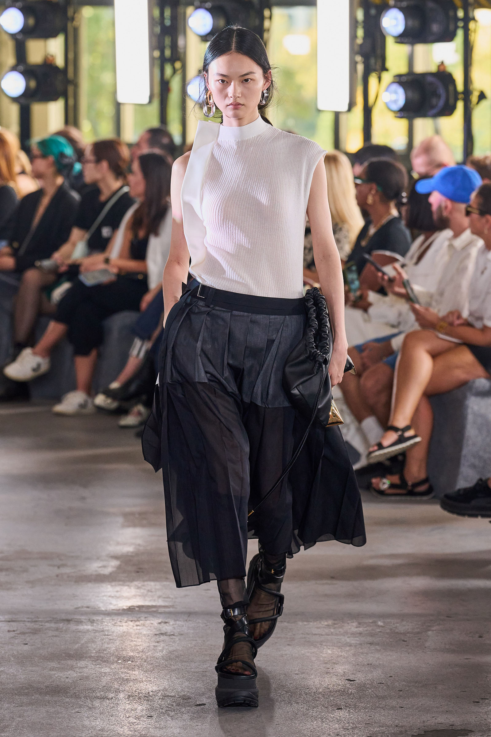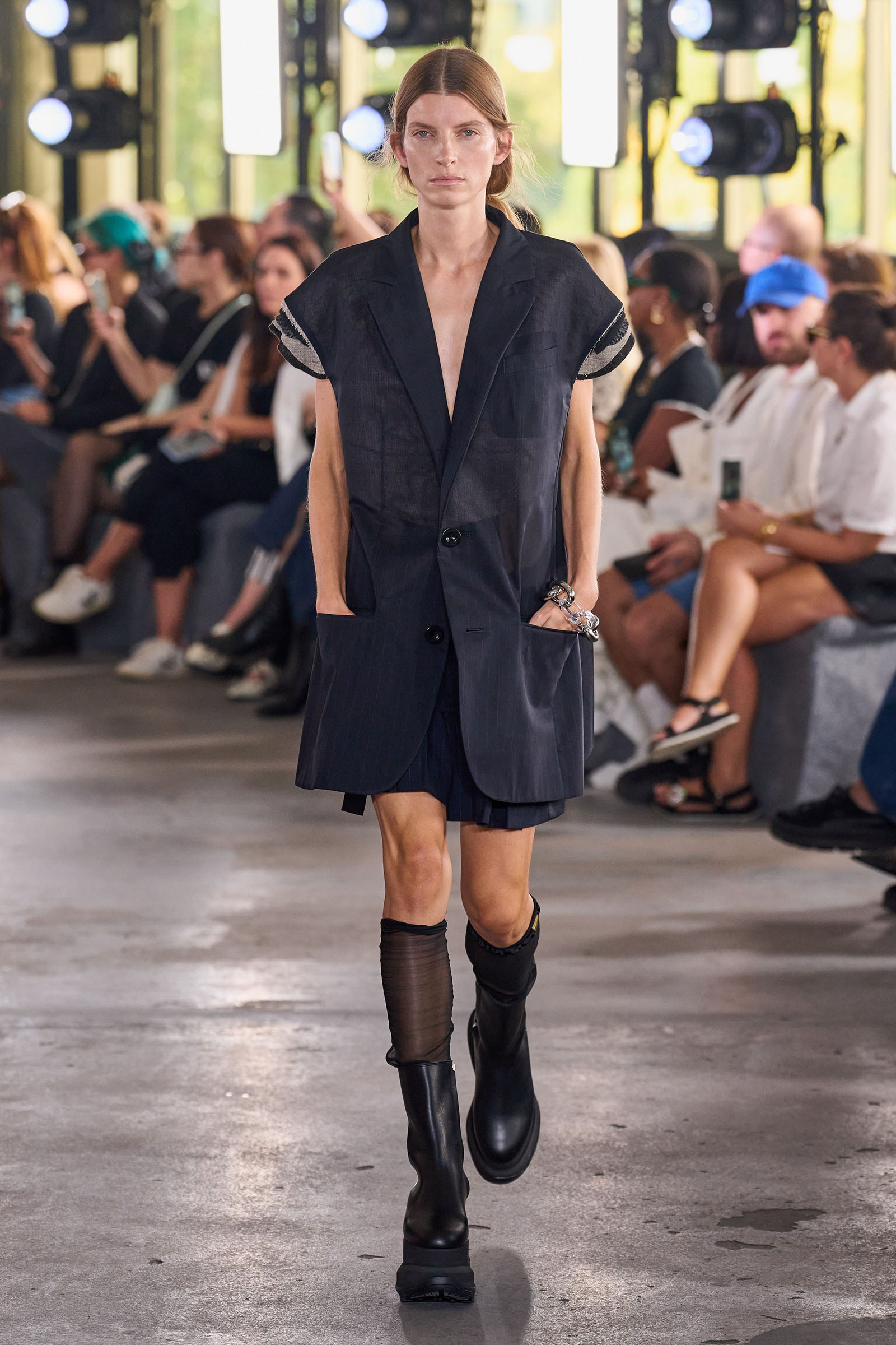 “The more simple we are, the more complete we become.” Has Sacai’s Chitose Abe been normal-pilled too, like many of her designer peers? After 15 years of hybrids, she played it straighter than usual this season, or at least as straight as a slouched-on jacket with slashes for pockets where skin peeks out can be.