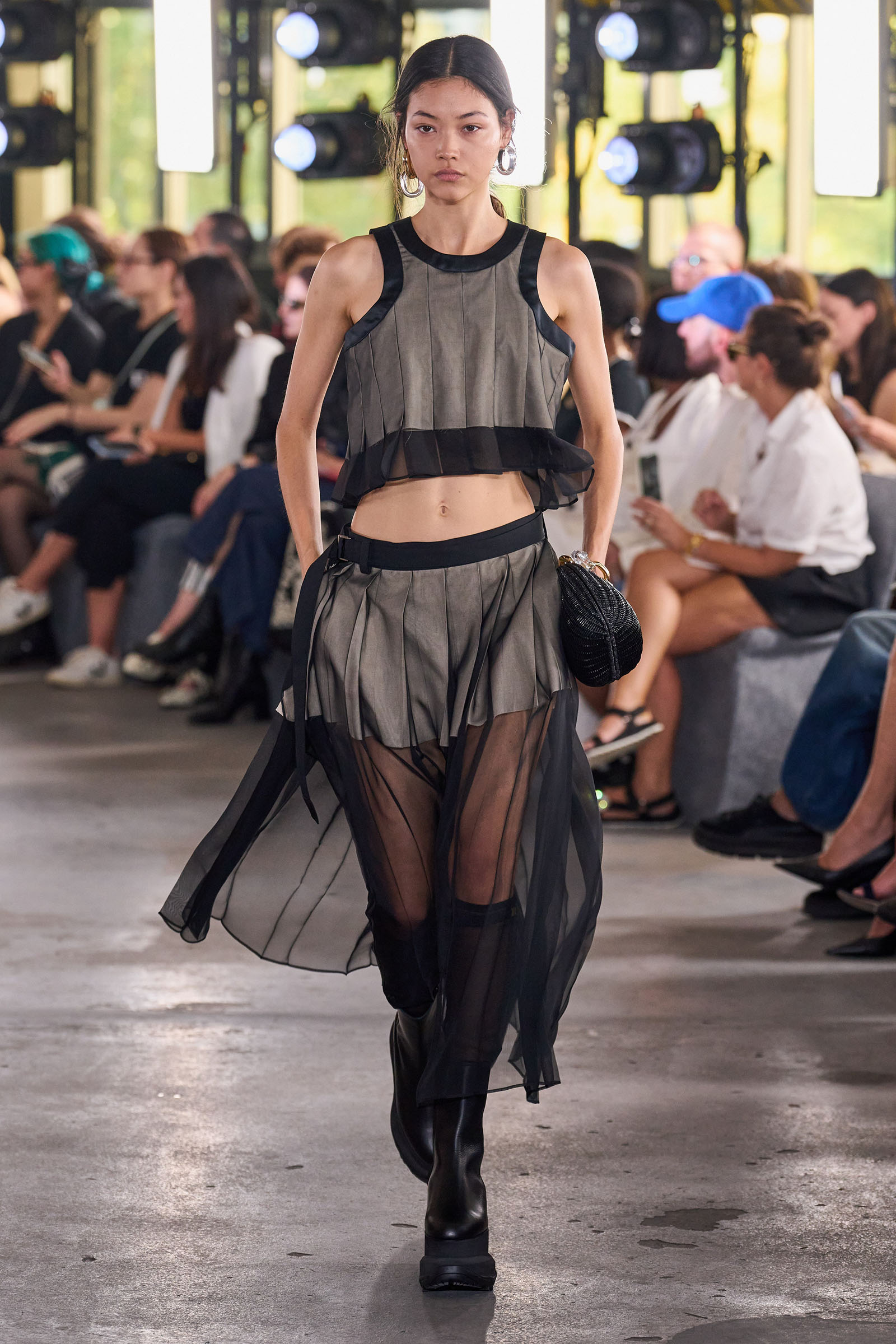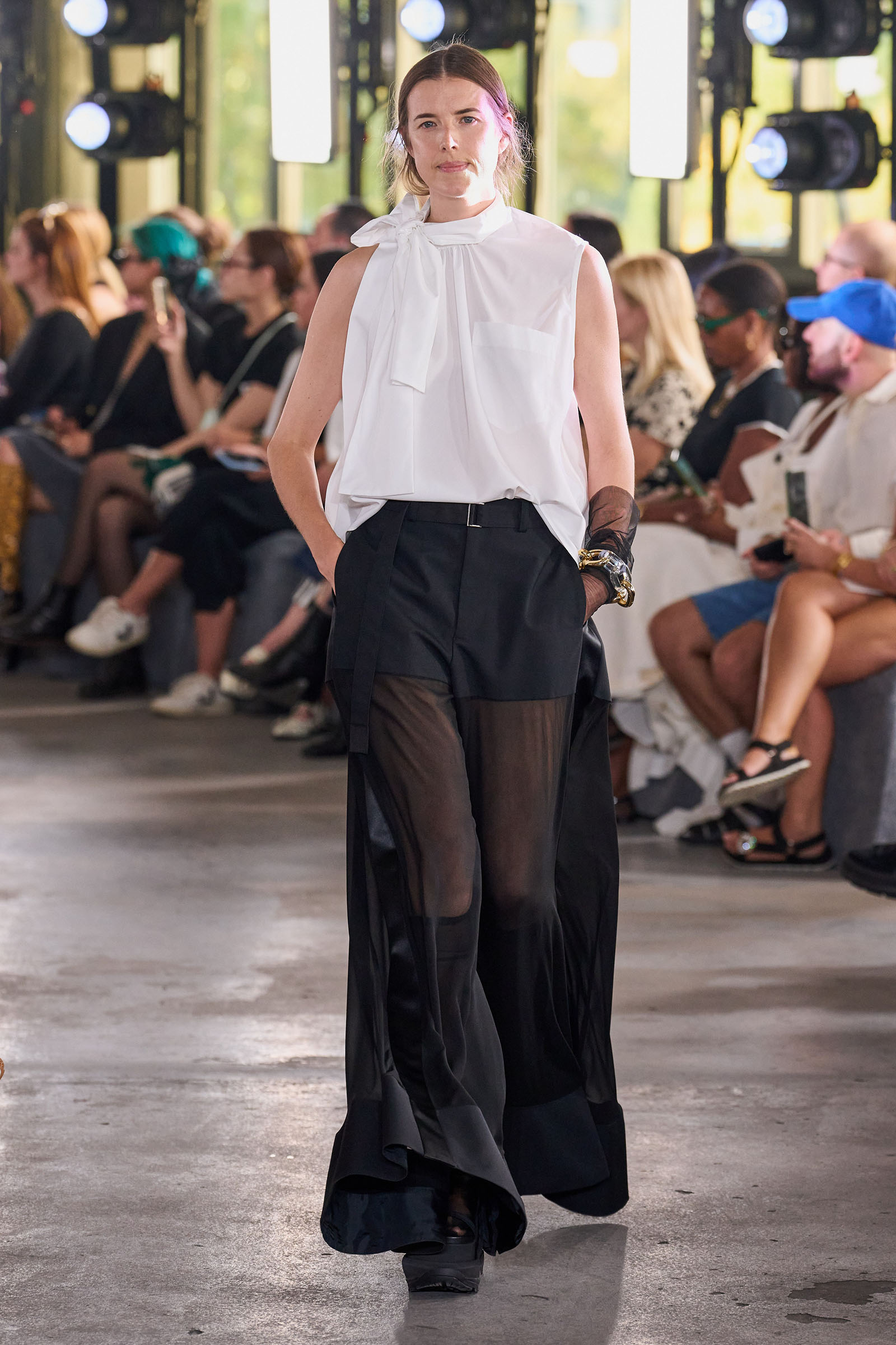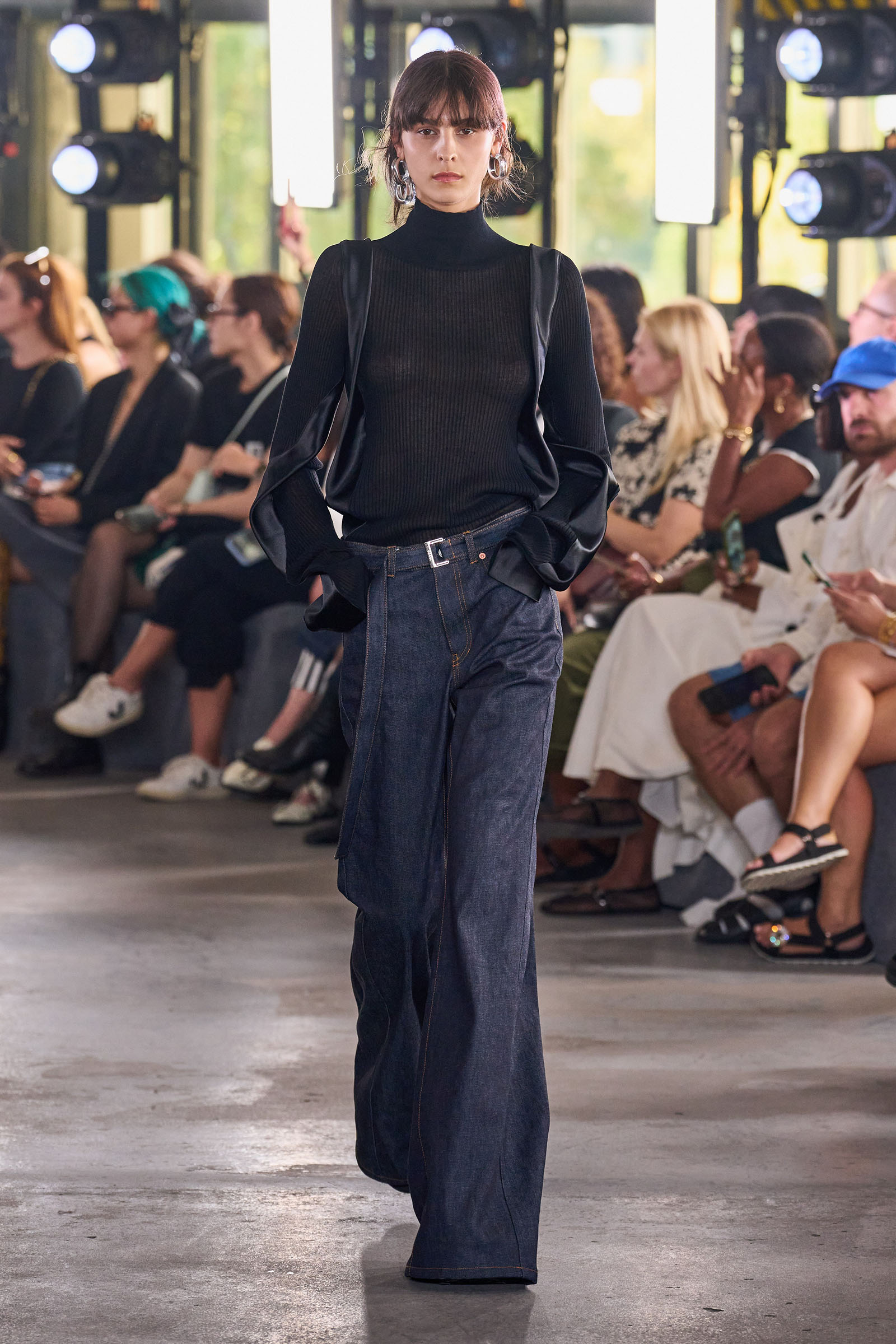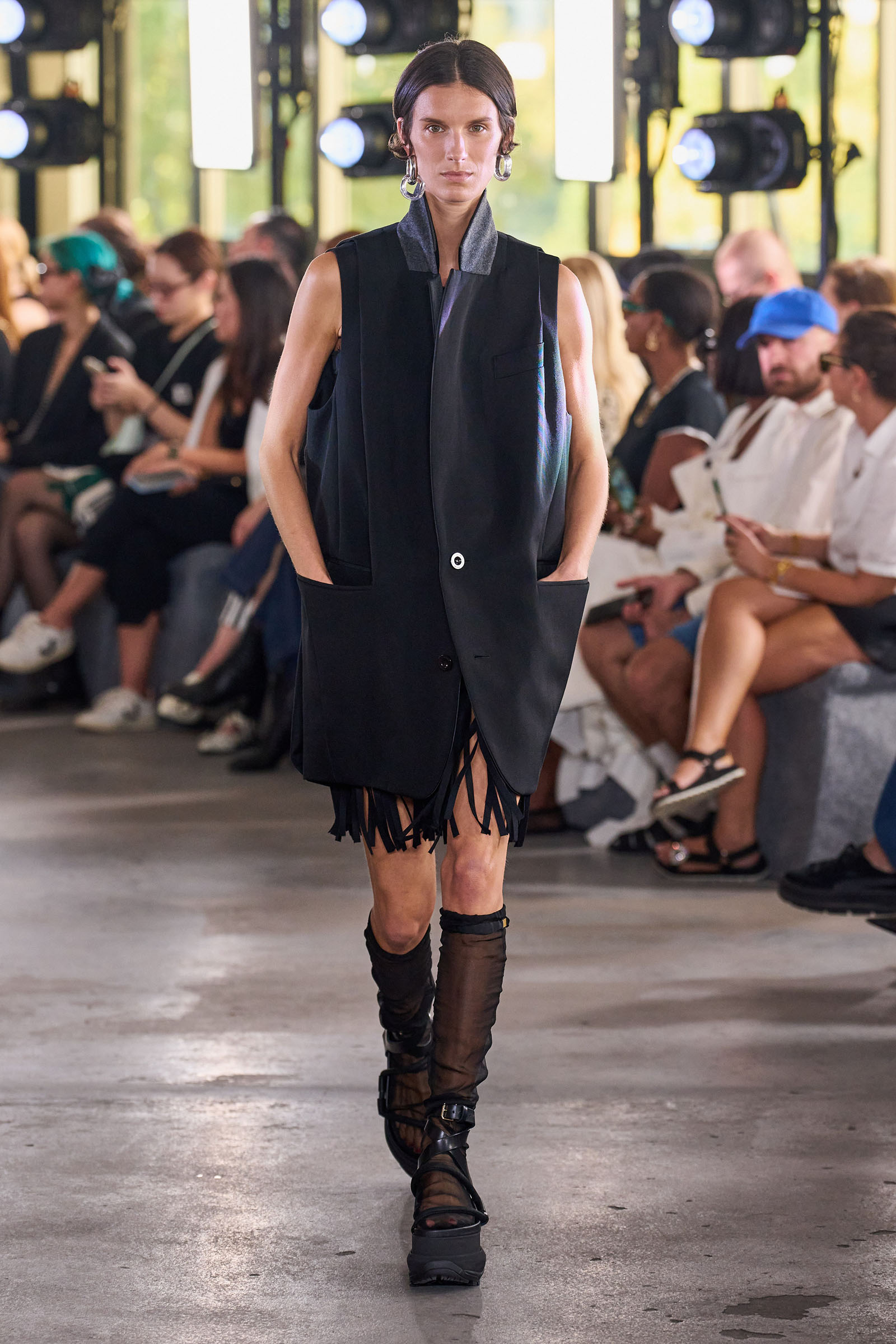 “The more simple we are, the more complete we become.” Has Sacai’s Chitose Abe been normal-pilled too, like many of her designer peers? After 15 years of hybrids, she played it straighter than usual this season, or at least as straight as a slouched-on jacket with slashes for pockets where skin peeks out can be.