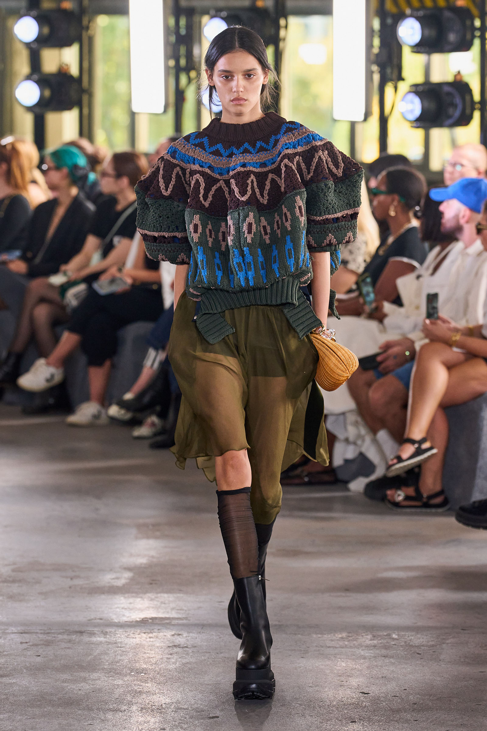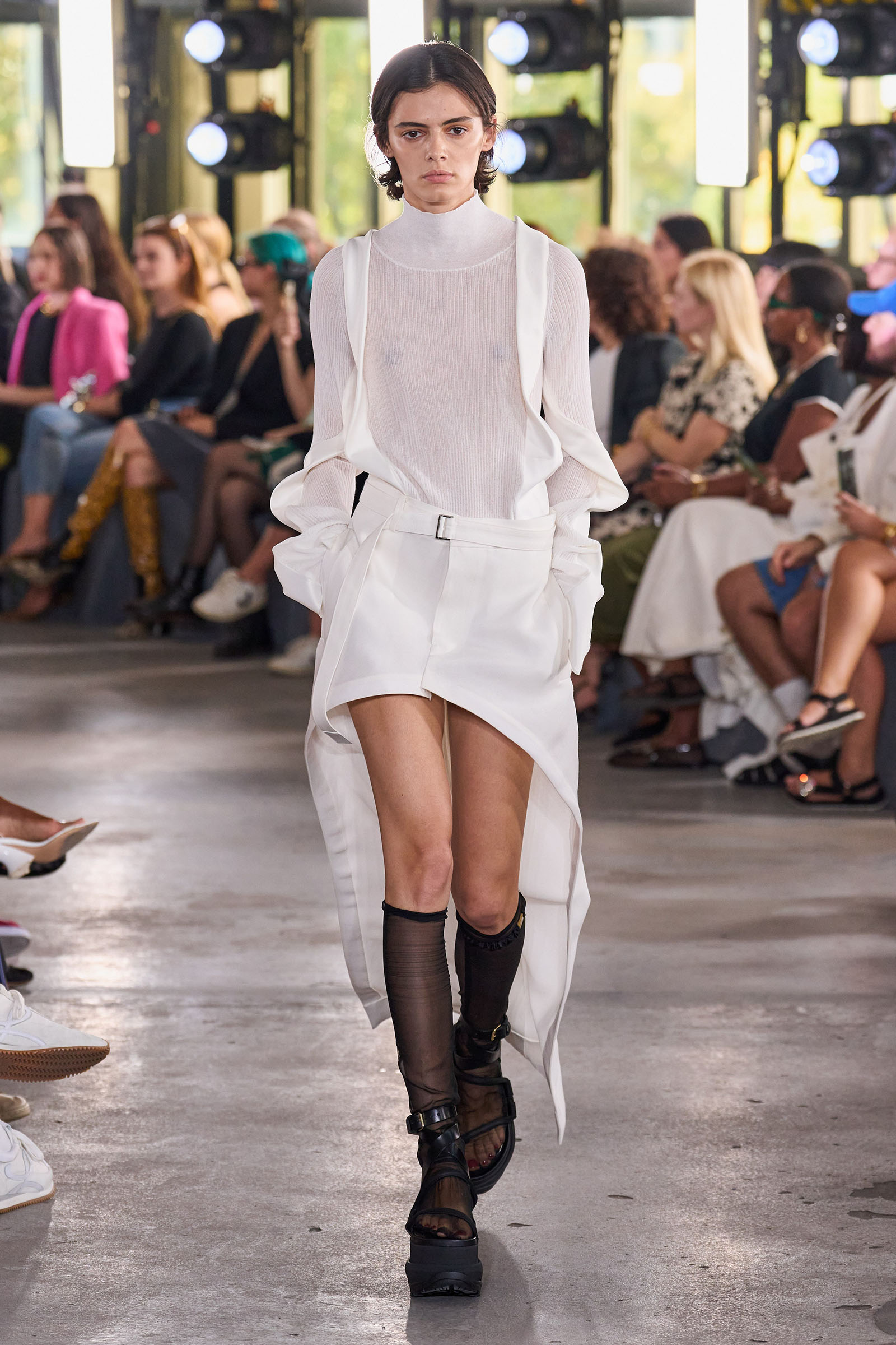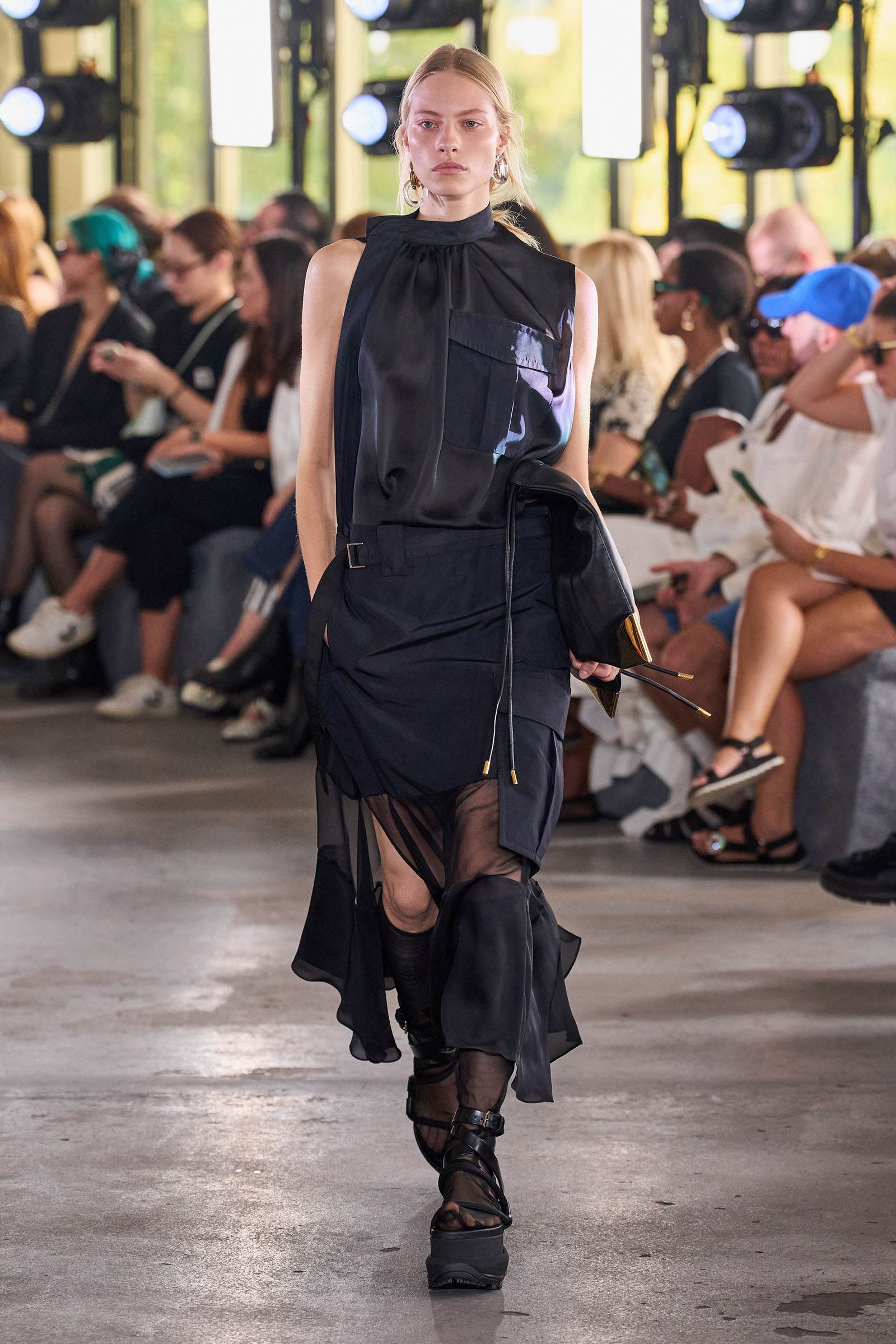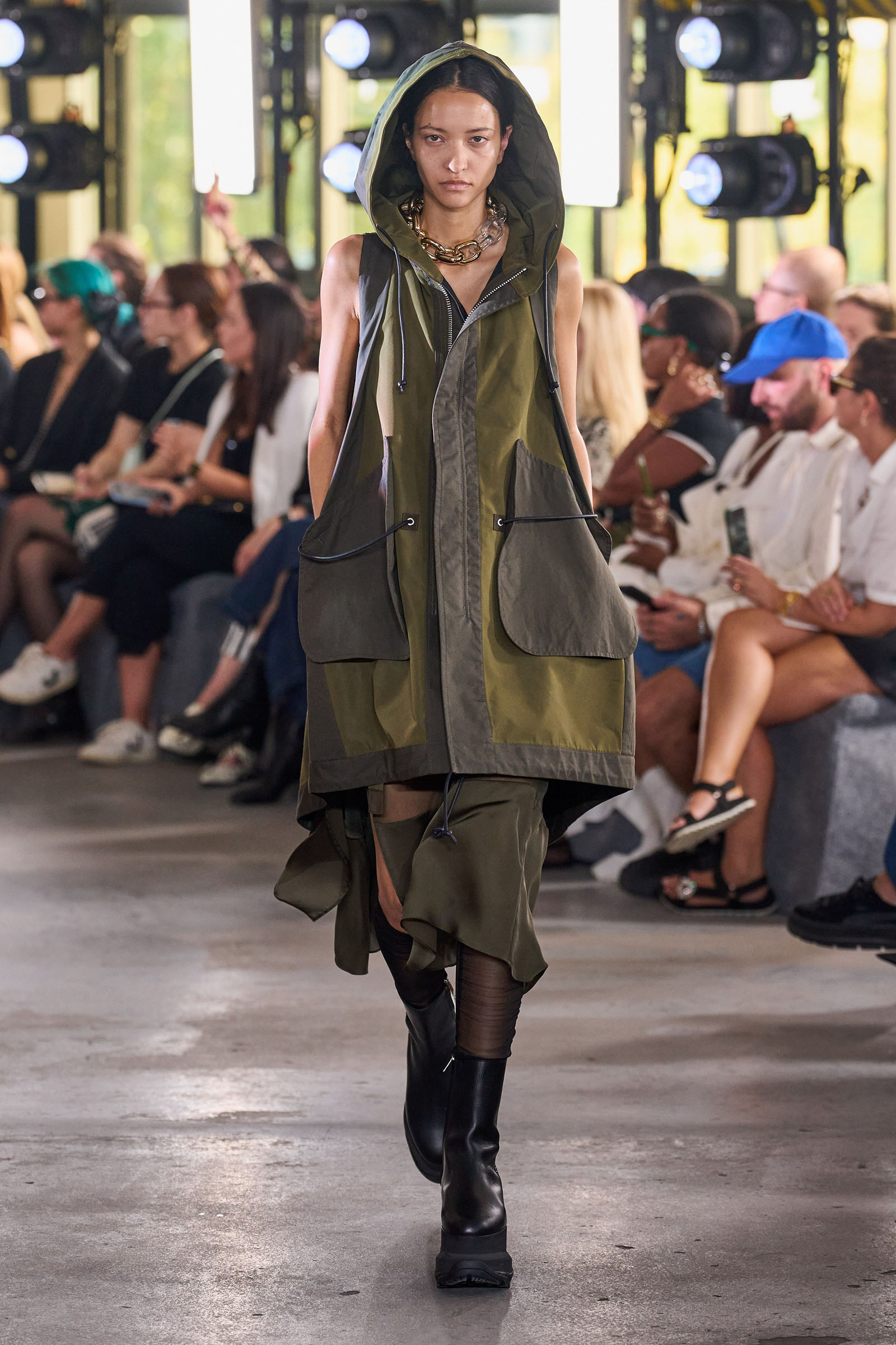 “The more simple we are, the more complete we become.” Has Sacai’s Chitose Abe been normal-pilled too, like many of her designer peers? After 15 years of hybrids, she played it straighter than usual this season, or at least as straight as a slouched-on jacket with slashes for pockets where skin peeks out can be.