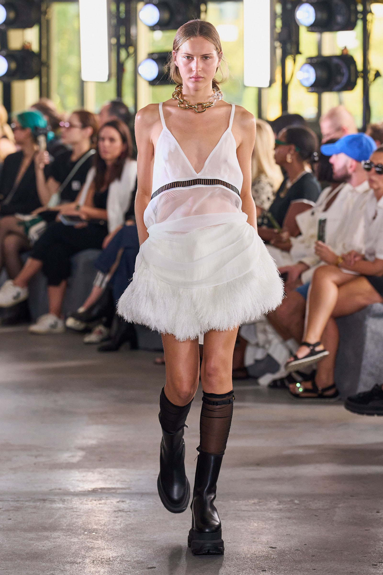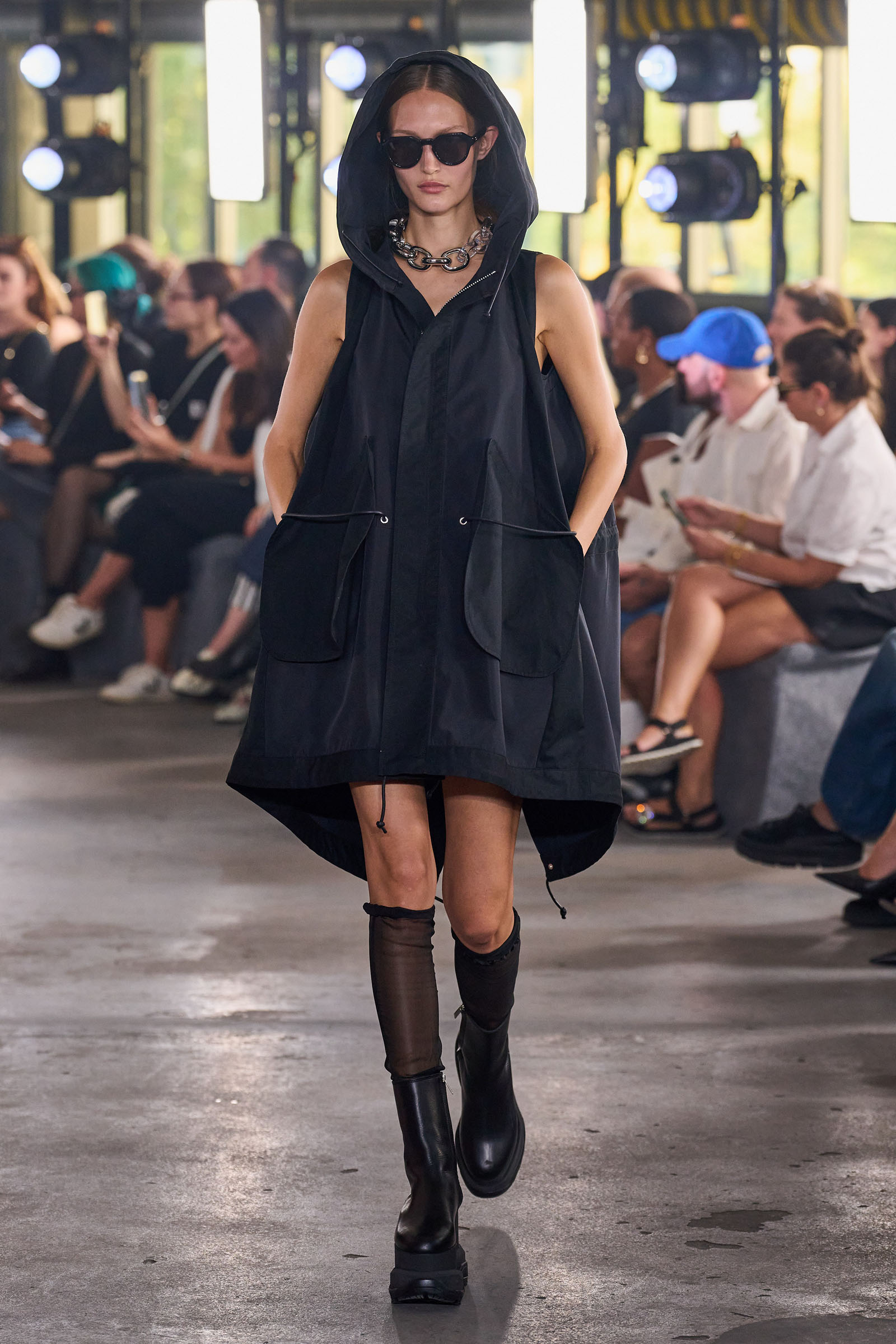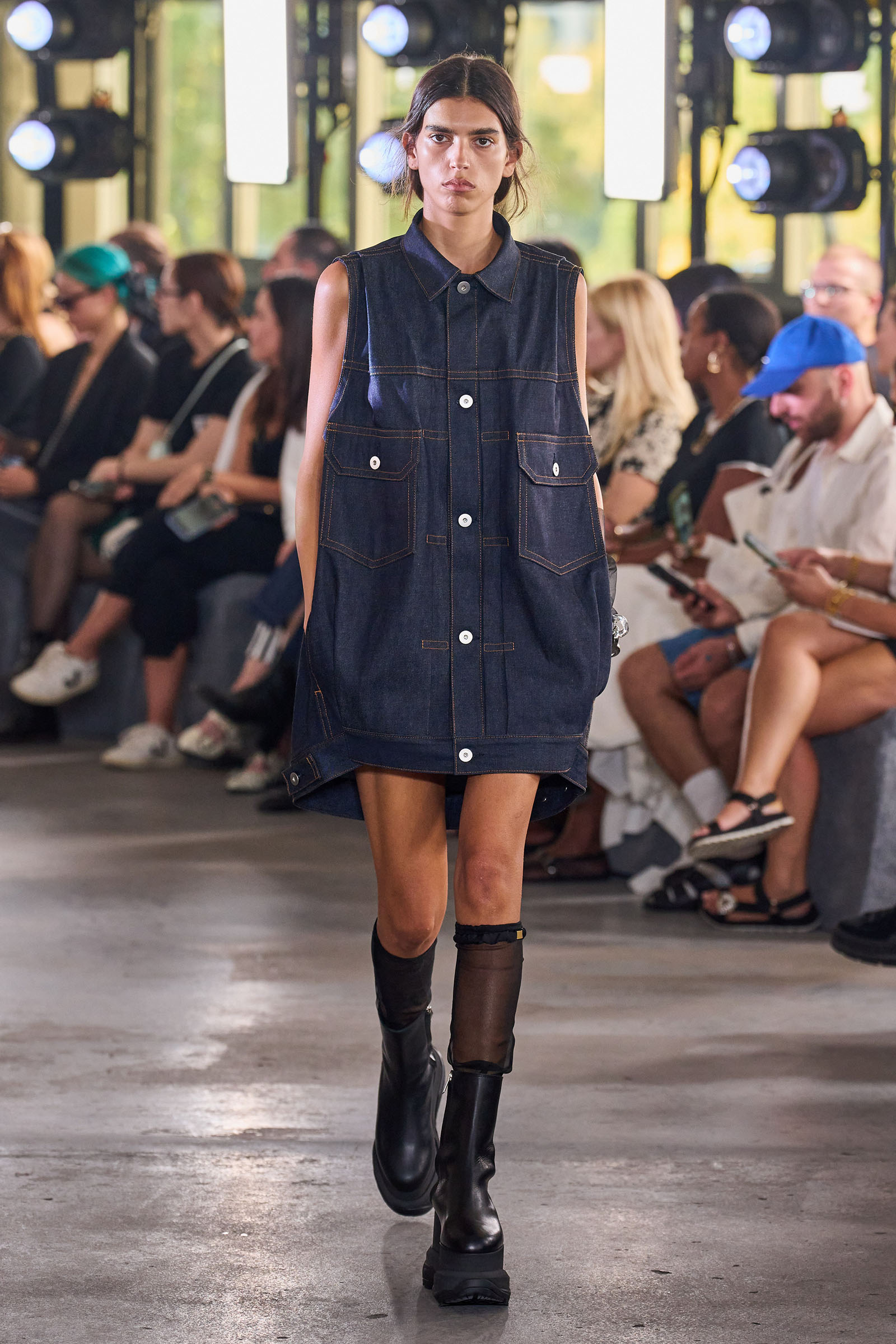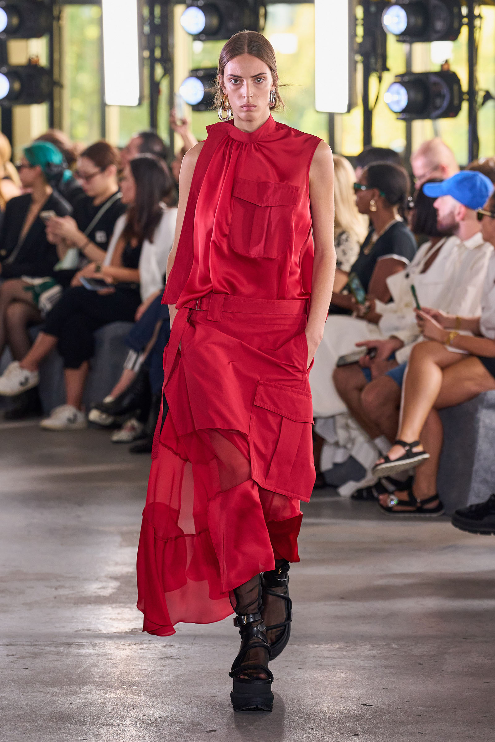 “The more simple we are, the more complete we become.” Has Sacai’s Chitose Abe been normal-pilled too, like many of her designer peers? After 15 years of hybrids, she played it straighter than usual this season, or at least as straight as a slouched-on jacket with slashes for pockets where skin peeks out can be.