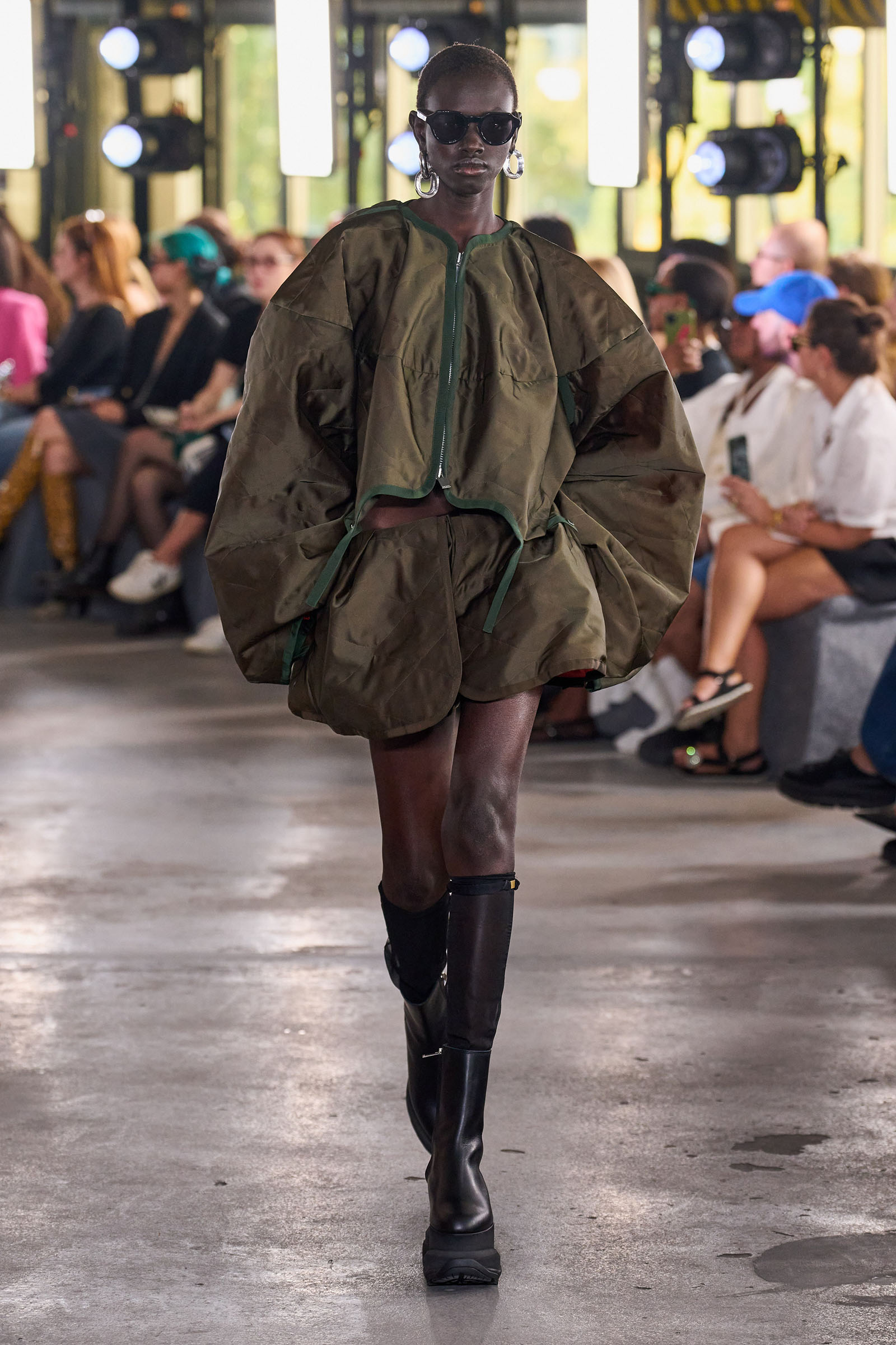 Pillowy volumes were her chief preoccupation. Jacket and shirt sleeves were sewn with arching seams, creating a side-to-side silhouette that’s almost circular, and the bodies of the pieces were bisected by another seam that produced their round shape front-to-back. The way they were constructed gave them undulating hems, sometimes exposing a flash of midriff. As generous as the clothes look in these pictures, typically there was even more volume at the rear of garments. A trench and shirtdress had watteau backs.