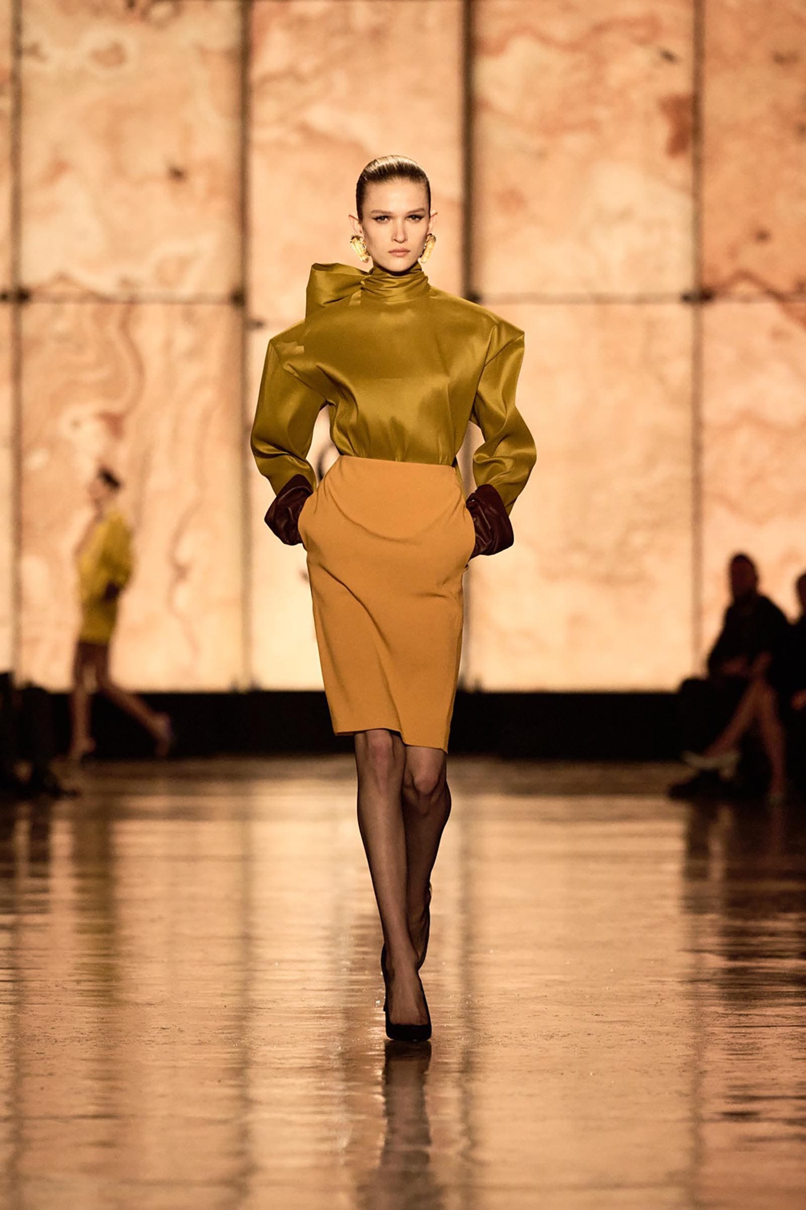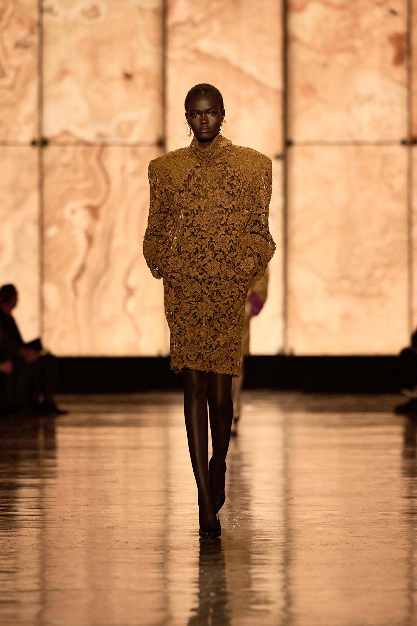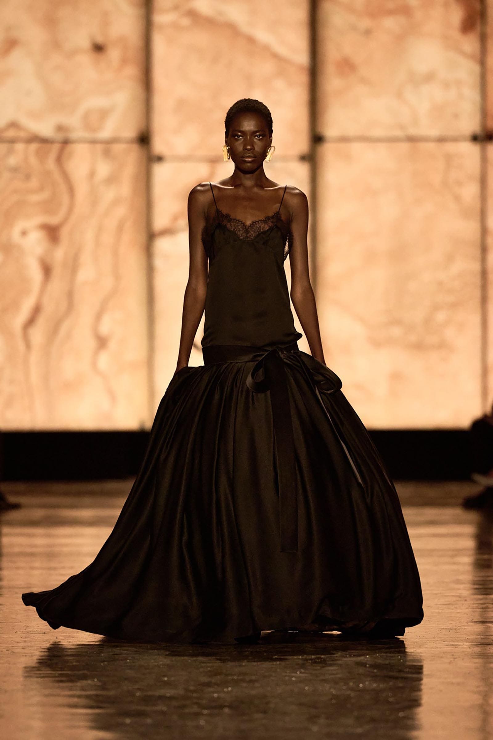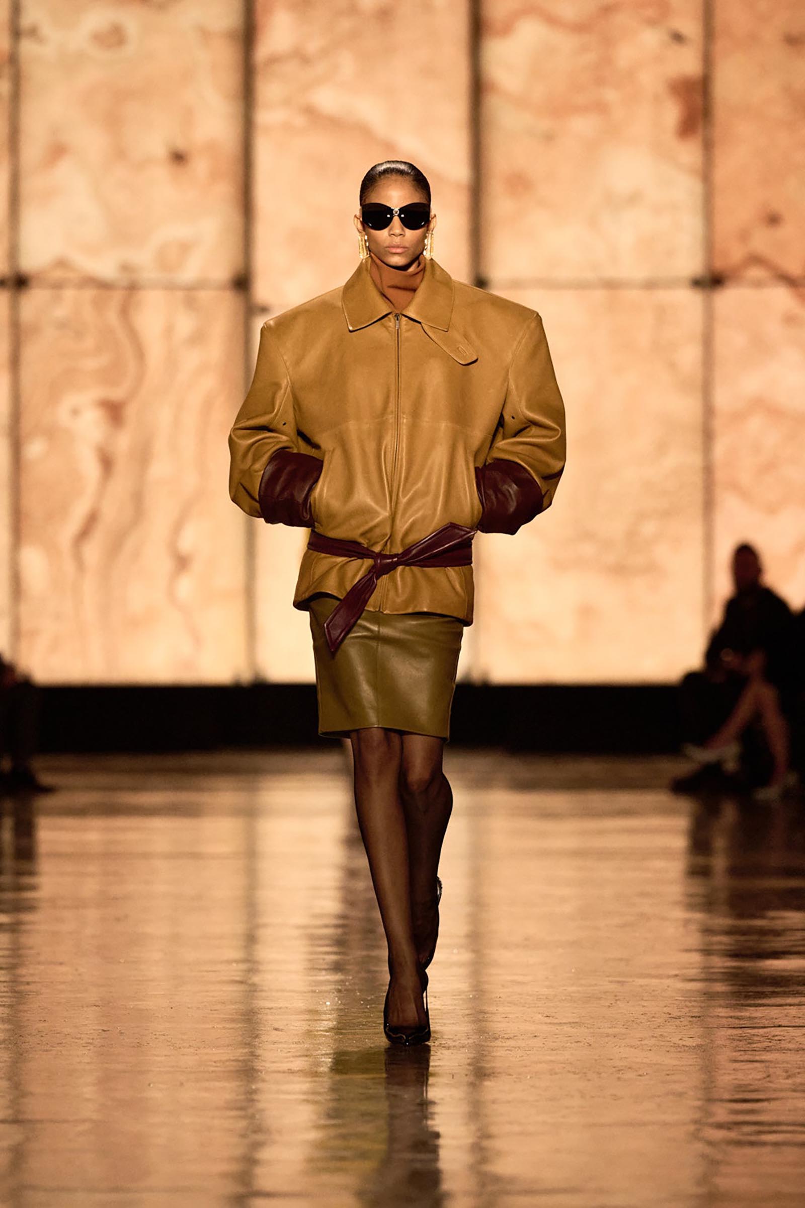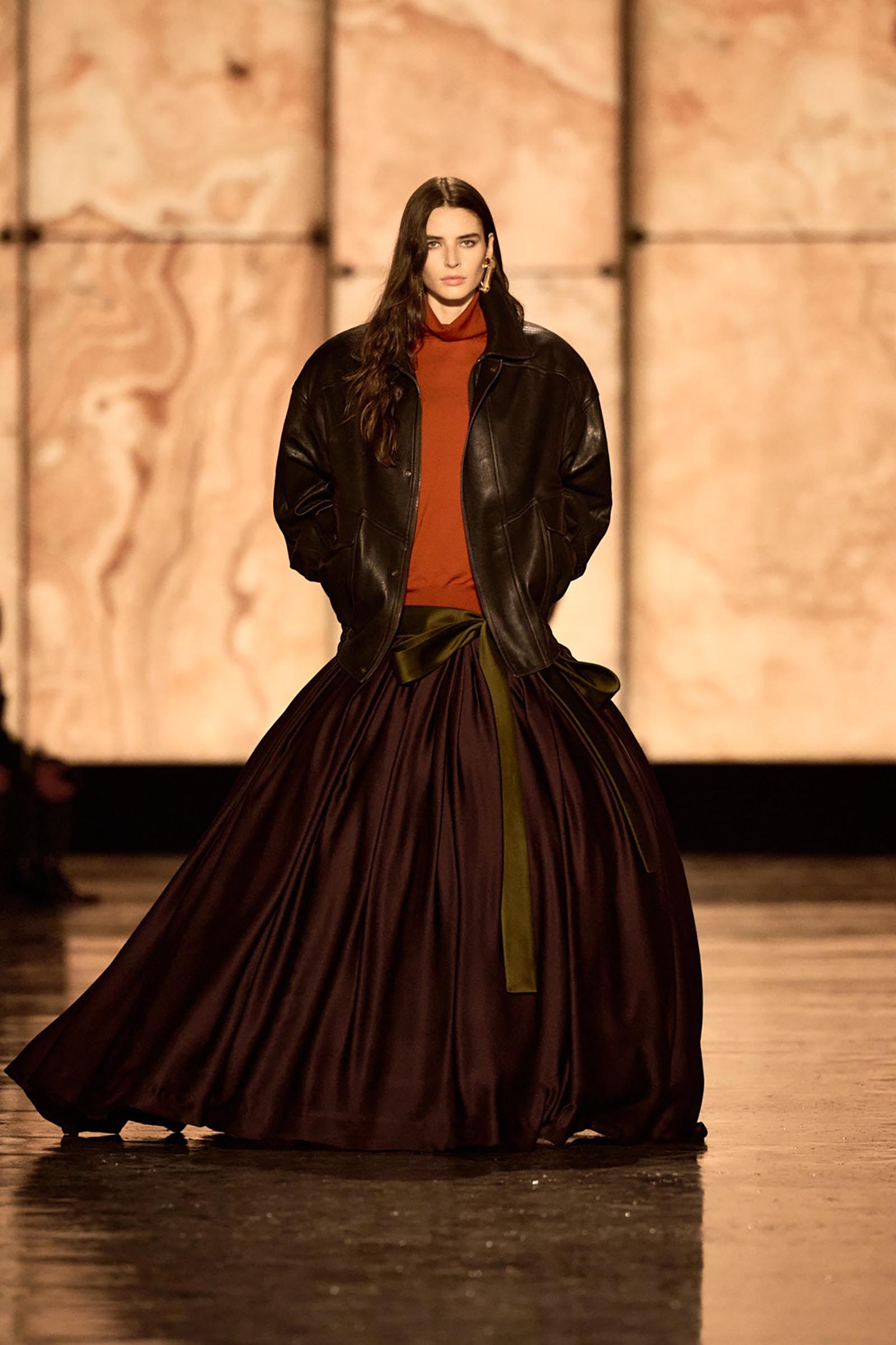 For evening, everything got reversed: nine floor-sweeping voluminous ball skirts, variously partnered with silk and lace camisoles or leather aviator jackets, with Vaccarello mixing up the house standard black in the most original manner with earthy tones of tan and brown. Accessories wise, there were epic leather gauntlets, dark shades, gleaming slingbacks with a curved talon of a heel, and gold sculpted earrings. What there wasn’t: A single bag. Let others do the merch walk. All that product placement; not so chic, huh?