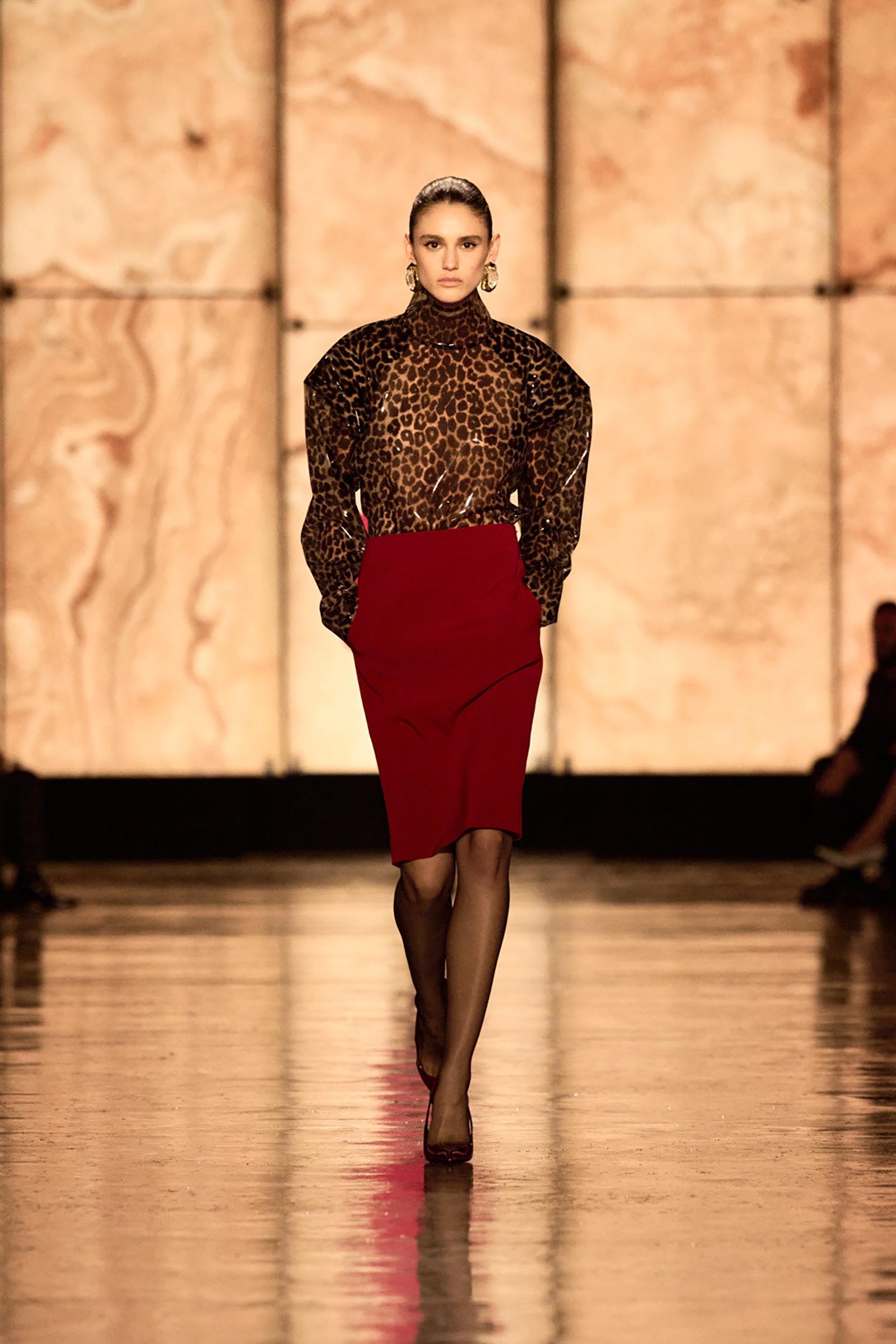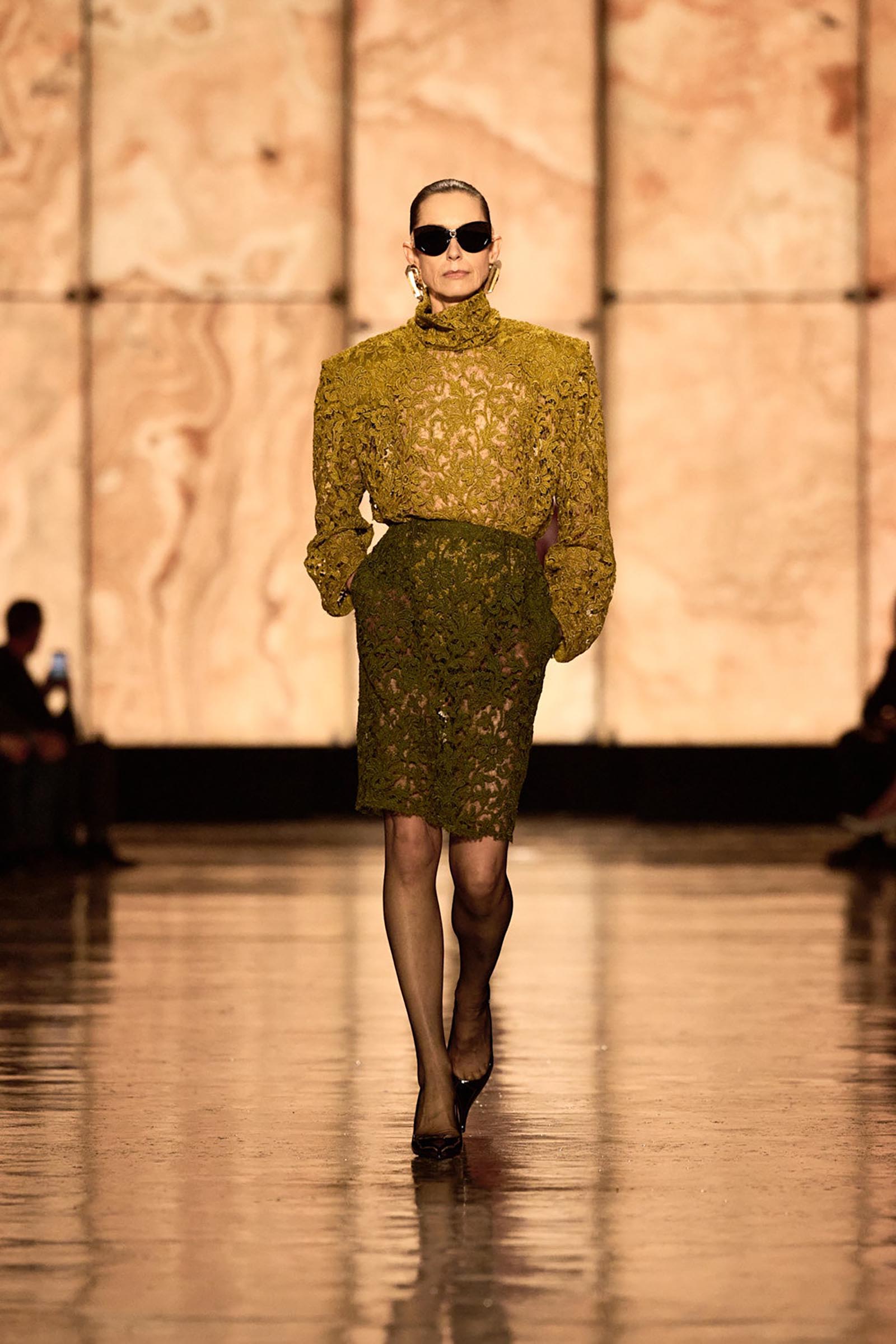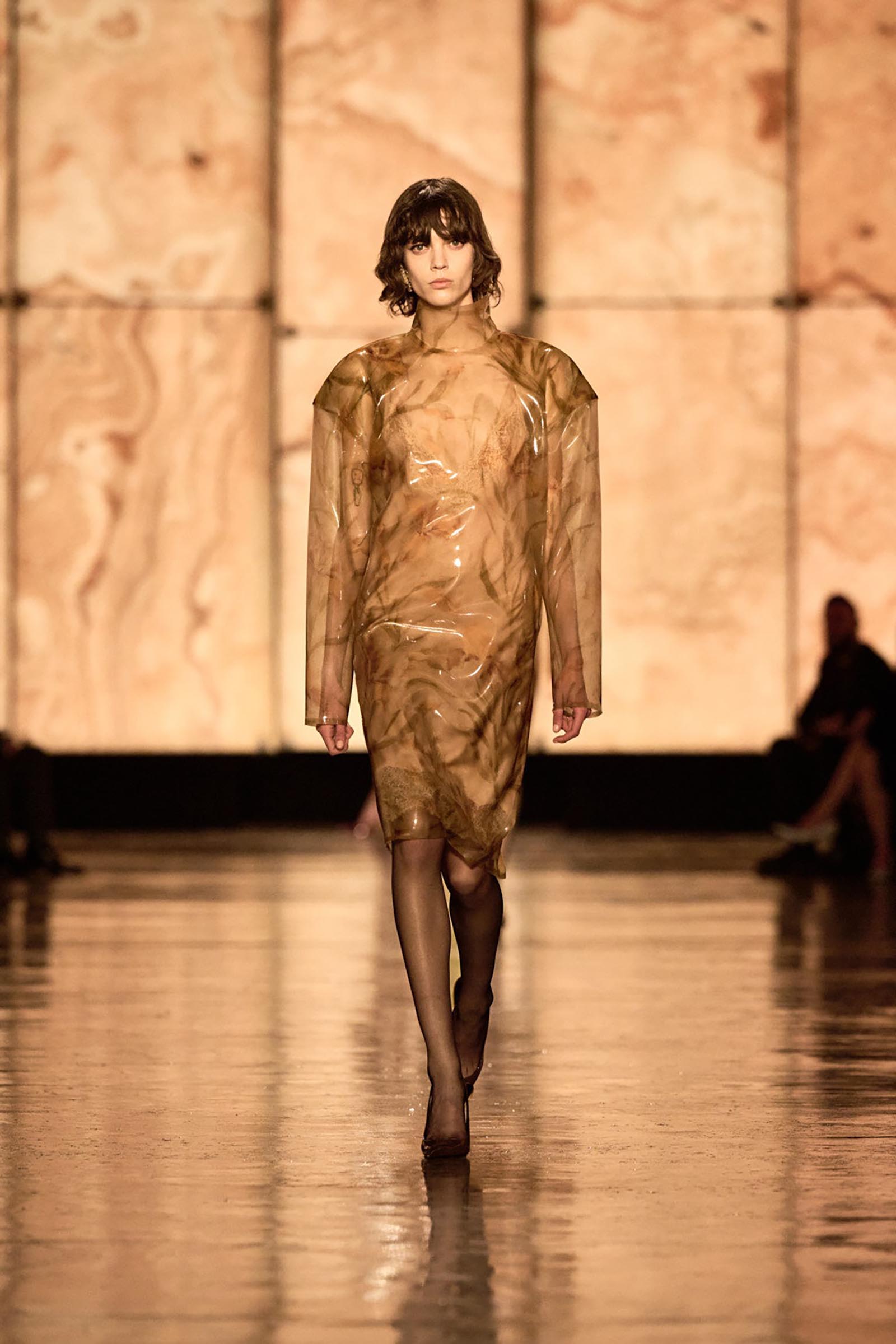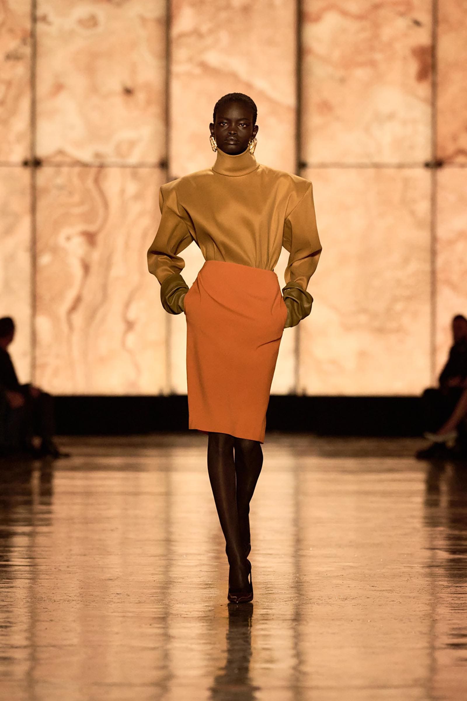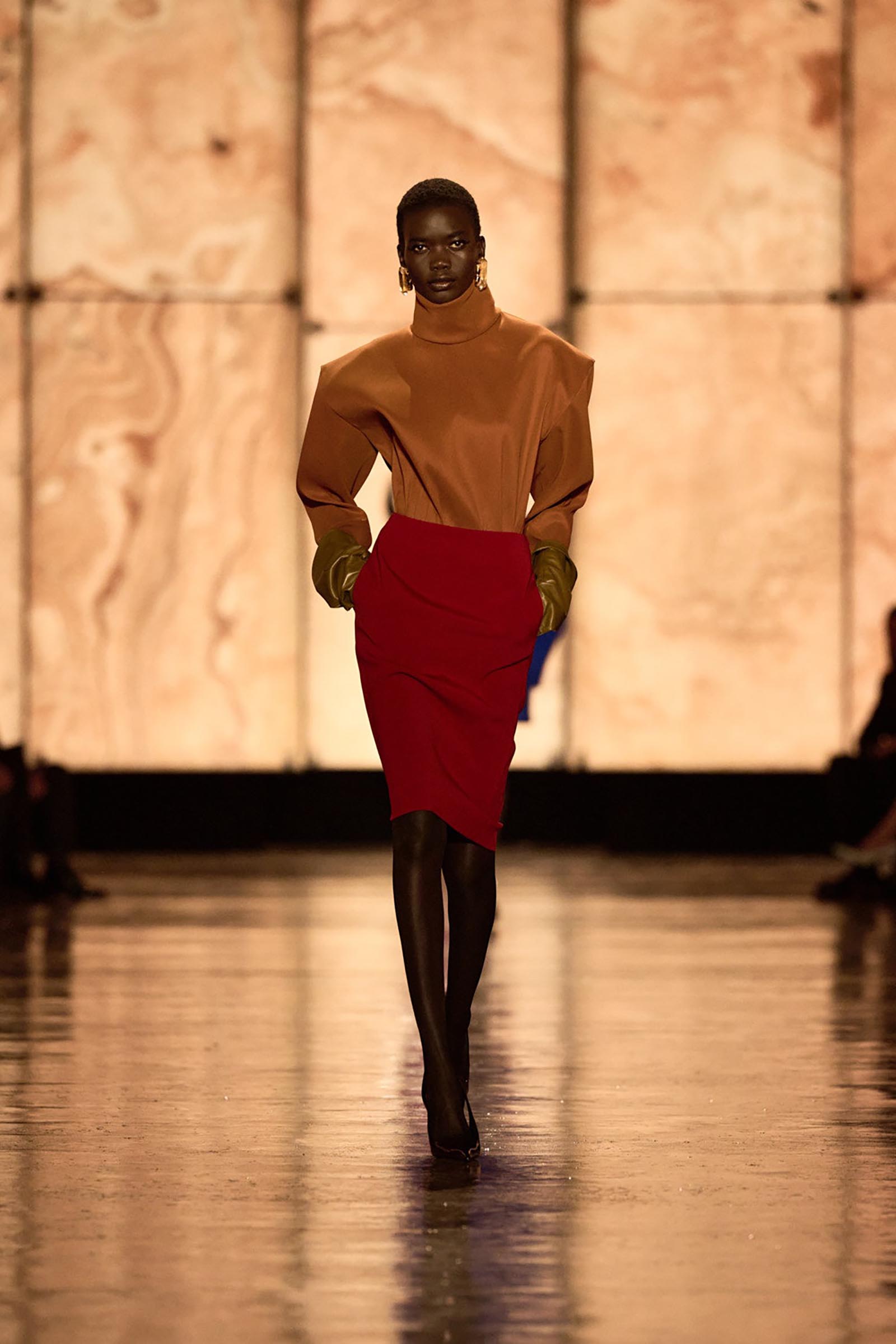 For evening, everything got reversed: nine floor-sweeping voluminous ball skirts, variously partnered with silk and lace camisoles or leather aviator jackets, with Vaccarello mixing up the house standard black in the most original manner with earthy tones of tan and brown. Accessories wise, there were epic leather gauntlets, dark shades, gleaming slingbacks with a curved talon of a heel, and gold sculpted earrings. What there wasn’t: A single bag. Let others do the merch walk. All that product placement; not so chic, huh?