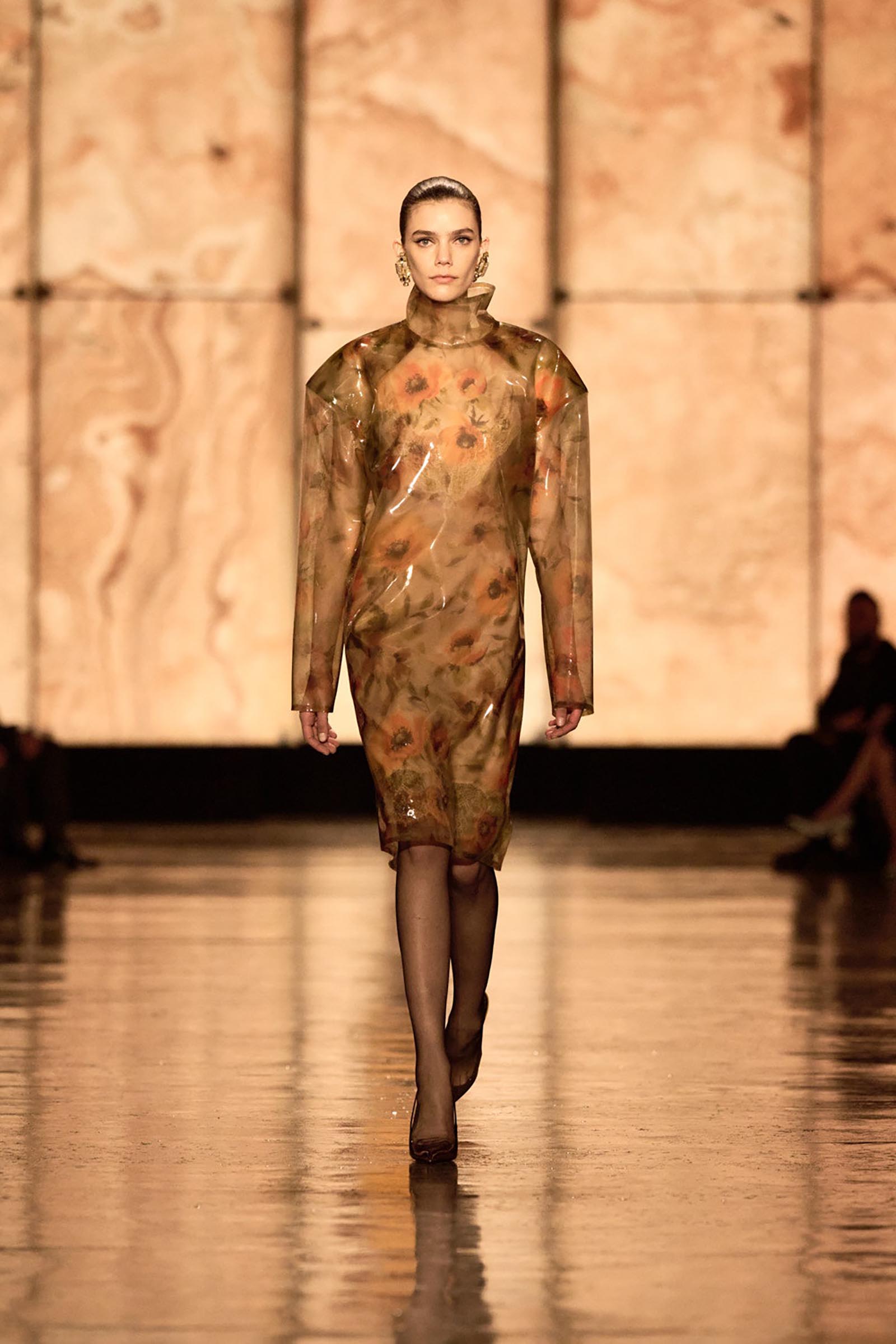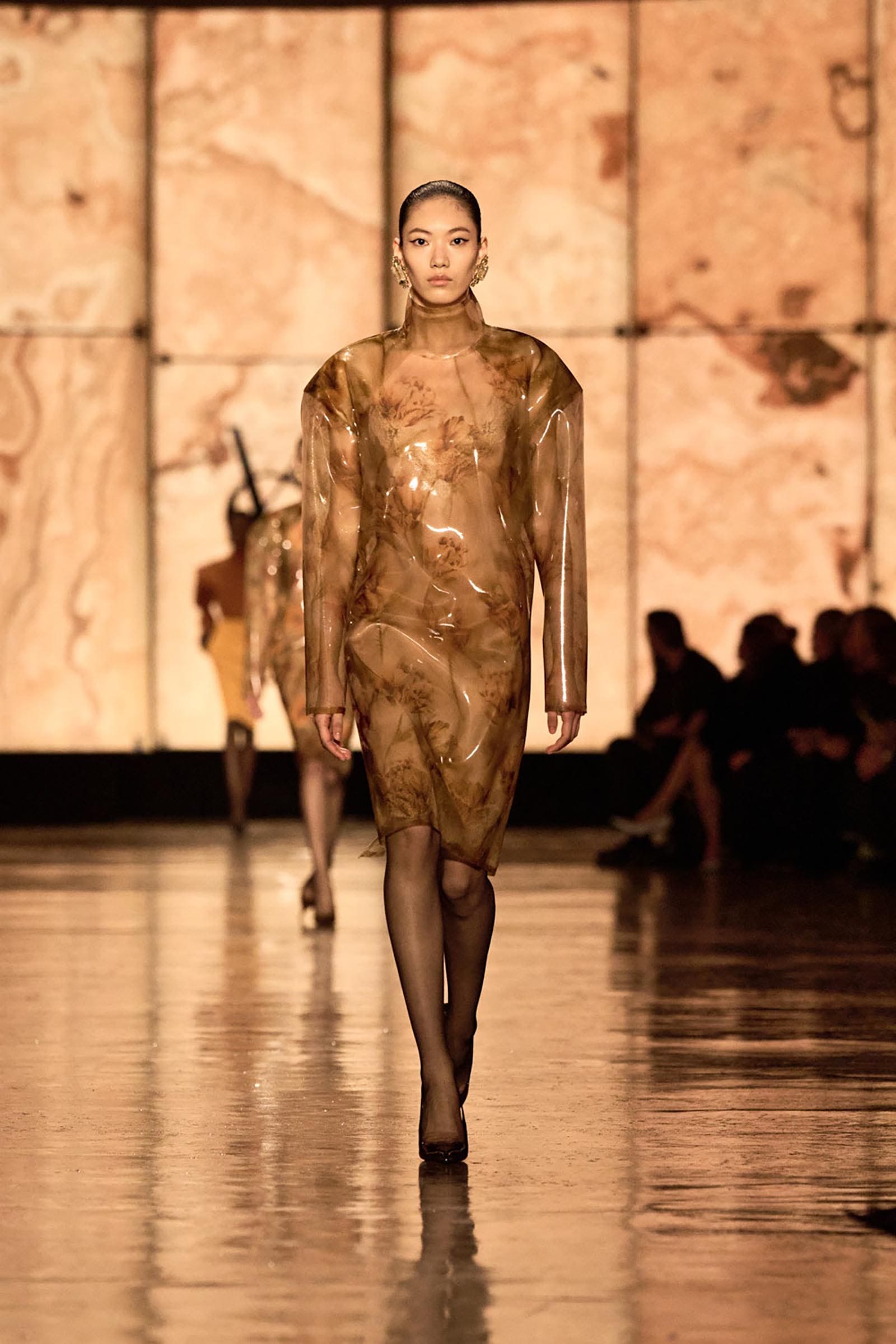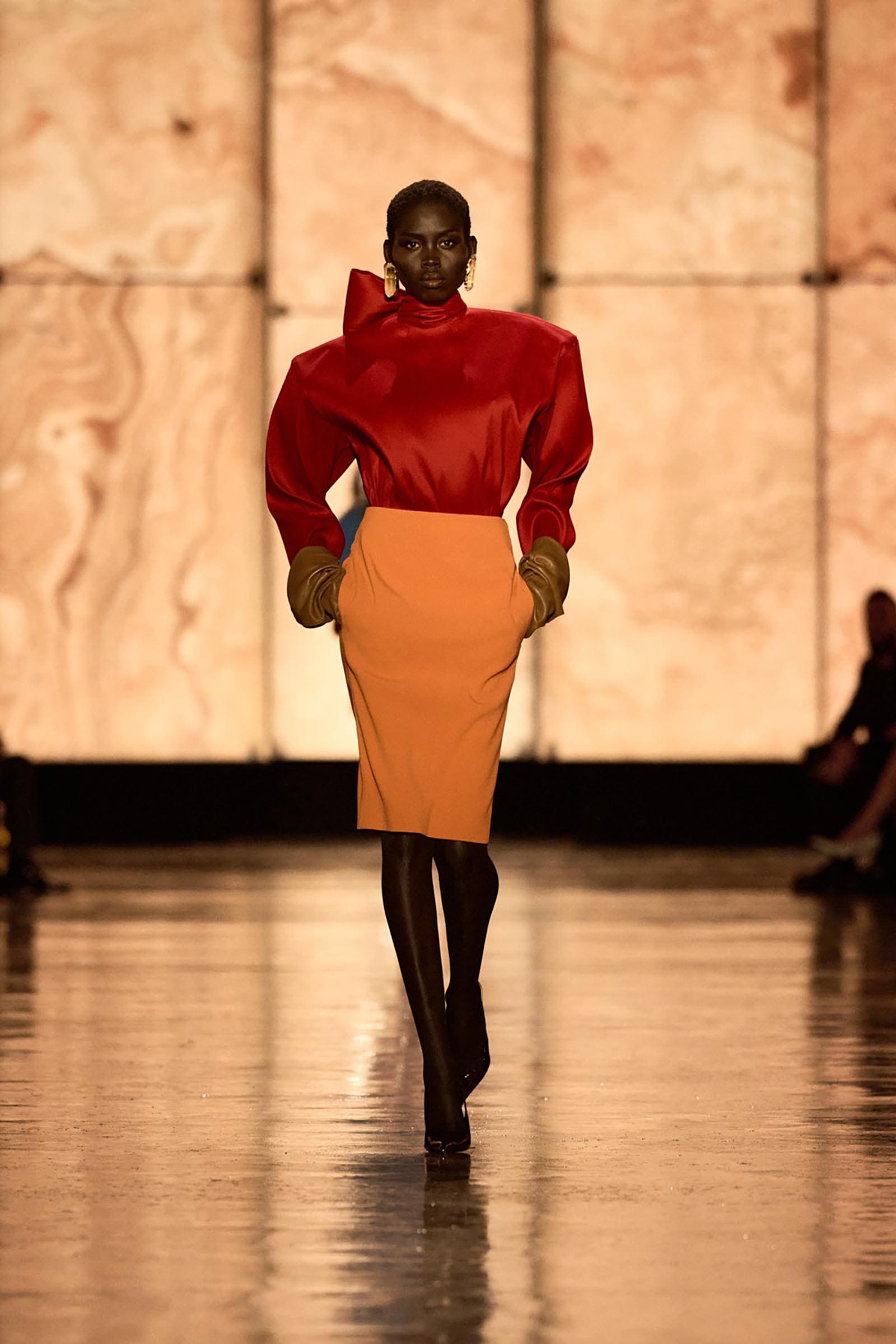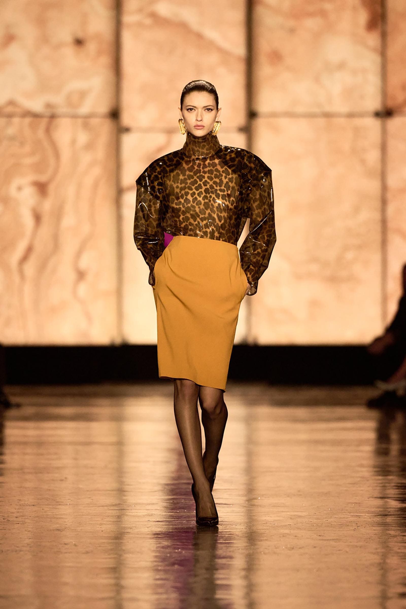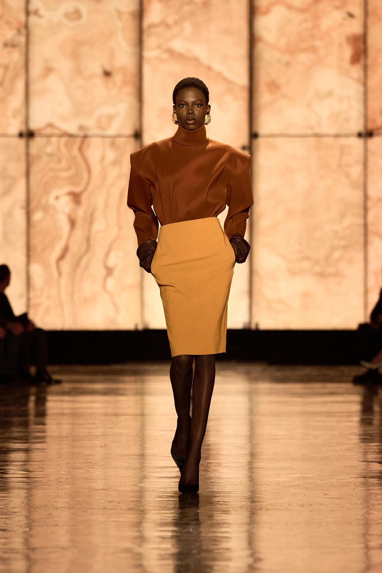 For evening, everything got reversed: nine floor-sweeping voluminous ball skirts, variously partnered with silk and lace camisoles or leather aviator jackets, with Vaccarello mixing up the house standard black in the most original manner with earthy tones of tan and brown. Accessories wise, there were epic leather gauntlets, dark shades, gleaming slingbacks with a curved talon of a heel, and gold sculpted earrings. What there wasn’t: A single bag. Let others do the merch walk. All that product placement; not so chic, huh?