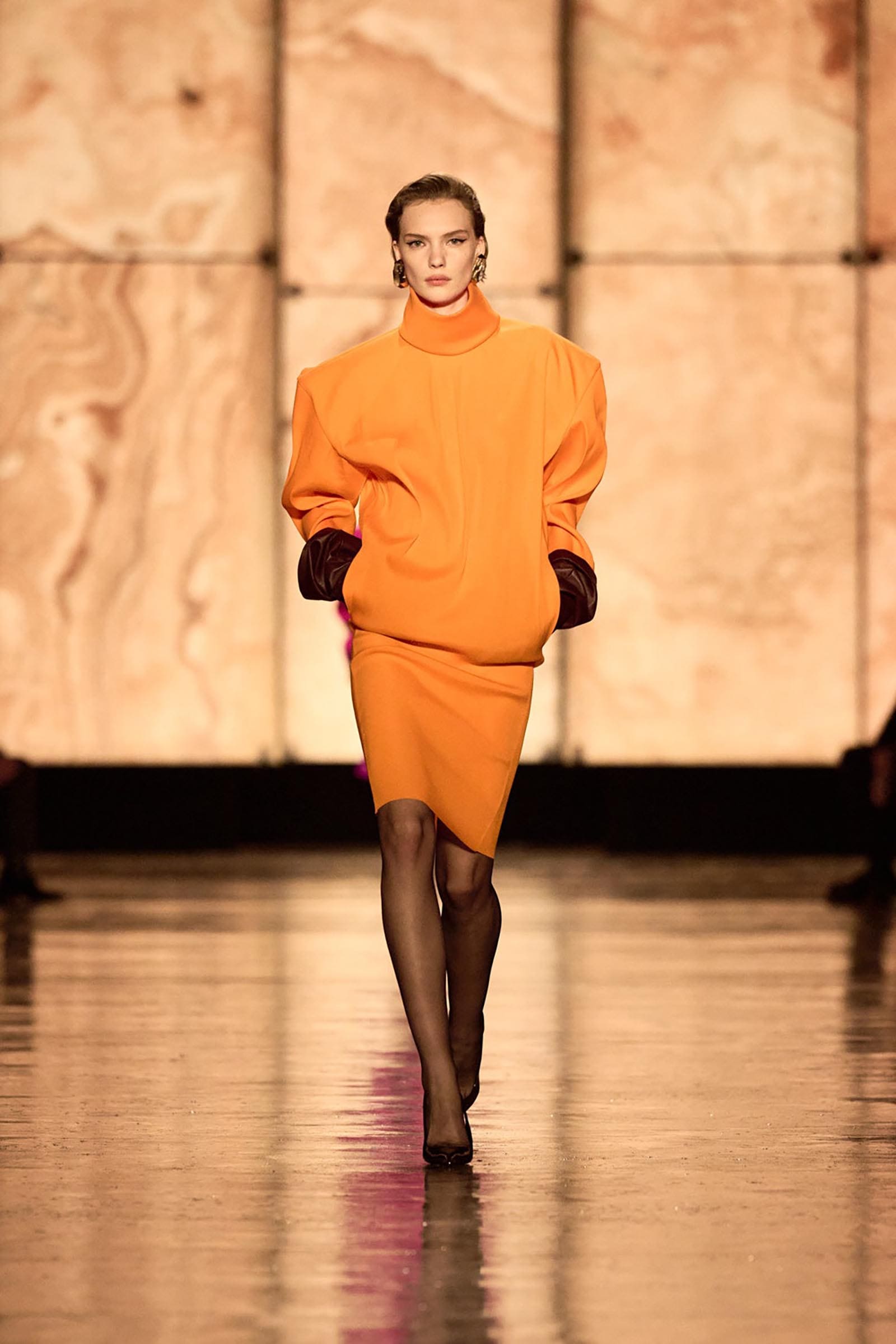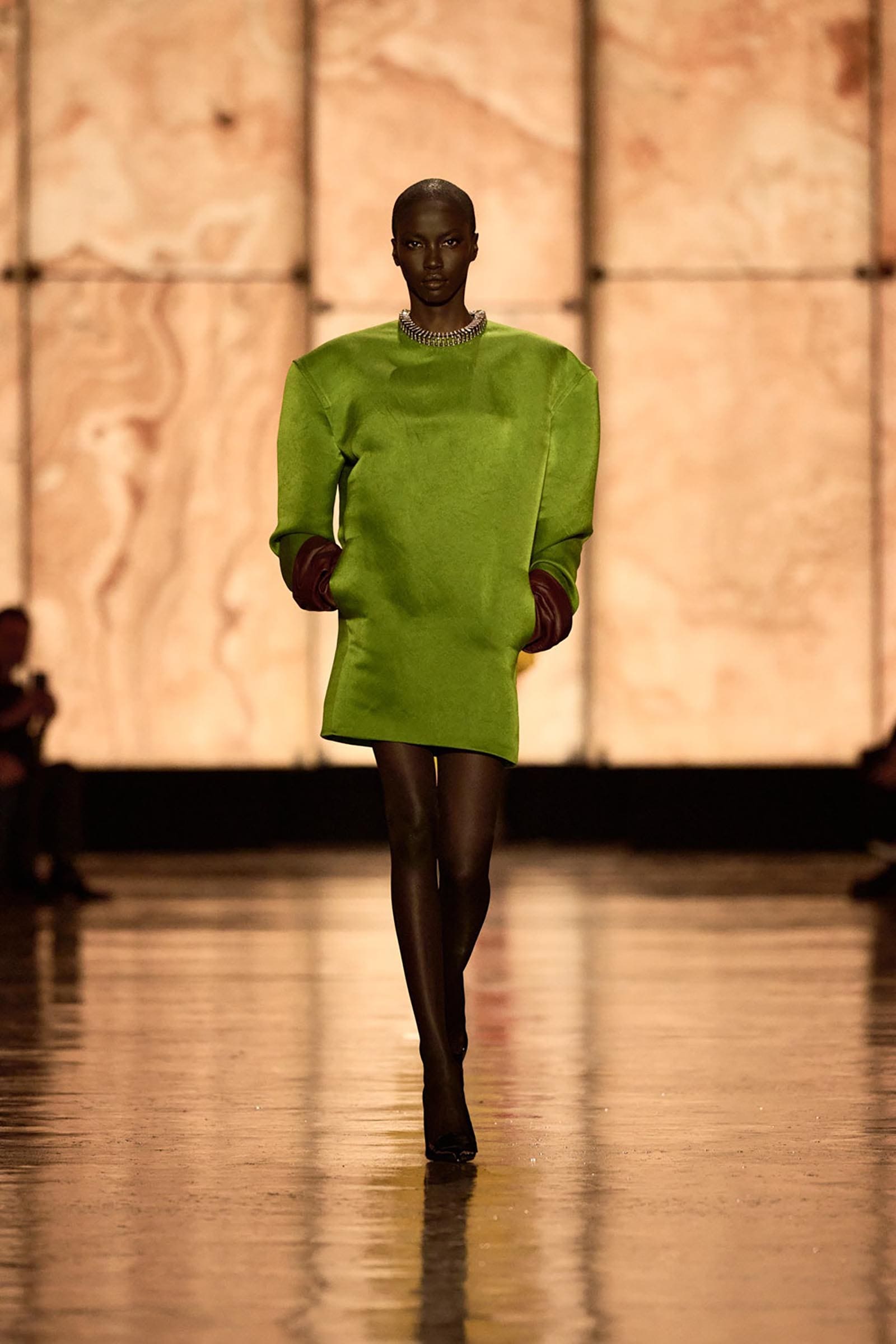 Except, of course, us journalists are backstage before the show begins, quizzing Vaccarello what was on his mind this season, and he’s gamely and good humoredly verbalizing what he was thinking. “I wanted something clean, with no ornamentation, no decoration, no… nothing,” he said. “To just push the silhouette in these saturated colors—it’s the most color I have ever done—in washed satin, and technical jersey, which I have never used before, for a sense of stretch. I really liked this idea of elasticity, of movement—all to give a sense of freedom. There’s really no structure; the volumes come from the shape of the clothes and the fabrics—and everything is light.”