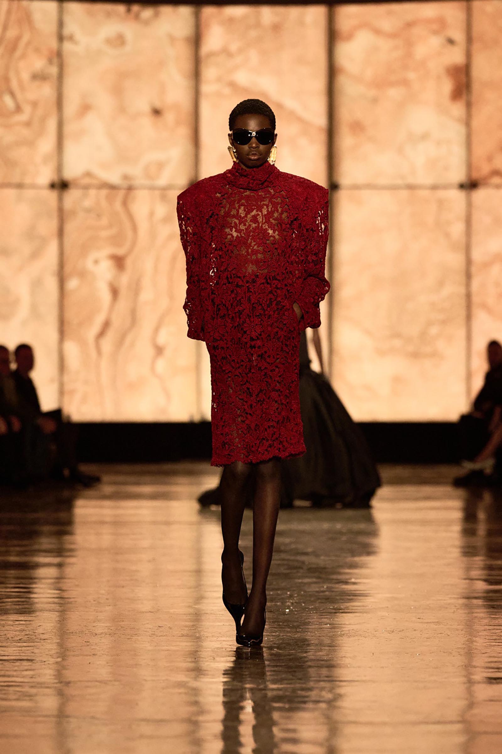Vaccarello was referencing Saint Laurent’s ’90s haute couture collections, a favorite period of his in part because the fashion world was by that point proclaiming that YSL was terribly demode, and that offers the perfect opportunity for reevaluation. Vaccarello’s silhouette started boldly at the shoulder and tapered towards the hem—an inverted triangle—for his vividly hued high collared coats denuded of visible fastenings, gently sash belted at the hip; mostly utterly unadorned sack dresses, save for the version in guipure lace; bow back blouses with narrow skirts (there was nary a pair of pants in sight); and, what has become as ubiquitously YSL for the house as the tux, thanks to Vaccarello, the leather blouson, all insouciant attitude with its bold shoulders and shrug-it-on swagger.