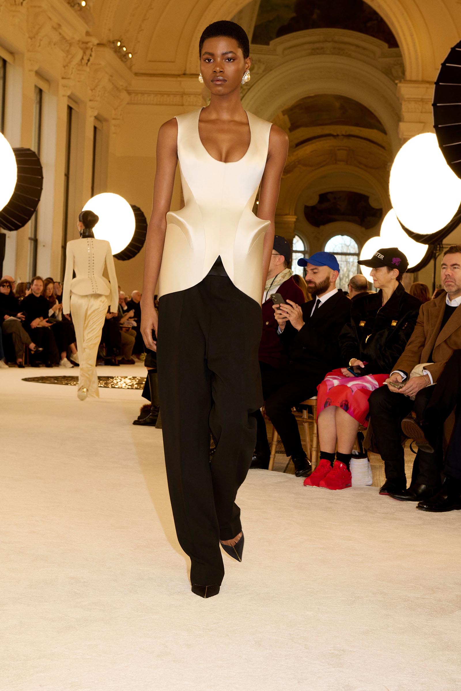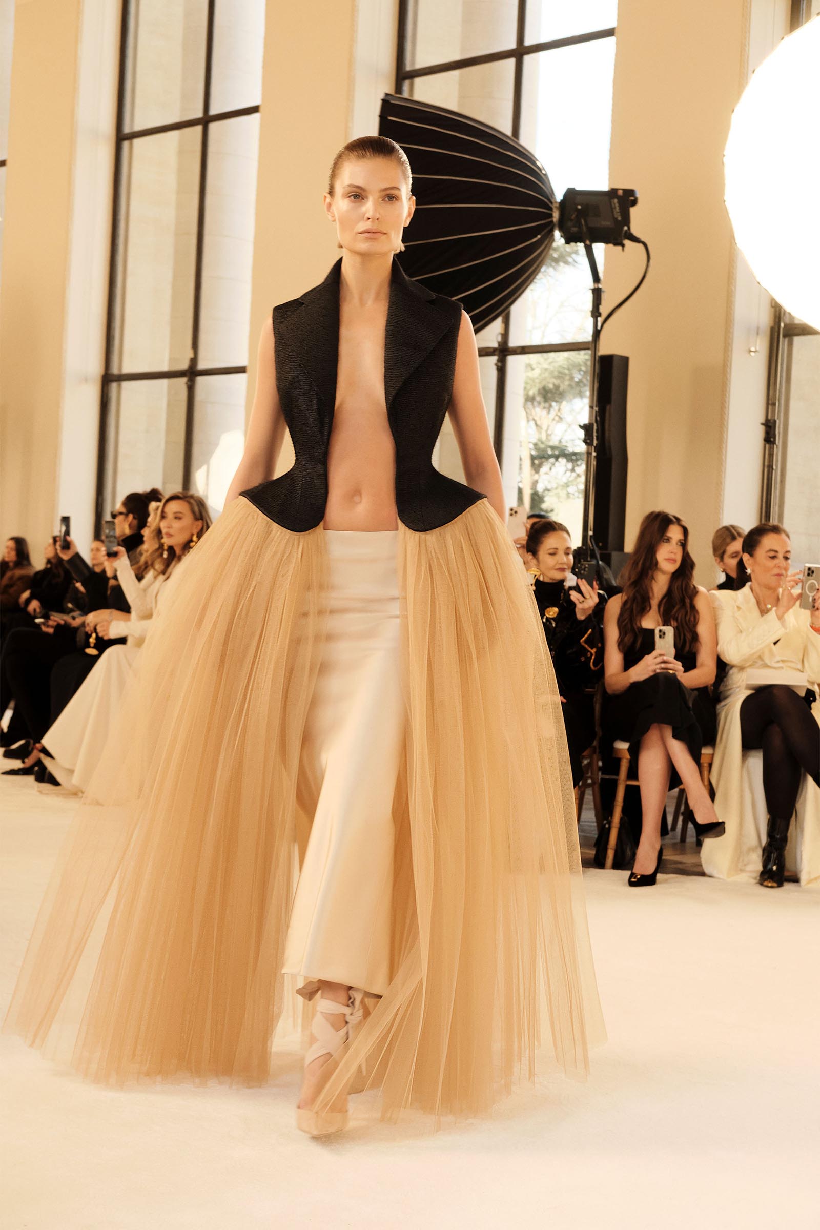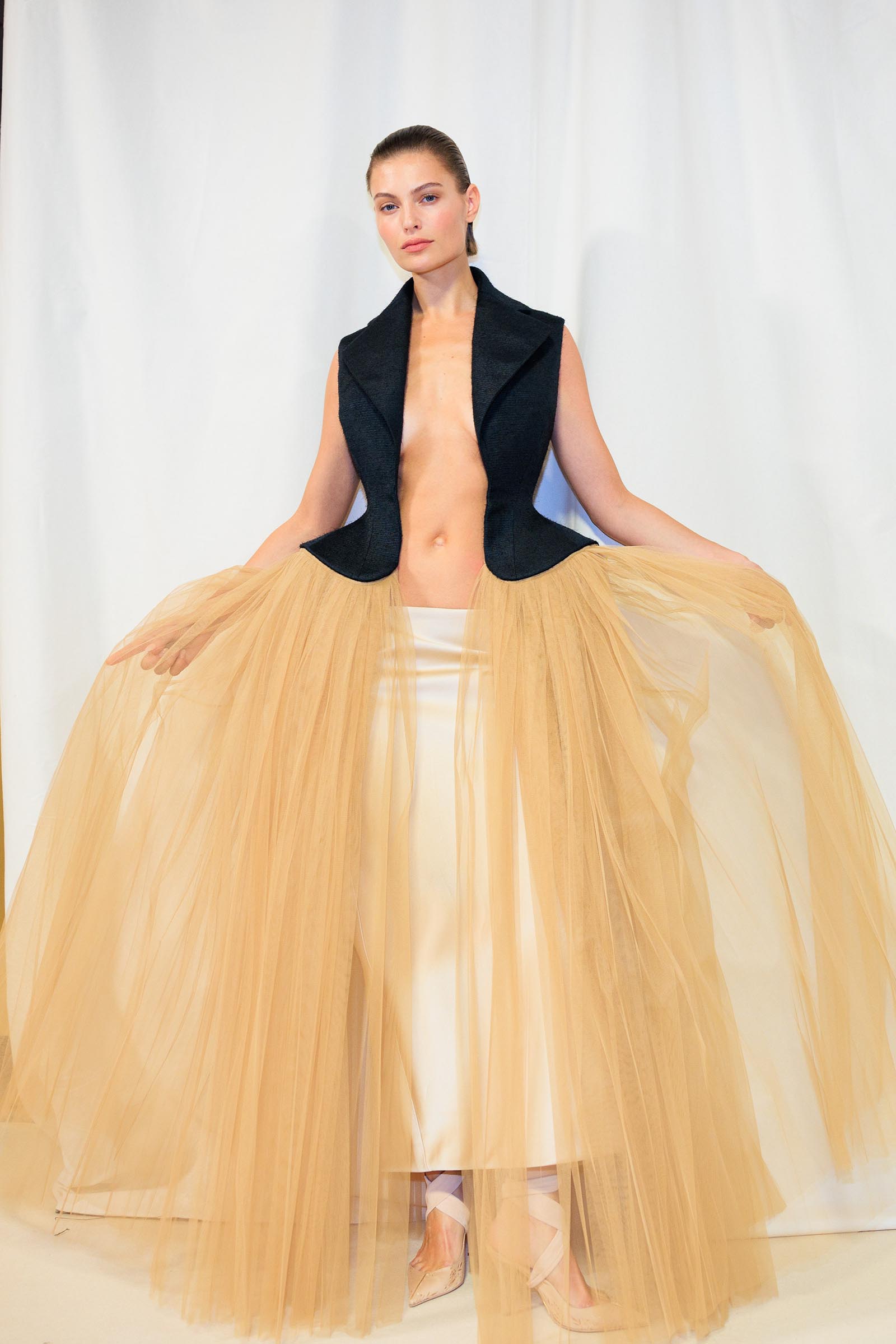 And disapprove of it or not, the engineering behind it was stupendous. At some points, the angled jutting of hips, planed off into arcs—as in a white bodice worn with black pants—looked like a futurist sculpture. There was invisible padding going on that shaped the hips of dresses into anatomically impossible half-domes. The sensational sharp-angled geometry of the corset under a draped tulle dress practically turned Maggie Mauger into half-woman, half– perfume bottle. When it came to Kendall Jenner, the lines of the boning that ran from bra level to thigh on her dress almost gave her the silhouette of an Art Deco landmark building.