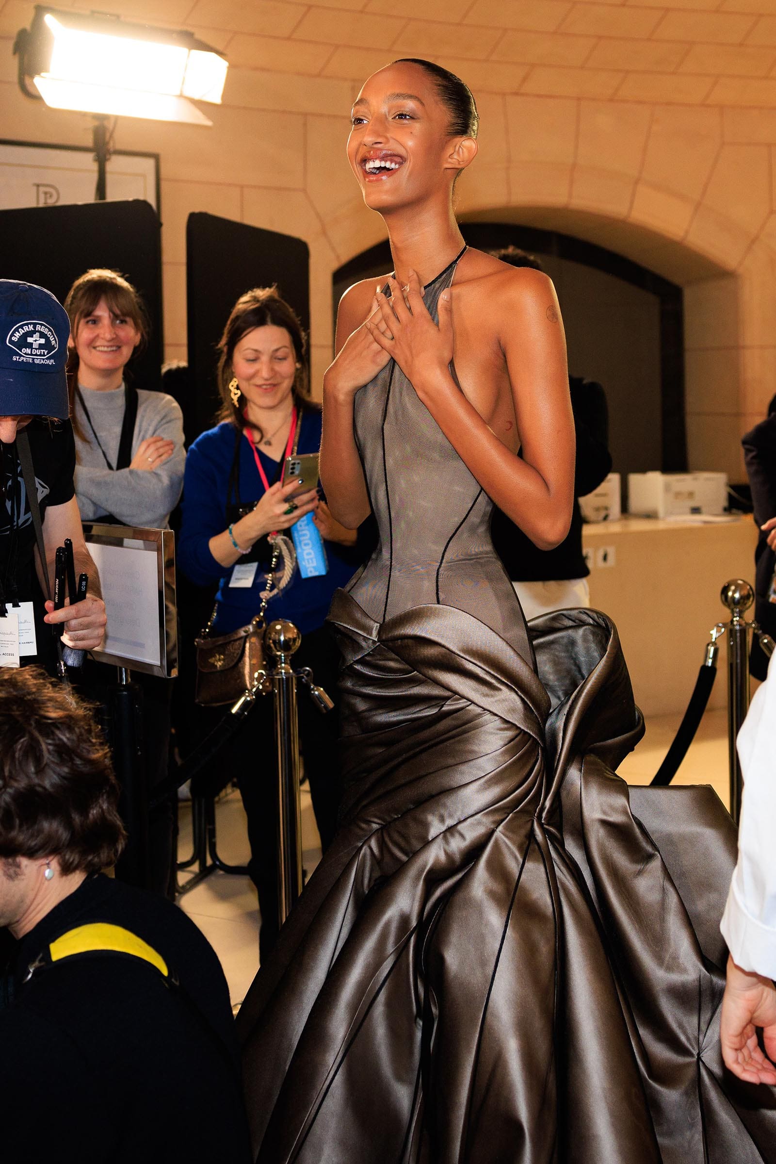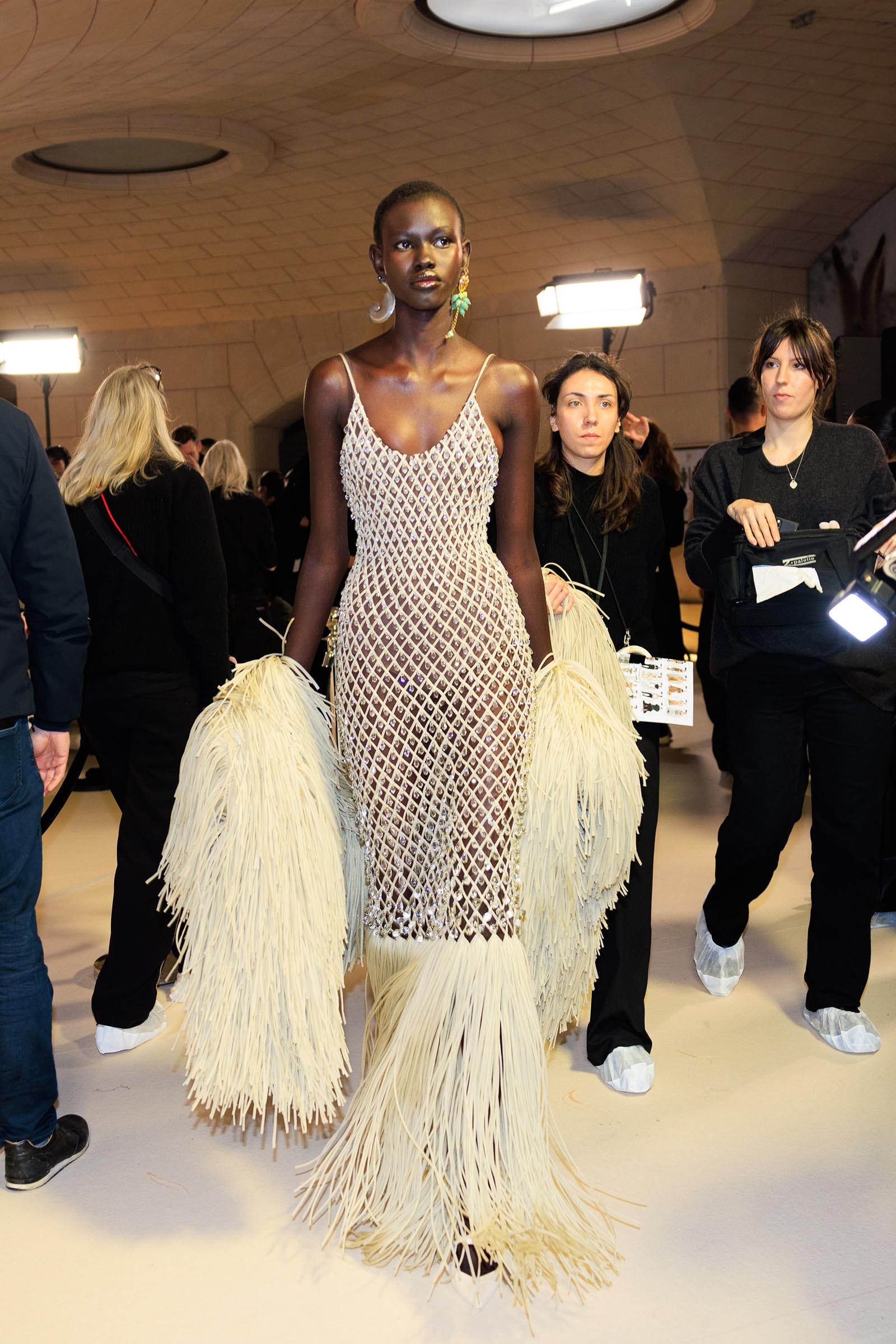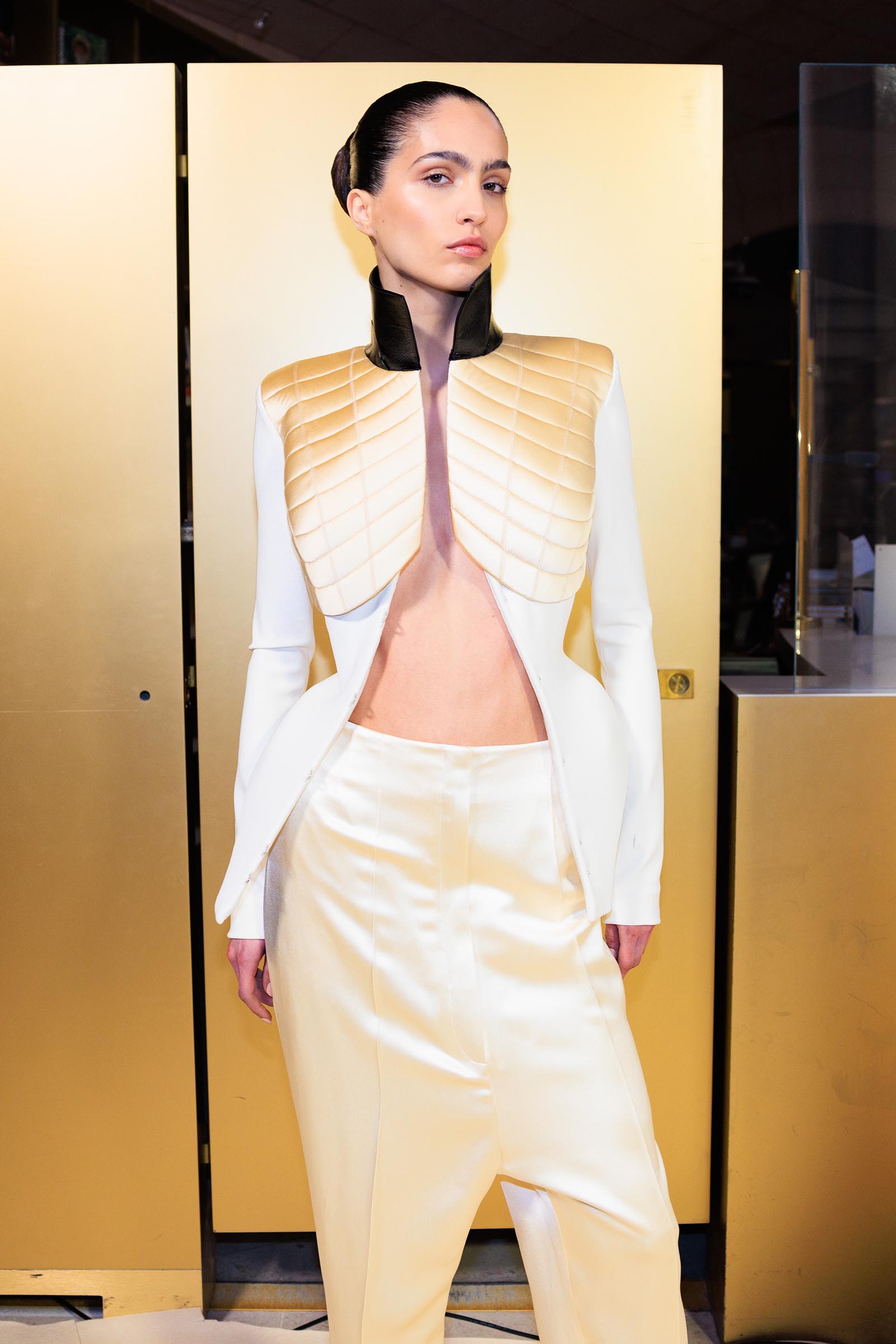 And disapprove of it or not, the engineering behind it was stupendous. At some points, the angled jutting of hips, planed off into arcs—as in a white bodice worn with black pants—looked like a futurist sculpture. There was invisible padding going on that shaped the hips of dresses into anatomically impossible half-domes. The sensational sharp-angled geometry of the corset under a draped tulle dress practically turned Maggie Mauger into half-woman, half– perfume bottle. When it came to Kendall Jenner, the lines of the boning that ran from bra level to thigh on her dress almost gave her the silhouette of an Art Deco landmark building.