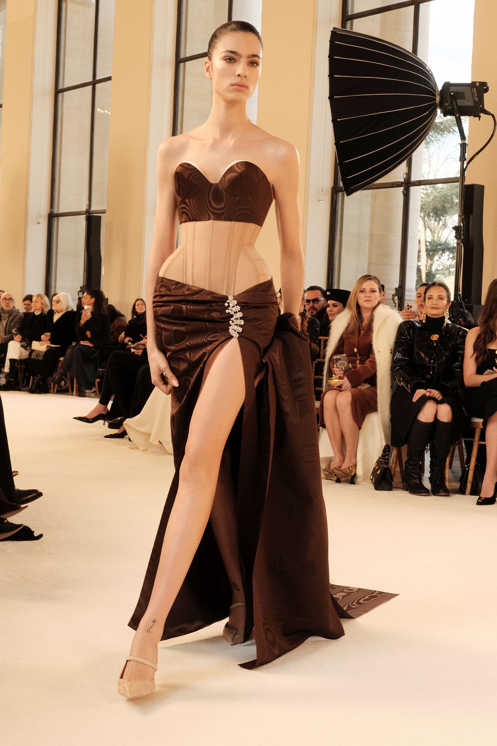 We haven’t mentioned the “antiquity” part of Roseberry’s inspiration yet. That came out of a box of early-20th-century Lyons couture ribbons he’d found. The last dress—another corseted one—was made from a length of brown moiré silk ribbon from that box. At another point in the show, there was a slim dress made from vertical tiers of ribbon, which shimmied and quivered as the model walked.