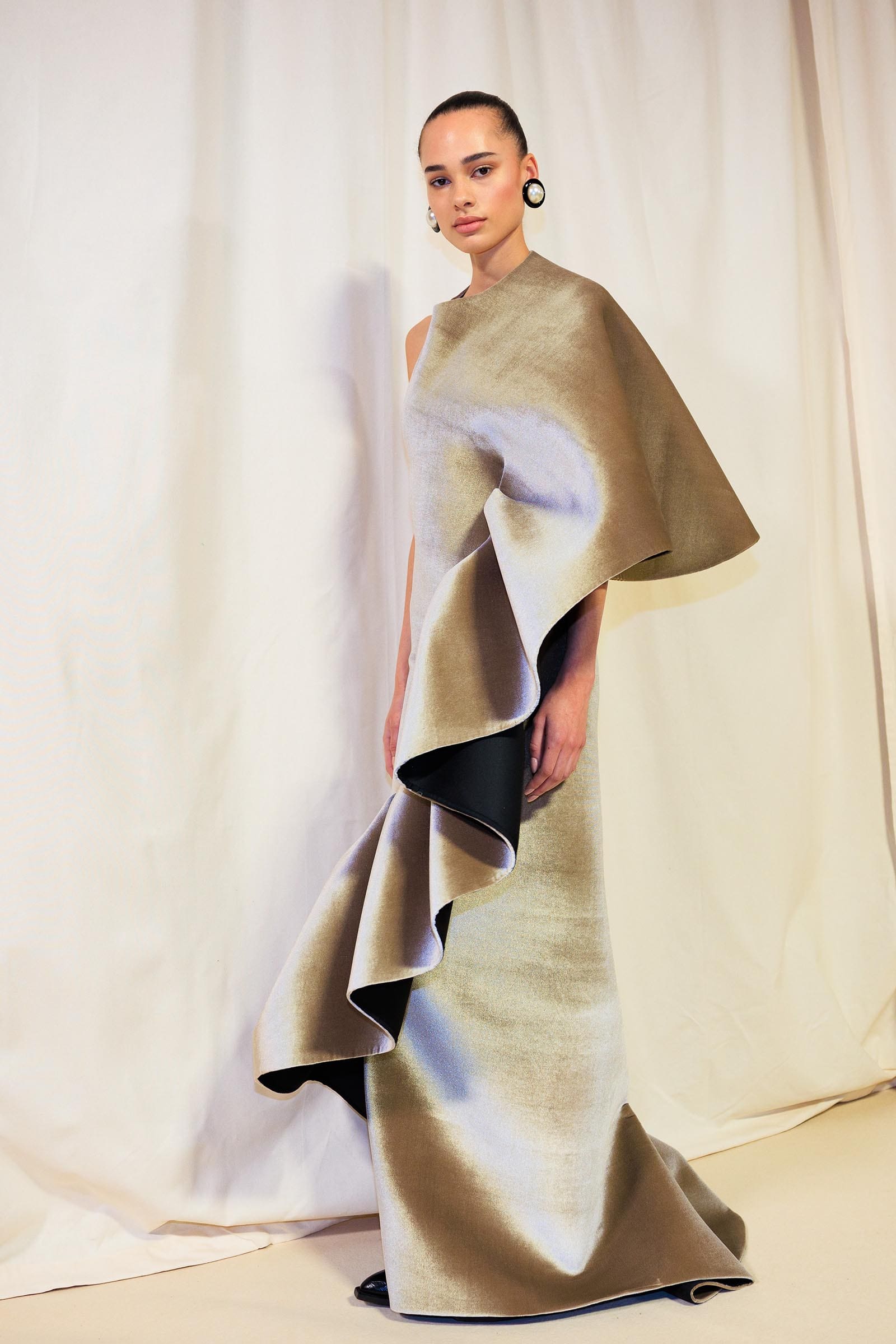 Under Roseberry, Schiaparelli has developed the ability to make clothes that have the smooth, seamless, undulating appearance of car bodies or airplane fuselages. It reached the I-can’t-believe-my-eyes level at the sight of a wavy 3D peplum on a strapless bustier; a one-shoulder velvet dress with a side that was all stiff, scrolled flounce; and especially on a cream cutaway tail jacket. Vestigially pleated over the breast like a Surrealist Schiaparelli rib cage, it had a rounded tail that jutted out almost like a piece of aeronautics engineering.