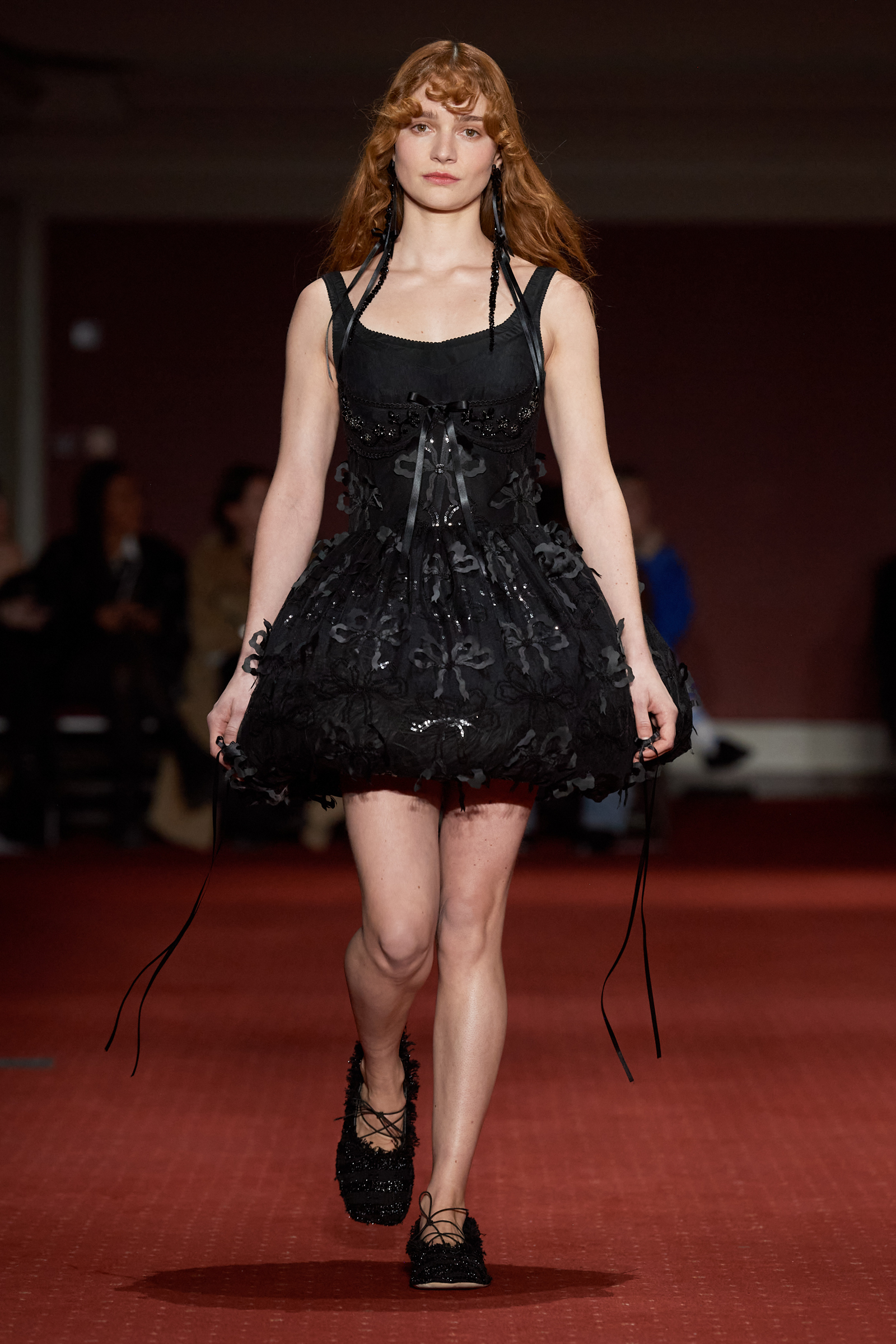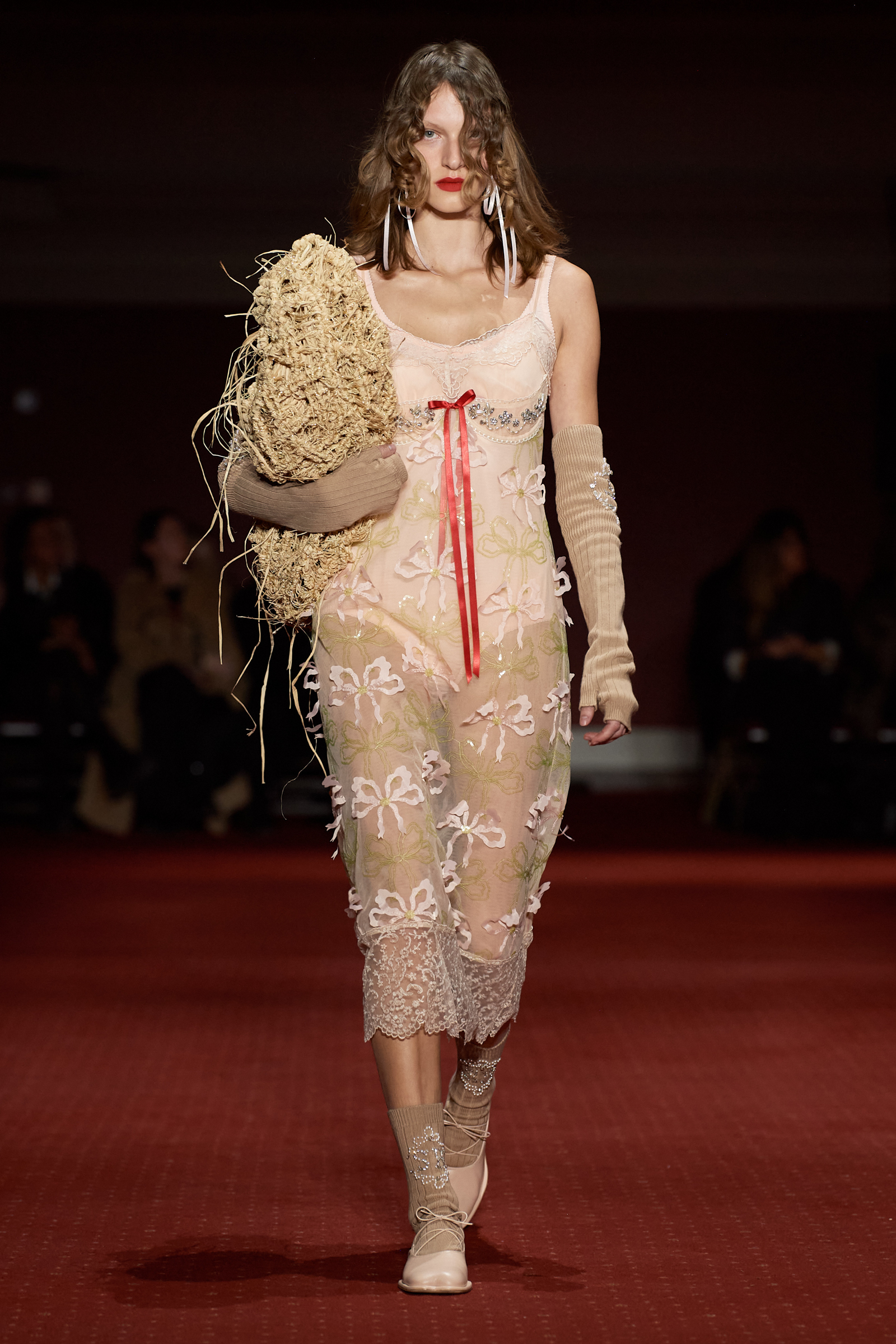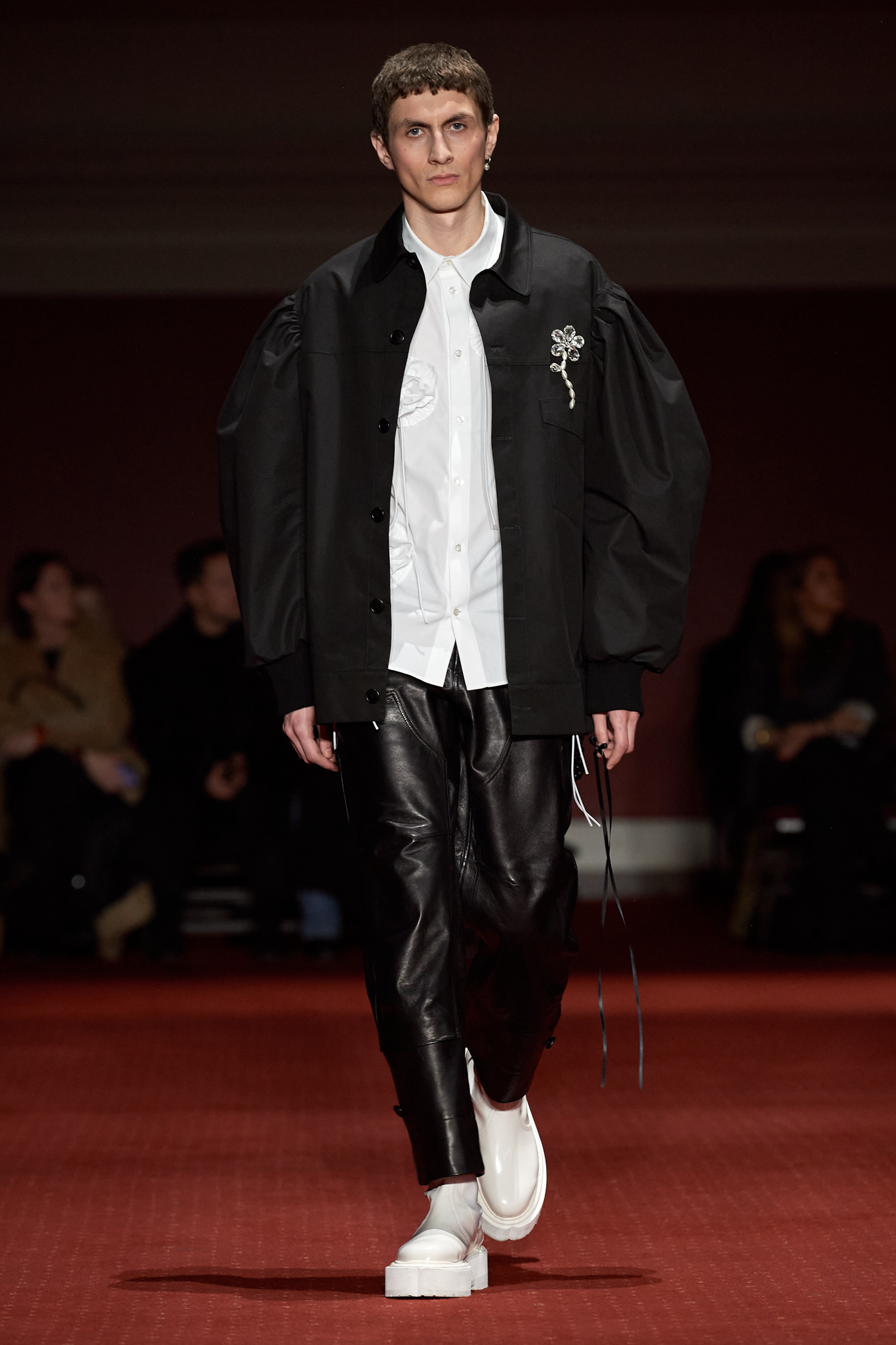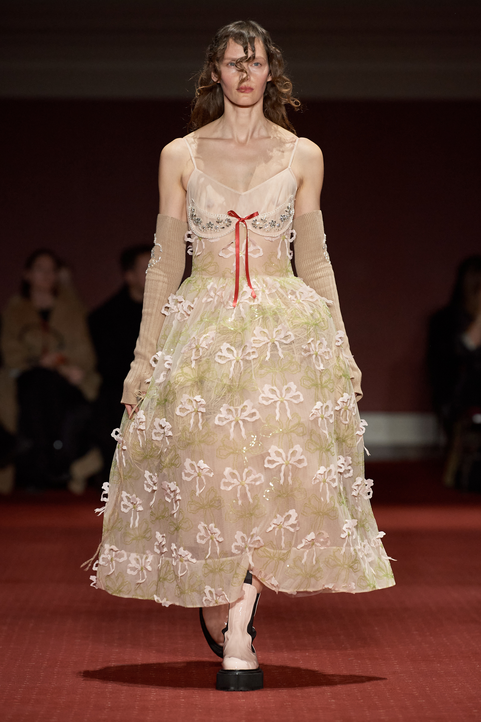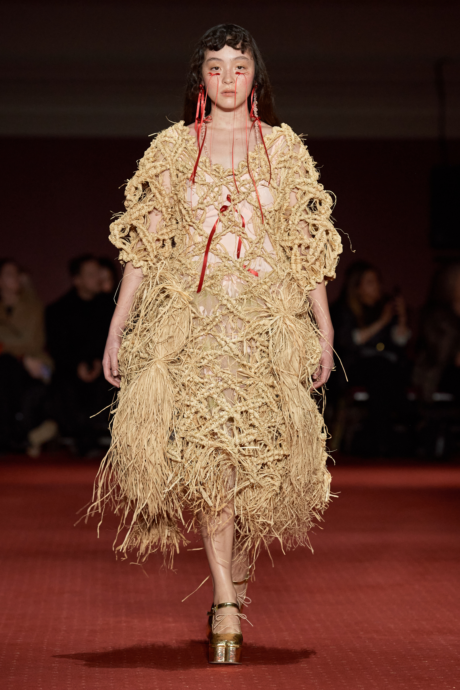 Lughnasadh (or Lughnasa) is the Irish harvest festival that goes back to pagan times, and tangentially about which Brian Friel wrote a great play. Before Christianity’s arrival and ever since, but differently, it has acted as a counterpoint to Beltane: a moment to offer thanks for summer’s bounty, and a moment for communities to commingle. This evening on the blood red carpet of Westminster’s cavernous Central Methodist Hall, Simone Rocha used Lughnasadh as a vehicle for a forward expansion of her design language that last season’s addition of menswear to her catalog has catalyzed.