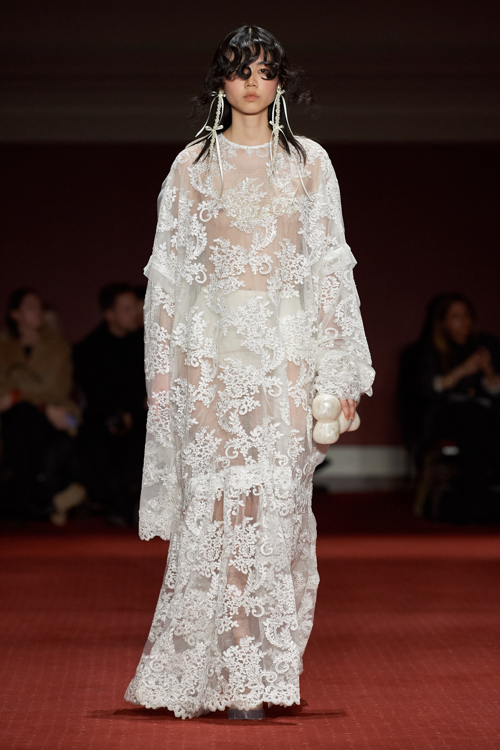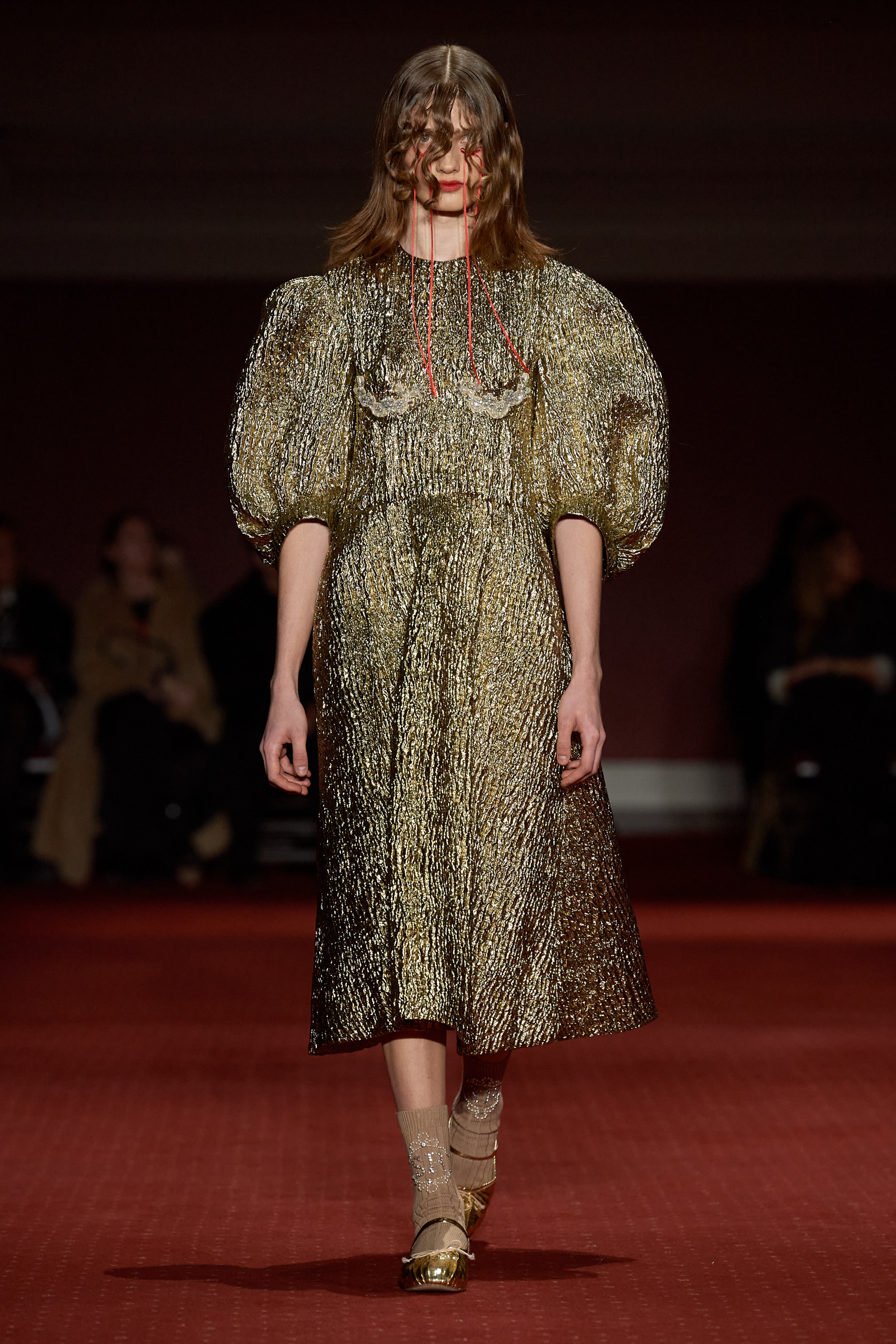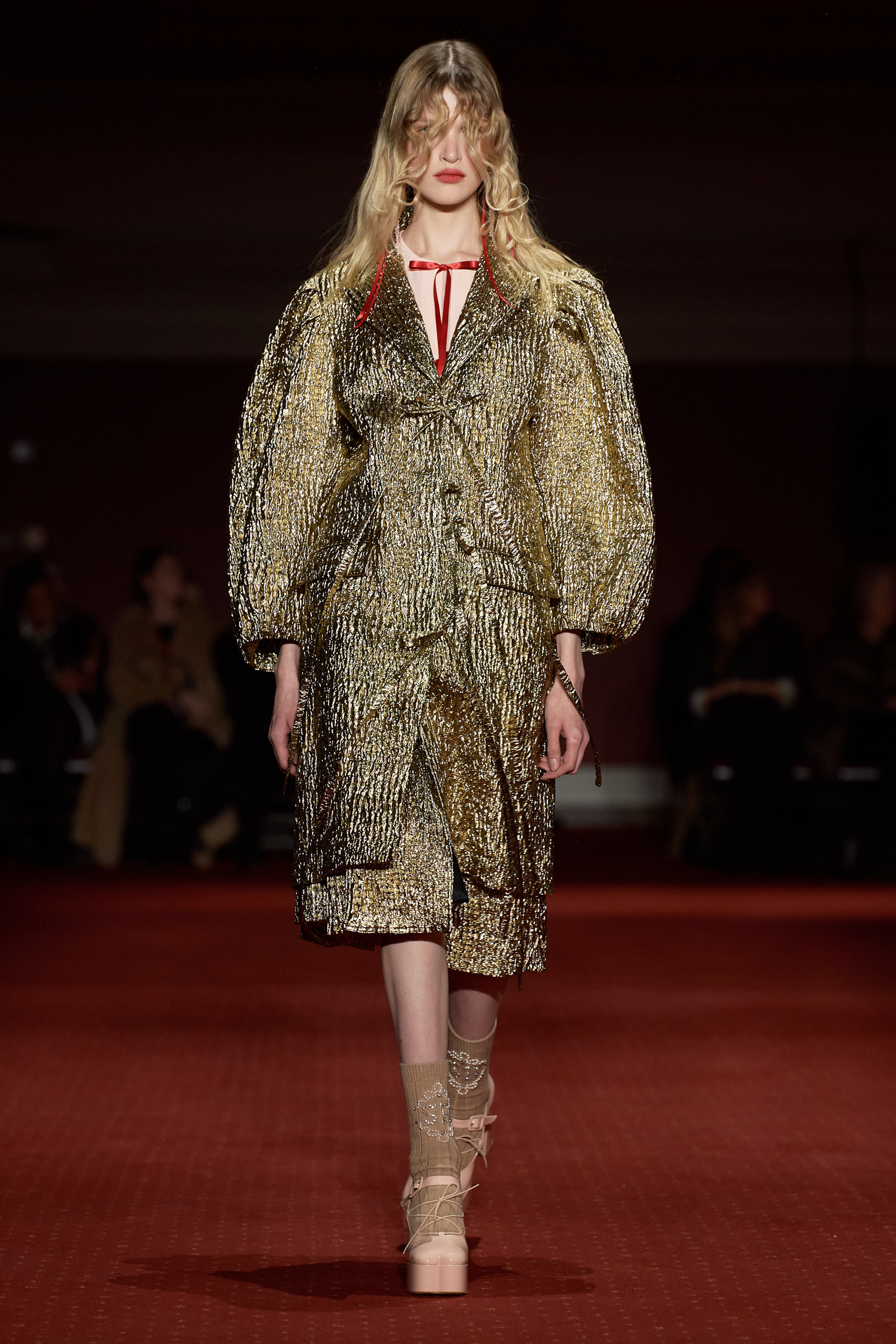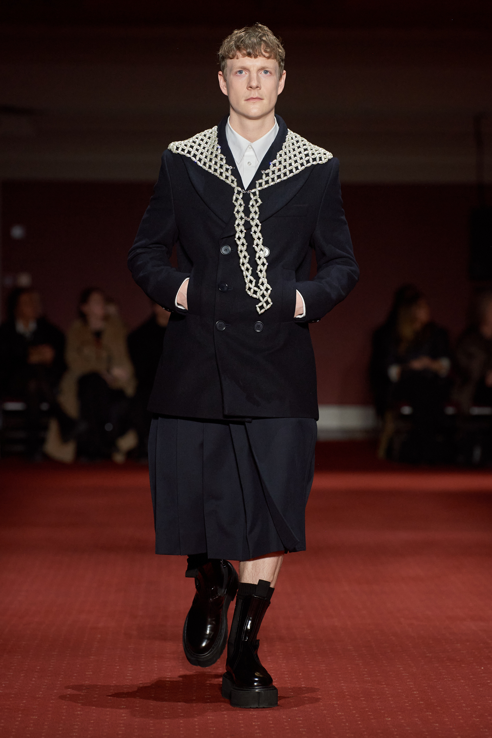 Lughnasadh (or Lughnasa) is the Irish harvest festival that goes back to pagan times, and tangentially about which Brian Friel wrote a great play. Before Christianity’s arrival and ever since, but differently, it has acted as a counterpoint to Beltane: a moment to offer thanks for summer’s bounty, and a moment for communities to commingle. This evening on the blood red carpet of Westminster’s cavernous Central Methodist Hall, Simone Rocha used Lughnasadh as a vehicle for a forward expansion of her design language that last season’s addition of menswear to her catalog has catalyzed.