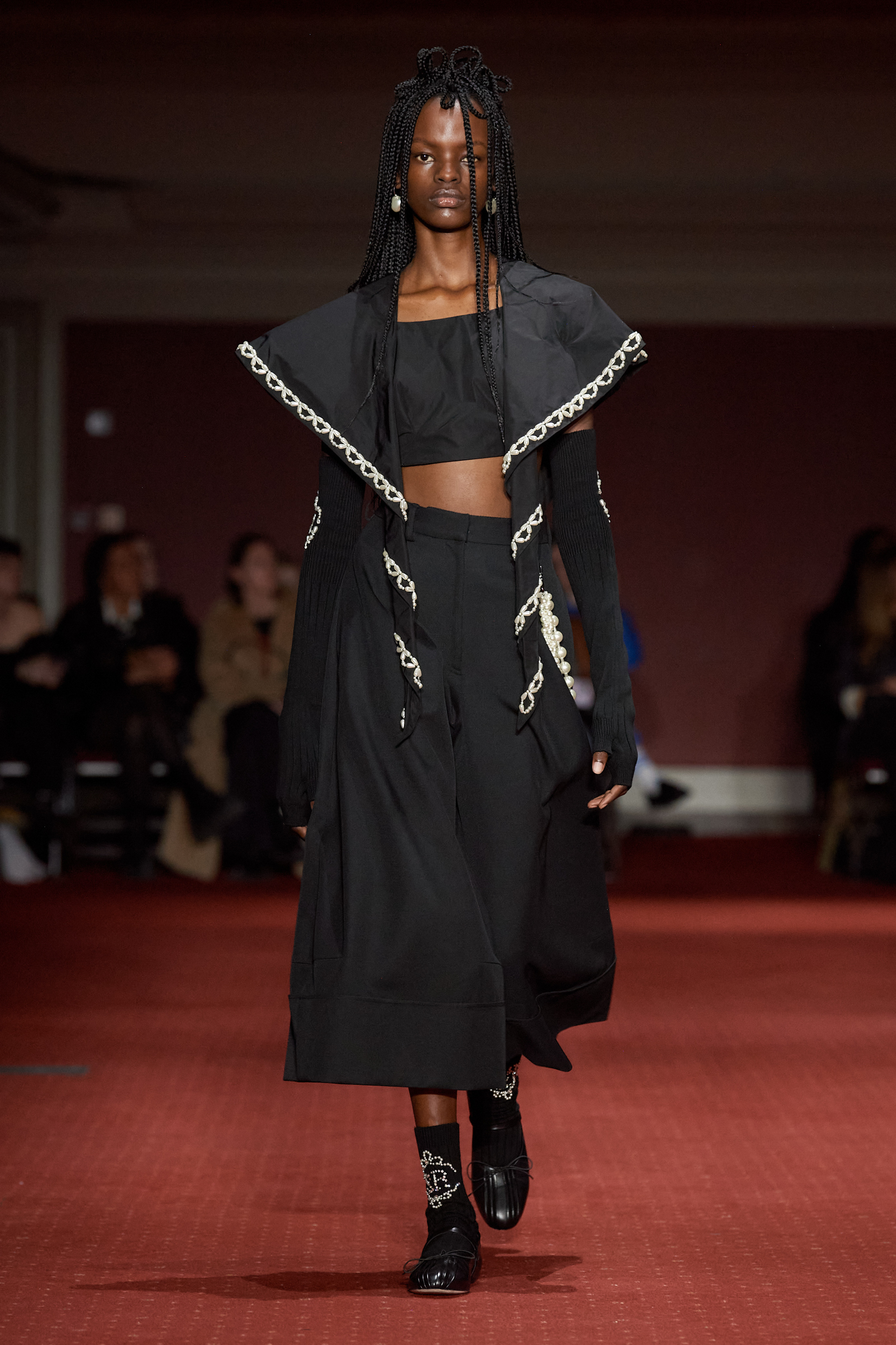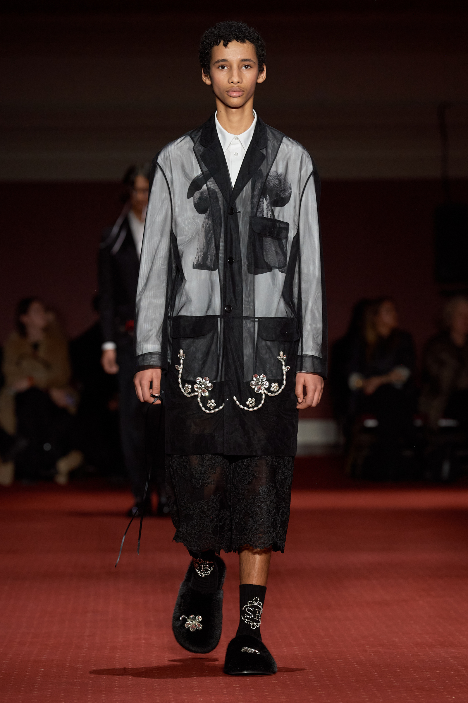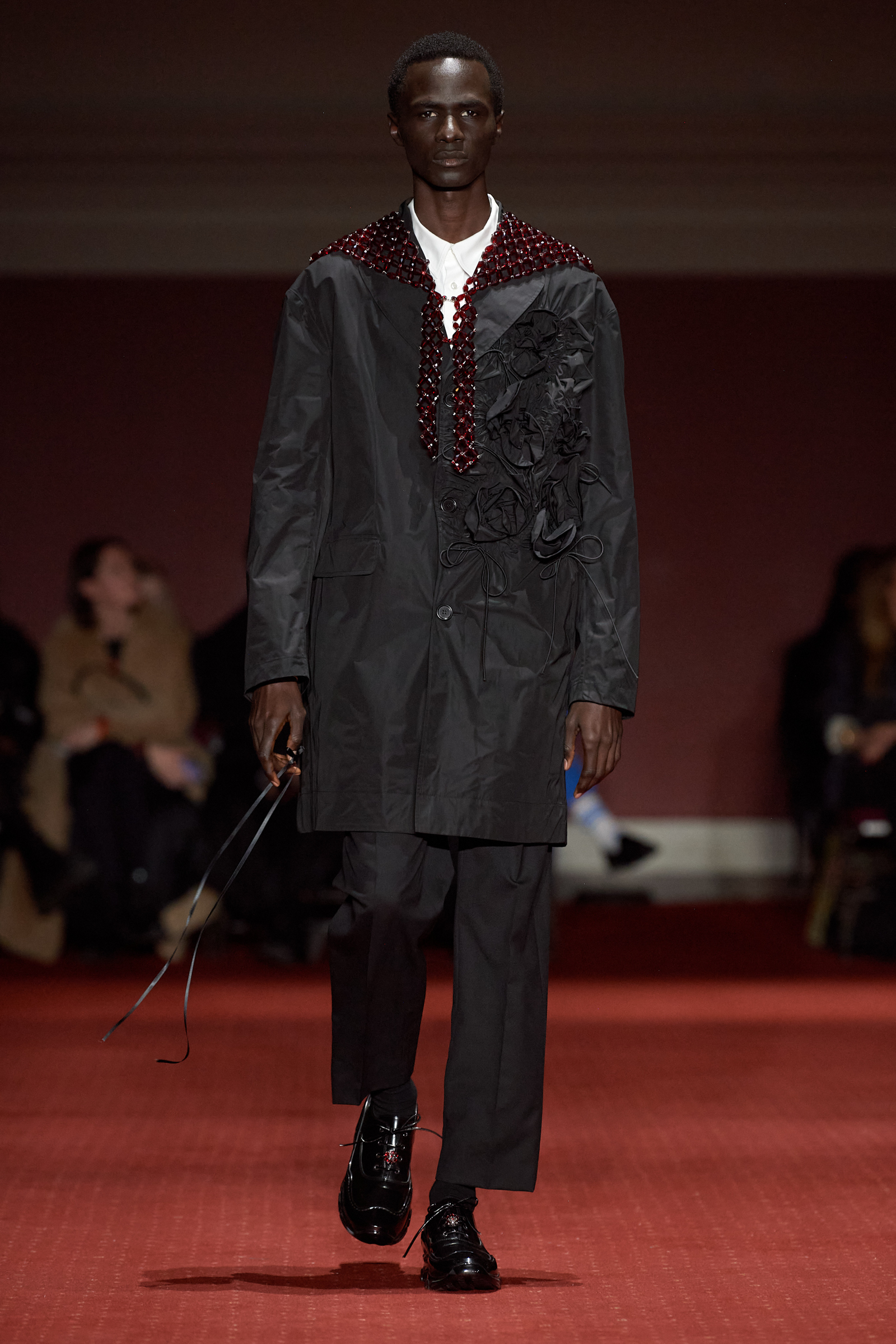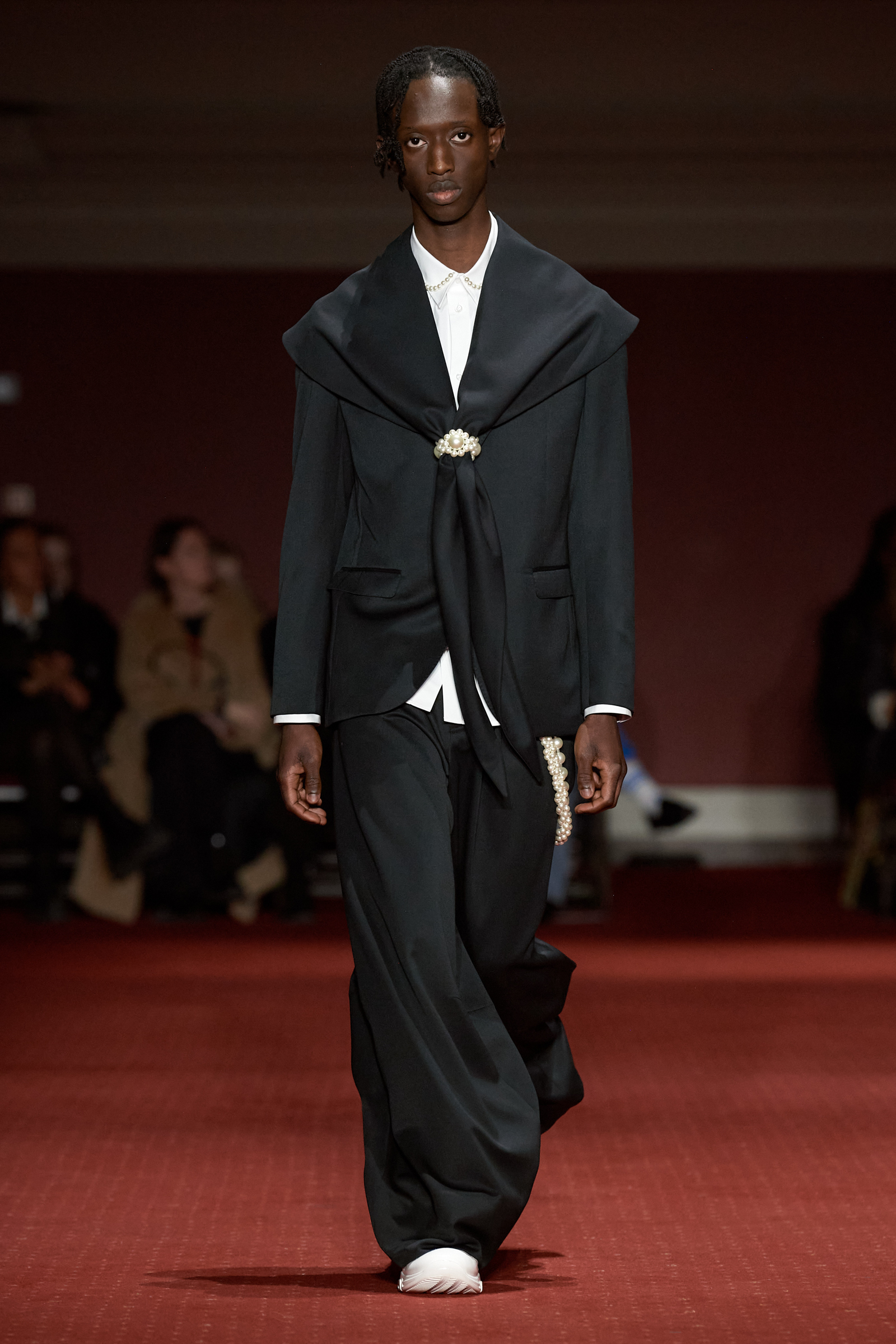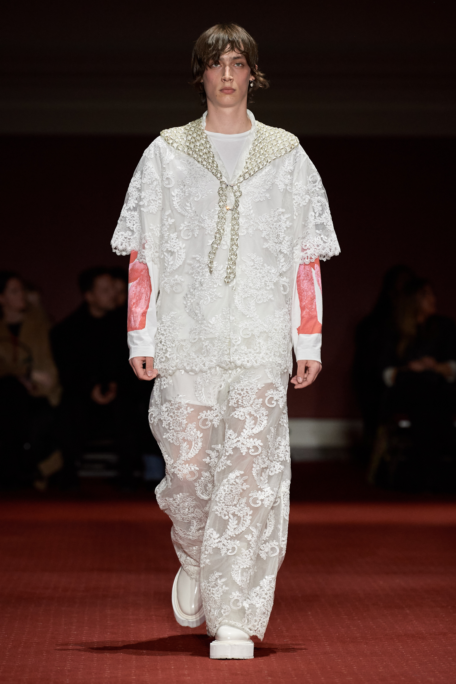 Lughnasadh (or Lughnasa) is the Irish harvest festival that goes back to pagan times, and tangentially about which Brian Friel wrote a great play. Before Christianity’s arrival and ever since, but differently, it has acted as a counterpoint to Beltane: a moment to offer thanks for summer’s bounty, and a moment for communities to commingle. This evening on the blood red carpet of Westminster’s cavernous Central Methodist Hall, Simone Rocha used Lughnasadh as a vehicle for a forward expansion of her design language that last season’s addition of menswear to her catalog has catalyzed.
