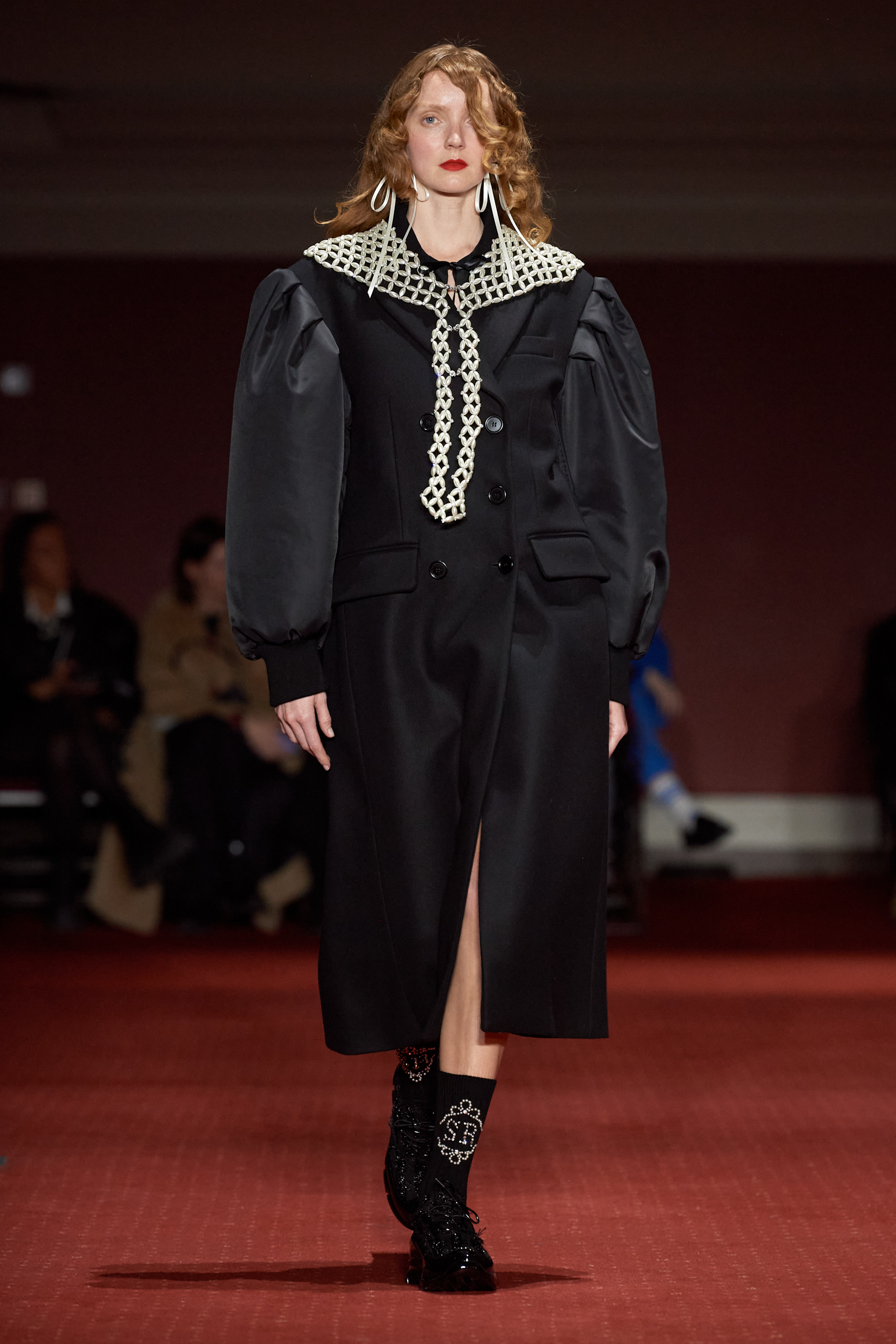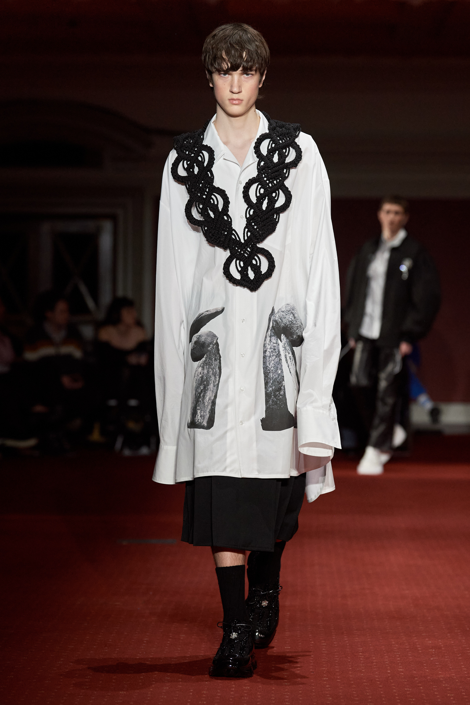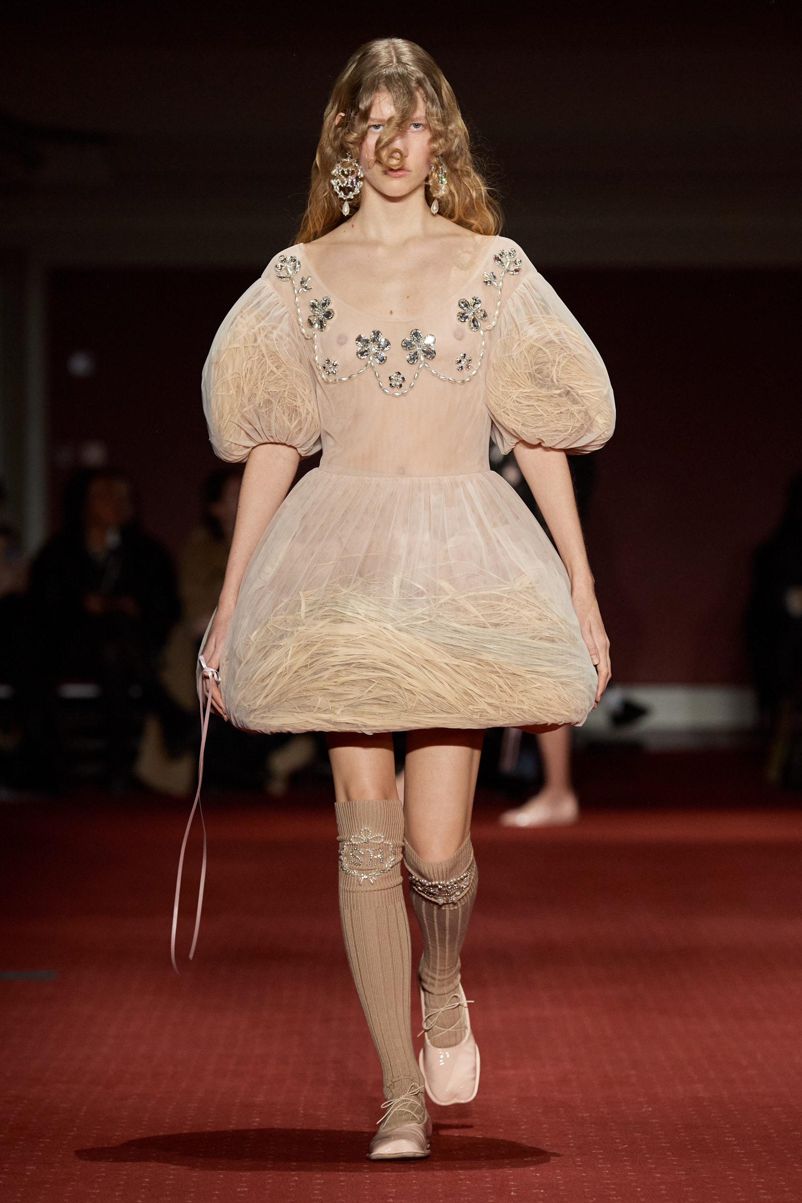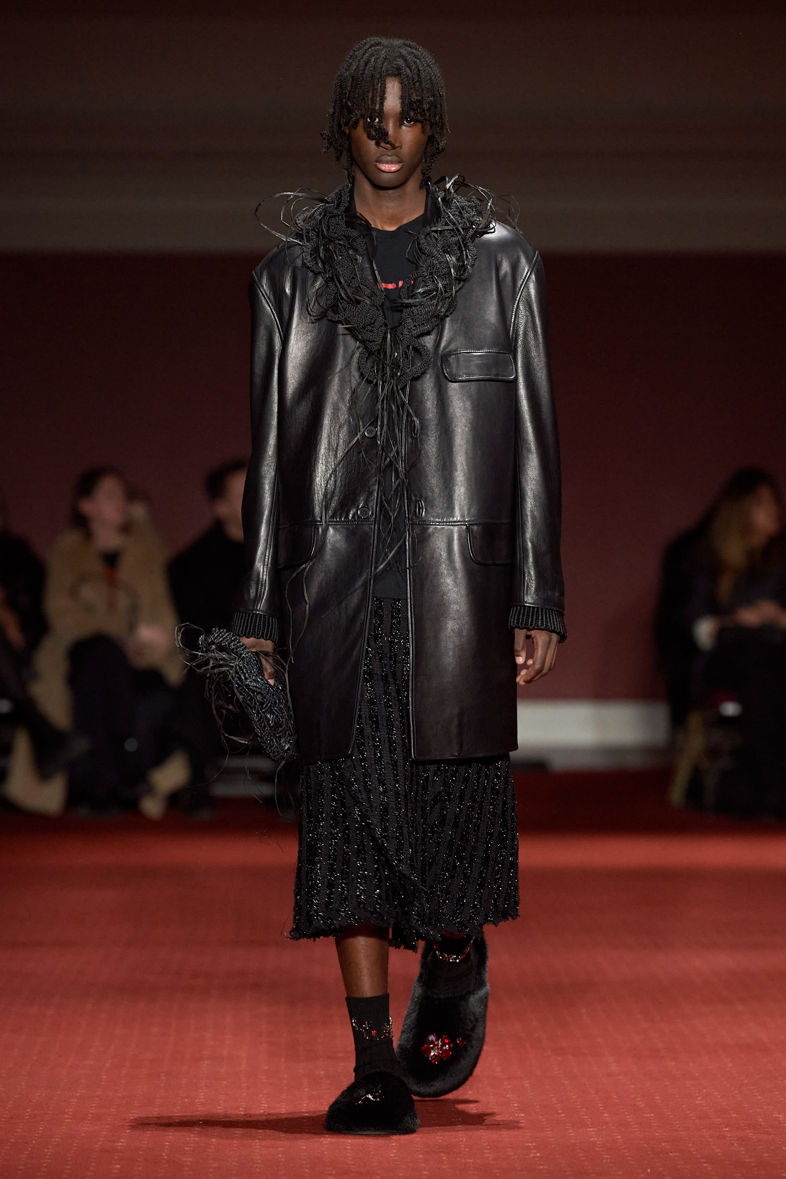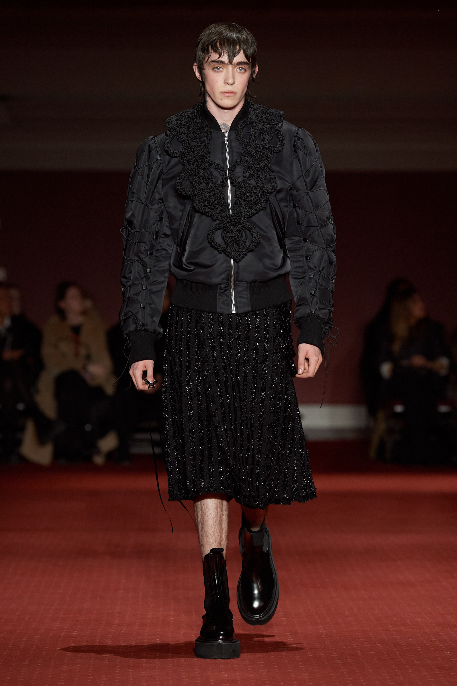 Lughnasadh (or Lughnasa) is the Irish harvest festival that goes back to pagan times, and tangentially about which Brian Friel wrote a great play. Before Christianity’s arrival and ever since, but differently, it has acted as a counterpoint to Beltane: a moment to offer thanks for summer’s bounty, and a moment for communities to commingle. This evening on the blood red carpet of Westminster’s cavernous Central Methodist Hall, Simone Rocha used Lughnasadh as a vehicle for a forward expansion of her design language that last season’s addition of menswear to her catalog has catalyzed.