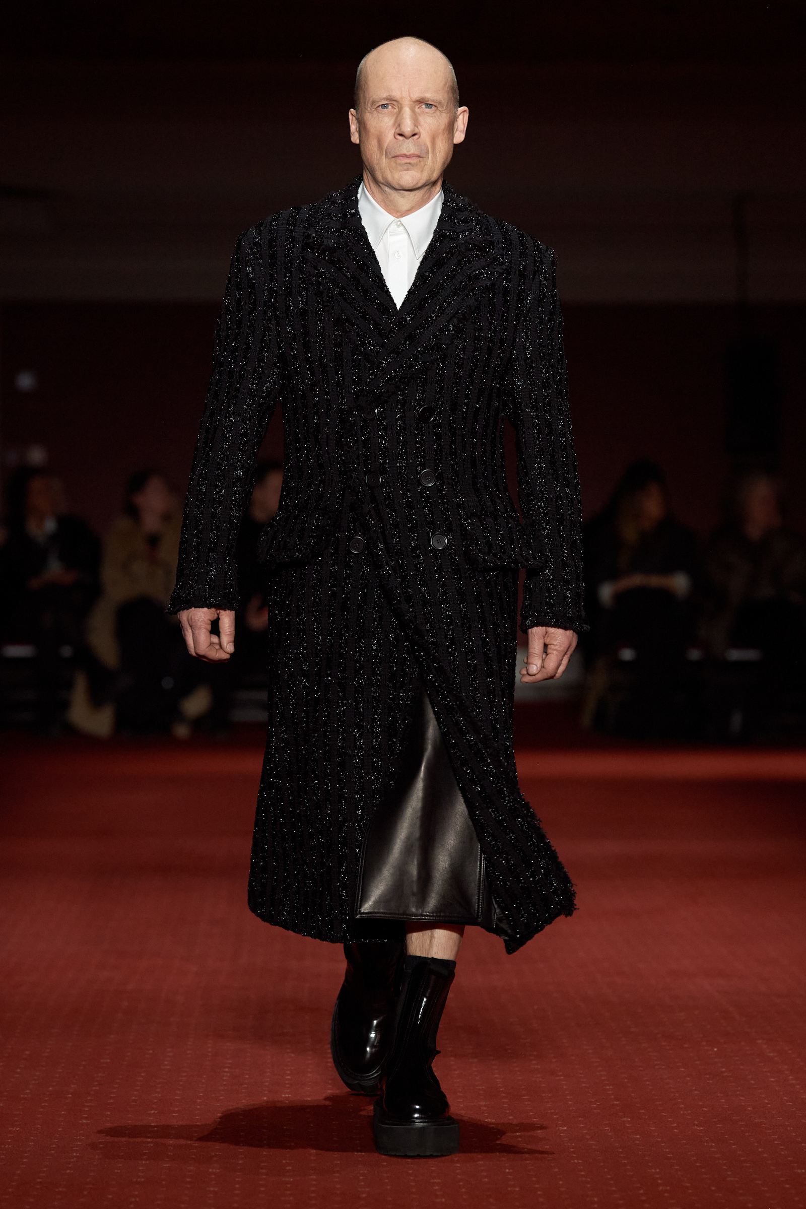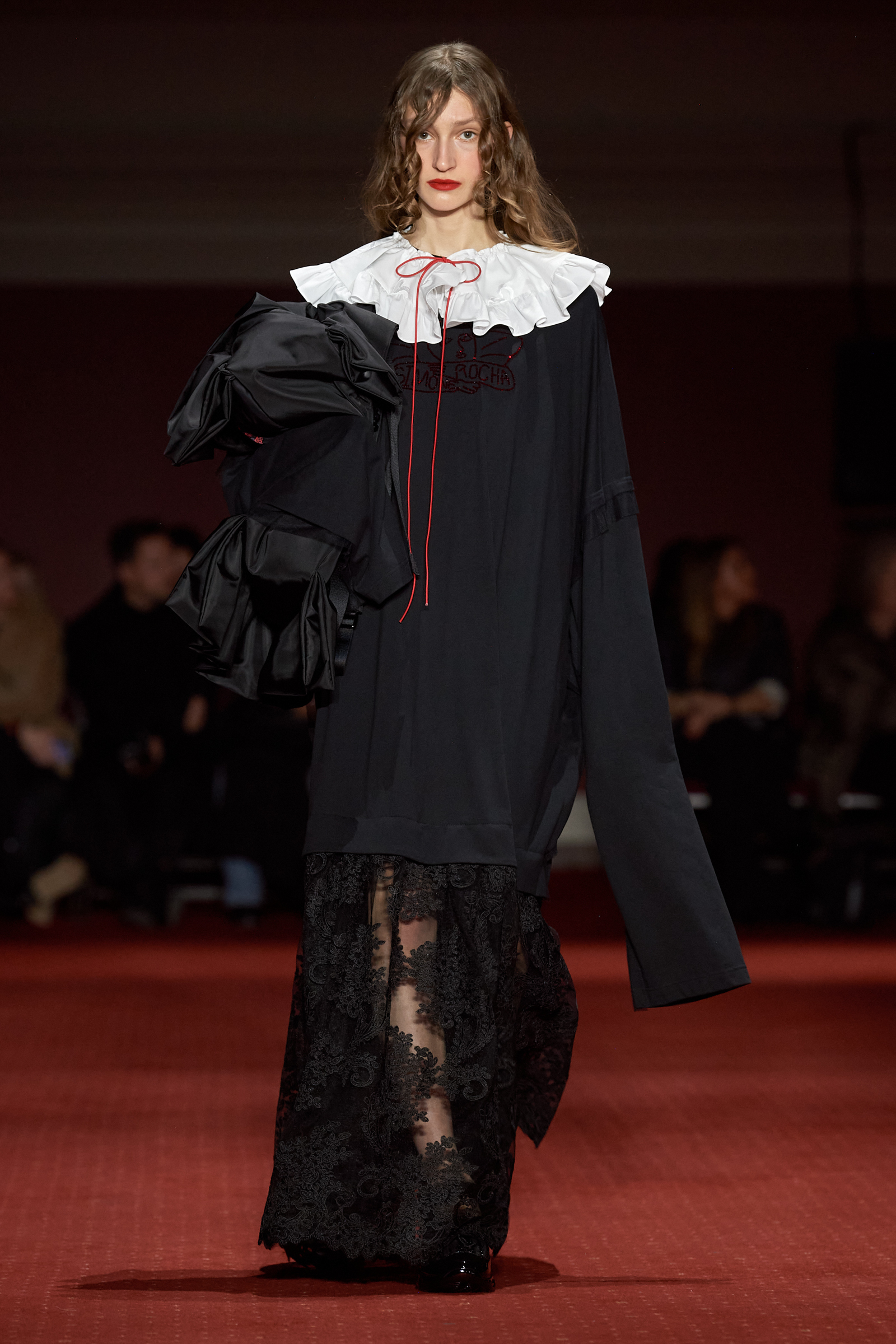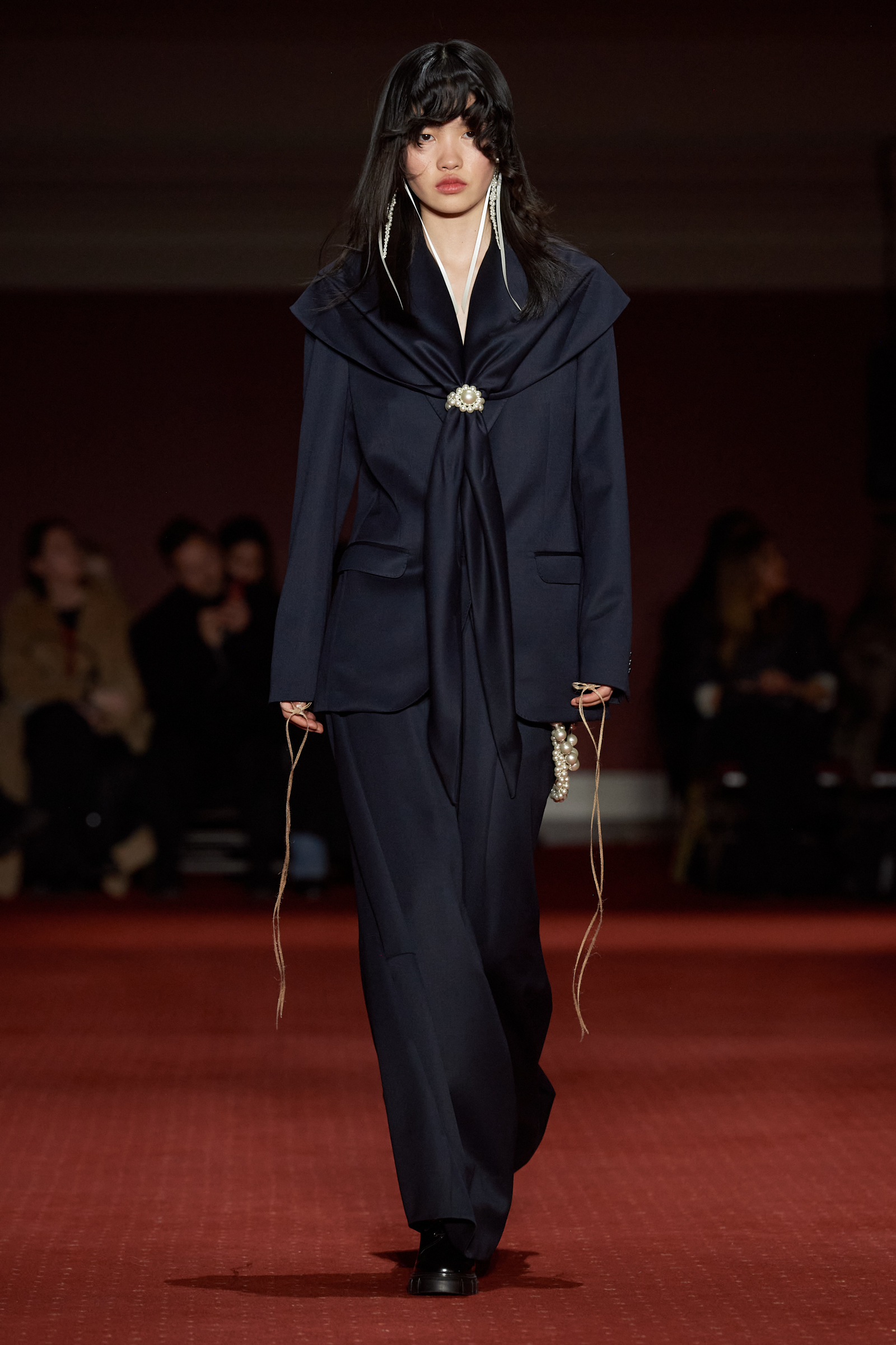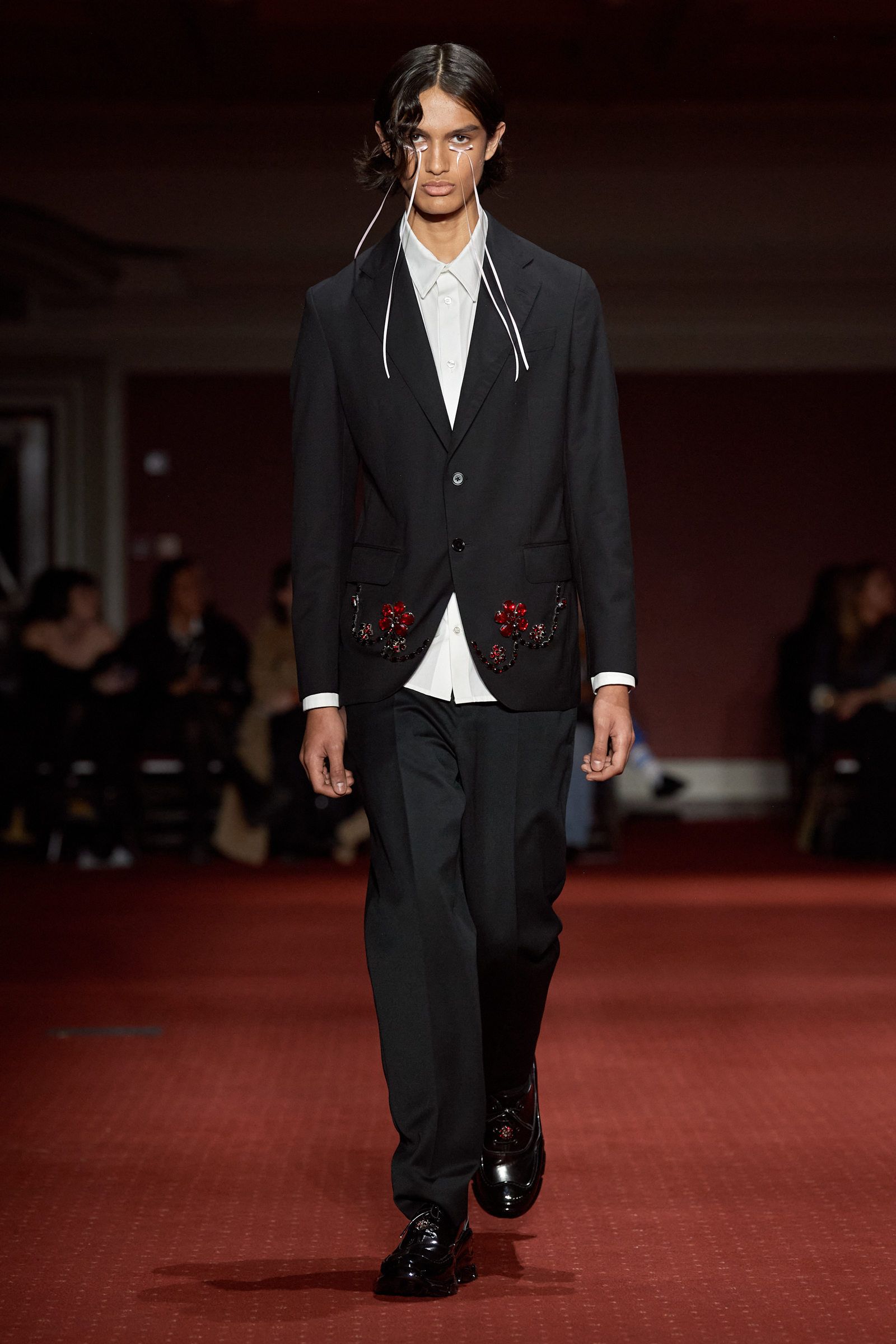 Lughnasadh (or Lughnasa) is the Irish harvest festival that goes back to pagan times, and tangentially about which Brian Friel wrote a great play. Before Christianity’s arrival and ever since, but differently, it has acted as a counterpoint to Beltane: a moment to offer thanks for summer’s bounty, and a moment for communities to commingle. This evening on the blood red carpet of Westminster’s cavernous Central Methodist Hall, Simone Rocha used Lughnasadh as a vehicle for a forward expansion of her design language that last season’s addition of menswear to her catalog has catalyzed.