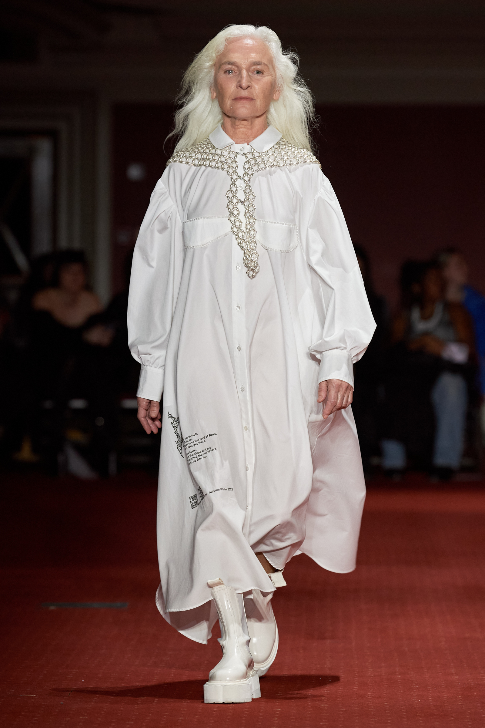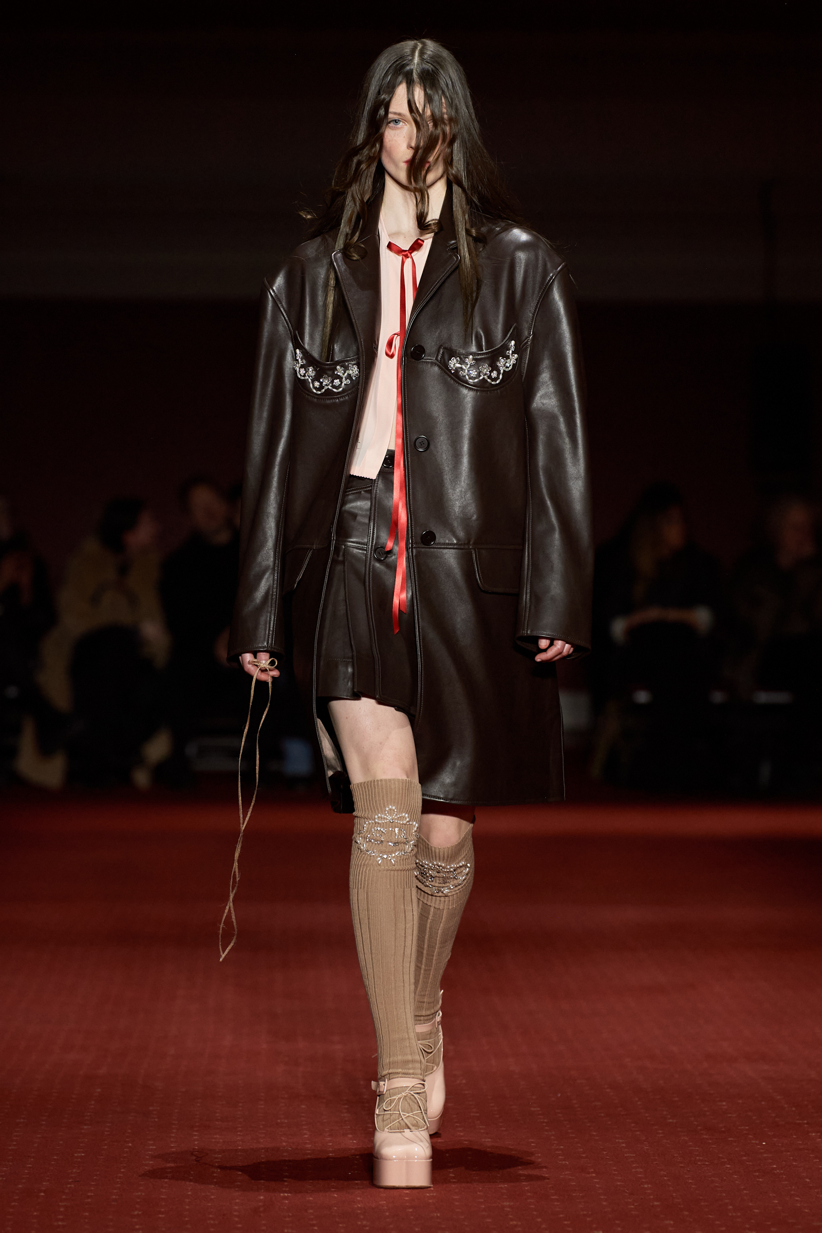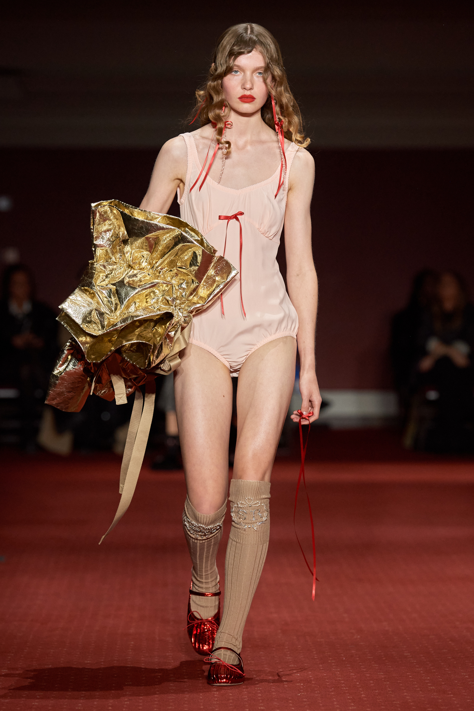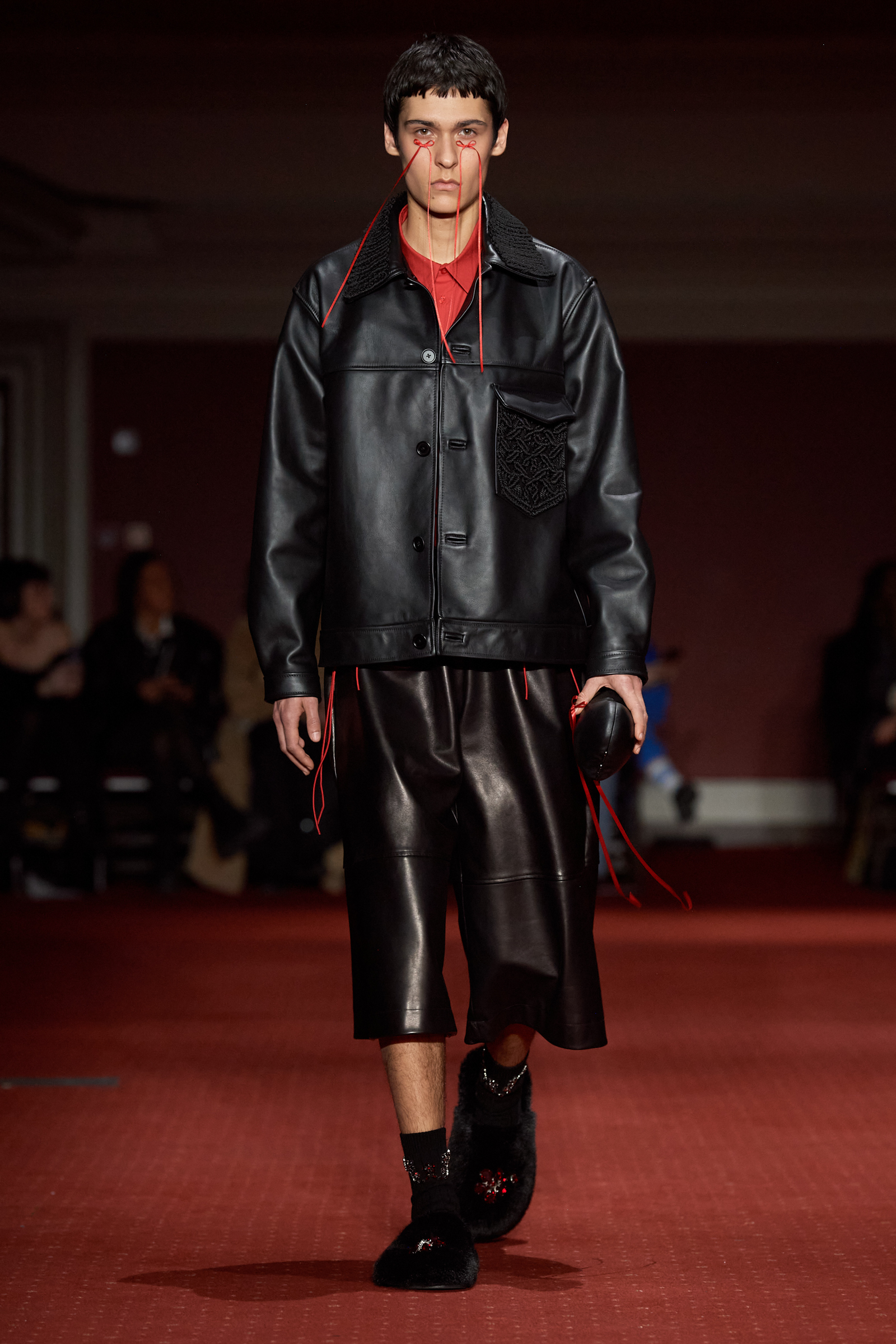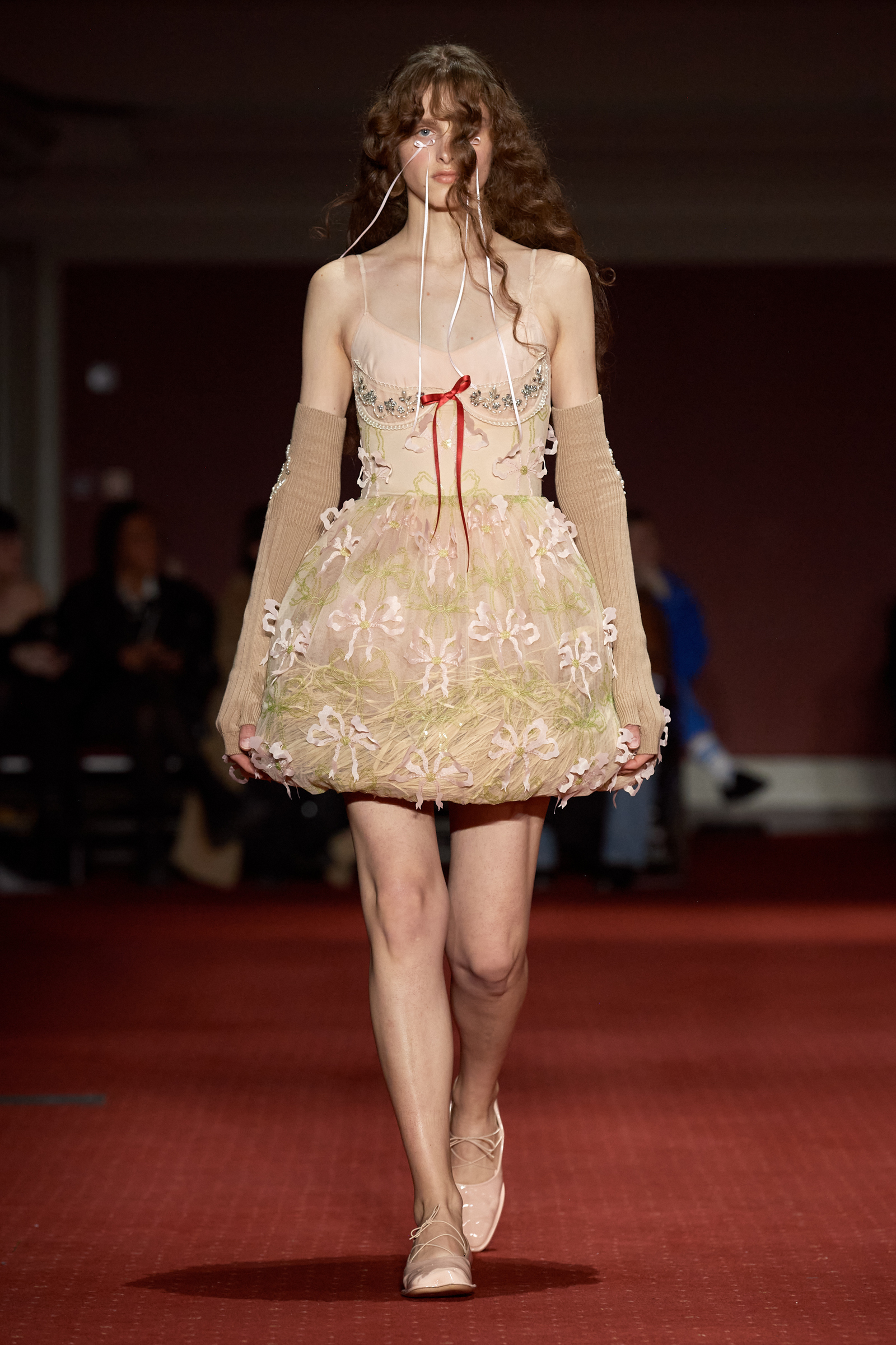 Lughnasadh (or Lughnasa) is the Irish harvest festival that goes back to pagan times, and tangentially about which Brian Friel wrote a great play. Before Christianity’s arrival and ever since, but differently, it has acted as a counterpoint to Beltane: a moment to offer thanks for summer’s bounty, and a moment for communities to commingle. This evening on the blood red carpet of Westminster’s cavernous Central Methodist Hall, Simone Rocha used Lughnasadh as a vehicle for a forward expansion of her design language that last season’s addition of menswear to her catalog has catalyzed.
